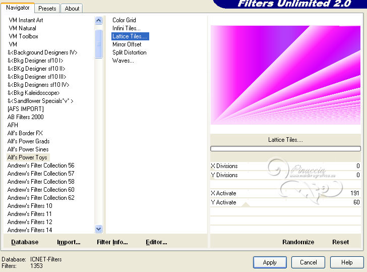 Effetti>Plugins>Filters Unlimited 2.0 - Alf's Power Toys - Lattice Tiles, con i settaggi standard.