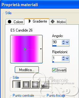 1. Passa il colore di primo piano a Gradiente, e seleziona il gradiente ES Candide 26, con i seguenti settaggi.