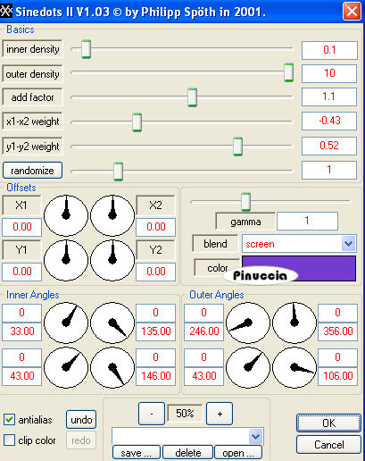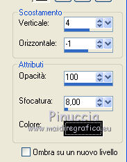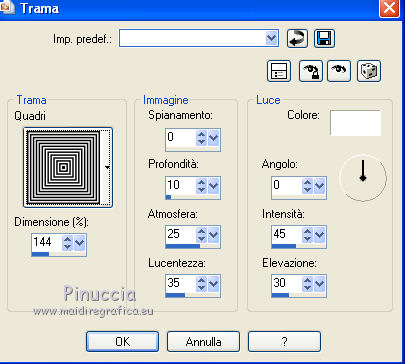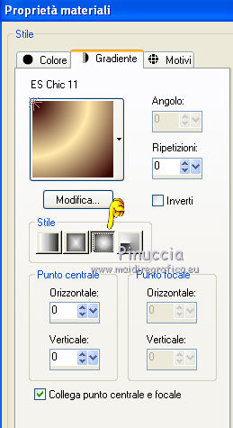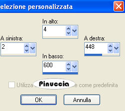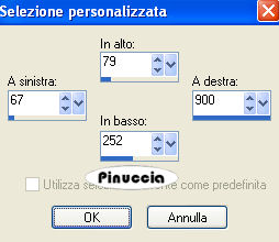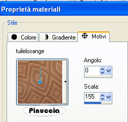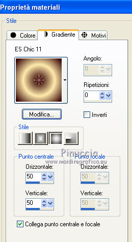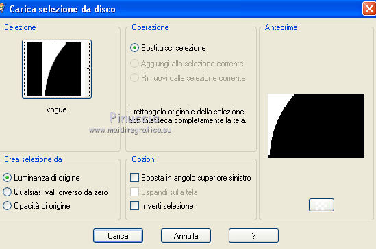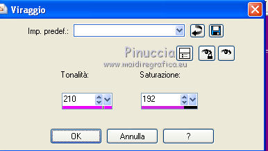 Materiale qui Tutto il materiale fa parte della collezione personale di Roserika. Per favore, lascia intatto il copyright. Filtri: Se hai problemi con i filtri, ricordati della mia sezione filtri qui Dragonfly - Sinedots II qui Simple qui Metti il gradiente nella cartella Gradienti. Apri la trama tuilelosange in PSP e minimizzala. La troverai nella lista dei Motivi quando ti servirà. Apri anche la maschera masquerondvoile in PSP e minimizzala con il resto del materiale. 1. Passa il colore di primo piano a Gradiente, e seleziona il gradiente ES Chic 11 con i seguenti settaggi. ![]() Apri una nuova immagine trasparente 900 x 600 pixels, e riempila con il gradiente.Passa il colore di sfondo a Motivi, apri il menu e tra i motivi troverai anche i files aperti. Seleziona la trama tuilelosange con i seguenti settaggi. ![]() Livelli>Nuovo livello raster. Riempi il livello con il motivo tuilelosange.Cambia la modalità di miscelatura di questo livello in Sovrapponi. Attiva il livello inferiore. Attiva lo strumento Selezione ,clicca sull'icona Selezione personalizzata ![]() e imposta i seguenti settaggi: ![]() Selezione>Innalza selezione a livello. Livelli>Nuovo livello maschera>Da immagine. Apri il menu sotto la finestra di origine e vedrai la lista dei files aperti. Tra questi la maschera. Seleziona la maschera masquerondvoile con i seguenti settaggi: ![]() Livelli>Unisci>Unisci gruppo. non chiudere la maschera perchè ti servirà ancora Selezione>Deseleziona. Livelli>Duplica. Immagine>Rifletti. Livelli>Unisci>Unisci giù. Livelli>Disponi>Porta in alto, e cambia la modalità di miscelatura di questo livello in Filtra. Regola>Tonalità e saturazione>Viraggio. ![]() Effetti>Effetti di bordo>Aumenta. 2. Livelli>Duplica. Effetti>Effetti di immagine>Motivo unico, con i settaggi standard. ![]() Riporta la modalità di miscelatura di questo livello in Normale. 3. Livelli>Nuovo livello raster. Effetti>Plugins>Dragonfly - Sinedots II, con i seguenti settaggi; colore #733bcf. ![]() Effetti>Effetti 3D>Sfalsa ombra, con il colore nero. ![]() Ripeti l'Effetto Sfalsa ombra, sempre con il colore nero, ma con i seguenti settaggi. ![]() 4. Selezione personalizzata ![]() ![]() Livelli>Nuovo livello raster. Attiva la maschera masquerondvoile e vai a Modifica>Copia. Torna al tuo lavoro e vai a Modifica>Incolla nella selezione. Selezione>Modifica>Espandi - 15 pixels. Livelli>Nuovo livello raster. Cambia i settaggi del gradiente. ![]() Riempi la selezione con il gradiente.Selezione>Deseleziona. Livelli>Disponi>Sposta giù. Attiva nuovamente il livello superiore della maschera. Cambia la modalità di miscelatura di questo livello in Sovrapponi. Livelli>Unisci>Unisci giù. Effetti>Effetti 3D>Sfalsa ombra, con il colore nero. ![]() Regola>Messa a fuoco>Metti a fuoco. 5. Apri il tube pendentif e vai a Modifica>Copia. Torna al tuo lavoro e vai a Modifica>Incolla come nuovo livello. Spostalo in alto sulla cornice destra, come nel mio esempio.![]() Apri il tube chaussure e vai a Modifica>Copia. Torna al tuo lavoro e vai a Modifica>Incolla come nuovo livello. Spostalo in basso a destra, come nel mio esempio.Apri il tube texte e vai a Modifica>Copia. Torna al tuo lavoro e vai a Modifica>Incolla come nuovo livello. Spostalo in alto a sinistra, come nel mio esempio.Livelli>Duplica. Immagine>Rifletti. Spostalo come nel mio esempio.![]() Cambia la modalità di miscelatura di questo livello in Sovrapponi. 6. Apri il tube fleur orange e vai a Modifica>Copia. Torna al tuo lavoro e vai a Modifica>Incolla come nuovo livello. Immagine>Rifletti. Spostalo in alto a sinistra del tube sinedot.Apri il tube paysage e vai a Modifica>Copia. Torna al tuo lavoro e vai a Modifica>Incolla come nuovo livello. Spostalo in basso a sinistra, come nel mio esempio.Apri il tube femmecapuchonblanc e vai a Modifica>Copia. Torna al tuo lavoro e vai a Modifica>Incolla come nuovo livello. Spostalo in basso al centro, come nel mio esempio.Livelli>Disponi>Sposta giù (sotto il paesaggio). 7. Livelli>Unisci>Unisci visibile. Selezione>Carica/Selezione da disco. Cerca e carica la selezione "vogue". ![]() Livelli>Nuovo livello raster. Riempi con il gradiente iniziale.![]() Selezione>Deseleziona. Regola>Sfocatura>Sfocatura gaussiana - raggio 20. ![]() Cambia la modalità di miscelatura di questo livello in Moltiplica. Livelli>Duplica. Immagine>Rifletti. Attiva il livello sottostante dell'originale, Regola>Tonalità e saturazione>Viraggio. ![]() 8. Immagine>Aggiungi bordatura, 10 pixels, simmetriche, con il colore bianco. Modifica>Copia. Immagine>Aggiungi bordatura, 40 pixels, simmetriche, con un colore contrastante. Seleziona questo bordo con la bacchetta magica ![]() Modifica>Incolla nella selezione. Regola>Sfocatura>Sfocatura gaussiana - raggio 20. ![]() Selezione>Innalza selezione a livello. Effetti>Effetti di trama>Trama - seleziona la trama Quadri con i seguenti settaggi. ![]() Selezione>Deseleziona. Cambia la modalità di miscelatura di questo livello in Luce diffusa, Immagine>Aggiungi bordatura, 10 pixels, simmetriche, con il colore bianco. Seleziona questo bordo con la bacchetta magica ![]() Regola>Sfocatura>Sfocatura gaussiana - raggio 20. Selezione>Deseleziona. Immagine>Ridimensiona, al 95%, tutti i livelli non selezionato. Regola>Messa a fuoco>Metti a fuoco. Firma il tuo lavoro ed esporta come jpg ottimizzata, compressione 20. ![]() Se hai problemi o dubbi, o trovi un link non funzionante, o anche soltanto per un saluto, scrivimi.