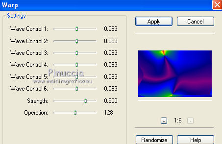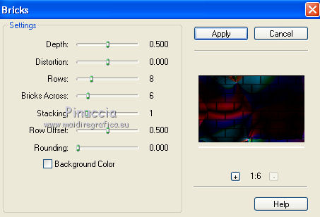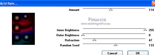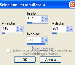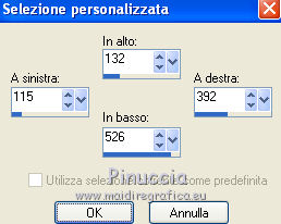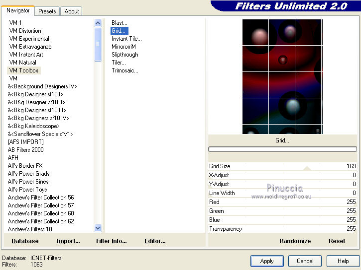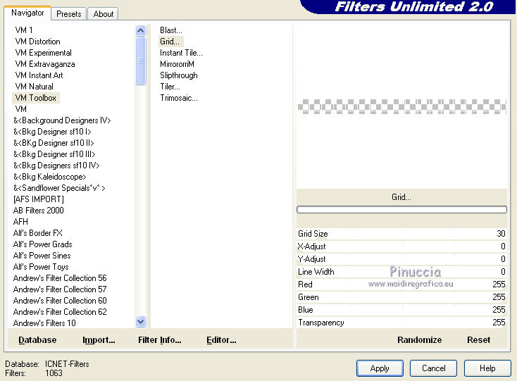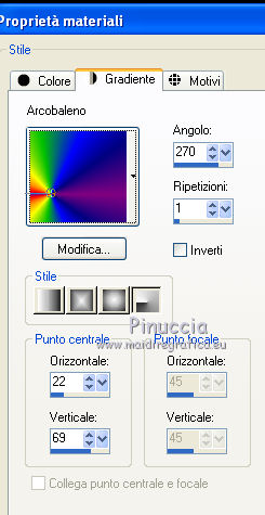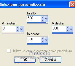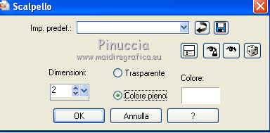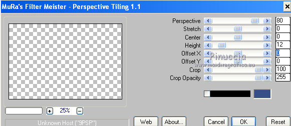 Occorrente: Materiale qui Il tube della donna è di Guismo. Il tube dell'albero è di MTM Brigitte. Per favore, lascia intatto il copyright. Filtri: Se hai problemi con i filtri, ricordati della mia sezione filtri qui Filters Unlimited 2.0 qui Mura's Meister - Perspective Tiling qui Two Moon qui VM Toolbox qui VM Natural qui FM Tile Tools qui I filtri Two Moon e tutti i filtri della serie Visman (VM Toolbox, VM Natural) si possono usare da soli o importati in Filters Unlimited Il gradiente Arcobaleno è standard in PSP. Se non lo trovi nel tuo PSP, metti quello fornito (arc-en-ciel) nella cartella Gradienti. 1. Apri una nuova immagine trasparente 900 x 600 pixels. Passa il colore di primo piano a Gradiente e seleziona il gradiente Arcobaleno, con i seguenti settaggi. nelle versioni più recenti Corel_06_040 ![]() Imposta il colore di sfondo con #eedd8b. Riempi l'immagine trasparente con il gradiente.Effetti>Plugins>Two moon - Grinder. ![]() Livelli>Duplica. Effetti>Plugins>FM Tile Tools - Warp. ![]() Cambia la modalità di miscelatura di questo livello in Differenza. Livelli>Unisci>Unisci visibile. 2. Livelli>Duplica. Effetti>Plugins>FM Tile Tools - Bricks. ![]() Immagine>Ruota per gradi - 90 gradi a destra. ![]() Immagine>Ridimensiona, al 60%, tutti i livelli non selezionato. Sposta l'immagine in alto a destra,vedi l'esempio finale. 3. Attiva il livello sottostante. Attiva lo strumento Selezione ![]() clicca sull'icona Selezione personalizzata ![]() e imposta i seguenti settaggi. ![]() Effetti>Plugins>VM Natural - Acid Rain, con i settaggi standard. ![]() Ripeti l'Effetto una seconda volta. Mantieni selezionato. Effetti>Plugins>Filters Unlimited 2.0 - VM Toolbox - Grid. ![]() Effetti>Effetti 3D>Scalpello - colore bianco. ![]() Selezione>Innalza selezione a livello. Attiva il livello sottostante e premi sulla tastiera il tasto CANC. Selezione>Deseleziona. 4. Attiva nuovamente il livello soprastante. Cambia la modalità di miscelatura di questo livello in Sovrapponi. Livelli>Nuovo livello raster. Riempi il nuovo livello con il gradiente.Livelli>Disponi>Porta sotto. Selezione personalizzata ![]() ![]() Premi sulla tastiera il tasto CANC. Selezione>Deseleziona. 5. Livelli>Unisci>Unisci visibile. Apri il tube Mtm_bomen 22 e vai a Modifica>Copia. Torna al tuo lavoro e vai a Modifica>Incolla come nuovo livello. Lascialo come sta. Non spostarlo. 6. Selezione personalizzata ![]() ![]() Livelli>Nuovo livello raster. Effetti>Plugins>Filters Unlimited 2.0 - VM Toolbox - Grid, con i settaggi standard. ![]() Selezione>Deseleziona. Effetti>Plugins>Mura's Meister - Perspective Tiling. ![]() 7. Apri il tube "leopard" e vai a Modifica>Copia. Torna al tuo lavoro e vai a Modifica>Incolla come nuovo livello. Spostalo a sinistra, come nel mio esempio.![]() Apri il tube calguisblue2369 e vai a Modifica>Copia. Torna al tuo lavoro e vai a Modifica>Incolla come nuovo livello. Immagine>Ridimensiona, all'80%, tutti i livelli non selezionato. Spostalo in basso a destra, come nel mio esempio.8. Immagine>Aggiungi bordatura, 20 pixels, simmetriche, con il colore nero. Apri il tube "decorscoin" e vai a Modifica>Copia. Torna al tuo lavoro e vai a Modifica>Incolla come nuovo livello. Spostalo nell'angolo in alto a destra del quadro,vedi l'esempio finale. Apri il tube "texte" e vai a Modifica>Copia. Torna al tuo lavoro e vai a Modifica>Incolla come nuovo livello. Spostalo in alto a sinistra, come nel mio esempio.![]() Cambia la modalità di miscelatura di questo livello in Differenza. Firma il tuo lavoro ed esporta come jpg ottimizzata, compressione 20. ![]() ![]() ![]() Olimpia ![]() Se hai problemi o dubbi, o trovi un link non funzionante, o anche soltanto per un saluto, scrivimi. |