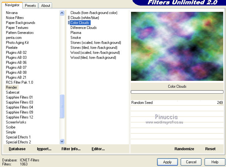 Effetti>Plugins>Filters Unlimited 2.0 - Color Clouds, con i settaggi standard.