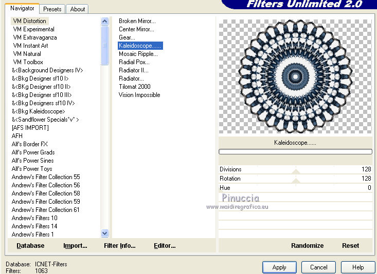 Effetti>Plugins>Filters Unlimited 2.0 - VM Distortion - Kaleidoscope, con i settaggi standard.