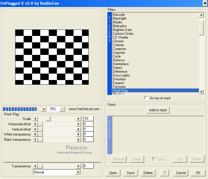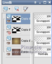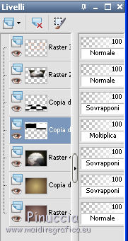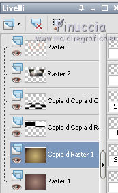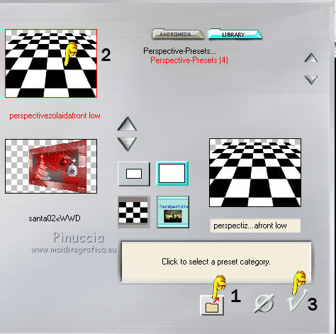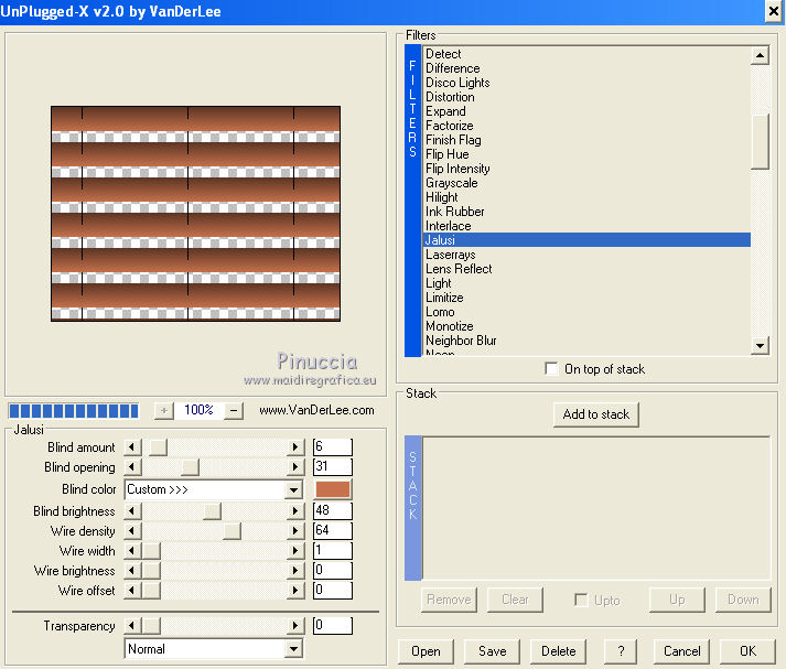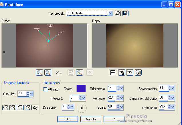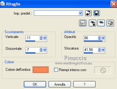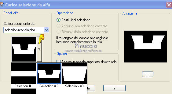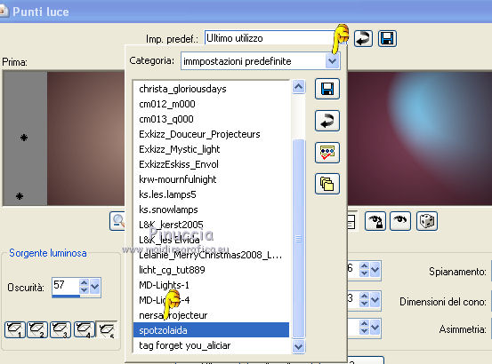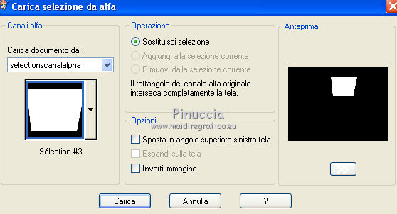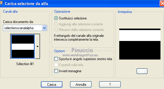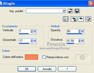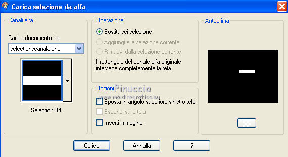 Occorrente: Materiale qui Il materiale fa parte della collezione personale di Roserika. Per favore, lascia intatto il copyright. Filtri: Se hai problemi con i filtri, ricordati della mia sezione filtri qui VanDerLee - Unplugged X qui Andromeda - Perspective qui Metti "perspectivezolaidafrontlow.pfp" nella cartella del filtro Andromeda>Perspective. Se preferisci, puoi importarlo quando ti servirà direttamente dalla cartella in cui hai scompattato il materiale. Metti "Preset Lights spotzolaida" nella cartella Impostazioni predefinite. Apri selectionscanalalpha in PSP. L'immagine non è vuota, ma contiene le selezioni salvate sul canale alfa. Con il file minimizzato, avrai disponibili le selezioni quando ti serviranno. 1. Apri una nuova immagine trasparente 1000 x 750 pixels. Imposta il colore di primo piano con #ab8b7d, e il colore di sfondo con #492f2f. Passa il colore di primo piano a Gradiente, stile Sprazzo di luce, con i seguenti settaggi. ![]() Riempi l'immagine trasparente con il gradiente.Livelli>Duplica. Effetti>Effetti di illuminazione>Punti luce, apri il menu delle impostazioni predefinite e seleziona il preset "spotzolaida". ![]() ![]() Cambia la modalità di miscelatura di questo livello in Sovrapponi. 2. Livelli>Duplica. Effetti>Plugins>VanDerLee - Unplugged X - seleziona Finish Flag poichè non è indicato il settaggo, ho usato quelli standard ![]() Effetti>Plugins>Andromeda - Perspective, clicca sull'icona Presets ![]() nella finestra successiva, clicca sull'icona della cartella, e cerca e seleziona il preset "perspectivezolaidafrontlow.pfp"; clicca sul segno di spunta in basso a destra per confermare ![]() nella finestra successiva clicca ancora sul segno di spunta per chiudere il filtro. ![]() 3. Livelli>Duplica. Chiudi il livello sottostante dell'originale, e rimani posizionato sul livello della copia. ![]() Selezione>Carica/Salva selezione>Carica selezione da canale alpha. E' già disponibile la selezione "selection#1". Devi soltanto cliccare Carica. ![]() Selezione>Inverti. Premi sulla tastiera il tasto CANC. Selezione>Deseleziona. Effetti>Effetti di immagine>Scostamento. ![]() 4. Apri e attiva il livello sottostante. Immagine>Capovolgi. Selezione>Carica/Salva selezione>Carica selezione da canale alpha. Carica nuovamente "selection#1". Selezione>Inverti. Premi sulla tastiera il tasto CANC. Selezione>Deseleziona. Cambia la modalità di miscelatura di questo livello in Moltiplica. Attiva il livello superiore. Selezione>Carica/Salva selezione>Carica selezione da canale alpha. Apri il menu delle selezioni e Carica "selection#2". ![]() Livelli>Nuovo livello raster. Apri l'immagine "paysage" e vai a Modifica>Copia. Torna al tuo lavoro e vai a Modifica>Incolla nella selezione. Selezione>Deseleziona. Livelli>Nuovo livello raster. Selezione>Carica/Salva selezione>Carica selezione da canale alpha. Carica nuovamente "selection#2". Effetti>Effetti 3D>Ritaglio, con il colore #ff8755. ![]() Selezione>Deseleziona. Selezione>Carica/Salva selezione>Carica selezione da canale alpha. Carica ancora una volta "selection#2". Livelli>Nuovo livello raster. Effetti>Effetti 3D>Ritaglio, con il colore precedente. ![]() Selezione>Deseleziona. Livelli>Unisci>Unisci giù. Attiva il secondo livello dal basso, quello con l'effetto Punti luce. ![]() Livelli>Nuovo livello raster. Selezione>Seleziona tutto. Modifica>Incolla nella selezione (l'immagine del paesaggio è ancora in memoria). Selezione>Deseleziona. Cambia la modalità di miscelatura di questo livello in Sovrapponi. Attiva il livello soprastante (il quarto dal basso). ![]() Selezione>Carica/Salva selezione>Carica selezione da canale alpha. Carica "selection#3". ![]() Premi sulla tastiera il tasto CANC. Livelli>Nuovo livello raster. Effetti>Plugins>VanDerLee - Unplugged X. Seleziona Jalusi con i seguenti settaggi - colore #c8724d. ![]() Selezione>Deseleziona. 6. Selezione>Carica/Salva selezione>Carica selezione da canale alpha. Carica "selection#4". ![]() Premi sulla tastiera il tasto CANC. Selezione>Deseleziona. Livelli>Unisci>Unisci visibile. Apri il tube femmeallongee. Attiva il livello Raster 1 e vai a Modifica>Copia. Torna al tuo lavoro e vai a Modifica>Incolla come nuovo livello. Spostalo in basso a destra.Copia il livello "boulecrystal" del tube femmeallongee. Torna al tuo lavoro e vai a Modifica>Incolla come nuovo livello. Spostalo sotto le gambe della donna.Livelli>Disponi>Sposta giù. ![]() Copia il livello Raster 3 del tube femmeallongee. Torna al tuo lavoro e vai a Modifica>Incolla come nuovo livello. Spostalo in basso al centro.Vedi l'esempio finale. Copia il livello Raster 4 del tube femmeallonge. Torna al tuo lavoro e vai a Modifica>Incolla come nuovo livello. Spostalo in basso a sinistra.Vedi l'esempio finale. 7. Apri il tube "lampadaire" e copia il livello Raster 1. Torna al tuo lavoro e vai a Modifica>Incolla come nuovo livello. Spostalo a sinistra, vedi l'esempio finale.Copia il livello Raster 2 del tube "lampadaire". Torna al tuo lavoro e vai a Modifica>Incolla come nuovo livello. Spostalo sul lampadario.Livelli>Unisci>Unisci tutto. Firma il tuo lavoro ed esporta come jpg ottimizzata, compressione 20. ![]() ![]() Se hai problemi o dubbi, o trovi un link non funzionante, o anche soltanto per un saluto, scrivimi. |