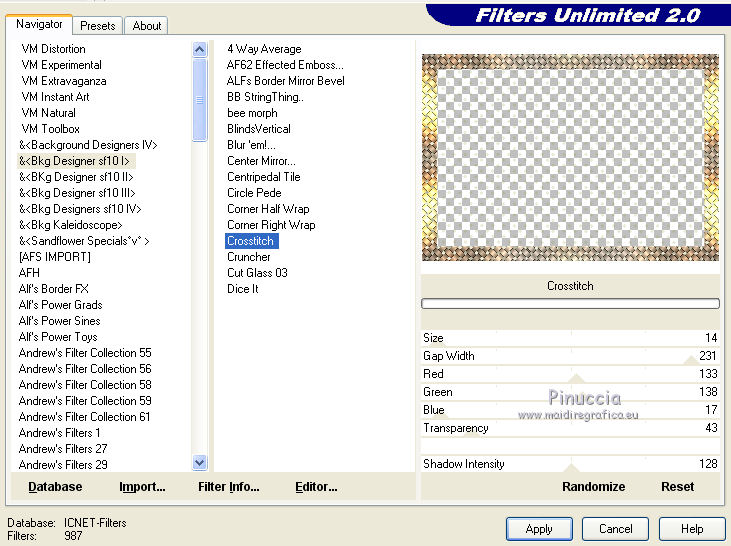Effets>Modules Externes>Filters Unlimited 2.0 - &<Bkg Designer SF10I> - Crosstitch,