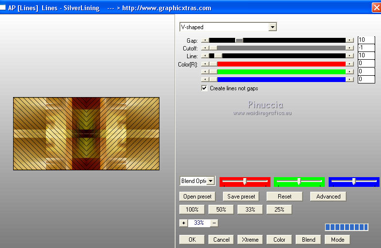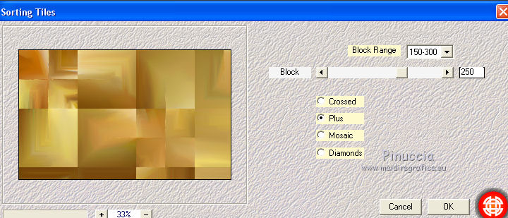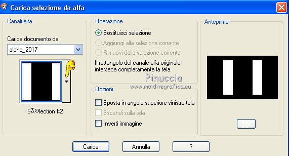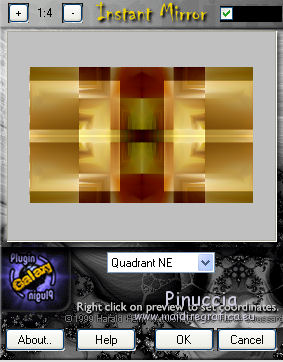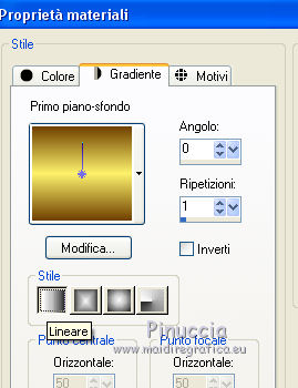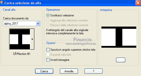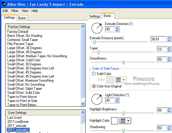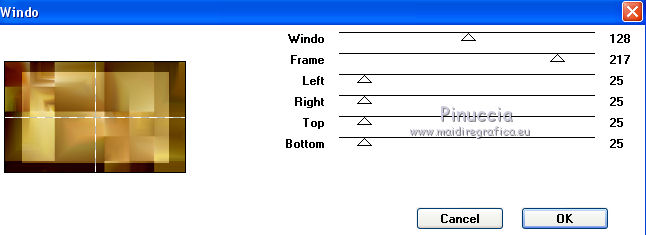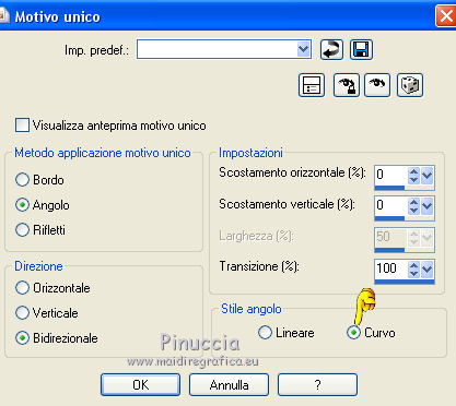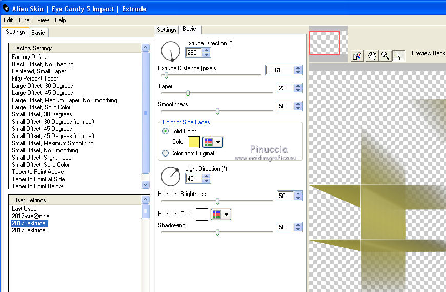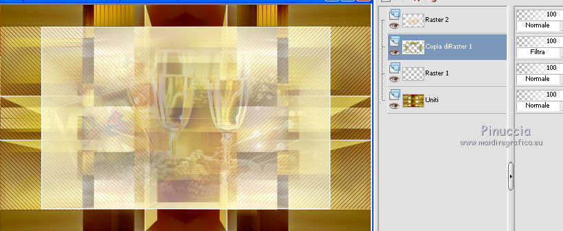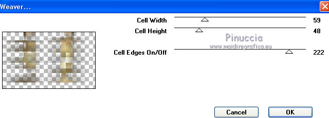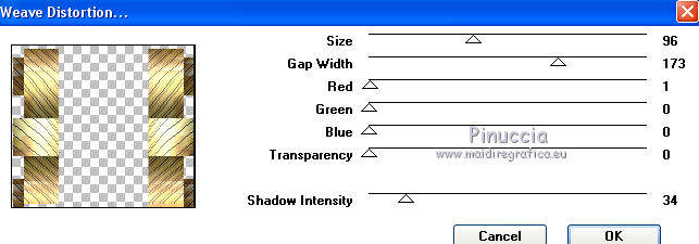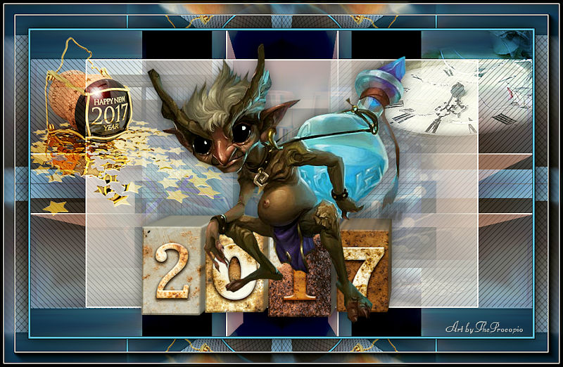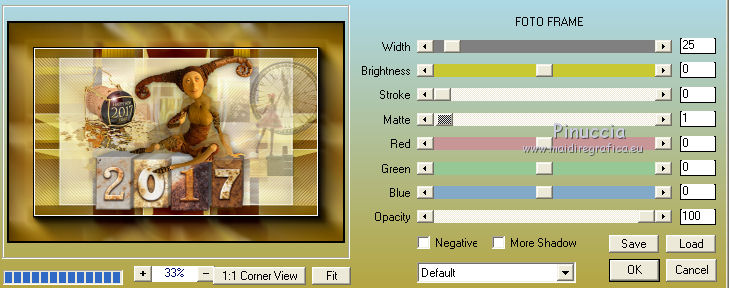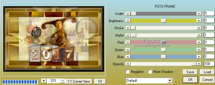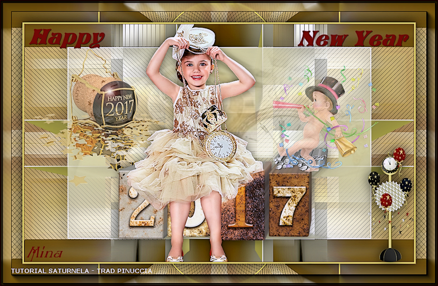 qui puoi trovare qualche risposta ai tuoi dubbi. Se l'argomento che ti interessa non è presente, ti prego di segnalarmelo. Questo tutorial è una creazione di Saturnella e non può essere copiato su altri siti nè essere offerto per il download. Lo stesso vale per la mia traduzione. E' anche proibito togliere il watermark dal materiale; rispettiamo il lavoro dei creatori di tubes, senza i quali non potremmo creare tutorials. Per tradurre questo tutorial, creato con PSP19, ho usato CorelX, ma può essere eseguito anche con le altre versioni di PSP. Dalla versione X4, il comando Immagine>Rifletti è stato sostituito con Immagine>Capovolgi in orizzontale, e il comando Immagine>Capovolgi con Immagine>Capovolgi in verticale. Nelle versioni X5 e X6, le funzioni sono state migliorate rendendo disponibile il menu Oggetti. Nel nuovo X7 sono tornati i comandi Immagine>Rifletti e Immagine>Capovolgi, ma con nuove funzioni. Vedi la scheda sull'argomento qui Occorrente: Materiale qui Per i tubes grazie Krys, Thafs e Maryse. (in questa pagina trovi i links ai loro siti). Filtri in caso di dubbi, ricorda di consultare la mia sezione filtri qui Filters Unlimited 2.0 qui Mock - Windo qui VM Natural - Weave distortion qui Plugin Galaxy - Instant Mirror qui Ap 01 Lines - Lines SilverLining qui Mehdi - Sorting Tiles qui Alien Skin Eye Candy 5 Nature - Rust qui Toadies - Weaver qui Simple - 4 way average qui AAA Frames - Foto Frame qui I filtri VM Natural, Mock, Toadies e Simple si possono usare da soli o importati in Filters Unlimited (come fare vedi qui) Se un filtro fornito appare con questa icona ![]() non esitare a cambiare modalità di miscelatura e opacità secondo i colori utilizzati. Nelle ultime versioni di PSP non c'è il gradiente di primo piano/sfondo (Corel_06_029) Puoi usare i gradienti delle versioni precedenti. Trovi qui i gradienti Corel X. Metti i preset Cliccando sul file una o due volte (a seconda delle tue impostazioni), automaticamente il preset si installerà nella cartella corretta. perchè uno o due clic vedi qui 1. Imposta il colore di primo piano con il colore scuro #704100, e il colore di sfondo con il colore chiaro #fdf26b. ![]() Passa il colore di primo piano a Gradiente di primo piano/sfondo, stile Lineare. ![]() Apri alpha_2017. Finestra>Duplica o sulla tastiera maiuscola+D per fare una copia. ![]() Chiudi l'originale. La copia, che sarà la base del tuo lavoro, non è vuota, ma contiene le selezioni salvate sul canale alfa. Selezione>Seleziona tutto. Apri il Mist_nouvelan2017-022 di Krys, cancella la firma, e vai a Modifica>Copia. Torna al tuo lavoro e vai a Modifica>Incolla nella selezione. Selezione>Deseleziona. 2. Effetti>Effetti di immagine>Motivo unico. ![]() 3. Regola>Sfocatura>Sfocatura radiale. ![]() Effetti>Effetti di bordo>Aumenta di più. 4. Livelli>Nuovo livello raster. Livelli>Disponi>Sposta giù. Riempi il livello con il gradiente lineare.Livelli>Unisci>Unisci visibile. 5. Effetti>Plugins>Mehdi - Sorting Tiles. ![]() 6. Livelli>Duplica. Effetti>Plugins>Mock - Windo. ![]() 7. Effetti>Plugins>Plugin Galaxy - Instant Mirror. ![]() Livelli>Unisci>Unisci visibile. 8. Selezione>Carica/Salva selezione>Carica selezione da canale alfa. la selezione sélection1 è subito disponibile. Devi soltanto cliccare Carica. ![]() Effetti>Plugins>AP 01 Lines - Lines SilverLining. ![]() Selezione>Deseleziona. 9. Selezione>Carica/Salva selezione>Carica selezione da canale alfa. Apri il menu delle selezioni e carica sélection2. ![]() Selezione>Innalza selezione a livello. Effetti>Plugins>VM Natural - Weave Distortion. ![]() Selezione>Deseleziona. 10. Livelli>Duplica. Effetti>Plugins>Toadies - Weaver. ![]() Livelli>Disponi>Sposta giù. Cambia la modalità di miscelatura di questo livello in Luce netta o come preferisci. ![]() Livelli>Unisci>Unisci visibile. 11. Livelli>Nuovo livello raster. Selezione>Carica/Salva selezione>Carica selezione da canale alfa. Apri il menu delle selezioni e carica sélection3. ![]() Imposta il colore di primo piano con il colore bianco. Riempi la selezione con il colore bianco.Selezione>Modifica>Contrai - 2 pixels. Premi sulla tastiera il tasto CANC ![]() 12. Livelli>Nuovo livello raster. Abbassa l'opacità dello strumento Riempimento a 50 ![]() e riempi nuovamente la selezione con il colore bianco.13. Livelli>Nuovo livello raster. Modifica>Incolla nella selezione (il misted di Krys è sempre in memoria). Selezione>Deseleziona. Abbassa l'opacità di questo livello al 30%. Livelli>Unisci>Unisci giù. 14. Attiva il livello sottostante della cornice bianca. Livelli>Duplica. Effetti>Effetti di immagine>Motivo unico, con i settaggi precedenti. ![]() 15. Effetti>Plugins>Alien Skin Eye Candy 5 Impact - Extrude. Seleziona il preset 2017_extrude ok Questi i settaggi in caso di problemi con il preset. se stai usando altri colori imposta Solid color con il tuo colore chiaro. ![]() Cambia la modalità di miscelatura di questo livello in Filtra. ![]() 16. Attiva nuovamente il livello sottostante della cornice. Effetti>Effetti 3D>Sfalsa ombra. ![]() Modifica>Ripeti Sfalsa ombra. 17. Attiva il livello superiore. Apri il tube "2017" di Krys - krysnoel160 - cancella la firma e vai a Modifica>Copia. Torna al tuo lavoro e vai a Modifica>Incolla come nuovo livello. Effetti>Effetti di immagine>Scostamento. ![]() 18. Effetti>Plugins>Alien Skin Eye Candy 5 Impact - Extrude. Seleziona il preset 2017_extrude2 e ok ![]() 19. Apri il tube di thafs "danae_48_tubed by thafs" e vai a Modifica>Copia. Torna al tuo lavoro e vai a Modifica>Incolla come nuovo livello. Immagine>Ridimensiona, al 50%, tutti i livelli non selezionato. Regola>Messa a fuoco>Metti a fuoco. Posiziona il tube su 2017.Livelli>Unisci>Unisci giù. 20. Effetti>Effetti 3D>Sfalsa ombra. ![]() 21. Apri il tube dell'orologio di Maryse MR_New_Year_Time, cancella la firma, e vai a Modifica>Copia. Torna al tuo lavoro e vai a Modifica>Incolla come nuovo livello. Immagine>Ridimensiona, al 50%, tutti i livelli non selezionato. Re