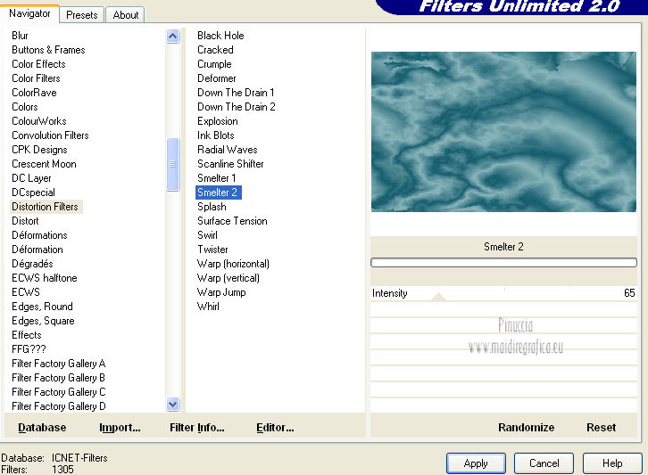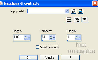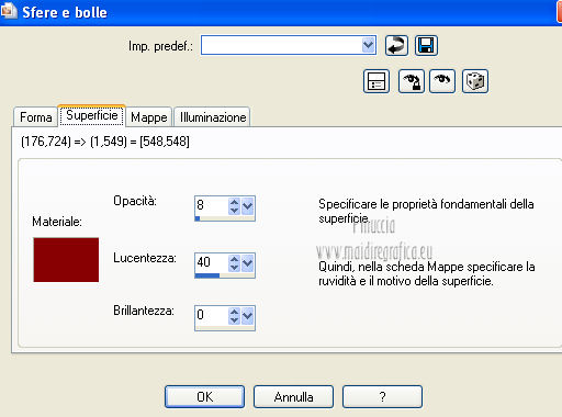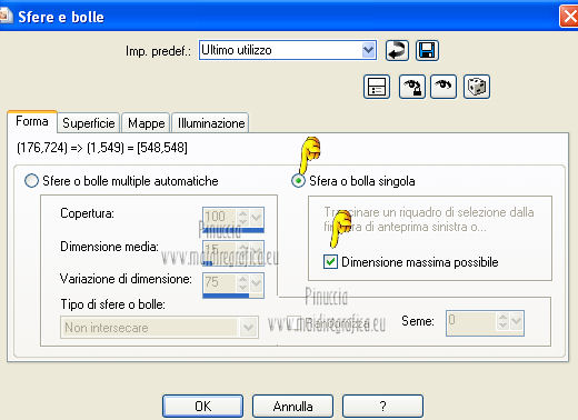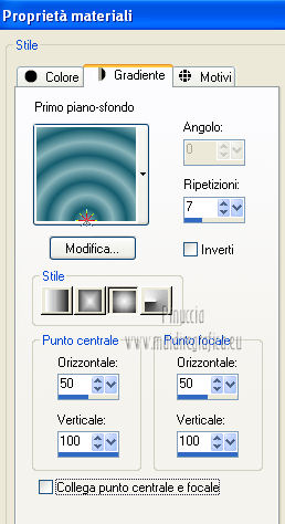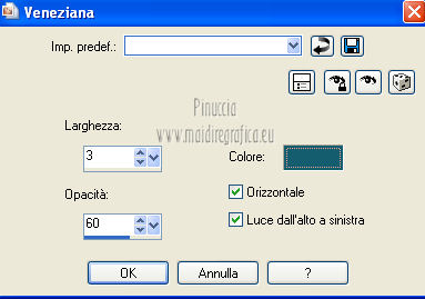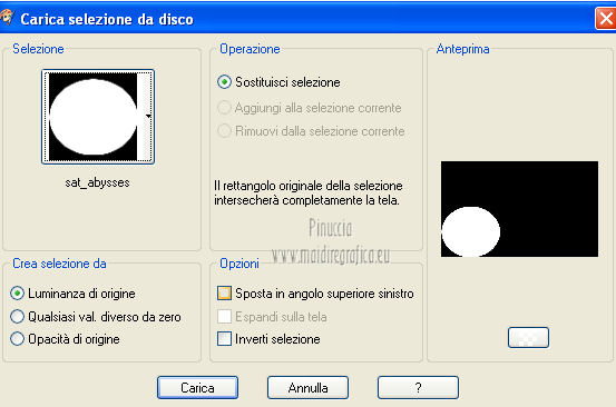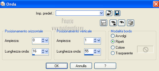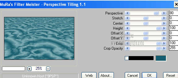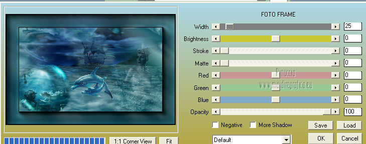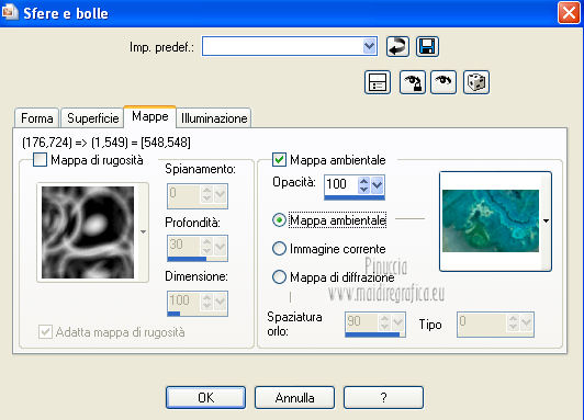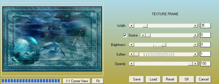 qui puoi trovare qualche risposta ai tuoi dubbi. Se l'argomento che ti interessa non è presente, ti prego di segnalarmelo. Questo tutorial è una creazione di Saturnella e non può essere copiato su altri siti nè essere offerto per il download. Lo stesso vale per la mia traduzione. E' anche proibito togliere il watermark dal materiale; rispettiamo il lavoro dei creatori di tubes, senza i quali non potremmo creare tutorials. Questo tutorial è stato creato con PSP 12, ma può essere eseguito anche con le altre versioni di PSP. Per tradurlo ho usato PSP X. Occorrente: Materiale qui I tubes usati sono di Logane, MKM, Sorensen, FBR e TReagen. Grazie a tutti per il vostro magnifico lavoro. (in questa pagina trovi i links ai loro siti). Filtri in caso di dubbi, ricorda di consultare la mia sezione filtri qui Filters Unlimited 2.0 qui Adjust - Variations qui Mura's Meister - Perspective Shadow qui AAA Frames - Foto Frame, Texture Frame qui Toadies - What are you qui ![]() non esitare a cambiare modalità di miscelatura e opacità secondo i colori utilizzati. Metti la selezione nella cartella Selezioni. Imposta il colore di primo piano con #8ab5bb, e il colore di sfondo con #155d6e. ![]() Passa il colore di primo piano a Gradiente, stile Sprazzo di luce ![]() 1. Apri una nuova immagine trasparente 900 x 550 pixels, riempila con il gradiente.2. Effetti>Plugins>Filters Unlimited 2.0 - Distortion Filters - Smelter 2, con i settaggi standard. ![]() 3. Livelli>Duplica. Effetti>Plugins>Mura's Meister - Perspective Tiling. ![]() 4. Se non visualizzi i righelli, vai a Visualizza>Righelli. Premi il tasto K per attivare lo strumento Puntatore ![]() se stai usando PSP 9 il tasto D (valido per tutte le versioni), per attivare lo strumento Deformazione, in modalità Scala abbassa il nodo superiore centrale fino a 250 pixels. ![]() 5. Effetti>Effetti di distorsione>Onda. ![]() Abbassa l'opacità di questo livello al 44%. 6. Livelli>Nuovo livello raster. Effetti>Effetti artistici>Sfere e bolle. ![]() ![]() ![]() 7. Immagine>Ridimensiona, al 60%, tutti i livelli non selezionato. Effetti>Effetti di immagine>Scostamento. ![]() 8. Selezione>Carica/Salva selezione>Carica selezione da disco. Cerca e carica la selezione sat_abysses. ![]() 9. Livelli>Nuovo livello raster. Apri il tube Misted by Sorensen Designs,Under the sea, e vai a Modifica>Copia. Torna al tuo lavoro e vai a Modifica>Incolla nella selezione. Selezione>Deseleziona. 10. Livelli>Disponi>Sposta giù. 11. Attiva nuovamente il livello soprastante. Livelli>Unisci>Unisci giù. Cambia la modalità di miscelatura di questo livello in Luce netta. 12. Apri il tube MKM Jan 2012 series, e vai a Modifica>Copia. Torna al tuo lavoro e vai a Modifica>Incolla come nuovo livello. Immagine>Ridimensiona, al 70%, tutti i livelli non selezionato. Abbassa l'opacità di questo livello al 33%. 13. Attiva il livello di sfondo. Livelli>Nuovo livello raster. Selezione>Seleziona tutto. Apri il tube logane_mistedciel_30decembre2011 e vai a Modifica>Copia. Torna al tuo lavoro e vai a Modifica>Incolla nella selezione. Sposta il livello un po' più in alto,e leggermente verso sinistra. Cambia la modalità di miscelatura di questo livello in Moltiplica. Selezione>Deseleziona. 14. Apri il tube della sirena TReagen_2909 e vai a Modifica>Copia. Torna al tuo lavoro e vai a Modifica>Incolla come nuovo livello. Immagine>Ridimensiona, all'80%, tutti i livelli non selezionato. Spostalo in basso a destra.Regola>Messa a fuoco>Metti a fuoco. Effetti>Effetti 3D>Sfalsa ombra. ![]() Cambia la modalità di miscelatura di questo livello in Luce diffusa. 15. Apri il tube FBR_dolphins love 6-25-08 e vai a Modifica>Copia. Torna al tuo lavoro e vai a Modifica>Incolla come nuovo livello. Livelli>Disponi>Porta in alto. Immagine>Ridimensiona, al 30%, tutti i livelli non selezionato. Regola>Messa a fuoco>Metti a fuoco. Abbassa l'opacità di questo livello al 73%. 16. Effetti>Effetti 3D>Sfalsa ombra. ![]() Controlla che tutto sia correttamente posizionato. Livelli>Unisci>Unisci tutto. Modifica>Copia. 17. Immagine>Aggiungi bordatura, 2 pixels, simmetriche, con il colore scuro. Immagine>Aggiungi bordatura, 2 pixels, simmetriche, con il colore chiaro. Immagine>Aggiungi bordatura, 2 pixels, simmetriche, con il colore scuro. Immagine>Aggiungi bordatura, 50 pixels, simmetriche, con il colore bianco. 18. Seleziona il bordo bianco con la bacchetta magica ![]() Modifica>Incolla nella selezione. 19. Regola>Sfocatura>Sfocatura gaussiana - raggio 20. ![]() 20. Effetti>Effetti di trama>Veneziana. ![]() 21. Effetti>Plugins>Toadies - What are you. ![]() Ripeti l'Effetto una seconda volta. Effetti>Effetti di bordo>Aumenta. 22. Selezione>Inverti. Effetti>Effetti 3D>Sfalsa ombra. ![]() Selezione>Deseleziona. 23. Effetti>Plugins>AAA Frames - Texture Frame. ![]() 24. Effetti>Plugins>AAA Frames - Foto Frame. ![]() 25. Apri il tube "texte" e vai a Modifica>Copia. Torna al tuo lavoro e vai a Modifica>Incolla come nuovo livello. (se preferisci, scrivi un testo a tua scelta). 26. Aggiungi il tuo nome e/o il tuo watermark su un nuovo livello. Immagine>Aggiungi bordatura, 1 pixel, simmetriche, con il colore nero. Immagine>Ridimensiona, a 900 pixels di larghezza, tutti i livelli selezionato. Regola>Messa a fuoco>Maschera di contrasto. ![]() 27. Effetti>Plugins>Adjust - Variations. Un clic su Original per annullare eventuali precedenti settaggi memorizzati dal filtro. Un clic su More Red e ok. (settaggi da regolare in base ai tuoi colori). Salva in formato jpg. ![]() Se hai problemi o dubbi, o trovi un link non funzionante, o anche soltanto per dirmi che ti è piaciuto, scrivimi. 25 Ottobre 2012 |