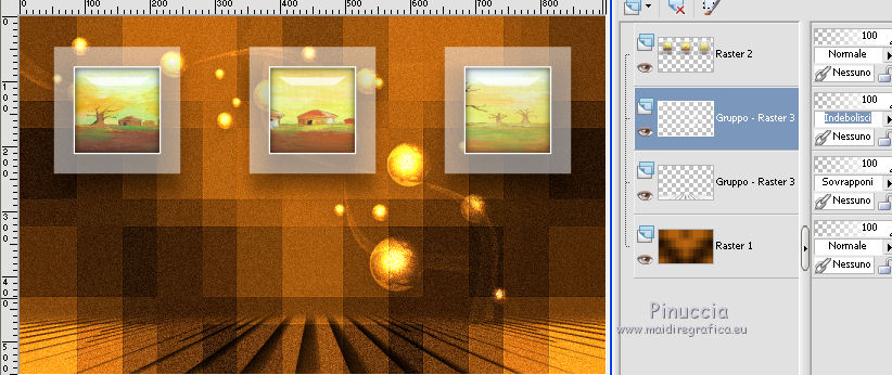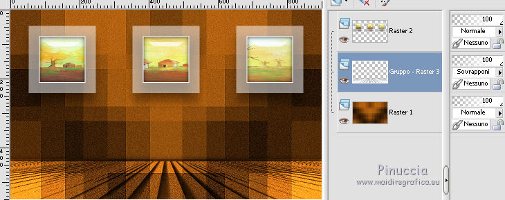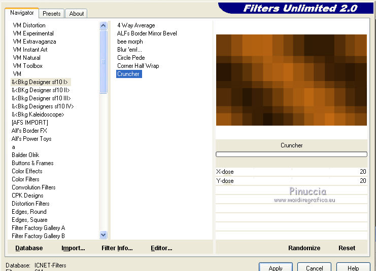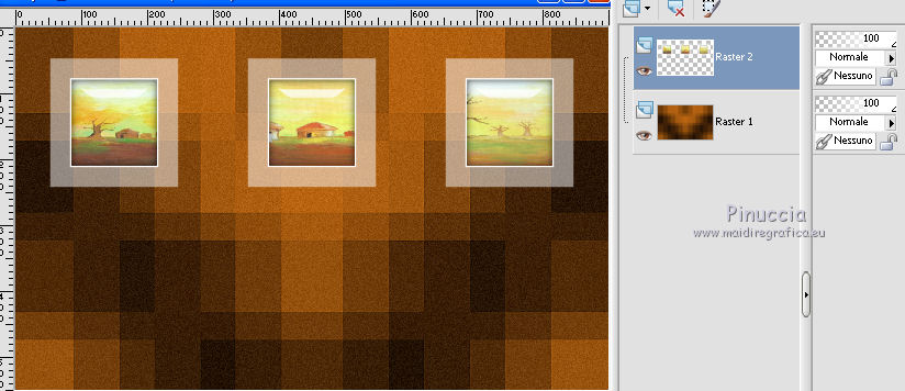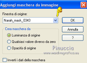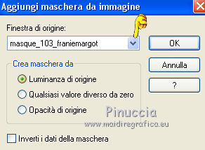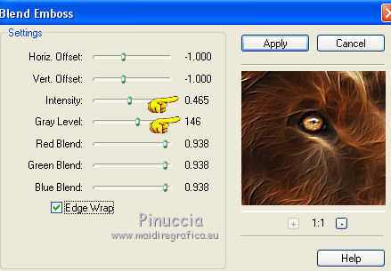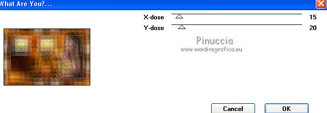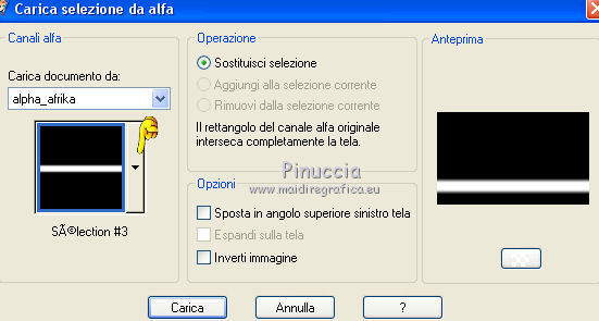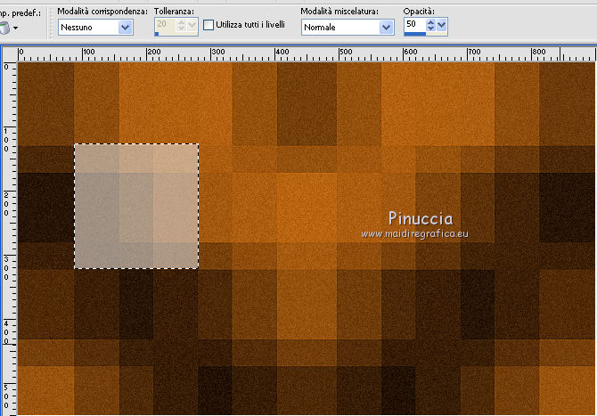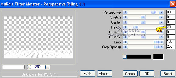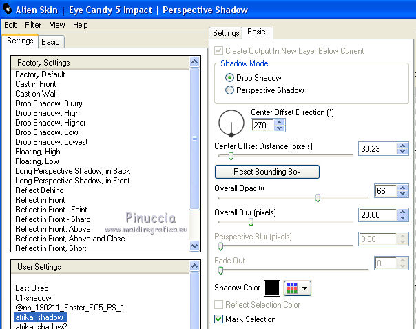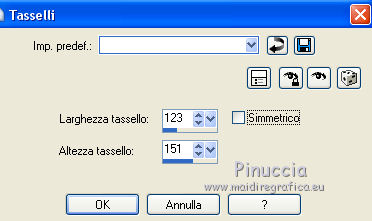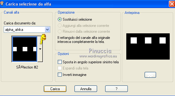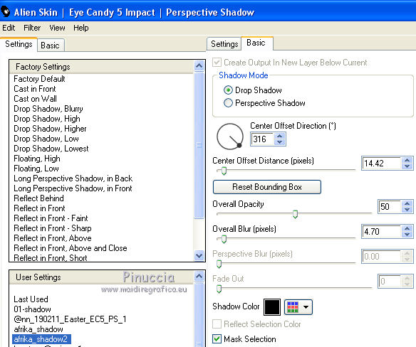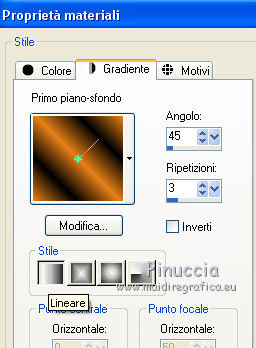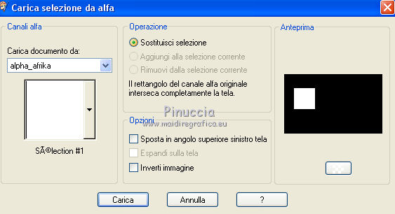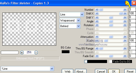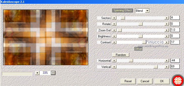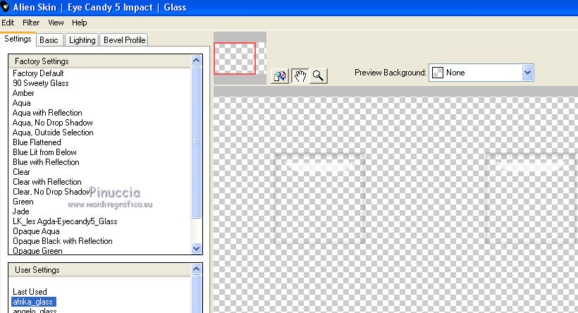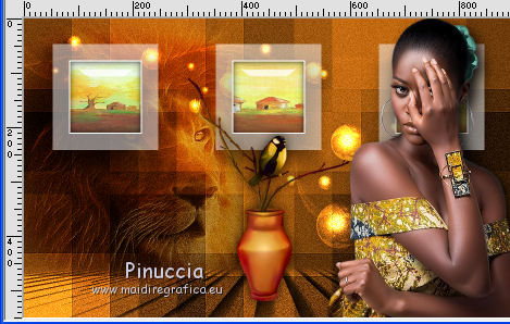qui puoi trovare qualche risposta ai tuoi dubbi. Se l'argomento che ti interessa non è presente, ti prego di segnalarmelo. Questo tutorial è una creazione di Saturnella e non può essere copiato su altri siti nè essere offerto per il download. Lo stesso vale per la mia traduzione. E' anche proibito togliere il watermark dal materiale; rispettiamo il lavoro dei creatori di tubes, senza i quali non potremmo creare tutorials. Per tradurre questo tutorial, creato con PSP16, ho usato CorelX, ma può essere eseguito anche con le altre versioni di PSP. Dalla versione X4, il comando Immagine>Rifletti è stato sostituito con Immagine>Capovolgi in orizzontale, e il comando Immagine>Capovolgi con Immagine>Capovolgi in verticale. Nelle versioni X5 e X6, le funzioni sono state migliorate rendendo disponibile il menu Oggetti. Nel nuovo X7 sono tornati i comandi Immagine>Rifletti e Immagine>Capovolgi, ma con nuove funzioni. Vedi la scheda sull'argomento qui Occorrente: Materiale qui Grazie: per i tubes Beatriz, Montana e Ann; per le maschere Franiemargot e Narah. (in questa pagina trovi i links ai loro siti). Filtri in caso di dubbi, ricorda di consultare la mia sezione filtri qui Filters Unlimited 2.0 qui &<Bkg Designer sf10I> - Cruncher (da importare in Unlimited) qui Mura's Meister - Copies qui Mura's Meister - Perspective Tiling qui FM Tile Tools - Blend Emboss qui Toadies - What are you qui Mehdi - Kaleidoscope 2.1 qui Alien Skin Eye Candy 5 Impact - Perspective Shadow, Glass qui I filtri Toadies si possono usare da soli o importati in Filters Unlimited (come fare vedi qui) Se un filtro fornito appare con questa icona ![]() non esitare a cambiare modalità di miscelatura e opacità secondo i colori utilizzati. Nelle ultime versioni di PSP non c'è il gradiente di primo piano/sfondo (Corel_06_029) Puoi usare i gradienti delle versioni precedenti. Trovi qui i gradienti Corel X. Metti i presets Cliccando sul file una o due volte (a seconda delle tue impostazioni), automaticamente il preset si installerà nella cartella corretta. perchè uno o due clic vedi qui Se preferisci, puoi importare direttamente il preset nel corso del tutorial Come fare vedi la scheda del filtro Eye Candy qui Apri le maschere in PSP e minimizzale con il resto del materiale. Imposta il colore di primo piano con #e78019, e il colore di sfondo con il colore nero. ![]() Passa il colore di primo piano a Gradiente di primo piano/sfondo, stile Lineare. ![]() 1. Apri alpha_afrika. Finestra>Duplica, o sulla tastiera maiuscola+D, per fare una copia. ![]() Chiudi l'originale. La copia, che sarà la base del tuo lavoro, non è vuota, ma contiene le selezioni salvate sul canale alfa. 2. Riempi l'immagine trasparente con il gradiente.3. Regola>Sfocatura>Sfocatura gaussiana - raggio 50. ![]() 4. Effetti>Effetti di distorsione>Tasselli. ![]() 5. Effetti>Plugins>Filters Unlimited 2.0 - &<Bkg Designer sf10I> - Cruncher, con i settaggi standard. ![]() 6. Effetti>Effetti di riflesso>Specchio rotante. ![]() Regola>Messa a fuoco>Accentua messa a fuoco. 7. Regola>Aggiungi/Rimuovi disturbo>Aggiungi disturbo. ![]() Regola>Messa a fuoco>Metti a fuoco. 8. Selezione>Carica/Salva selezione>Carica selezione da canale alfa. La selezione Sélection#1 è subito disponibile. Devi soltanto cliccare Carica. ![]() Livelli>Nuovo livello raster. Imposta il colore di primo piano con il colore bianco. Abbassa l'opacità dello strumento Riempimento a 50 Riempi la selezione con il colore bianco.![]() 9. Selezione>Modifica>Contrai - 30 pixels. ![]() Premi sulla tastiera il tasto CANC ![]() Riporta l'opacità dello strumento Riempimento a 100 e riempi la selezione nuovamente con il colore bianco.Selezione>Modifica>Contrai - 2 pixels. ![]() Premi sulla tastiera il tasto CANC. Selezione>Deseleziona. 10. Effetti>Plugins>Mura's Meister - Copies. ![]() 11. Effetti>Effetti di immagine>Scostamento. ![]() 12. Selezione>Carica/Salva selezione>Carica selezione da canala alfa. apri il menu delle selezioni e carica sélection#2. ![]() Livelli>Nuovo livello raster. Apri l'immagine image_afrika e vai a Modifica>Copia. Torna al tuo lavoro e vai a Modifica>Incolla nella selezione. 13. Livelli>Nuovo livello raster. Effetti>Effetti 3D>Ritaglio. ![]() 14. Livelli>Nuovo livello raster. Effetti>Plugins>Alien Skin Eye Candy 5 Impact - Glass. Seleziona il preset afrika-glass e ok. ![]() Questi i settaggi, in caso di problemi con il preset. ![]() Selezione>Deseleziona. Livelli>Unisci>Unisci giù 3 volte. ![]() 15. Effetti>Plugins>Alien Skin Eye Candy 5 Impact - Perspective Shadow. seleziona il preset afrika_shadow e ok. ![]() 16. Attiva il livello di sfondo. Livelli>Nuovo livello raster. Riempi con il colore bianco.Livelli>Nuovo livello maschera>Da immagine. Apri il menu sotto la finestra di origine e vedrai la lista dei files aperti. Seleziona la maschera Narah_Mask_0343. ![]() Effetti>Effetti di bordo>Aumenta. Livelli>Unisci>Unisci gruppo. 17. Effetti>Plugins>Mura's Meister - Perspective Tiling. ![]() 18. Effetti>Effetti 3D>Sfalsa ombra. ![]() Cambia la modalità di miscelatura di questo livello in Sovrapponi o altro. ![]() 19. Selezione>Carica/Salva selezione>Carica selezione da canala alfa. apri il menu delle selezioni e carica sélection#3. ![]() Premi sulla tastiera il tasto CANC. Selezione>Deseleziona. 20. Livelli>Nuovo livello raster. Riempi con il colore bianco.Livelli>Nuovo livello maschera>Da immagine. Apri il menu sotto la finestra di origine e seleziona la maschera masque_103_franiemargot. ![]() Livelli>Unisci>Unisci gruppo. Immagine>Rifletti. Posiziona la maschera a tuo piacimento.Cambia la modaltà di miscelatura di questo livello in Indebolisci o altro. ![]() 21. Effetti>Effetti 3D>Sfalsa ombra, con i settaggi precedenti. 22. Attiva il livello di sfondo. Apri il tube del leone di Montana e vai a Modifica>Copia. Torna al tuo lavoro e vai a Modifica>Incolla come nuovo livello. Immagine>Rifletti. Immagine>Ridimensiona, all'80%, tutti i livelli non selezionato. Sposta il tube a 