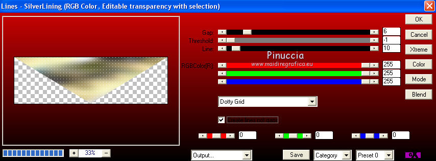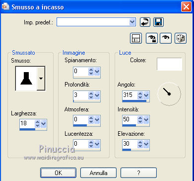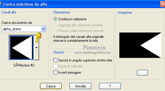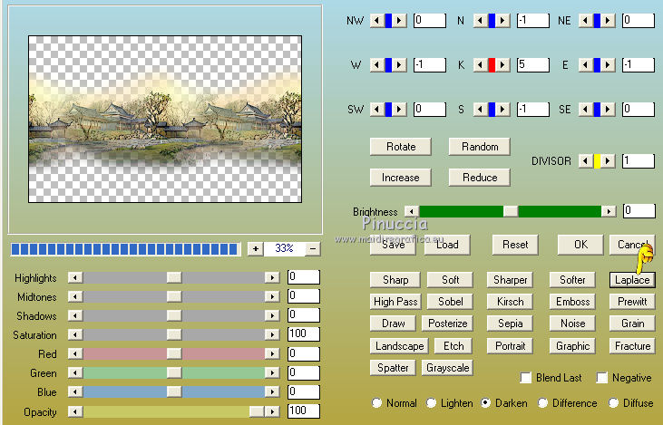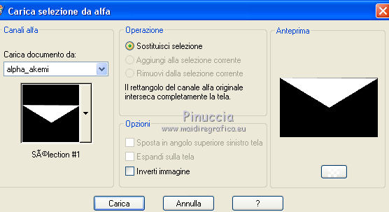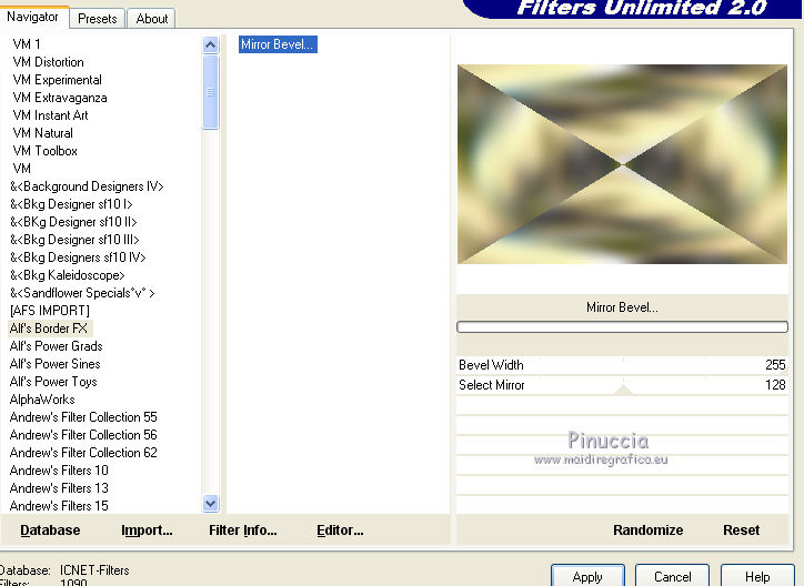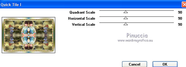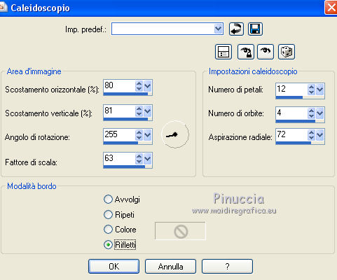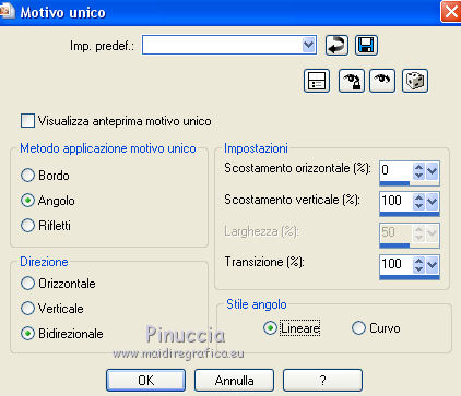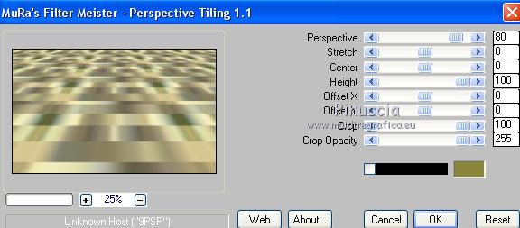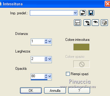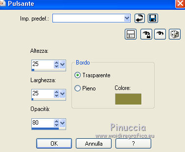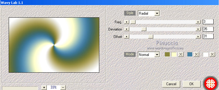 qui puoi trovare qualche risposta ai tuoi dubbi. Se l'argomento che ti interessa non è presente, ti prego di segnalarmelo. Questo tutorial è una creazione di Saturnella e non può essere copiato su altri siti nè essere offerto per il download. Lo stesso vale per la mia traduzione. E' anche proibito togliere il watermark dal materiale; rispettiamo il lavoro dei creatori di tubes, senza i quali non potremmo creare tutorials. Per tradurre questo tutorial, creato con Corel2018, ho usato CorelX, ma può essere eseguito anche con le altre versioni di PSP. Dalla versione X4, il comando Immagine>Rifletti è stato sostituito con Immagine>Capovolgi in orizzontale, e il comando Immagine>Capovolgi con Immagine>Capovolgi in verticale. Nelle versioni X5 e X6, le funzioni sono state migliorate rendendo disponibile il menu Oggetti. Nel nuovo X7 sono tornati i comandi Immagine>Rifletti e Immagine>Capovolgi, ma con nuove funzioni. Vedi la scheda sull'argomento qui Occorrente: Materiale qui Tutto il materiale è di Saturnella. (in questa pagina trovi i links ai loro siti). Filtri in caso di dubbi, ricorda di consultare la mia sezione filtri qui Filters Unlimited 2.0 qui Mehdi - Wavy Lab 1.1 qui Alf's Border FX - Mirror Bevel qui AP 01 Innovations - Lines SilverLining qui Mura's Meister - Perspective Tiling qui AAA Filters - Custom qui Simple - Blintz qui Graphics Plus - Vertical mirror, Quick Tile I qui I filtri Alf's Border FX, Simple e Graphics Plus si possono usare da soli o importati in Filters Unlimited (come fare vedi qui) Se un filtro fornito appare con questa icona ![]() non esitare a cambiare modalità di miscelatura e opacità secondo i colori utilizzati. Colori utilizzati ![]() 1. Imposta il colore di primo piano con il colore #ffffcd, e il colore di sfondo con il colore #8a863c. ![]() Apri alpha_akemi. Finestra>Duplica, o sulla tastiera tasto della maiuscola+D per fare una copia. ![]() Chiudi l'originale. La copia, che sarà la base del tuo lavoro, non è vuota, ma contiene le selezioni salvate sul canale alfa. Rinomina il livello Raster 1. 2. Effetti>Plugins>Mehdi - Wavy Lab 1.1 Questo filtro crea gradienti con i colori della tua paletta: il primo è il colore di sfondo, il secondo quello di primo piano; degli ultimi due colori creati dal filtro cambia il terzo colore con il colore 3 #4681a4 e il quarto con il colore bianco #ffffff. ![]() 3. Livelli>Nuovo livello raster. Selezione>Seleziona tutto. Apri il tube del paesaggio e vai a Modifica>Copia. Torna al tuo lavoro e vai a Modifica>Incolla nella selezione. Selezione>Deseleziona. 4. Effetti>Effetti di immagine>Motivo unico, con i settaggi standard. ![]() Regola>Sfocatura>Sfocatura gaussiana, raggio 30. ![]() Livelli>Unisci>Unisci giù. 5. Effetti>Plugins>Filters Unlimited 2.0 - Alf's Border FX - Mirror Bevel. ![]() 6. Selezione>Carica/Salva selezione>Carica selezione da canale alfa. La selezione sélection#1 è subito disponibile. Devi soltanto cliccare Carica. ![]() Selezione>Innalza selezione a livello. Effetti>Plugins>AP 01 Innovations - Lines SilverLining. ![]() Selezione>Deseleziona. 7. Livelli>Duplica. Immagine>Capovolgi. Livelli>Unisci>Unisci giù. 8. Attiva il livello di sfondo. Selezione>Carica/Salva selezione>Carica selezione da canale alfa. Apri il menu delle selezioni e carica sélection#2. ![]() Selezione>Innalza selezione a livello. Effetti>Effetti di trama>Intessitura colore intessitura: colore scuro. ![]() Selezione>Deseleziona. 9. Livelli>Duplica. Immagine>Rifletti Livelli>Unisci>Unisci giù. 10. Attiva il livello superiore. Livelli>Unisci>Unisci giù. 11. Livelli>Duplica. Immagine>Ridimensiona, al 70%, tutti i livelli non selezionato. Immagine>Ruota per gradi - 90 gradi a destra. ![]() Effetti>Effetti 3D>Sfalsa ombra. ![]() Livelli>Unisci>Unisci giù. 12. Effetti>Plugins>Simple - Blintz. 13. Effetti>Effetti di riflesso>Specchio rotante. ![]() 14. Livelli>Duplica. Immagine>Capovolgi. Cambia la modalità di miscelatura di questo livello in Moltiplica, e abbassa l'opacità al 50%. 15. Effetti>Plugins>Graphics Plus - Vertical Mirror. ![]() Livelli>Unisci>Unisci giù. 16. Selezione>Carica/Salva selezione>Carica selezione da canale alfa. Apri il menu delle selezioni e carica sélection#3. ![]() Selezione>Innalza selezione a livello. Effetti>Effetti 3D>Smusso a incasso. ![]() Selezione>Deseleziona. 17. Livelli>Duplica. Premi sulla tastiera il tasto K per attivare lo strumento Puntatore ![]() e imposta Posizione X: 1,00 e Posizione Y: 533,00. ![]() Livelli>Unisci>Unisci giù. 18. Effetti>Effetti 3D>Sfalsa ombra, con i settaggi precedenti. ![]() 19. Attiva il livello di sfondo. Livelli>Disponi>Sposta su. Effetti>Effetti di distorsione>Tasselli. ![]() 20. Effetti>Plugins>Mura's Meister - Perspective Tiling. ![]() 21. Attiva lo strumento Puntatore ![]() modalità Scala ![]() spingi il nodo centrale in alto verso il basso fino a 440 pixels ![]() Tasto M per deselezionare lo strumento. 22. Attiva lo strumento Bacchetta magica , sfumatura 40e clicca nella parte trasparente per selezionarla. Premi 5 o 6 volte CANC sulla tastiera ![]() ![]() Selezione>Deseleziona. 23. Effetti>Effetti 3D>Sfalsa ombra, con i settaggi precedenti. ![]() 24. Attiva il livello superiore. Modifica>Incolla come nuovo livello (il tube del paesaggio è sempre in memoria). Effetti>Effetti di immagine>Motivo unico. ![]() Effetti>Plugins>AAA Filters - Custom Clicca su Laplace e ok. ![]() 25. Livelli>Duplica. Cambia la modalità di miscelatura di questo livello in Moltiplica, e abbassa l'opacità al 70%. 26. Apri il tube deco e vai a Modifica>Copia. Torna al tuo lavoro e vai a Modifica>Incolla come nuovo livello. Immagine>Ridimensiona, al 60%, tutti i livelli non selezionato. Spostalo a sinistra.Effetti>Effetti 3D>Sfalsa ombra, con i settaggi precedenti. ![]() 27. Apri il tube femme asi_03 e vai a Modifica>Copia. Torna al tuo lavoro e vai a Modifica>Incolla come nuovo livello. Immagine>Ridimensiona, al 70%, tutti i livelli non selezionato. Regola>MEssa a fuoco>Metti a