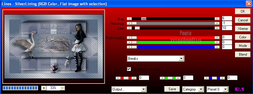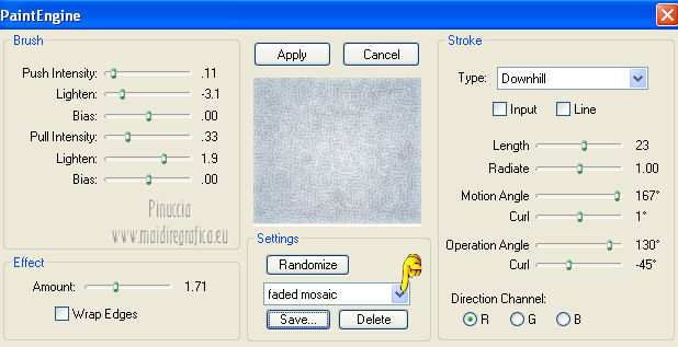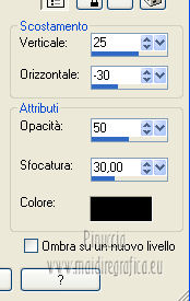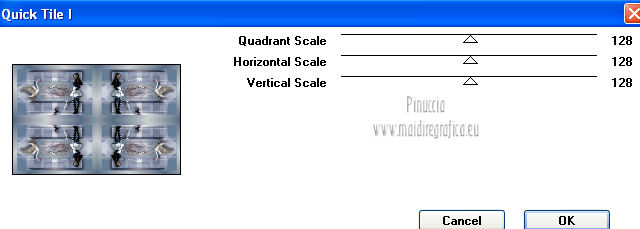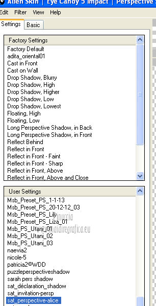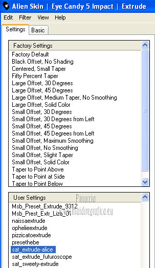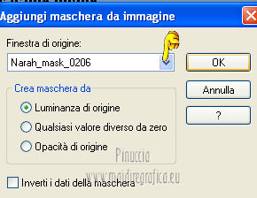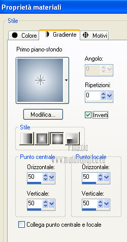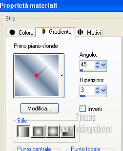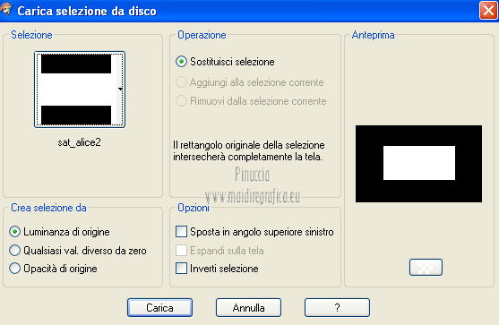 qui puoi trovare qualche risposta ai tuoi dubbi. Se l'argomento che ti interessa non è presente, ti prego di segnalarmelo. Questo tutorial è una creazione di Saturnella e non può essere copiato su altri siti nè essere offerto per il download. Lo stesso vale per la mia traduzione. E' anche proibito togliere il watermark dal materiale; rispettiamo il lavoro dei creatori di tubes, senza i quali non potremmo creare tutorials. Questo tutorial è stato creato con PSP 12, ma può essere eseguito anche con le altre versioni di PSP. Per tradurlo ho usato PSP X. Occorrente: Materiale qui I tubes usati sono di Jenny, LuzCristina e Betsie. La maschera è di Narah. Grazie a tutti per il vostro magnifico lavoro. (in questa pagina trovi i links ai loro siti). Filtri in caso di dubbi, ricorda di consultare la mia sezione filtri qui AP 01 [Innovations] - Lines SilverLining qui Fantastic Machine - Paint Engine qui Graphics Plus - Quick Tile 1 qui Alien Skin Eye Candy 5 Impact qui ![]() non esitare a cambiare modalità di miscelatura e opacità secondo i colori utilizzati. Metti i preset nelle rispettive cartelle del filtro Alien Skin Eye Candy 5 Impact>Setting>Bevel/Extrude/Glass. Clicca sul file una o due volte (a seconda delle tue impostazioni) il preset si installerà automaticamente nella cartella corretta. perchè uno o due clic vedi qui Metti le selezioni nella cartella Selezioni. Apri la maschera in PSP e minimizzala con il resto del materiale. 1. Imposta il colore di primo piano con #69819d, e il colore di sfondo con #f7fbfe. ![]() Apri una nuova immagine trasparente 900 x 550 pixels, e riempila con il colore scuro di primo piano.2. Effetti>Plugins>AP 01 [Innovations] - Lines SilverLining. ![]() 3. Livelli>Nuovo livello raster. Riempi con il colore chiaro.4. Livelli>Nuovo livello maschera>Da immagine. Apri il menu sotto la finestra di origine e vedrai la lista dei files aperti. Seleziona la maschera Narah_mask_0206, con i seguenti settaggi: ![]() Effetti>Effetti di bordo>Aumenta. Livelli>Unisci>Unisci gruppo. 5. Effetti>Effetti 3D>Sfalsa ombra, con il colore #75326a. ![]() Livelli>Unisci>Unisci visibile. 6. Selezione>Carica/Salva selezione>Carica selezione da disco. Cerca e carica la selezione sat_alice1. ![]() Selezione>Innalza selezione a livello. Selezione>Deseleziona. 7. Effetti>Plugins>Alien Skin Eye Candy 5 Impact - Extrude. Seleziona il preset sat_extrude-alice e ok. ![]() 8. Livelli>Duplica. Effetti>Effetti di immagine>Scostamento. ![]() Livelli>Unisci>Unisci giù. Cambia la modalità di miscelatura di questo livello in Moltiplica (o secondo i tuoi colori). 9. Effetti>Plugins>Alien Skin Eye Candy 5 Impact - Perspective Shadow. Seleziona il preset sat_perspective-alice e ok. ![]() 10. Selezione>Carica/Salva selezione>Carica selezione da disco. Cerca e carica la selezione sat_alice2. ![]() 11. Livelli>Nuovo livello raster. Passa il colore di primo piano a Gradiente, stile Sprazzo di luce. ![]() Riempi il livello con il gradiente.12. Effetti>Plugins>Fantastic Machine - Paint Engine, seleziona il preset "faded mosaic" e ok. ![]() se non vedi la lista dei preset, è probabile che, installando il filtro, non abbia eseguito i passaggi necessari. Per avere tutti i preset devi copiare nella cartella di Window un file fornito insieme al filtro. Vedi gli appunti su Paint Engine qui In ogni caso, puoi impostare manualmente i settaggi corrispondenti al preset "faded mosaic" che vedi nella schermata. 13. Livelli>Nuovo livello raster. Apri il tube del paesaggio "1366-luzcristina", e vai a Modifica>Copia. Torna al tuo lavoro e vai a Modifica>Incolla nella selezione. Selezione>Deseleziona. 14. Apri il tube "Jen Vrouw 183 16-01-2010", e vai a Modifica>Copia. Torna al tuo lavoro e vai a Modifica>Incolla come nuovo livello. Immagine>Ridimensiona, all'80%, tutti i livelli non selezionato. Regola>Messa a fuoco>Metti a fuoco. Spostalo a destra, o dove preferisci.Effetti>Effetti 3D>Sfalsa ombra, con settaggi a tua scelta. 15. Apri il tube di Betsie "Betsie 654 08-02-2011" e vai a Modifica>Copia. Torna al tuo lavoro e vai a Modifica>Incolla come nuovo livello. Immagine>Ridimensiona, al 60%, tutti i livelli non selezionato. Immagine>Rifletti. Regola>Messa a fuoco>Metti a fuoco. 16. Effetti>Effetti 3D>Sfalsa ombra, con il colore nero. ![]() Spostalo a destra.17. Apri il tube "texte" (o, se preferisci, scrivi un tuo testo) e vai a Modifica>Copia. Torna al tuo lavoro e vai a Modifica>Incolla come nuovo livello. Spostalo dove preferisci o vedi il mio esempio.18. Livelli>Unisci>Unisci tutto. 19. Immagine>Aggiungi bordatura, 2 pixels, simmetriche, con il colore scuro. Immagine>Aggiungi bordatura, 50 pixels, simmetriche, con il colore chiaro. Seleziona il bordo da 50 pixels con la bacchetta magica ![]() Cambia i settaggi del gradiente in stile Lineare. ![]() Riempi la selezione con il gradiente.20. Effetti>Plugins>AP 01 [Innovations] - Lines SilverLining. ![]() 21. Effetti>Plugins>Graphics Plus - Quick tile I. ![]() Selezione>Inverti. Effetti>Effetti 3D>Sfalsa ombra, con il colore nero. ![]() Selezione>Deseleziona. 22. Immagine>Aggiungi bordatura, 2 pixels, simmetriche, con il colore scuro. Firma il tuo lavoro. Immagine>Ridimensiona, a 900 pixels di larghezza, tutti i livelli selezionato. Salva in formato jpg. ![]() Se hai problemi o dubbi, o trovi un link non funzionante, o anche soltanto per dirmi che ti è piaciuto, scrivimi. 16 Gennaio 2013 |