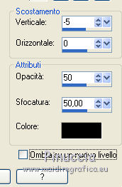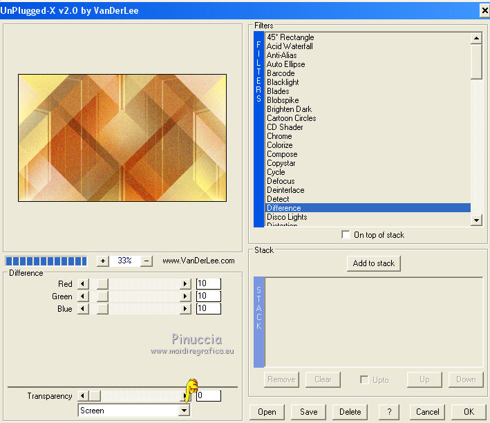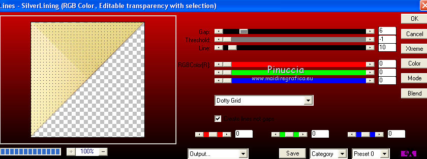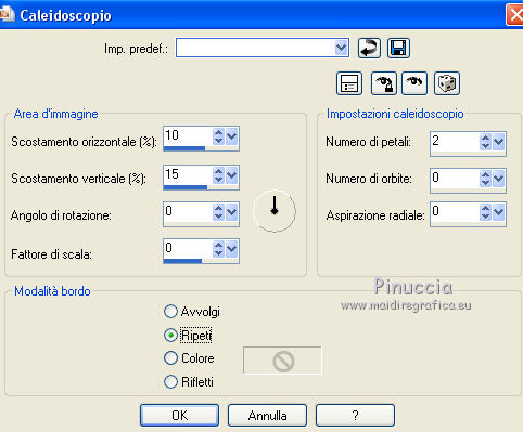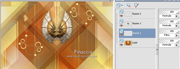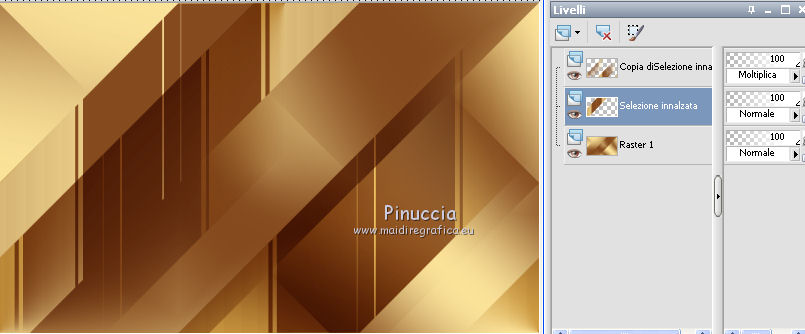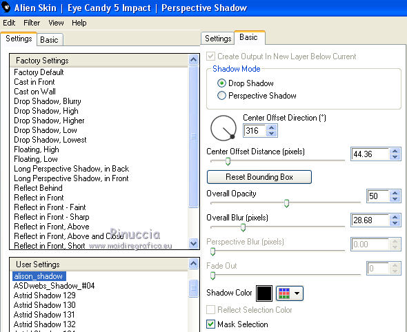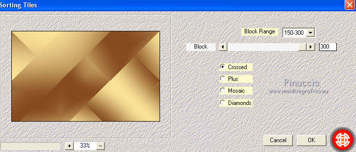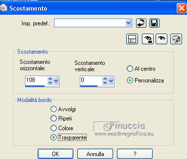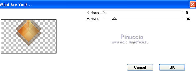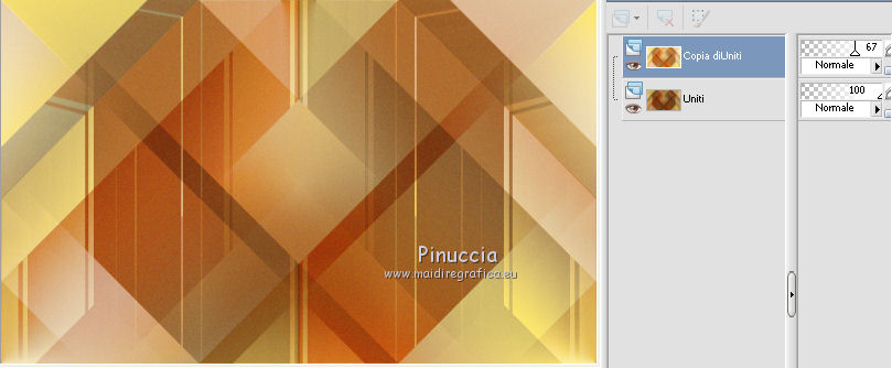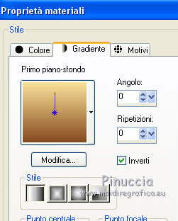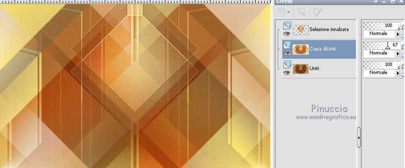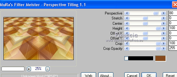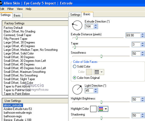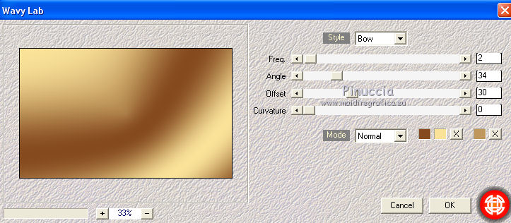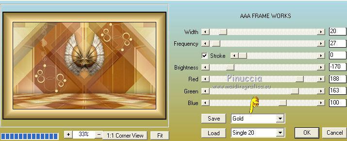 qui puoi trovare qualche risposta ai tuoi dubbi. Se l'argomento che ti interessa non è presente, ti prego di segnalarmelo. Questo tutorial è una creazione di Saturnella e non può essere copiato su altri siti nè essere offerto per il download. Lo stesso vale per la mia traduzione. E' anche proibito togliere il watermark dal materiale; rispettiamo il lavoro dei creatori di tubes, senza i quali non potremmo creare tutorials. Per tradurre questo tutorial, creato con X15, ho usato CorelX, ma può essere eseguito anche con le altre versioni di PSP. Dalla versione X4, il comando Immagine>Rifletti è stato sostituito con Immagine>Capovolgi in orizzontale, e il comando Immagine>Capovolgi con Immagine>Capovolgi in verticale. Nelle versioni X5 e X6, le funzioni sono state migliorate rendendo disponibile il menu Oggetti. Vedi la scheda sull'argomento qui Occorrente: Materiale qui Grazie Jet per il tube della donna, Krys per il tube steampunk e Maryse per il tube del vaso. (in questa pagina trovi i links ai loro siti). Filtri in caso di dubbi, ricorda di consultare la mia sezione filtri qui Filters Unlimited 2.0 qui Mehdi - Wavy Lab, Sorting Tiles qui AAA Frames - Frame Works qui L&L's - L&K's Raisa qui VanDerLee - Unplugged-X qui Mura's Meister - Perspective Tiling qui Toadies - What are you qui Alien Skin Eye Candy 5 Impact - Perspective Tiling, Extrude qui AP 01 [Innovations] - Lines SilverLining qui I filtri Toadies si possono usare da soli o importati in Filters Unlimited (come fare vedi qui) Se un filtro fornito appare con questa icona ![]() non esitare a cambiare modalità di miscelatura e opacità secondo i colori utilizzati. Metti i preset Cliccando sul file una o due volte (a seconda delle tue impostazioni), automaticamente il preset si installerà nella cartella corretta. perchè uno o due clic vedi qui Apri il pennello (cartella pinceau) in PSP. File>Exporta>Pennello personalizzato, assegna un nome al pennello e ok. ![]() 1. Imposta il colore di primo piano con #fae299, e il colore di sfondo con #854a1e. ![]() Apri alpha_alison. Finestra>Duplica, o sulla tastiera maiuscola+D, per fare una copia. Chiudi l'originale. La copia, che sarà la base del tuo lavoro, non è vuota, ma contiene le selezioni salvate sul canale alfa. Rinomina il livello Raster 1. 2. Effetti>Plugins>Mehdi - Wavy Lab. Questo filtro lavora con i colori della paletta dei materiali. Il primo è il colore di sfondo, il secondo quello di primo piano. Mantieni il terzo colore creato dal filtro. ![]() 3. Effetti>Plugins>Mehdi - Sorting Tiles. ![]() 4. Selezione>Carica/Salva selezione>Carica selezione da canale alfa. La selezione sélection1 è subito disponibile. Devi soltanto cliccare Carica. ![]() Selezione>Innalza selezione a livello. 5. Effetti>Plugins>L&K's - L&K's Raisa. ![]() Selezione>Deseleziona. 6. Livelli>Duplica. Immagine>Capovolgi. 7. Effetti>Effetti di immagine>Motivo unico. ![]() Cambia la modalità di miscelatura di questo livello in Moltiplica, o secondo i tuoi colori. 8. Attiva il livello sottostante (selezione innalzata). ![]() Effetti>Plugins>Alien Skin Eye Candy 5 Impact - Extrude. Seleziona il preset alison_extrude e ok In caso di problemi con il preset, puoi copiare i settaggi che vedi nella schermata. ![]() 9. Livelli>Unisci>Unisci visibile. 10. Livelli>Duplica. Immagine>Rifletti. cambia la modalità di miscelatura di questo livello in Luminanza, o secondo i tuoi colori, e abbassa l'opacità al 55%. ![]() Livelli>Unisci>Unisci visibile. 11- Livelli>Duplica. Effetti>Plugins>VanDerLee - Unplugged-X - Difference. ![]() Per il mio esempio ho abbassato l'opacità di questo livello al 67%, decidi secondo i tuoi colori. ![]() 12- Selezione>Carica/Salva selezione>Carica selezione da canale alfa. Apri il menu delle selezioni e carica sélection2. ![]() Selezione>Innalza selezione a livello. 13. Selezione>Modifica>Seleziona bordature selezione. ![]() Passa il colore di primo piano a Gradiente di primo piano/sfondo, stile Lineare. ![]() Riempi la selezione con il gradiente.Selezione>Deseleziona. 14. Effetti>Plugins>Toadies - What are you. ![]() Effetti>Effetti di bordo>Aumenta. 15. Attiva il livello sottostante. ![]() Selezione>Carica/Salva selezione>Carica selezione da canale alfa. Apri il menu delle selezioni e carica sélection3. ![]() Selezione>Innalza selezione a livello. Mantieni selezionato. 16. Effetti>Plugins>AP 01 Innovations - Lines SilverLining. ![]() Selezione>Deseleziona. 17. Effetti>Plugins>Toadies What are you, con i settaggi precedenti. ![]() Effetti>Effetti di bordo>Aumenta. 18. Livelli>Duplica. Immagine>Rifletti. Livelli>Unisci>Unisci visibile. 19. Apri il tube steampunk di Krys e vai a Modifica>Copia. Torna al tuo lavoro e vai a Modifica>Incolla come nuovo livello. Non spostarlo. Immagine>Ridimensiona, al 60%, tutti i livelli non selezionato. 20. Livelli>Duplica. Immagine>Rifletti. Effetti>Effetti di immagine>Scostamento. ![]() Livelli>Unisci>Unisci giù. 21. Immagine>Ridimensiona, all'85%, tutti i livelli non selezionato. Effetti>Effetti di immagine>Scostamento. ![]() Regola>Messa a fuoco>Metti a fuoco. 22. Effetti>Effetti 3D>Sfalsa ombra. ![]() 23. Apri il tube déco1 e vai a Modifica>Copia. Torna al tuo lavoro e vai a Modifica>Incolla come nuovo livello. Effetti>Effetti di immagine>Scostamento. ![]() 24. Effetti>Effetti 3D>Sfalsa ombra. ![]() 25. Attiva il livello di sfondo. Livelli>Nuovo livello raster. Riporta il colore di primo piano al colore chiaro. Attiva lo strumento Pennello ![]() cerca e seleziona il pennello fleurb, che hai esportato all'inizio ![]() applicalo a sinistra, cliccando con il tasto sinistro del mouse, per usare il colore chiaro di primo piano. ![]() Per il mio esempio ho cambiato la modalità di miscelatura di questo livello in Filtra. Decidi secondo i tuoi colori. ![]() 26. Effetti>Effetti 3D>Sfalsa ombra. ![]() Regola>Messa a fuoco>Accentua messa a fuoco. 27. Attiva nuovamente il livello di sfondo. Livelli>Duplica. Effetti>Plugins>Mura's Meister - Perspective Til