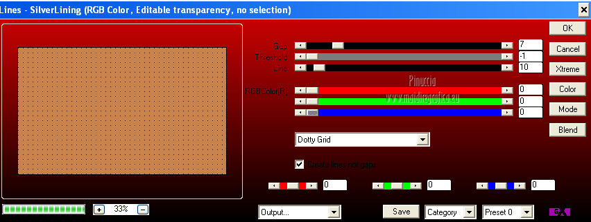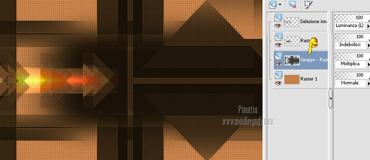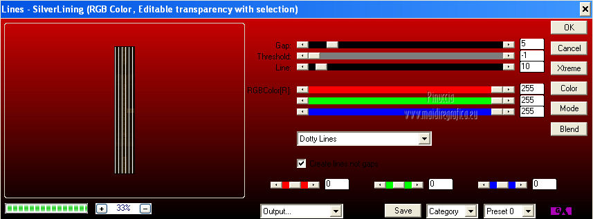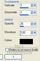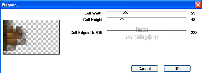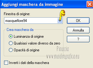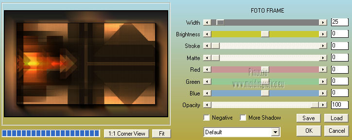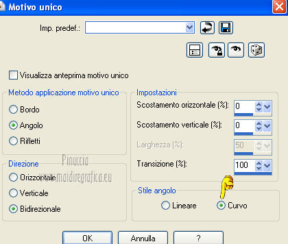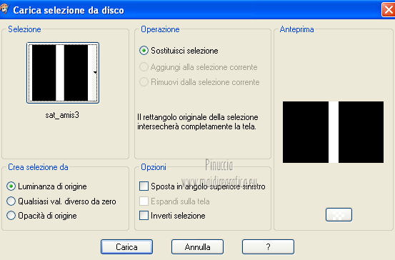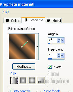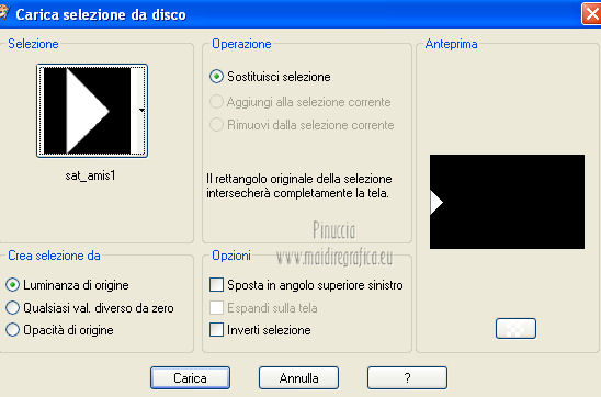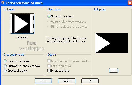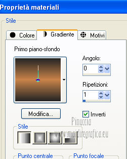 qui puoi trovare qualche risposta ai tuoi dubbi. Se l'argomento che ti interessa non è presente, ti prego di segnalarmelo. Questo tutorial è una creazione di Saturnella e non può essere copiato su altri siti nè essere offerto per il download. Lo stesso vale per la mia traduzione. E' anche proibito togliere il watermark dal materiale; rispettiamo il lavoro dei creatori di tubes, senza i quali non potremmo creare tutorials. Questo tutorial è stato creato con PSP x5, ma può essere eseguito anche con le altre versioni di PSP. Per tradurlo ho usato PSP X. Occorrente: Materiale qui Il tube della bambina è di Gina. Il tube dei cavalli è di La Manouche. La maschera è di Flore. (in questa pagina trovi i links ai loro siti). Filtri in caso di dubbi, ricorda di consultare la mia sezione filtri qui AP 01 [Innovations] - Lines SilverLining qui AAA Frames - Foto Frame qui Toadies - What are you, Weaver qui Simple - Pizza Slice Mirror qui ![]() non esitare a cambiare modalità di miscelatura e opacità secondo i colori utilizzati. Metti le selezioni nella cartella Selezioni. Apri la maschera in PSP e minimizzala con il resto del materiale. 1. Imposta il colore di primo piano con il colore chiaro #c9834a, e il colore di sfondo con il colore scuro #242525. ![]() Apri una nuova immagine trasparente 900 x 550 pixels, e riempila con il colore chiaro.2. Livelli>Nuovo livello raster. Riempi con il colore scuro.3. Livelli>Nuovo livello maschera>Da immagine. Apri il menu sotto la finestra di origine e vedrai la lista dei files aperti. Seleziona la maschera Flore 18, con i seguenti settaggi: ![]() Effetti>Effetti di bordo>Aumenta. Livelli>Unisci>Unisci gruppo. 4. Effetti>Effetti 3D>Sfalsa ombra. ![]() Cambia la modalità di miscelatura di questo livello in Moltiplica, o secondo i tuoi colori. 5. Attiva il livello di sfondo. Effetti>Plugins>AP 01 [Innovations] - Lines SilverLining. ![]() 6. Rimani posizionato sul livello di sfondo. Selezione>Carica/Salva selezione>Carica selezione da disco. Cerca e carica la selezione sat_amis1. ![]() Selezione>Innalza selezione a livello. Selezione>Deseleziona. 7. Effetti>Plugins>Toadies - What are you, con i settaggi standard. ![]() 8. Livelli>Disponi>Porta in alto. Cambia la modalità di miscelatura di questo livello in Luminanza, o secondo i tuoi colori. per il mio esempio Luminanza (esistente). 9. Effetti>Effetti 3D>Sfalsa ombra. ![]() 10. Livelli>Duplica. Effetti>Effetti di immagine>Scostamento. ![]() 11. Livelli>Duplica. Effetti>Effetti di immagine>Scostamento, con i settaggi precedenti. 12. Livelli>Unisci>Unisci giù - 2 volte. 13. Attiva lo strumento Selezione ,clicca sull'icona Selezione personalizzata ![]() e imposta i seguenti settaggi: ![]() Livelli>Nuovo livello raster. Passa il colore di primo piano a Gradiente, stile Lineare. ![]() Riempi la selezione con il gradiente.Selezione>Deseleziona. 14. Effetti>Effetti di distorsione>Vento - da sinistra, intensità 100. ![]() Ripeti l'Effetto Vento, questa volta da destra. ![]() 15. Livelli>Disponi>Sposta giù. Cambia la modalità di miscelatura di questo livello in Indebolisci, o secondo i tuoi colori. 16. Attiva il livello della maschera. ![]() Livelli>Unisci>Unisci giù. Rimani posizionato su questo livello. 17. Selezione>Carica/Salva selezione>Carica selezione da disco. Cerca e carica la selezione sat_amis2. ![]() Selezione>Innalza selezione a livello. Selezione>Deseleziona. 18. Effetti>Plugins>Toadies - Weaver, con i settaggi standard. ![]() Cambia la modalità di miscelatura di questo livello in Luce netta, o secondo i tuoi colori. 19. Livelli>Duplica. Effetti>Effetti di immagine>Motivo unico. ![]() Cambia la modalità di miscelatura di questo livello in Indebolisci. 20. Attiva nuovamente il livello di sfondo. Selezione>Carica/Salva selezione>Carica selezione da disco. Cerca e carica la selezione sat_amis3. ![]() 21. Effetti>Plugins>AP 01 [Innovations] - Lines SilverLining. ![]() 22. Effetti>Effetti 3D>Sfalsa ombra. ![]() Selezione>Deseleziona. Cambia la modalità di miscelatura di questo livello in Luce diffusa, o secondo i tuoi colori, e abbassa l'opacità al 60%. 23. Immagine>Aggiungi bordatura, 2 pixels, simmetriche, con il colore scuro. Immagine>Aggiungi bordatura, 2 pixels, simmetriche, con il colore chiaro. Immagine>Aggiungi bordatura, 50 pixels, simmetriche, con il colore bianco. 24. Attiva lo strumento Bacchetta magica ![]() e clicca nel bordo bianco per selezionarlo. Cambia i settaggi del gradiente. ![]() Riempi la selezione con il gradiente.25. Effetti>Plugins>Simple - Pizza Slice mirror. Modifica>Ripeti Pizza Slice Mirror. 26. Effetti>Plugins>AAA Frames - Foto Frame. ![]() Selezione>Deseleziona. 27. Apri il tube dei cavalli di Lamanouche e vai a Modifica>Copia. Torna al tuo lavoro e vai a Modifica>Incolla come nuovo livello. Immagine>Ridimensiona, all'80%, tutti i livelli non selezionato. Regola>Messa a fuoco>Metti a fuoco. Posiziona il tube in alto a destra.28. Effetti>Effetti 3D>Sfalsa ombra, con i settaggi precedenti. 29. Apri il tube della bambina di Gina e vai a Modifica>Copia. Torna al tuo lavoro e vai a Modifica>Incolla come nuovo livello. Immagine>Ridimensiona, al 110%, tutti i livelli non selezionato. Regola>Messa a fuoco>Metti a fuoco. 30. Effetti>Effetti 3D>Sfalsa ombra, con i settaggi precedenti. 31. Immagine>Aggiungi bordatura, 2 pixels, simmetriche, con il colore scuro. Firma il tuo lavoro. 32. Livelli>Unisci>Unisci tutto. Immagine>Ridimensiona, a 900 pixels di larghezza, tutti i livelli selezionato. Regola>Messa a fuoco>Maschera di contrasto. ![]() Salva in formato jpg. ![]() Se hai problemi o dubbi, o trovi un link non funzionante, o anche soltanto per dirmi che ti è piaciuto, scrivimi. 31 Marzo 2013 |