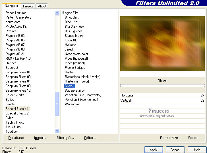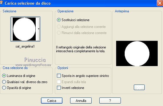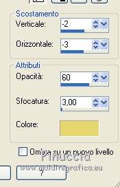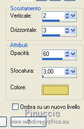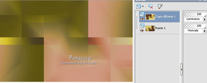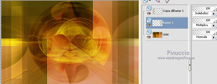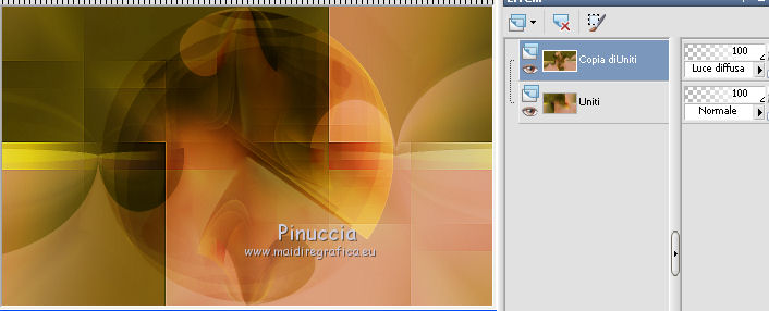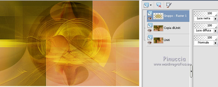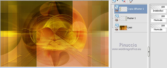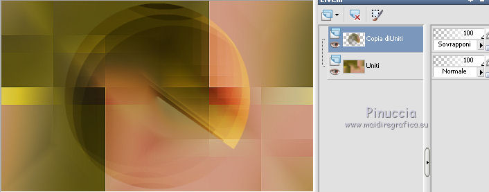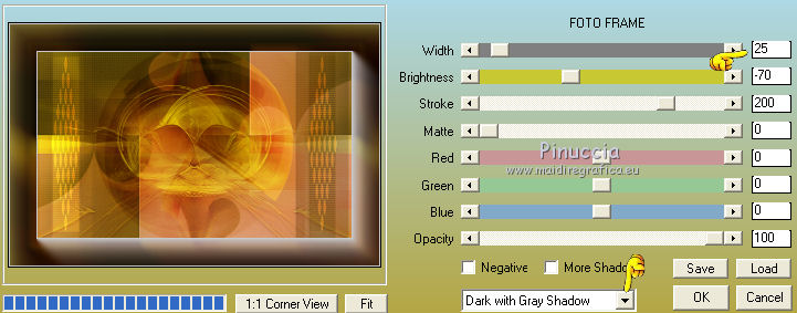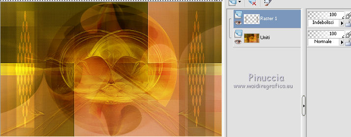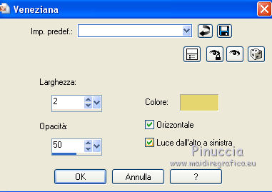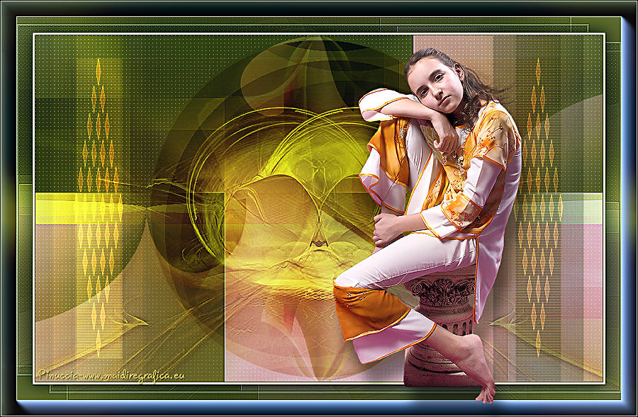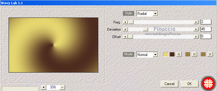 qui puoi trovare qualche risposta ai tuoi dubbi. Se l'argomento che ti interessa non è presente, ti prego di segnalarmelo. Questo tutorial è una creazione di Saturnella e non può essere copiato su altri siti nè essere offerto per il download. Lo stesso vale per la mia traduzione. E' anche proibito togliere il watermark dal materiale; rispettiamo il lavoro dei creatori di tubes, senza i quali non potremmo creare tutorials. Il tutorial è stato scritto con CorelX16, ma può essere eseguito anche con le altre versioni di PSP. Secondo la versione utilizzata (anteriore a PSP X) potresti ottenere dei risultati differenti. Vedi la mia scheda riguardante le funzioni Rifletti>Capovolgi nelle nuove versioni di PSP qui Per tradurre questo tutorial ho usato PSP X. Occorrente: Materiale qui Grazie per il tube AnaRidzi e per la maschera Nicole. (in questa pagina trovi i links ai loro siti). Filtri in caso di dubbi, ricorda di consultare la mia sezione filtri qui Filters Unlimited 2.0 qui Mehdi - Wavy Lab 1.1 qui AP 01 [Innovations] - Lines SilverLining qui AAA Frames - Foto Frame qui Nik Software - Color Efex Pro qui Flaming Pear - Flexify 2 qui VanDerLee - Unplugged-X qui ![]() non esitare a cambiare modalità di miscelatura e opacità secondo i colori utilizzati. Metti le selezioni nella cartella Selezioni. Apri la maschera in PSP e minimizzala con il resto del materiale. 1. Imposta il colore di primo piano con il colore chiaro #4e2b1e, e il colore di sfondo con il colore scuro #e5d66f. ![]() Apri una nuova immagine trasparente 900 x 550 pixels. Effetti>Plugins>Mehdi - Wavy Lab 1.1. Questo filtro lavora con i colori della paletta. Il primo è il colore di sfondo, il secondo quello di primo piano. Mantieni gli ultimi colori creati dal filtro. ![]() 2. Regola>Sfocatura>Sfocatura gaussiana - raggio 15 ![]() 3. Effetti>Plugins>Mehdi - Sorting Tiles. ![]() 4. Livelli>Duplica. Immagine>Rifletti. Immagine>Capovolgi. Cambia la modalità di miscelatura di questo livello in Luminanza (o secondo i tuoi colori). ![]() 5. Livelli>Unisci>Unisci visibile. Effetti>Effetti di bordo>Aumenta. 6. Livelli>Duplica. Effetti>Plugins>Filters Unlimited 2.0 - Special Effect 1 - Radar. ![]() 7. Effetti>Plugins>Filters Unlimited 2.0 - Special Effect 1 - Shiver. ![]() Cambia la modalità di miscelatura di questo livello in Sovrapponi (o secondo i tuoi colori). ![]() Regola>Messa a fuoco>Metti a fuoco. Livelli>Unisci>Unisci visibile. 8. Livelli>Duplica. ![]() (se il tuo filtro non funziona, nel materiale trovi l'effetto che potrai adattare ai tuoi colori. Se lo vorrai usare, copia e incolla come nuovo livello il file, senza duplicare il livello uniti). 9. Effetti>Effetti geometrici>Cerchio. ![]() Cambia la modalità di miscelatura di questo livello in Luce diffusa, o secondo i tuoi colori. ![]() 10. Selezione>Carica/Salva selezione>Carica selezione da disco. Cerca e carica la selezione sat_angelina1. ![]() Selezione>Inverti. Effetti>Plugins>AP 01 [Innovations] - Lines SilverLining. ![]() Selezione>Deseleziona. 11. Livelli>Nuovo livello raster. Riempi il livello con il colore chiaro.Livelli>Nuovo livello maschera>Da immagine. Apri il menu sotto la finestra di origine e vedrai la lista dei files aperti. Seleziona la maschera nicole-masque15, con i seguenti settaggi. ![]() Effetti>Effetti di bordo>Aumenta. Livelli>Unisci>Unisci gruppo. 12. Effetti>Effetti 3D>Sfalsa ombra, con il colore scuro. ![]() 13. Effetti>Effetti di immagine>Scostamento. ![]() 14. Livelli>Duplica. Immagine>Rifletti. Livelli>Unisci>Unisci giù. Cambia la modalità di miscelatura di questo livello in Luce netta, o secondo i tuoi colori. ![]() 15. Effetti>Effetti 3D>Sfalsa ombra, con i settaggi precedenti. Livelli>Unisci>Unisci visibile. 16. Livelli>Nuovo livello raster. Selezione>Carica/Salva selezione>Carica selezione da disco. Cerca e carica la selezione sat_angelina2. ![]() Imposta l'opacità dello strumento Riempimento a 50 ![]() e riempi la selezione con il colore scuro.Effetti>Effetti di trama>Veneziana. ![]() Selezione>Deseleziona. 17. Effetti>Plugins>VanDerLee - Unplugged-X, Defocus. ![]() Effetti>Effetti di bordo>Aumenta. 18. Livelli>Duplica. Immagine>Rifletti. 19. Effetti>Effetti 3D>Sfalsa ombra, con il colore chiaro. ![]() Cambia la modalità di miscelatura di questo livello in Indebolisci, o secondo i tuoi colori. ![]() 20. Attiva il livello sottostante dell'originale. Effetti>Effetti 3D>Sfalsa ombra, con il colore chiaro. ![]() Cambia la modalità di miscelatura di questo livello in Moltiplica, o secondo i tuoi colori. ![]() Livelli>Unisci>Unisci visibile. 21. Apri il tube deco1 e vai a Modifica>Copia. Torna al tuo lavoro e vai a Modifica>Incolla come nuovo livello. Non spostarlo. E' al suo posto. Il tube è in modalità di miscelatura Indebolisci (a te vedere secondo i tuoi colori). ![]() Livelli>Unisci>Unisci tutto. Modifica>Copia. 22. Immagine>Aggiungi bordatura, 1 pixel, simmetriche, con il colore scuro. Immagine>Aggiungi bordatura, 3 pixels, simmetriche, con il colore chiaro. Immagine>Aggiungi bordatura, 1 pixel, simmetriche, con il colore scuro. Immagine>Aggiungi bordatura, 50 pixels, simmetriche, con il colore bianco. Attiva lo strumento Bacchetta magica ![]() e clicca nel bordo bianco per selezionarlo. Modifica>Incolla nella selezione. 23. Regola>Sfocatura>Sfocatura gaussiana - raggio 40. ![]() 24. Effetti>Plugins>Filters Unlimited 2.0 - Tile & Mirror - Quadrant Mirror. ![]() 25. Effetti>Plugins>Filters Unlimited 2.0 - Special Effect 1 - Shiver, con i settaggi standard. ![]() Effetti>Effetti di bordo>Aumenta. 26. Selezione>Inverti. Effetti>Effetti 3D>Sfalsa ombra, colore nero. ![]() Selezione>Deseleziona. 27. Effetti>Plugins>AAA Frames - Foto Frame prima seleziona Dark with Gray Shadow e poi cambia width con 25. ![]() 28. Effetti>Plugins>Nik Software - Color Efex Pro - Pro Contrast. ![]() 29. Apri il tube della donna di Ana Ridzi e vai a Modifica>Copia. Torna al tuo lavoro e vai a Modifica>Incolla come nuovo livello. Immagine>Ridimensiona