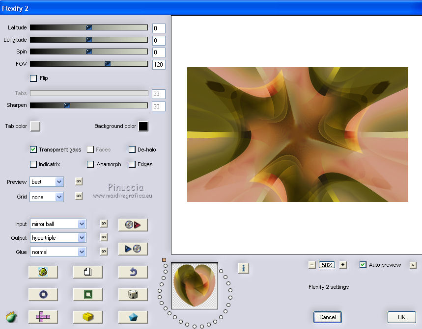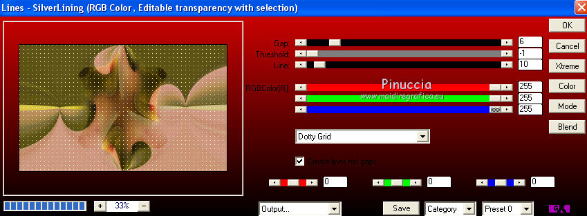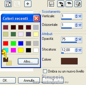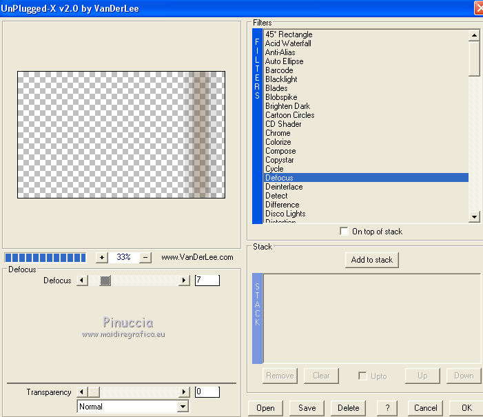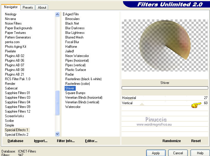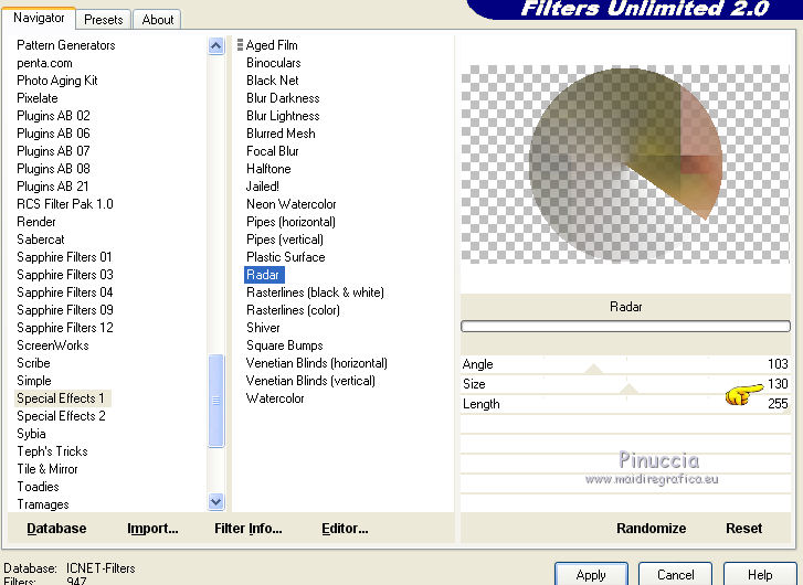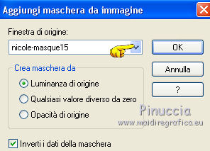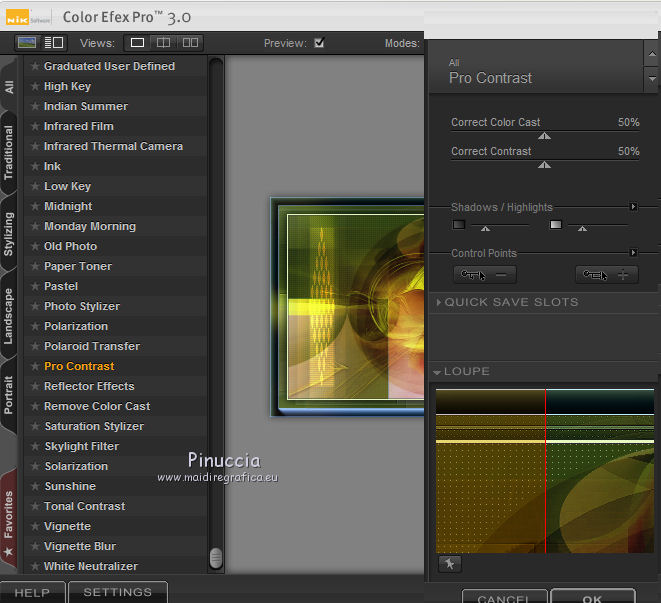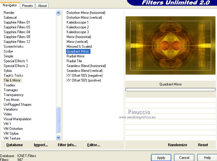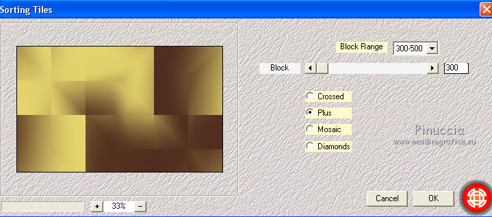 qui puoi trovare qualche risposta ai tuoi dubbi. Se l'argomento che ti interessa non è presente, ti prego di segnalarmelo. Questo tutorial è una creazione di Saturnella e non può essere copiato su altri siti nè essere offerto per il download. Lo stesso vale per la mia traduzione. E' anche proibito togliere il watermark dal materiale; rispettiamo il lavoro dei creatori di tubes, senza i quali non potremmo creare tutorials. Il tutorial è stato scritto con CorelX16, ma può essere eseguito anche con le altre versioni di PSP. Secondo la versione utilizzata (anteriore a PSP X) potresti ottenere dei risultati differenti. Vedi la mia scheda riguardante le funzioni Rifletti>Capovolgi nelle nuove versioni di PSP qui Per tradurre questo tutorial ho usato PSP X. Occorrente: Materiale qui Grazie per il tube AnaRidzi e per la maschera Nicole. (in questa pagina trovi i links ai loro siti). Filtri in caso di dubbi, ricorda di consultare la mia sezione filtri qui Filters Unlimited 2.0 qui Mehdi - Wavy Lab 1.1 qui AP 01 [Innovations] - Lines SilverLining qui AAA Frames - Foto Frame qui Nik Software - Color Efex Pro qui Flaming Pear - Flexify 2 qui VanDerLee - Unplugged-X qui ![]() non esitare a cambiare modalità di miscelatura e opacità secondo i colori utilizzati. Metti le selezioni nella cartella Selezioni. Apri la maschera in PSP e minimizzala con il resto del materiale. 1. Imposta il colore di primo piano con il colore chiaro #4e2b1e, e il colore di sfondo con il colore scuro #e5d66f. ![]() Apri una nuova immagine trasparente 900 x 550 pixels. Effetti>Plugins>Mehdi - Wavy Lab 1.1. Questo filtro lavora con i colori della paletta. Il primo è il colore di sfondo, il secondo quello di primo piano. Mantieni gli ultimi colori creati dal filtro. ![]() 2. Regola>Sfocatura>Sfocatura gaussiana - raggio 15 ![]() 3. Effetti>Plugins>Mehdi - Sorting Tiles. ![]() 4. Livelli>Duplica. Immagine>Rifletti. Immagine>Capovolgi. Cambia la modalità di miscelatura di questo livello in Luminanza (o secondo i tuoi colori). ![]() 5. Livelli>Unisci>Unisci visibile. Effetti>Effetti di bordo>Aumenta. 6. Livelli>Duplica. Effetti>Plugins>Filters Unlimited 2.0 - Special Effect 1 - Radar. ![]() 7. Effetti>Plugins>Filters Unlimited 2.0 - Special Effect 1 - Shiver. ![]() Cambia la modalità di miscelatura di questo livello in Sovrapponi (o secondo i tuoi colori). ![]() Regola>Messa a fuoco>Metti a fuoco. Livelli>Unisci>Unisci visibile. 8. Livelli>Duplica. ![]() (se il tuo filtro non funziona, nel materiale trovi l'effetto che potrai adattare ai tuoi colori. Se lo vorrai usare, copia e incolla come nuovo livello il file, senza duplicare il livello uniti). 9. Effetti>Effetti geometrici>Cerchio. ![]() Cambia la modalità di miscelatura di questo livello in Luce diffusa, o secondo i tuoi colori. ![]() 10. Selezione>Carica/Salva selezione>Carica selezione da disco. Cerca e carica la selezione sat_angelina1. ![]() Selezione>Inverti. Effetti>Plugins>AP 01 [Innovations] - Lines SilverLining. ![]() Selezione>Deseleziona. 11. Livelli>Nuovo livello raster. Riempi il livello con il colore chiaro.Livelli>Nuovo livello maschera>Da immagine. Apri il menu sotto la finestra di origine e vedrai la lista dei files aperti. Seleziona la maschera nicole-masque15, con i seguenti settaggi. ![]() Effetti>Effetti di bordo>Aumenta. Livelli>Unisci>Unisci gruppo. 12. Effetti>Effetti 3D>Sfalsa ombra, con il colore scuro. ![]() 13. Effetti>Effetti di immagine>Scostamento. ![]() 14. Livelli>Duplica. Immagine>Rifletti. Livelli>Unisci>Unisci giù. Cambia la modalità di miscelatura di questo livello in Luce netta, o secondo i tuoi colori. ![]() 15. Effetti>Effetti 3D>Sfalsa ombra, con i settaggi precedenti. Livelli>Unisci>Unisci visibile. 16. Livelli>Nuovo livello raster. Selezione>Carica/Salva selezione>Carica selezione da disco. Cerca e carica la selezione sat_angelina2. ![]() Imposta l'opacità dello strumento Riempimento a 50 ![]() e riempi la selezione con il colore scuro.Effetti>Effetti di trama>Veneziana. ![]() Selezione>Deseleziona. 17. Effetti>Plugins>VanDerLee - Unplugged-X, Defocus. ![]() Effetti>Effetti di bordo>Aumenta. 18. Livelli>Duplica. Immagine>Rifletti. 19. Effetti>Effetti 3D>Sfalsa ombra, con il colore chiaro. ![]() Cambia la modalità di miscelatura di questo livello in Indebolisci, o secondo i tuoi colori. ![]() 20. Attiva il livello sottostante dell'originale. Effetti>Effetti 3D>Sfalsa ombra, con il colore chiaro. ![]() Cambia la modalità di miscelatura di questo livello in Moltiplica, o secondo i tuoi colori. ![]() Livelli>Unisci>Unisci visibile. 21. Apri il tube deco1 e vai a Modifica>Copia. Torna al tuo lavoro e vai a Modifica>Incolla come nuovo livello. Non spostarlo. E' al suo posto. Il tube è in modalità di miscelatura Indebolisci (a te vedere secondo i tuoi colori). ![]() Livelli>Unisci>Unisci tutto. Modifica>Copia. 22. Immagine>Aggiungi bordatura, 1 pixel, simmetriche, con il colore scuro. Immagine>Aggiungi bordatura, 3 pixels, simmetriche, con il colore chiaro. Immagine>Aggiungi bordatura, 1 pixel, simmetriche, con il colore scuro. Immagine>Aggiungi bordatura, 50 pixels, simmetriche, con il colore bianco. Attiva lo strumento Bacchetta magica ![]() e clicca nel bordo bianco per selezionarlo. Modifica>Incolla nella selezione. 23. Regola>Sfocatura>Sfocatura gaussiana - raggio 40. ![]() 24. Effetti>Plugins>Filters Unlimited 2.0 - Tile & Mirror - Quadrant Mirror. ![]() 25. Effetti>Plugins>Filters Unlimited 2.0 - Special Effect 1 - Shiver, con i settaggi standard. ![]() Effetti>Effetti di bordo>Aumenta. 26. Selezione>Inverti. Effetti>Effetti 3D>Sfalsa ombra, colore nero. ![]() Selezione>Deseleziona. 27. Effetti>Plugins>AAA Frames - Foto Frame prima seleziona Dark with Gray Shadow e poi cambia width con 25. ![]() 28. Effetti>Plugins>Nik Software - Color Efex Pro - Pro Contrast. ![]() 29. Apri il tube della donna di Ana Ridzi e vai a Modifica>Copia. Torna al tuo lavoro e vai a Modifica>Incolla come nuovo livello. Immagine>Ridimensiona