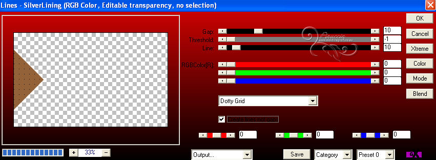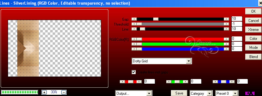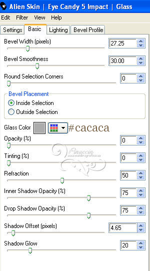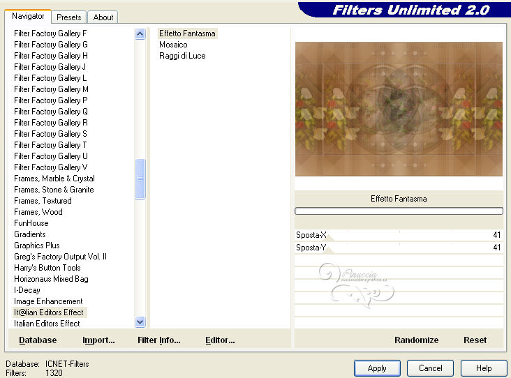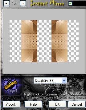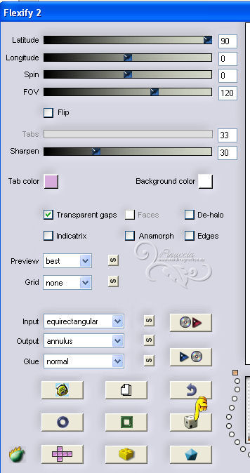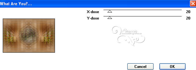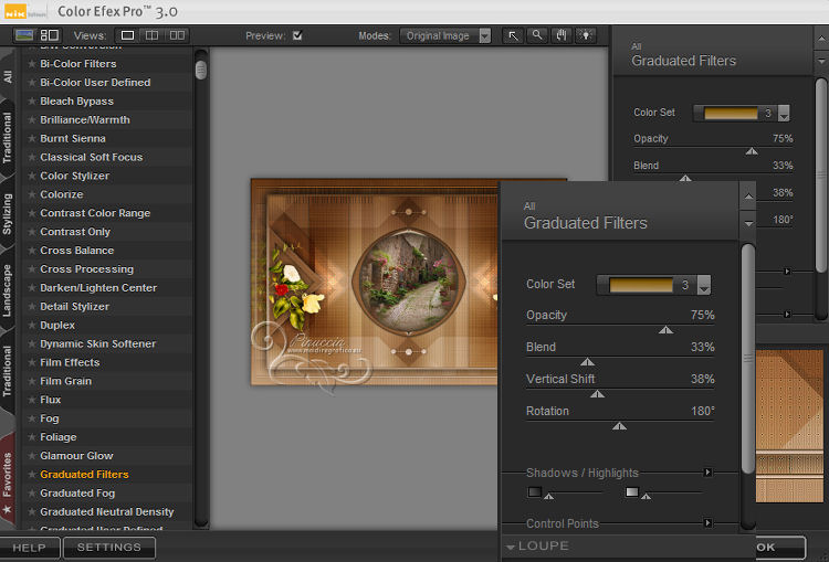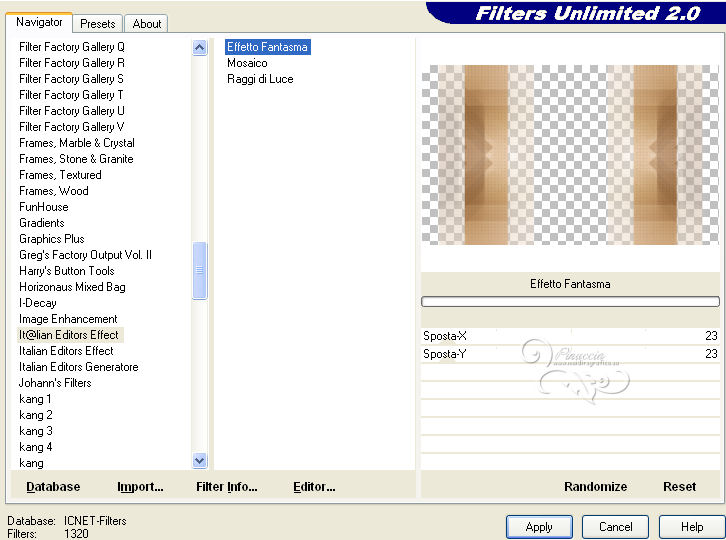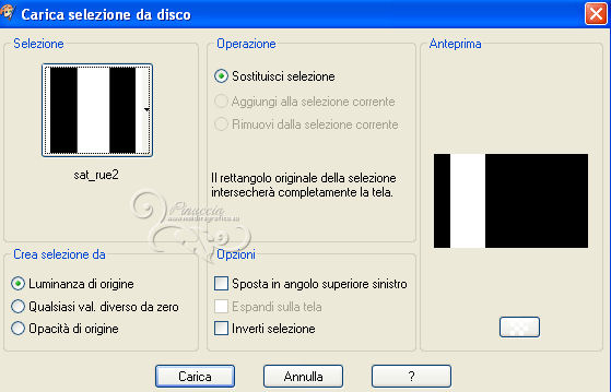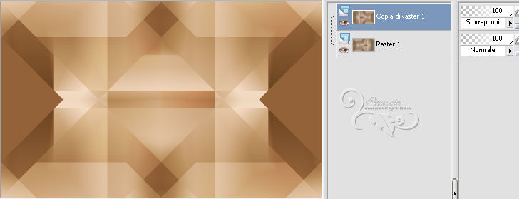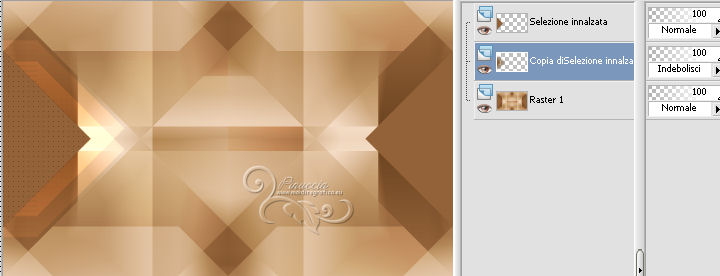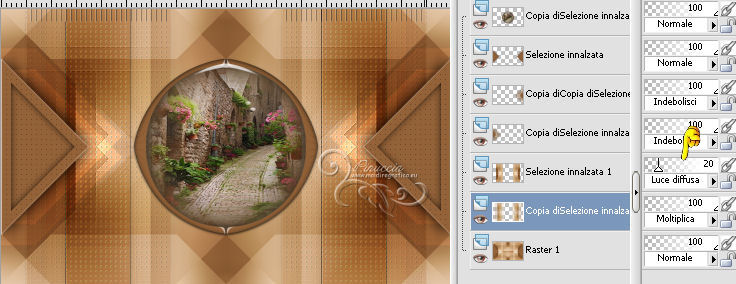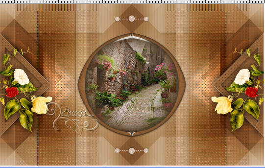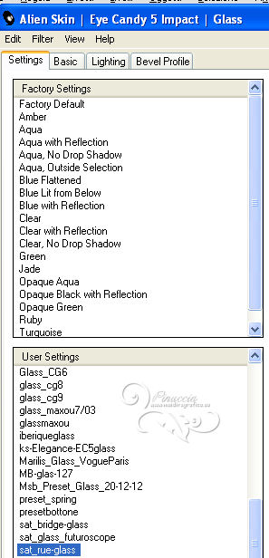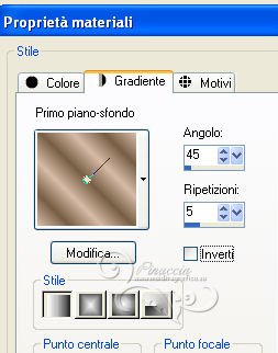 qui puoi trovare qualche risposta ai tuoi dubbi. Se l'argomento che ti interessa non è presente, ti prego di segnalarmelo. Questo tutorial è una creazione di Saturnella e non può essere copiato su altri siti nè essere offerto per il download. Lo stesso vale per la mia traduzione. E' anche proibito togliere il watermark dal materiale; rispettiamo il lavoro dei creatori di tubes, senza i quali non potremmo creare tutorials. Questo tutorial è stato creato con PSP x5, ma può essere eseguito anche con le altre versioni di PSP. Per tradurlo ho usato PSP X. Occorrente: Materiale qui Il tube della donna è di Betsie. Il tube del fiore è di Judy. Il tube del paesaggio è di Syl. Grazie a tutti. (in questa pagina trovi i links ai loro siti). Filtri in caso di dubbi, ricorda di consultare la mia sezione filtri qui AP 01 [Innovations] - Lines SilverLining qui Filters Unlimited 2.0 qui Simple - Pizza slice Mirror, Blintz qui Flaming Pear - Flexify 2 qui Mehdi - Sorting Tile qui Plugin Galaxy - Instant Mirror qui Toadies - What are you qui Italian Editors - Effetto Fantasma qui Nik Software - Color Efex Pro qui Alien Skin Eye Candy 5 Impact qui I filtri Simple, Toadies e Italian Editors si possono usare da soli o importati in Filters Unlimited (come fare vedi qui) Se un filtro fornito appare con questa icona ![]() non esitare a cambiare modalità di miscelatura e opacità secondo i colori utilizzati. Metti il preset Cliccando sul file una o due volte (a seconda delle tue impostazioni), automaticamente il preset si installerà nella cartella corretta. perchè uno o due clic vedi qui Metti le selezioni nella cartella Selezioni. 1. Imposta il colore di primo piano con #d6bba8, e il colore di sfondo con #765e42. ![]() Passa il colore di primo piano a Gradiente, stile Lineare. ![]() 2. Apri una nuova immagine trasparente 900 x 550 pixels, e riempila con il gradiente.3. Effetti>Plugins>Mehdi - Sorting Tile. ![]() 4. Effetti>Plugins>Simple - Blints. Modifica>Ripeti Blintz. Effetti>Plugins>Simple - Pizza Slice Mirror. ![]() 5. Livelli>Duplica. Immagine>Rifletti. Cambia la modalità di miscelatura di questo livello in Sovrapponi. ![]() Livelli>Unisci>Unisci giù. 6. Selezione>Carica/Salva selezione>Carica selezione da disco. Cerca e carica la selezione sat_rue1. ![]() Selezione>Innalza selezione a livello. Selezione>Deseleziona. 7. Effetti>Plugins>AP 01 [Innovations] - Lines SilverLining. ![]() 8. Livelli>Duplica. Livelli>Disponi>Sposta giù. 9. Effetti>Plugins>Toadies - What are you. ![]() Cambia la modalità di miscelatura di questo livello in Indebolisci (o secondo i tuoi colori). ![]() Livelli>Duplica. Immagine>Rifletti. 10. Attiva il livello superiore. Selezione>Carica/Salva selezione>Carica selezione da disco. Carica nuovamente la selezione sat_rue1. ![]() 11. Selezione>Modifica>Seleziona bordature selezione. ![]() Livelli>Nuovo livello raster. Riempi con il colore chiaro.Selezione>Deseleziona. Livelli>Unisci>Unisci giù. 12. Effetti>Effetti 3D>Sfalsa ombra. ![]() 13. Livelli>Duplica. Effetti>Plugins>Fleming Pear - Flexify 2. attenzione, questo filtro tiene in memoria eventuali preset usati in precedenza, che influenzano il risultato. Per evitare errori, prima di impostare i settaggi, clicca sull'icona del dado, per annullare questi precenti preset. ![]() Dovresti avere questo. ![]() Livelli>Duplica. Immagine>Rifletti. Livelli>Unisci>Unisci giù. 14. Attiva lo strumento Bacchetta magica ![]() e clicca al centro dell'anello per selezionarlo. ![]() Livelli>Nuovo livello raster. Apri il tube del paesaggio e vai a Modifica>Copia. Torna al tuo lavoro e vai a Modifica>Incolla nella selezione. 15. Livelli>Nuovo livello raster. Effetti>Effetti 3D>Ritaglio. ![]() Selezione>Deseleziona. Livelli>Unisci>Unisci giù - 2 volte. 16. Effetti>Effetti 3D>Sfalsa ombra, con i settaggi precedenti. 17. Effetti>Plugins>Alien Skin Eye Candy 5 Impact - Glass. Seleziona il preset sat_rue_glass e ok. ![]() Questi i settaggi che, in caso di problemi con il preset, puoi impostare manualmente. ![]() Dovresti avere questo. ![]() 18. Attiva il livello di sfondo. Selezione>Carica/Salva selezione>Carica selezione da disco. Cerca e carica la selezione sat_rue2. ![]() Selezione>Innalza selezione a livello. Selezione>Deseleziona. 19. Effetti>Plugins>AP 01 [Innovations] - Lines SilverLining. ![]() 20. Effetti>Plugin Galaxy - Instant Mirror. ![]() Ripeti l'Effetto una seconda volta. 21. Effetti>Effetti 3D>Sfalsa ombra. ![]() 22. Attiva il livello "selezione innalzata". ![]() 23. Selezione>Carica/Salva selezione>Carica selezione da disco. Carica ancora la selezione sat_rue1. ![]() Selezione>Modifica>Contrai - 10 pixels. Livelli>Nuovo livello raster. Effetti>Effetti 3D>Ritaglio. ![]() Selezione>Deseleziona. Livelli>Unisci>Unisci giù. 24. Livelli>Duplica. Immagine>Rifletti. Livelli>Unisci>Unisci giù. Dovresti avere questo. ![]() 25. Attiva il livello selezione innalzata 1. ![]() Livelli>Duplica. Livelli>Disponi>Sposta giù. 26. Effetti>Plugins>Filters Unlimited 2.0 - Italian Editors - Effetto Fantasma. ![]() Effetti>Effetti di bordo>Aumenta di più. Cambia la modalità di miscelatura di questo livello in Moltiplica (o secondo i tuoi colori). 27. Cambia la modalità di miscelatura del livello soprastante Selezione innalzata 1 in Luce netta e abbassa l'opacità al 20%. non occorre posizionarsi sul livello per cambiare le proprietà, quando è presente il riquadro a destra. Se non hai visibile il riquadro a destra, allora devi attivare il livello per cambiare le proprietà. ![]() 28. Attiva il livello di sfondo - Raster 1. Effetti>Effetti di trama>Veneziana. ![]() 29. Attiva il livello superiore. Apri il tube di Judy JB_FannyRobinson, e vai a Modifica>Copia. Torna al tuo lavoro e vai a Modifica>Incolla come nuovo livello. Immagine>Ridimensiona, al 60%, tutti i livelli non selezionato. Posiziona il tube a destra.![]() Effetti>Effetti 3D>Sfalsa ombra. ![]() 30. Livelli>Duplica. Immagine>Rifletti. 31. Apri il tube deco1 e vai a Modifica>Copia