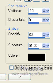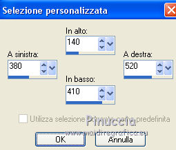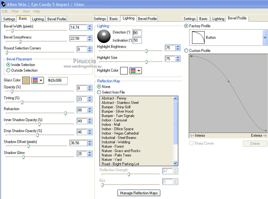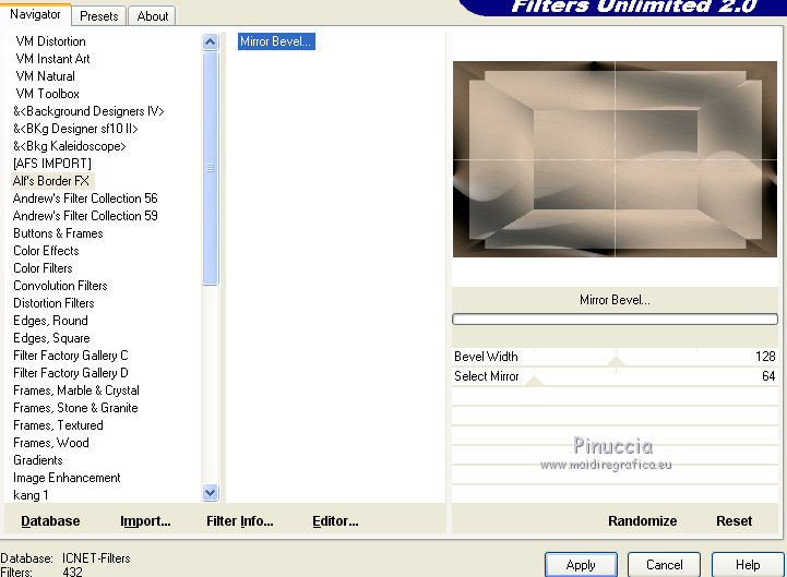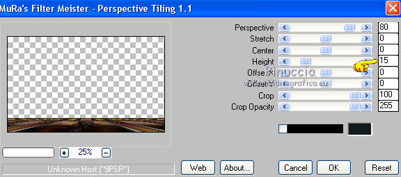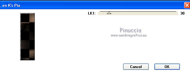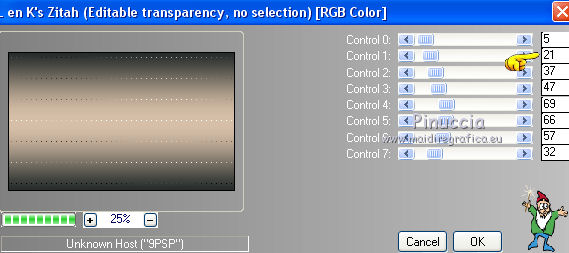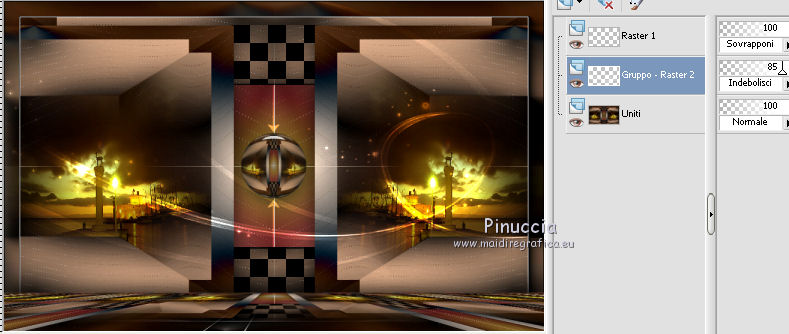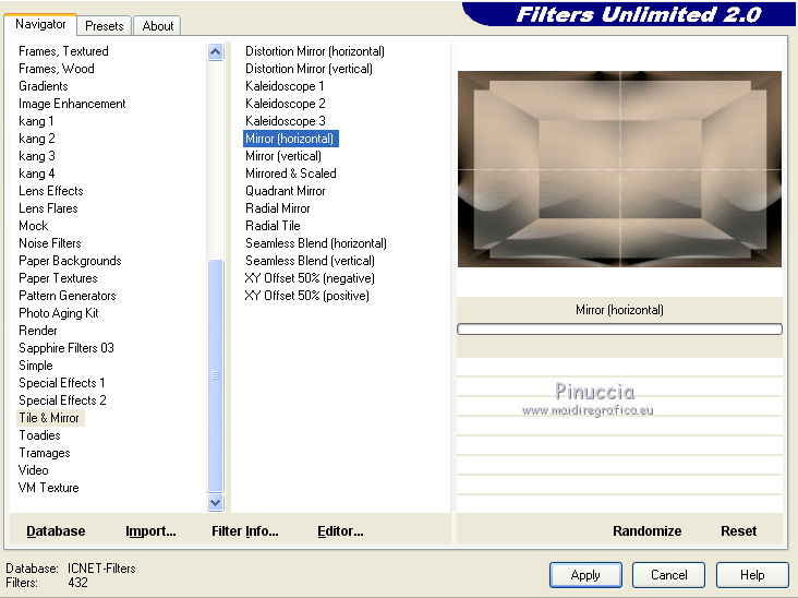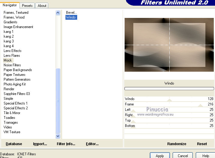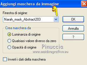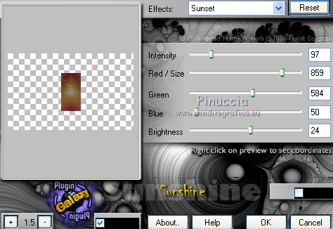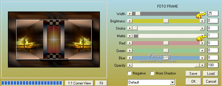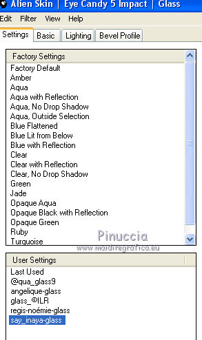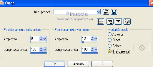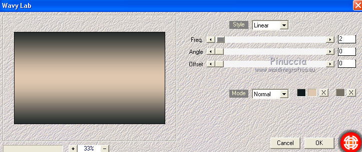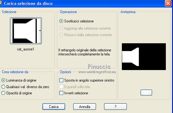 qui puoi trovare qualche risposta ai tuoi dubbi. Se l'argomento che ti interessa non è presente, ti prego di segnalarmelo. Questo tutorial è una creazione di Saturnella e non può essere copiato su altri siti nè essere offerto per il download. Lo stesso vale per la mia traduzione. E' anche proibito togliere il watermark dal materiale; rispettiamo il lavoro dei creatori di tubes, senza i quali non potremmo creare tutorials. Questo tutorial è stato creato con PSP x5, ma può essere eseguito anche con le altre versioni di PSP. Per tradurlo ho usato PSP X. La principale differenza tra le due versioni riguarda le funzioni Immagine>Rifletti/Capovolgi. Vedi la mia scheda qui Occorrente: Materiale qui Per i tubes grazie Colybrix, Luna e Mtfp. (in questa pagina trovi i links ai loro siti). Filtri in caso di dubbi, ricorda di consultare la mia sezione filtri qui Filters Unlimited 2.0 qui Mehdi - Wavy Lab qui L&K - Zitah qui L&K - Pia qui AAA Frames - Foto Frame qui Alien Skin Eye Candy 5 Impact - Glass qui Mock - Windo qui Alf's border FX - Mirror Bevel qui Plugin Galaxy - Instant Mirror - Sunshine qui Mura's Meister - Perspective Tiling qui I filtri Mock e Alf's Border FX si possono usare da soli o importati in Filters Unlimited. (come fare vedi qui). Se un filtro fornito appare con questa icona ![]() non esitare a cambiare modalità di miscelatura e opacità secondo i colori utilizzati. Metti il preset Cliccando sul file una o due volte (a seconda delle tue impostazioni), automaticamente il preset si installerà nella cartella corretta. perchè uno o due clic vedi qui Metti la selezione nella cartella Selezioni. Apri la maschera in Psp e minimizzala con il resto del materiale. 1. Imposta il colore di primo piano con il colore chiaro #dfc7af, e il colore di sfondo con il colore scuro #111b1d. ![]() Apri una nuova immagine trasparente 900 x 550 pixels. Effetti>Plugins>Mehdi - Wavy Lab. Il filtro lavora con i colori impostati nella paletta dei materiali. Il primo è il colore di sfondo, il secondo il colore di primo piano. Mantieni il terzo colore creato dal filtro. ![]() 2. Livelli>Duplica. Effetti>Plugins>L&K - L&K Zitah ![]() 3. Effetti>Effetti di distorsione>Onda. ![]() 4. Effetti>Effetti 3D>Sfalsa ombra. ![]() 5. Effetti>Effetti di immagine>Motivo unico. ![]() 6. Effetti>Plugins>Filters Unlimited 2.0 - Mocks - Windo. ![]() 7. Effetti>Plugins>Filters Unlimited 2.0 - Alf’s border Fx - Mirror bevel. ![]() 8. Effetti>Plugins>Filters Unlimited 2.0 - Tile & Mirror - Mirror (horizontal). ![]() Cambia la modalità di miscelatura di questo livello in Differenza, opacità 100. ![]() 9. Livelli>Duplica. Cambia la modalità di miscelatura di questo livello in Indebolisci, e abbassa l'opacità al 50%. ![]() Livelli>Unisci>Unisci visibile. 10. Livelli>Duplica. Immagine>Ridimensiona, all'85%, tutti i livelli non selezionato. 11. Effetti>The Plugin Site>Instant Mirror. ![]() 12. Effetti>Effetti 3D>Sfalsa ombra. ![]() 13. Selezione>Carica/Salva selezione>Carica Selezione da disco. Cerca e carica la selezione sat_aurore1. ![]() 14. Livelli>Nuovo livello raster. Apri il tube del paesaggio di Luna e vai a Modifica>Copia. Torna al tuo lavoro e vai a Modifica>Incolla nella selezione. Selezione>Deseleziona. 15. Livelli>Duplica. Immagine>Rifletti. Livelli>Unisci>Unisci giù. 16. Effetti>Effetti 3D>Sfalsa ombra, con i settaggi precedenti. 17. Attiva il livello inferiore di sfondo. Attiva lo strumento Selezione ,clicca sull'icona Selezione personalizzata ![]() e imposta i seguenti settaggi: ![]() Selezione>Innalza selezione a livello. 18. Effetti>Plugins>L&K - L&K Pia. ![]() 19. Effetti>Effetti 3D>Sfalsa ombra, con i settaggi precedenti. Selezione>Deseleziona. 20. Attiva nuovamente il livello di sfondo. Selezione personalizzata ![]() ![]() Selezione>Innalza selezione a livello. 21. Livelli>Disponi>Sposta su. 22. Effetti>Plugins>The Plugin Site - Sunshine, seleziona il preset Sunset ![]() Selezione>Deseleziona. 23. Effetti>Effetti 3D>Sfalsa ombra, con i settaggi precedenti. Livelli>Unisci>Unisci visibile. 24. Effetti>Plugins>AAA Frames - Foto Frame. ![]() 25. Livelli>Duplica. Effetti>Effetti di immagine>Motivo unico, con i settaggi precedenti. ![]() 26. Effetti>Plugins>Mura Meister’s - Perspective tiling. ![]() 27. Effetti>Effetti 3D>Sfalsa ombra. ![]() 28. Effetti>Effetti di distorsione>Allarga (nelle versioni più recenti di PSP Compressione). ![]() 29. Attiva il livello di sfondo. Livelli>Duplica. Livelli>Disponi>Porta in alto. 30. Effetti>Effetti geometrici>Cerchio. ![]() 31. Immagine>Ridimensiona, al 20%, tutti i livelli non selezionato. 32. Effetti>Plugins>Alien Skin Eye Candy 5 Impact - Glass. Seleziona il preset sat-aurore-glass e ok (questa è la denominazione del file fornito nel materiale, importandolo nella cartella del filtro lo troverai con la denominazione say_inaya-glass). ![]() Questi i settaggi che, in caso di problemi con il preset, puoi impostare manualmente. ![]() Livelli>Unisci>Unisci visibile. 33. Apri il tube deco1 e vai a Modifica>Copia. Torna al tuo lavoro e vai a Modifica>Incolla come nuovo livello. Lascialo come sta. E' già correttamente posizionato. Cambia la modalità di miscelatura di questo livello in Moltiplica, o secondo i tuoi colori. 34. Attiva nuovamente il livello di sfondo. Livelli>Nuovo livello raster. Imposta il colore di primo piano con il colore bianco. Riempi il livello con questo colore.Livelli>Nuovo livello maschera>Da immagine. Apri il menu sotto la finestra di origine e vedrai la lista dei files aperti. Seleziona la maschera Narah_Mask_Abstract203, con i seguenti settaggi: ![]() Effetti>Effetti di bordo>Aumenta. Livelli>Unisci>Unisci gruppo. Immagine>Rifletti. Cambia la modalità di miscelatura di questo livello in Indebolisci, e abbassa l'opacità all'85% (o secondo i tuoi colori). ![]() 35. Attiva il livello superiore. Apri il tube della donna e vai a Modifica>Copia. Torna al tuo lavoro e vai a Modifica>Incolla come nuovo livello. Immagine>Ridimensiona, al 60%, 