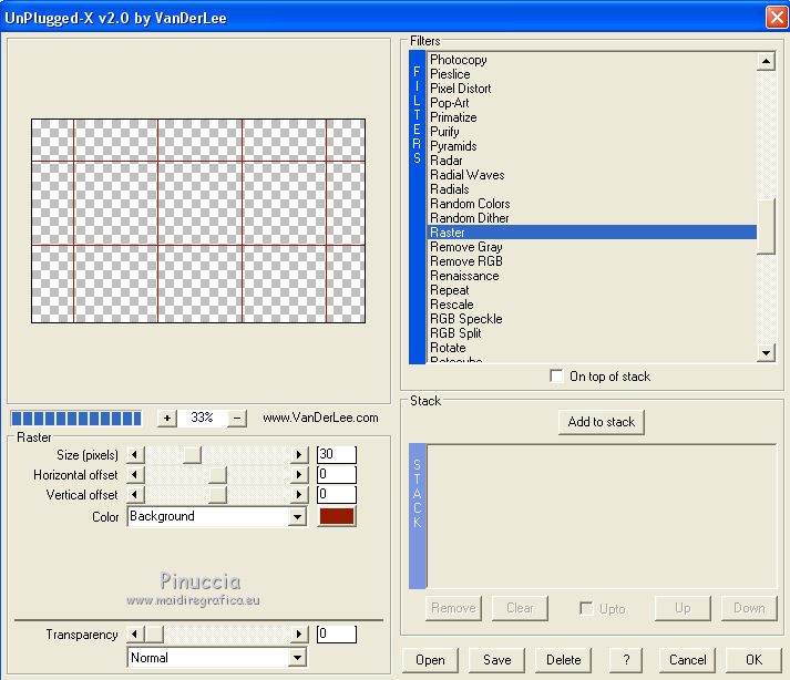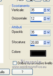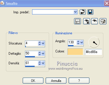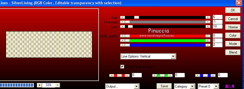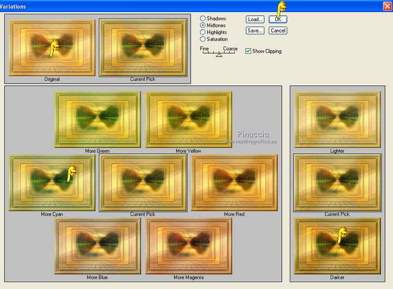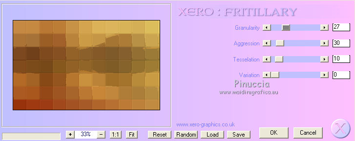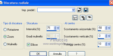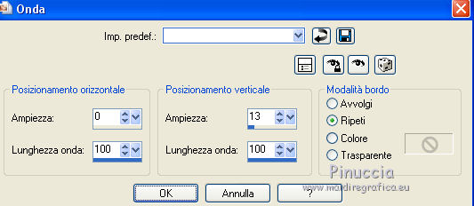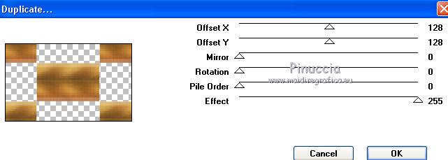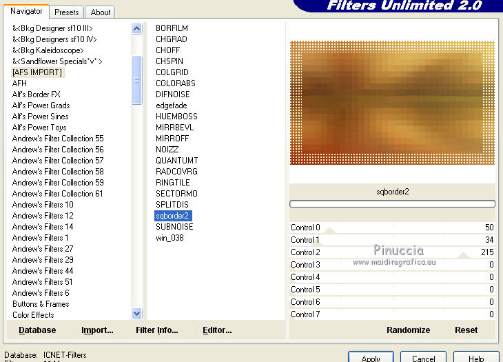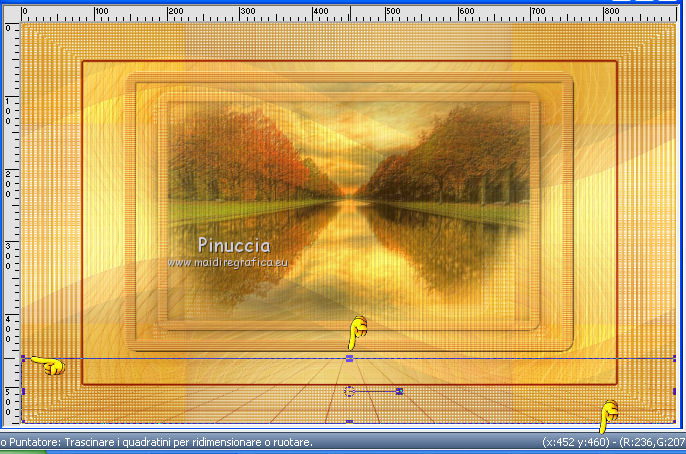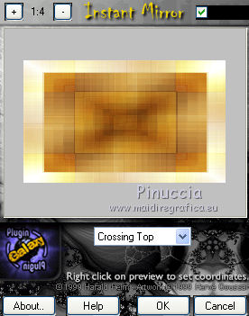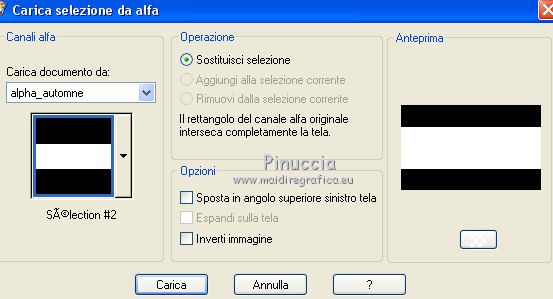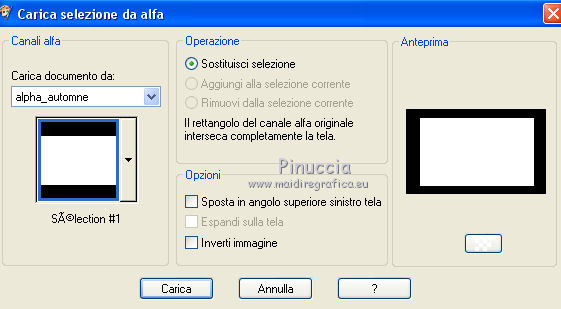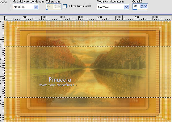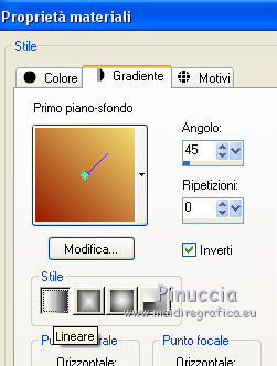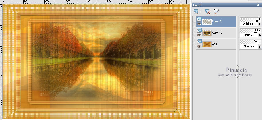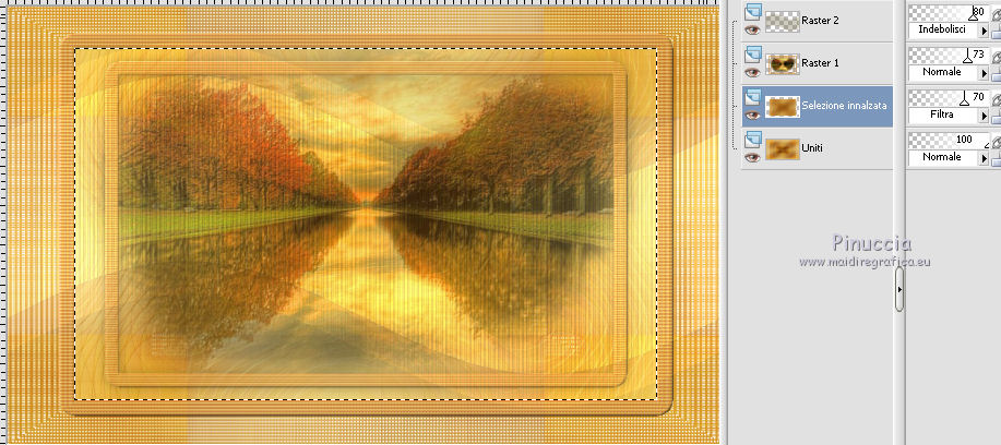 qui puoi trovare qualche risposta ai tuoi dubbi. Se l'argomento che ti interessa non è presente, ti prego di segnalarmelo. Questo tutorial è una creazione di Saturnella e non può essere copiato su altri siti nè essere offerto per il download. Lo stesso vale per la mia traduzione. E' anche proibito togliere il watermark dal materiale; rispettiamo il lavoro dei creatori di tubes, senza i quali non potremmo creare tutorials. Per tradurre questo tutorial, creato con X15, ho usato CorelX, ma può essere eseguito anche con le altre versioni di PSP. Dalla versione X4, il comando Immagine>Rifletti è stato sostituito con Immagine>Capovolgi in orizzontale, e il comando Immagine>Capovolgi con Immagine>Capovolgi in verticale. Nelle versioni X5 e X6, le funzioni sono state migliorate rendendo disponibile il menu Oggetti. Nel nuovo X7 sono tornati i comandi Immagine>Rifletti e Immagine>Capovolgi, ma con nuove funzioni. Vedi la scheda sull'argomento qui Occorrente: Materiale qui Grazie per i tube Jeanne e Mary. Il tube del paesaggio è di Saturnella. (in questa pagina trovi i links ai loro siti). Filtri in caso di dubbi, ricorda di consultare la mia sezione filtri qui Filters Unlimited 2.0 qui Xero - Fritillary qui AFS Import - Sqborder 2 qui Mura's Seamless - Duplicate qui Plugin Galaxy - Instant Mirror qui AP 01 Innovations - Lines SilverLining qui Toadies - What are you qui Adjust - Variations qui VanDerLee - Unplugged-X qui Mura's Meister - Perspective Tiling qui Bordermania qui I filtri AFS Import, Mura's Seamless e Toadies si possono usare da soli o importati in Filters Unlimited (come fare vedi qui) Se un filtro fornito appare con questa icona ![]() non esitare a cambiare modalità di miscelatura e opacità secondo i colori utilizzati. 1. Imposta il colore di primo piano con #f2de70, e il colore di sfondo con #941a00. ![]() Passa il colore di primo piano a Gradiente di primo piano/sfondo, stile Lineare. ![]() Apri alpha_automne. Finestra>Duplica, o sulla tastiera maiuscola+D, per fare una copia. Chiudi l'originale. La copia, che sarà la base del tuo lavoro, non è vuota, ma contiene le selezioni salvate sul canale alfa. Rinomina il livello "Raster 1". una piccola curiosità: se rinomini il livello con la lettera minuscola - raster 1 - il programma assegnerà nuovamente il numero 1 al successivo livello. Se invece rinomini il livello con la lettera maiuscola - Raster 1 - il programma assegnerà al livello successivo il numero 2 Riempi l'immagine trasparente con il gradiente.3. Livelli>Nuovo livello raster. Selezione>Seleziona tutto. Apri il tube del paesaggio sat_automne1 e vai a Modifica>Copia. Torna al tuo lavoro e vai a Modifica>Incolla nella selezione. Selezione>Deseleziona. 4. Effetti>Effetti di immagine>Motivo unico. ![]() 5. Regola>Sfocatura>Sfocatura radiale. ![]() Abbassa l'opacità di questo livello al 58% (o secondo i tuoi colori). Livelli>Unisci>Unisci visibile. 6. Effetti>Plugins>Xero - Fritillary. ![]() 6. Effetti>Plugins>AFS Import - sqborder2. ![]() 7. Effetti>Effetti di immagine>Motivo unico, con i settaggi precedenti. 8. Livelli>Duplica. Immagine>Ridimensiona, al 50%, tutti i livelli non selezionato. 9. Effetti>Plugins>Mura's Seamless - Duplicate. ![]() 10. Effetti>Effetti 3D>Sfalsa ombra. ![]() Cambia la modalità di miscelatura di questo livello in Luce diffusa (o secondo i tuoi colori). Livelli>Unisci>Unisci visibile. 11. Effetti>Plugins>The Plugin Site - Instant Mirror nella lista dei filtri i Filtri Galaxy si posizionano come "The Plugin Site". ![]() 12. Selezione>Carica/Salva selezione>Carica selezione da canale alfa. La selezione sélection#1 è subito disponibile. Devi soltanto cliccare Carica. ![]() Livelli>Nuovo livello raster. Modifica>Incolla nella selezione - il tube del paesaggio sat_automne1 è ancora in memoria. Abbassa l'opacità di questo livello al 73%. 13. Selezione>Modifica>Seleziona bordature selezione. ![]() Livelli>Nuovo livello raster. Riporta il colore di primo piano a Colore, e riempi con il colore chiaro.14. Effetti>Effetti di trama>Veneziana, con il colore scuro. ![]() 15. Effetti>Effetti 3D>Smusso a incasso. ![]() Selezione>Deseleziona. Livelli>Unisci>Unisci giù. 16. Livelli>Duplica. Immagine>Ridimensiona, all'85%, tutti i livelli non selezionato. 17. Effetti>Effetti 3D>Sfalsa ombra. ![]() Livelli>Unisci>Unisci giù. 18. Livelli>Nuovo livello raster. Selezione>Carica/Salva selezione>Carica selezione da canale alfa. Apri il menu delle selezioni e carica Sélection#2. ![]() Abbassa l'opacità dello strumento Riempimento a 30, e riempi la selezione con il colore chiaro.![]() 19. Effetti>Plugins>AP 01 Innovations - Lines SilverLining. ![]() Selezione>Deseleziona. 20. Effetti>Plugins>Toadies - What are you, con i settaggi standard. ![]() Effetti>Effetti di bordo>Aumenta. Effetti>Effetti 3D>Sfalsa ombra, con i settaggi precedenti. 21. Effetti>Effetti di distorsione>Onda. ![]() Effetti>Effetti 3D>Sfalsa ombra, con i settaggi precedenti. Cambia la modalità di miscelatura di questo livello in Indebolisci, e abbassa l'opacità all'80%. ![]() 22. Attiva il livello di sfondo (uniti). Selezione>Carica/Salva selezione>Carica selezione da canale alfa. Carica nuovamente Sélection#1. ![]() Selezione>Innalza selezione a livello. 23. Regola>Sfocatura>Sfocatura gaussiana - raggio 50 ![]() Effetti>Effetti artistici>Smalto. ![]() Cambia la modalità di miscealtura di questo livello in Filtra, e abbassa l'opacità al 70%. ![]() 24. Selezione>Modifica>Seleziona bordature selezione. ![]() Livelli>Nuovo livello raster. Riporta l'opacità dello strumento Riempimento a 100, e riempi con il colore scuro.Selezione>Deseleziona. Livelli>Unisci>Unisci giù. 25. Attiva il livello soprastante (la cornice). Immagine>Ridimensiona, all'80%, tutti i livelli non selezionato. 26. Effetti>Effetti di immagine>Scostamento. ![]() 27. Livelli>Nuovo livello raster. Effetti>Plugins>VanDerLee - Unplugged-X - Raster. ![]() 28. Effetti>Plugins>Mura's Meister - Perspective Tiling. ![]() 29. 