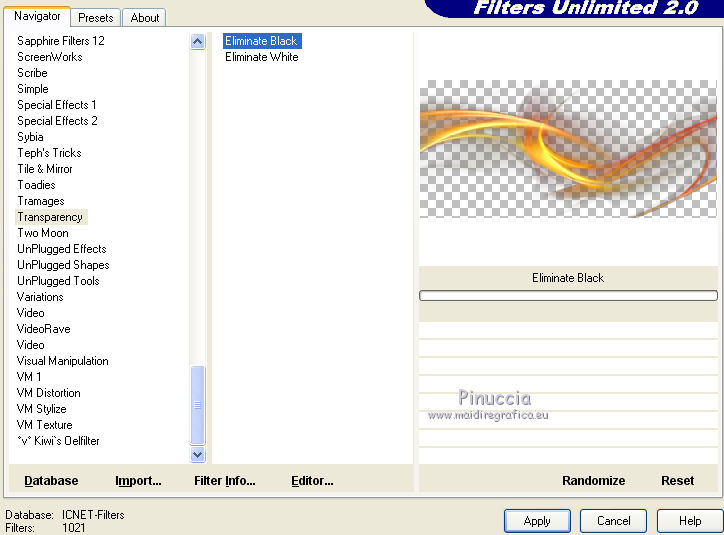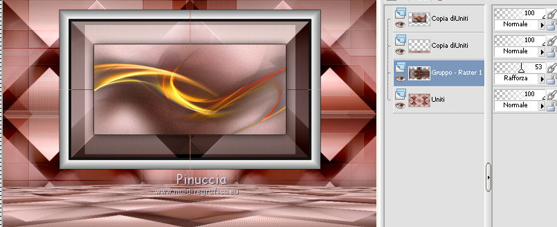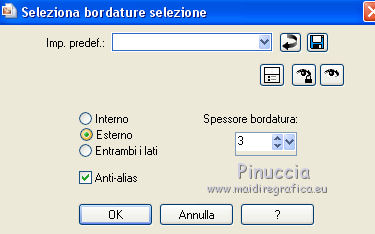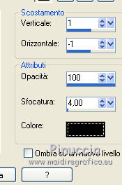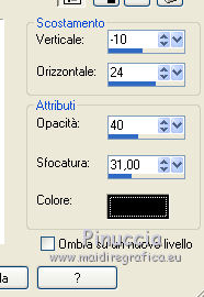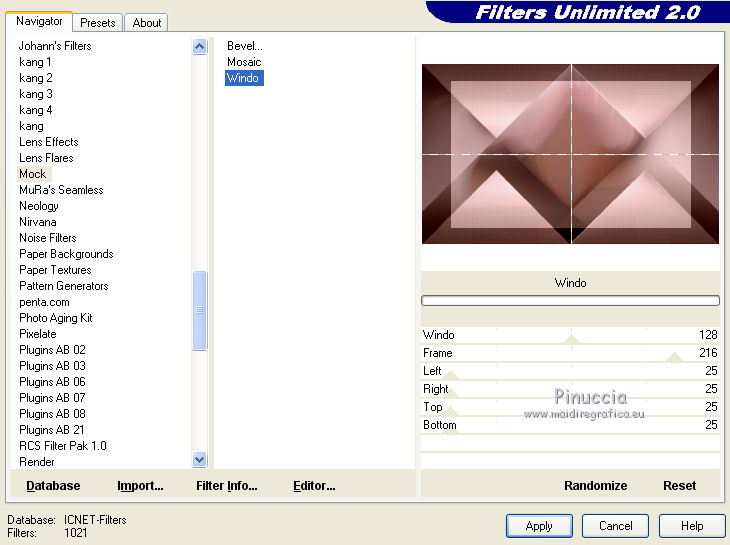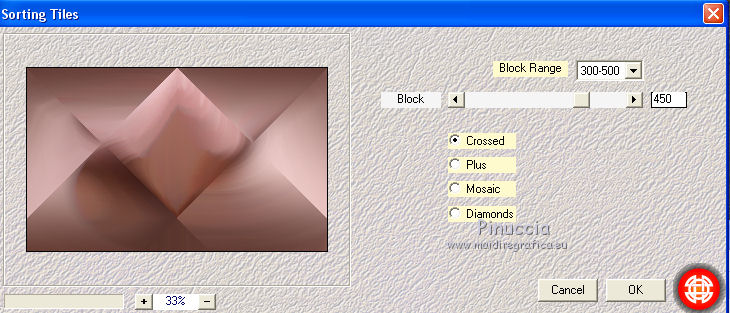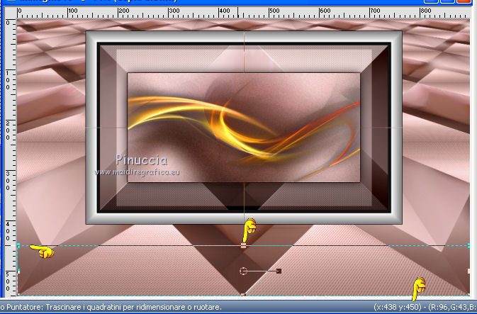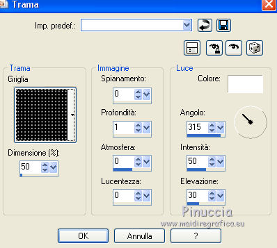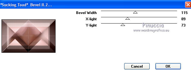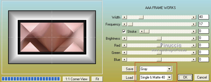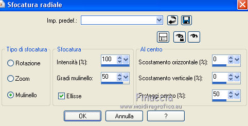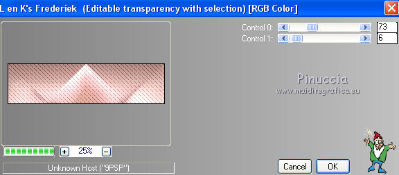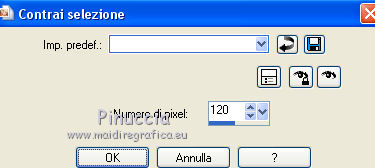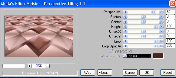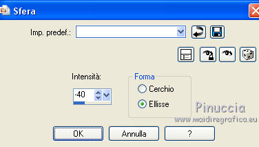 qui puoi trovare qualche risposta ai tuoi dubbi. Se l'argomento che ti interessa non è presente, ti prego di segnalarmelo. Questo tutorial è una creazione di Saturnella e non può essere copiato su altri siti nè essere offerto per il download. Lo stesso vale per la mia traduzione. E' anche proibito togliere il watermark dal materiale; rispettiamo il lavoro dei creatori di tubes, senza i quali non potremmo creare tutorials. Il tutorial è stato scritto con CorelX15, ma può essere eseguito anche con le altre versioni di PSP. Secondo la versione utilizzata (anteriore a PSP X) potresti ottenere dei risultati differenti. Vedi la mia scheda riguardante le funzioni Rifletti>Capovolgi nelle nuove versioni di PSP qui Per tradurre questo tutorial ho usato PSP X. Occorrente: Materiale qui Grazie: per il tube del bebé Beatriz, per il tube del pupazzo Maryse e per il wordart Kath's Korner. Per la maschera grazie Flore12. (in questa pagina trovi i links ai loro siti). Filtri in caso di dubbi, ricorda di consultare la mia sezione filtri qui Filters Unlimited 2.0 qui L&K's - L&K's Frederiek qui Mock - Windo qui Mehdi - Sorting Tiles, Wavy Lab qui Toadies - Socking Toad Bevel II2 qui AAA Frames - Frame Works qui Alien Skin Eye Candy 5 Impact - Perspective Shadow qui Mura's Meister - Perspective Tiling qui Transparency - Eliminate Black qui I filtri Mock, Toadies e Transparency si possono usare da soli o importati in Filters Unlimited (come fare vedi qui) Se un filtro fornito appare con questa icona ![]() non esitare a cambiare modalità di miscelatura e opacità secondo i colori utilizzati. Metti la selezione nella cartella Selezioni. La trama Corel_15_006 è standard nelle versioni più recenti di PSP, e corrisponde alla trama standard delle versioni precedenti Griglia. Se non la trovi nel tuo PSP, metti quella fornita nella cartella Trame. Apri la maschera in PSP e minimizzala con il resto del materiale. 1. Imposta il colore di primo piano con il colore chiaro #f5d2c0, e il colore di sfondo con il colore scuro #4a241b. ![]() Apri una nuova immagine trasparente 900 x 550 pixels. 2. Effetti>Plugins>Mehdi - Wavy Lab Questo filtro lavora con i colori della paletta materiali. Il primo è il colore di sfondo, il secondo quello di primo piano. Mantieni il terzo colore creato dal filtro. ![]() 3. Livelli>Nuovo livello raster. Selezione>Seleziona tutto. Apri il tube del bebé e vai a Modifica>Copia. Non chiuderlo perchè ti servirà ancora Torna al tuo lavoro e vai a Modifica>Incolla nella selezione. Selezione>Deseleziona. 4. Regola>Sfocatura>Sfocatura radiale. ![]() Effetti>Effetti di bordo>Aumenta. Livelli>Unisci>Unisci giù. 5. Effetti>Plugins>Mehdi - Sorting Tiles. ![]() 6. Selezione>Carica/Salva selezione>Carica selezione da disco. Cerca e carica la selezione sat_baby1. ![]() 7. Effetti>Plugins>L&K's - L&K's Frederiek. ![]() 8. Selezione>Innalza selezione a livello. Selezione>Deseleziona. 9. Livelli>Duplica. Immagine>Capovolgi. Livelli>Unisci>Unisci visibile. 10. Livelli>Duplica. Effetti>Plugins>Filters Unlimited 2.0 - Mock - Windo, con i settaggi standard. ![]() 11. Effetti>Plugins>Filters Unlimited 2.0 - Toadies - Sucking Toad,Bevel II,2. ![]() 12. Selezione>Seleziona tutto. Selezione>Modifica>Contrai - 120 pixels. ![]() 13. Effetti>Effetti 3D>Sfalsa ombra, colore nero. ![]() 14. Selezione>Inverti. Effetti>Plugins>AAA Frames - Frame Works. Seleziona Gray e Single&Matte40 e ok. ![]() 15. Di nuovo Selezione>Inverti. Regola>Sfocatura>Sfocatura gaussiana - raggio 25. ![]() 16. Regola>Aggiungi/Rimuovi disturbo>Aggiungi disturbo. ![]() Mantieni selezionato. 17. Livelli>Nuovo livello raster. Apri il frattale "4" e vai a Modifica>Copia. Torna al tuo lavoro e vai a Modifica>Incolla nella selezione. 18. Effetti>Plugins>Filters Unlimited 2.0 - Transparency - Eliminate black. ![]() 19. Attiva il livello sottostante. Selezione>Modifica>Seleziona bordature selezione. ![]() Riempi la selezione con il colore scuro.Effetti>Effetti di bordo>Aumenta. Selezione>Deseleziona. 20. Attiva il livello superiore. Effetti>Effetti 3D>Sfalsa ombra, con i settaggi precedenti. Livelli>Unisci>Unisci giù. 21. Immagine>Ridimensiona, al 70%, tutti i livelli non selezionato. 22. Effetti>Effetti di immagine>Scostamento. ![]() 23. Attiva il livello di sfondo. Livelli>Duplica. Effetti>Plugins>Mura's Meister - Perspective Tiling. ![]() 24. Premi il tasto K per attivare lo strumento Puntatore ![]() se stai usando PSP 9 il tasto D per attivare lo strumento Deformazione ![]() in modalità Scala, spingi il nodo superiore centrale verso il basso fino a 450 pixels. Nella barra inferiore puoi controllare la posizione. (se non visualizzi i Righelli, vai a Visualizza>Righelli) ![]() ![]() 25. Effetti>Effetti geometrici>Sfera. ![]() 26. Effetti>Effetti 3D>Sfalsa ombra. ![]() 27. Attiva il livello di sfondo. Effetti>Plugins>Filters Unlimited 2.0 - Tile et Mirror - Mirrored & scaled. ![]() 28. Livelli>Nuovo livello raster. Riempi con il colore scuro.Livelli>Nuovo livello maschera>Da immagine. Apri il menu sotto la finestra di origine e vedrai la lista dei files aperti. Seleziona la maschera Masqueflore94, con i seguenti settaggi. ![]() Effetti>Effetti di bordo>Aumenta. Livelli>Unisci>Unisci gruppo. 29. Effetti>Effetti di trama>Trama, seleziona la trama Griglia (Corel_15_066), con i seguenti settaggi: ![]() 30. Livelli>Duplica. Immagine>Rifletti. Abbassa l'opacità di questo livello al 50%. Livelli>Unisci>Unisci giù. Cambia la modalità di miscelatura di questo livello in Rafforza (o secondo i tuoi colori), e abbassa l'opacità al 53%. ![]() 31. Attiva il livello superiore. Effetti>Plugins>Alien Skin Eye Candy 5 Impact - Perspective Shadow. Seleziona il preset Drop Shadow blurry e ok. ![]() 32. Apri il tube del bebé e vai a Modifica>Copia. Torna al tuo lavoro e vai a Modifica>Incolla come nuovo livello. Immagine>Ridimensiona, al 75%, tutti i livelli non selezionato. 33. Effetti>Effetti 3D>Sfalsa ombra. ![]() Spostalo a sinistra.34. Apri il tube del 