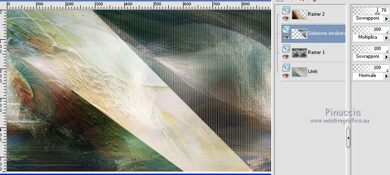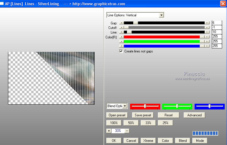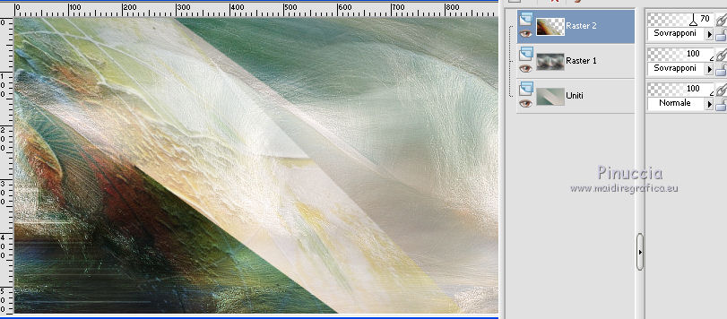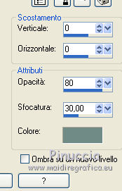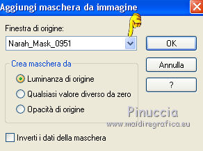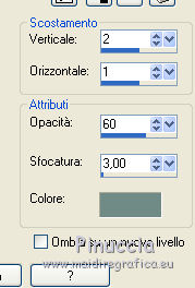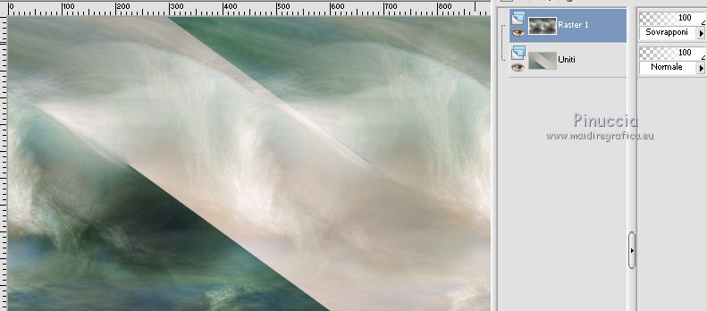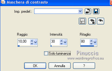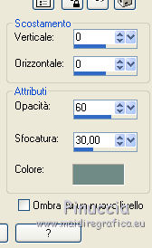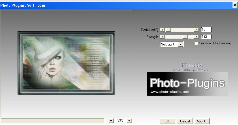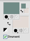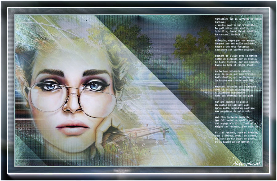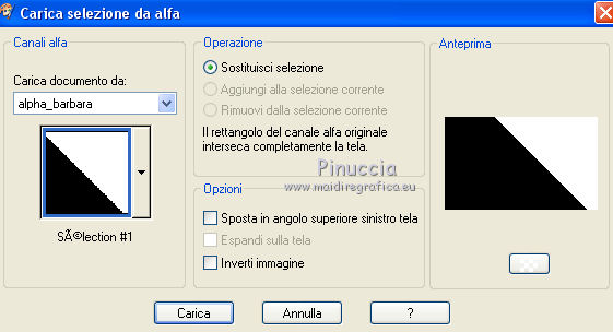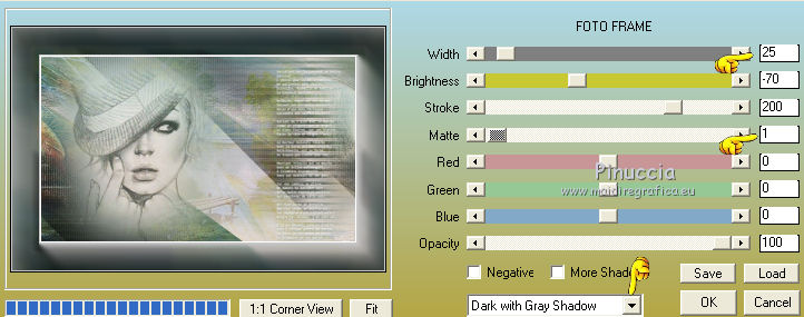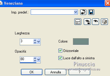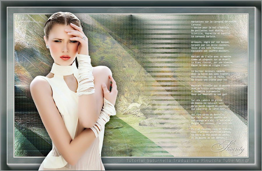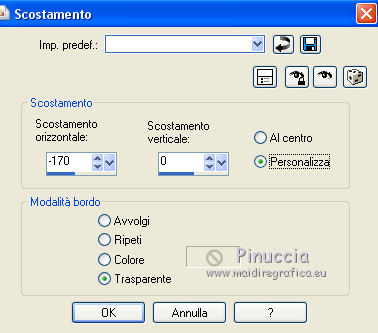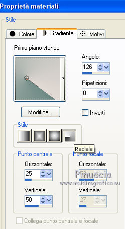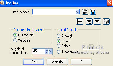 qui puoi trovare qualche risposta ai tuoi dubbi. Se l'argomento che ti interessa non è presente, ti prego di segnalarmelo. Questo tutorial è una creazione di Saturnella e non può essere copiato su altri siti nè essere offerto per il download. Lo stesso vale per la mia traduzione. E' anche proibito togliere il watermark dal materiale; rispettiamo il lavoro dei creatori di tubes, senza i quali non potremmo creare tutorials. Per tradurre questo tutorial, creato con PSP19, ho usato CorelX, ma può essere eseguito anche con le altre versioni di PSP. Dalla versione X4, il comando Immagine>Rifletti è stato sostituito con Immagine>Capovolgi in orizzontale, e il comando Immagine>Capovolgi con Immagine>Capovolgi in verticale. Nelle versioni X5 e X6, le funzioni sono state migliorate rendendo disponibile il menu Oggetti. Nel nuovo X7 sono tornati i comandi Immagine>Rifletti e Immagine>Capovolgi, ma con nuove funzioni. Vedi la scheda sull'argomento qui Occorrente: Materiale qui Grazie per il tube Yoka e per la maschera Narah. Il tube del paesaggio è di Saturnella (in questa pagina trovi i links ai loro siti). Filtri in caso di dubbi, ricorda di consultare la mia sezione filtri qui Filters Unlimited 2.0 qui AP 01 [Innovations] - Lines SilverLining qui FM Tile Tools - Blend Emboss, Saturation Emboss qui Simple - 4 way Average qui AAA Frame - Foto Frame qui Photo Plugin - Soft focus qui I filtri Simple si possono usare da soli o importati in Filters Unlimited (come fare vedi qui) Se un filtro fornito appare con questa icona ![]() non esitare a cambiare modalità di miscelatura e opacità secondo i colori utilizzati. Nelle ultime versioni di PSP non c'è il gradiente di primo piano/sfondo (Corel_06_029) Puoi usare i gradienti delle versioni precedenti. Trovi qui i gradienti Corel X. Apri la maschera in PSP e minimizzala con il resto del materiale. Colori utilizzati ![]() 1. Imposta il colore di primo piano con il colore scuro #708b86, e il colore di sfondo con il colore chiaro #e3dad5. ![]() Passa il colore di primo piano a Gradiente di primo piano/sfondo, stile Radiale. ![]() 2. Apri alpha_barbara. Finestra>Duplica o sulla tastiera maiuscola+D per fare una copia. ![]() Chiudi l'originale. La copia, che sarà la base del tuo lavoro, non è vuota, ma contiene una selezione salvata sul canale alfa. Riempi l'immagine trasparente con il gradiente.3. Livelli>Duplica. Immagine>Rifletti. Immagine>Capovolgi. Cambia la modalità di miscelatura di questo livello in Rafforza. Livelli>Unisci>Unisci visibile. 4. Livelli>Nuovo livello raster. Selezione>Seleziona tutto. Apri l'immagine "image 1" e vai a Modifica>Copia. Torna al tuo lavoro e vai a Modifica>Incolla nella selezione. Selezione>Deseleziona. 5. Effetti>Effetti di immagine>Motivo unico. ![]() Cambia la modalità di miscelatura di questo livello in Sovrapponi. ![]() Effetti>Effetti di bordo>Aumenta di più. 6. Apri l'immagine "image 2" e vai a Modifica>Copia. Torna al tuo lavoro e vai a Modifica>Incolla come nuovo livello. Effetti>Effetti di immagine>Scostamento. ![]() 7. Effetti>Effetti geometrici>Inclina. ![]() Cambia la modalità di miscelatura di questo livello in Sovrapponi, e abbassa l'opacità al 70%. ![]() 8. Attiva il livello sottostante. Selezione>Carica/Salva selezione>Carica selezione da canale alfa. la selezione sélection1 è subito disponibile. Devi soltanto cliccare Carica. ![]() Selezione>Innalza selezione a livello. Selezione>Deseleziona. 9. Effetti>Plugins>AP 01 [Innovations] - Lines SilverLining. ![]() Cambia la modalità di miscelatura di questo livello in Moltiplica. ![]() 10. Effetti>Effetti di immagine>Motivo unico, con i settaggi standard. ![]() 11. Attiva il livello superiore. Apri il tube del paesaggio e vai a Modifica>Copia. Torna al tuo lavoro e vai a Modifica>Incolla come nuovo livello. Io ho abbassato l'opacità al 30%. 12. Effetti>Plugins>FM Tile Tools - Saturation Emboss, con i settaggi standard. ![]() 13. Effetti>Plugins>FM Tile Tools - Blend Emboss, con i settaggi standard. ![]() 14. Livelli>Nuovo livello raster. Riempi con il colore chiaro di sfondo.Livelli>Nuovo livello maschera>Da immagine. Apri il menu sotto la finestra di origine e vedrai la lista dei files aperti. Seleziona la maschera Narah_Mask_0951. ![]() Effetti>Effetti di bordo>Aumenta di più. Livelli>Unisci>Unisci gruppo. Immagine>Rifletti. Effetti>Effetti di immagine>Scostamento. ![]() 15. Effetti>Effetti 3D>Sfalsa ombra, con il colore scuro. ![]() 16. Apri il tube texte e vai a Modifica>Copia. Torna al tuo lavoro e vai a Modifica>Incolla come nuovo livello. Spostalo a destra.Immagine>Immagine negativa. se stai usando PSP 9: Regola>Bilanciamento colore>Immagine negativa 17. Effetti>Effetti 3D>Sfalsa ombra, con il colore scuro. ![]() 18. Apri il tube dei viso di Yoka e vai a Modifica>Copia. Torna al tuo lavoro e vai a Modifica>Incolla come nuovo livello. Spostalo a sinistra.19. Effetti>Effetti 3D>Sfalsa ombra, con il colore scuro. ![]() Livelli>Unisci>Unisci visibile. 20. Immagine>Aggiungi bordatura, 1 pixel, simmetriche, colore scuro. Immagine>Aggiungi bordatura, 3 pixels, simmetriche, colore chiaro. Immagine>Aggiungi bordatura, 1 pixel, simmetriche, colore scuro. Immagine>Aggiungi bordatura, 50 pixels, simmetriche, colore bianco. 21. Attiva lo strumento Bacchetta magica ![]() e clicca nel bordo di 50 pixels per selezionarlo. Attiva nuovamente l'immagine "image 1" e vai a Modifica>Copia. Torna al tuo lavoro e vai a Modifica>Incolla nella selezione. 22. Effetti>Plugins>Simple - 4 Way average. 23. Effetti>Effetti di trama>Veneziana, colore scuro. ![]() 24. Effetti>Plugins>AAA Frames - Foto Frame. prima seleziona Dark with Gray shadow e poi cambia i settaggi indicati: ![]() 25. Selezione>Inverti. Effetti>Effetti 3D>Sfalsa ombra. ![]() Selezione>Deseleziona. 26. Effetti>Plugins>Photo Plugins - Soft Focus ![]() 27. Firma il tuo lavoro su un nuovo livello. Immagine>Aggiungi bordatura, 1 pixel, simmetriche, colore nero. Immagine>Ridimensiona, 900 pixels di largh
