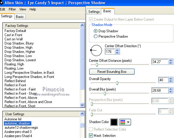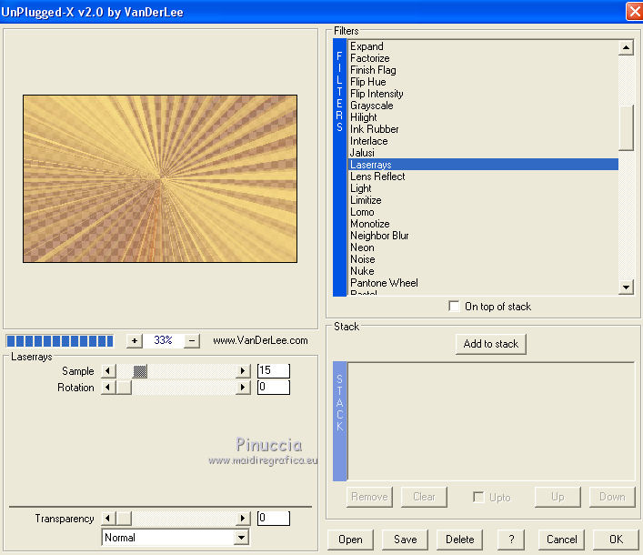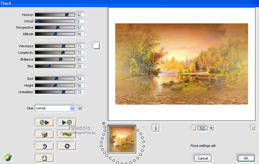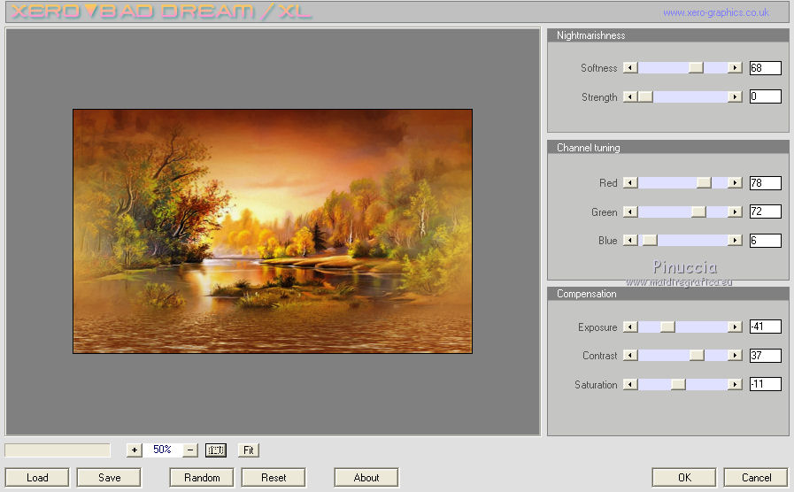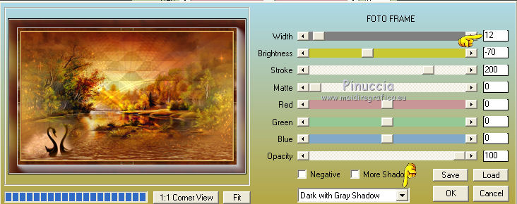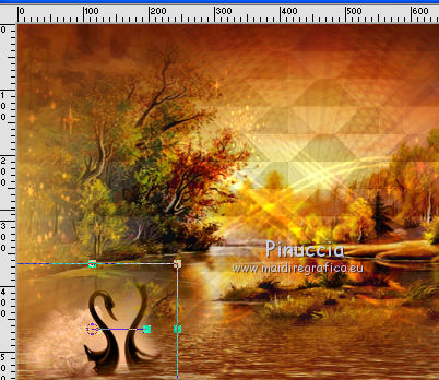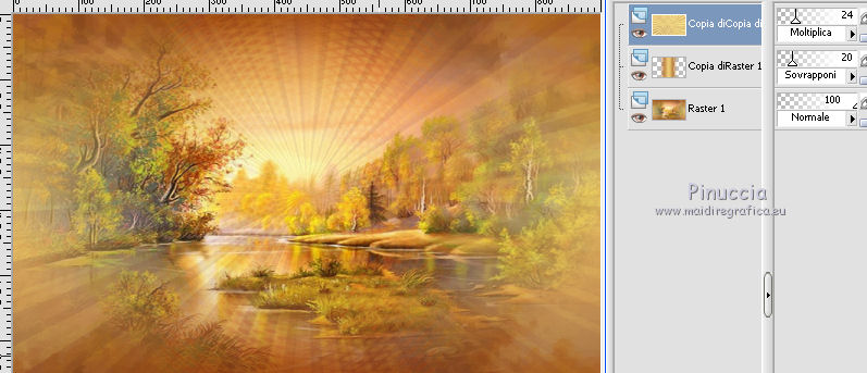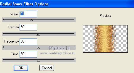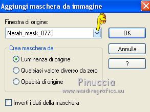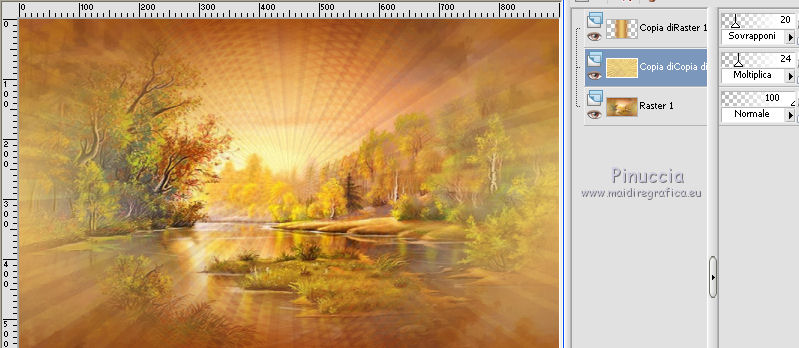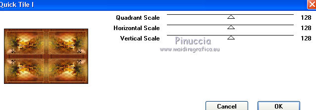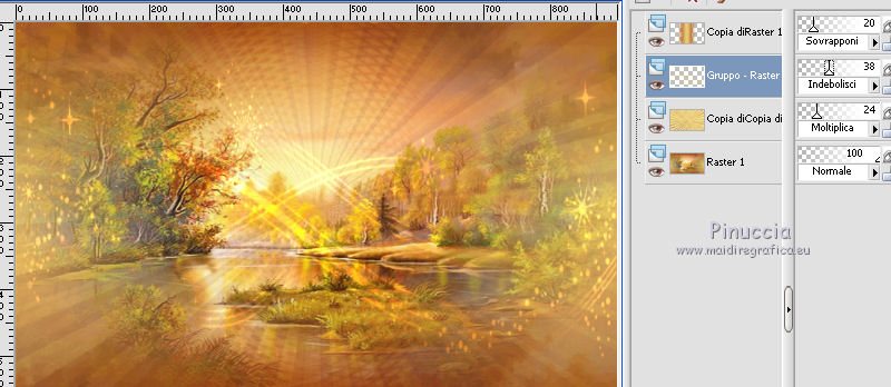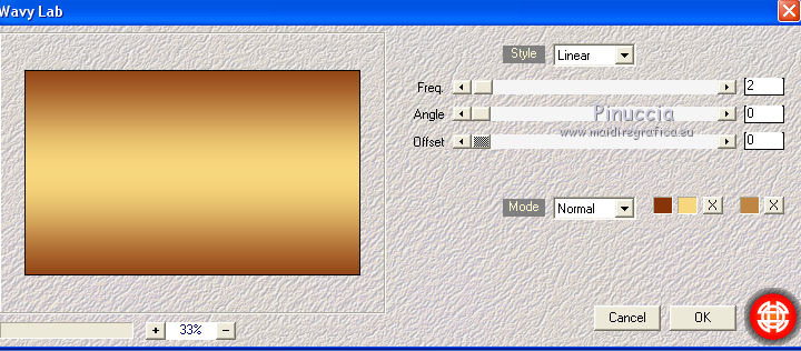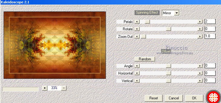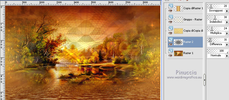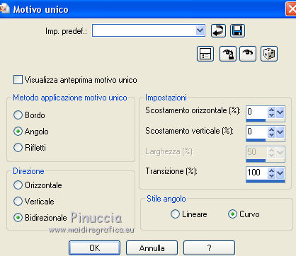 qui puoi trovare qualche risposta ai tuoi dubbi. Se l'argomento che ti interessa non è presente, ti prego di segnalarmelo. Questo tutorial è una creazione di Saturnella e non può essere copiato su altri siti nè essere offerto per il download. Lo stesso vale per la mia traduzione. E' anche proibito togliere il watermark dal materiale; rispettiamo il lavoro dei creatori di tubes, senza i quali non potremmo creare tutorials. Per tradurre questo tutorial, creato con PSP17, ho usato CorelX, ma può essere eseguito anche con le altre versioni di PSP. Dalla versione X4, il comando Immagine>Rifletti è stato sostituito con Immagine>Capovolgi in orizzontale, e il comando Immagine>Capovolgi con Immagine>Capovolgi in verticale. Nelle versioni X5 e X6, le funzioni sono state migliorate rendendo disponibile il menu Oggetti. Nel nuovo X7 sono tornati i comandi Immagine>Rifletti e Immagine>Capovolgi, ma con nuove funzioni. Vedi la scheda sull'argomento qui Occorrente: Materiale qui Grazie per i tubes Gabry, Luna e Kara, per la maschera Narah. (in questa pagina trovi i links ai loro siti). Filtri in caso di dubbi, ricorda di consultare la mia sezione filtri qui Filters Unlimited 2.0 qui Mehdi - Wavy Lab qui Mehdi - Kaleidoscope 2.1 qui FM Tile Tools - Blend Emboss qui DSB Flux - Radial Smox qui Flaming Pear - Flood qui Alien Skin Eye Candy 5 Impact - Perspective Shadow qui Graphics Plus - Quick Tile 1 qui VanDerLee - Unplugged-X qui Xero XL - Bad Dream qui I filtri Graphics Plus si possono usare da soli o importati in Filters Unlimited (come fare vedi qui) Se un filtro fornito appare con questa icona ![]() non esitare a cambiare modalità di miscelatura e opacità secondo i colori utilizzati. Nelle ultime versioni di PSP non c'è il gradiente di primo piano/sfondo (Corel_06_029) Trovi i gradienti delle versioni precedenti qui Metti i preset Cliccando sul file una o due volte (a seconda delle tue impostazioni), automaticamente il preset si installerà nella cartella corretta. perchè uno o due clic vedi qui Apri la maschera in PSP e minimizzala con il resto del materiale. 1. Imposta il colore di primo piano con #f7d77d. e il colore di sfondo con #883409. ![]() Apri una nuova immagine trasparente 900 x 550. Effetti>Plugins>Mehdi - Wavy Lab. questo filtro lavora con i colori della paletta: il primo è il colore di sfondo, il secondo quello di primo piano, mantieni l'ultimo colore creato dal filtro. ![]() 2. Livelli>Duplica. Immagine>Ridimensiona, all'80%, tutti i livelli non selezionato. 3. Immagine>Ruota per gradi - 90 gradi a destra. ![]() 4. Attiva il livello di sfondo. Selezione>Seleziona tutto. Immagine>Ritaglia la selezione. 5. Attiva nuovamente il livello superiore. Effetti>Effetti geometrici>Prospettiva verticale. ![]() 6. Effetti>Effetti di immagine>Motivo unico. ![]() 7. Attiva il livello di sfondo. Livelli>Nuovo livello raster. Selezione>Seleziona tutto. Apri il tube del paesaggio di Luna e vai a Modifica>Copia. Torna al tuo lavoro e vai a Modifica>Incolla nella selezione. Selezione>Deseleziona. 8. Effetti>Effetti di immagine>Motivo unico. ![]() Abbassa l'opacità di questo livello al 30%. 9. Effetti>Plugins>FM Tile Tools - Blend Emboss, con i settaggi standard. ![]() Livelli>Unisci>Unisci giù. 10. Effetti>Effetti tecniche di disegno>Pennellate. ![]() 11. Livelli>Nuovo livello raster. Selezione>Seleziona tutto. Modifica>Incolla nella selezione (il tube del paesaggio di Luna è sempre in memoria). Selezione>Deseleziona. Livelli>Unisci>Unisci giù. 12. Attiva il livello superiore. Effetti>Plugins>DSB flux - Radial Smox. ![]() Cambia la modalità di miscelatura di questo livello in Sovrapponi, e abbassa l'opacità al 20%. Effetti>Effetti di bordo>Aumenta. 13. Livelli>Duplica. Effetti>Plugins>VanDerLee - Unplugged-X - Laserrays. ![]() Cambia la modalità di miscelatura di questo livello in Moltiplica, e abbassa l'opacità al 24%. ![]() Livelli>Disponi>Sposta giù. ![]() 14. Livelli>Nuovo livello raster. Riempi con il colore chiaro.Livelli>Nuovo livello maschera>Da immagine. Apri il menu sotto la finestra di origine e vedrai la lista dei files aperti. Seleziona la maschera Narah_Mask_0773, con i seguenti settaggi. ![]() Livelli>Unisci>Unisci gruppo. Cambia la modalità di miscelatura di questo livello in Indebolisci, e abbassa l'opacità al 38%. ![]() 15. Attiva il livello di sfondo. Effetti>Plugins>Flaming Pear - Flood. ![]() 16. Effetti>Plugins>Xero - Bad Dream. ![]() 17. Apri il tube deco cp_glass, e vai a Modifica>Copia. Torna al tuo lavoro e vai a Modifica>Incolla come nuovo livello. Efetti>Effetti di bordo>Aumenta. Cambia la modalità di miscelatura di questo livello in Differenza, e abbassa l'opacità al 16%. ![]() 18. Attiva il livello superiore. Apri il tube degli uccelli di Kara, e vai a Modifica>Copia. Torna al tuo lavoro e vai a Modifica>Incolla come nuovo livello. Immagine>Ridimensiona, al 40%, tutti i livelli non selezionato. Immagine>Rifletti. Regola>Messa a fuoco>Metti a fuoco. Spostalo in basso a sinistra.![]() Cambia la modalità di miscelatura di questo livello in Luminanza (esistente). 19. Attiva il livello di sfondo. Modifica>Copia. 20. Immagine>Aggiungi bordatura, 1 pixel, simmetriche, colore scuro. Immagine>Aggiungi bordatura, 3 pixels, simmetriche, colore chiaro. Immagine>Aggiungi bordatura, 1 pixel, simmetriche, colore scuro. Immagine>Aggiungi bordatura, 50 pixels, simmetriche, colore bianco. 21. Attiva lo strumento Bacchetta magica ![]() e clicca nel bordo bianco per selezionarlo. Modifica>Incolla nella selezione. 22. Effetti>Plugins>Mehdi - Kaléïdoscope 2.1. ![]() 23. Regola>Aggiungi/rimuovi disturbo>Aggiungi disturbo. ![]() 24. Effetti>Plugins>Graphics Plus - Quick tile1. ![]() 25. Selezione>Inverti. Effetti>Effetti 3D>Sfalsa ombra. ![]() Selezione>Deseleziona. 26. Effetti>Plugins>AAA Frames - Foto Frame. prima seleziona Dark with gray shadow e poi cambia width con 12. ![]() 27. Apri il tube della bambina di Gabry e vai a Modifica>Copia. Torna al tuo lavoro e vai a 