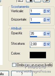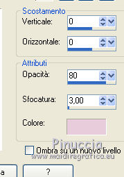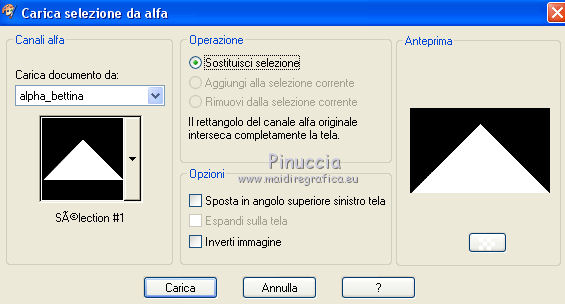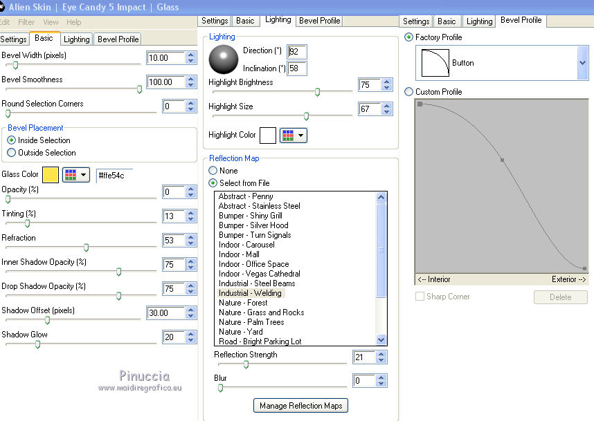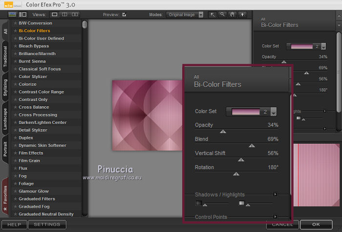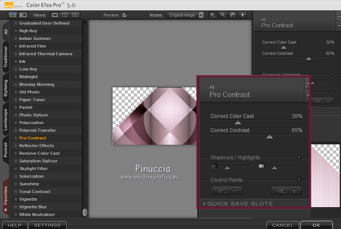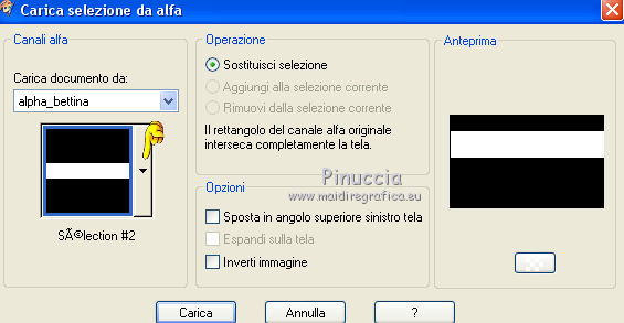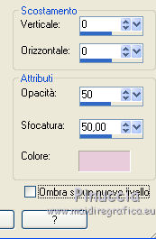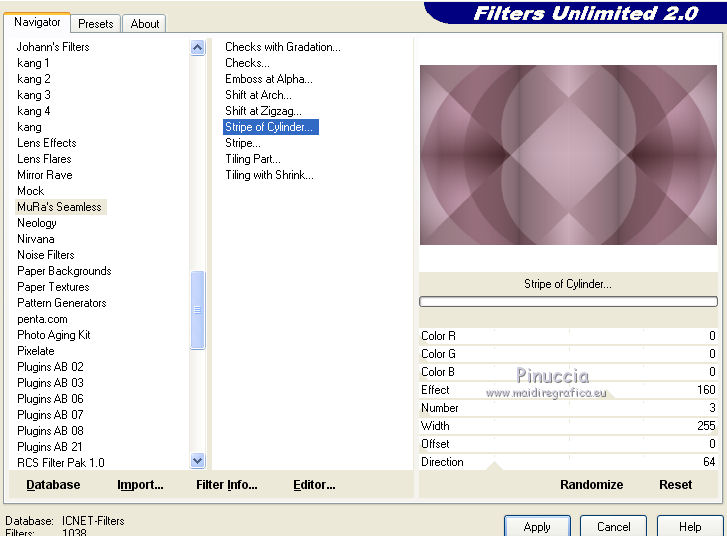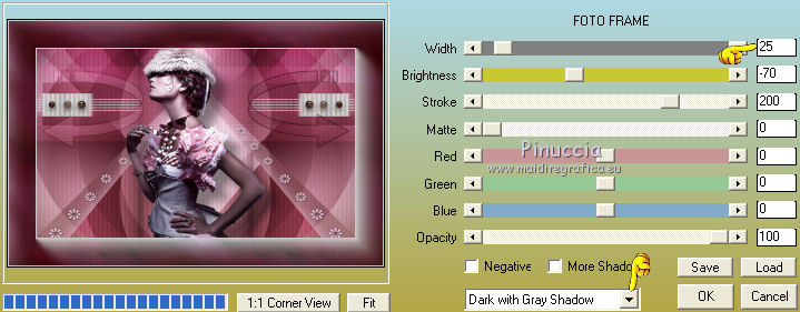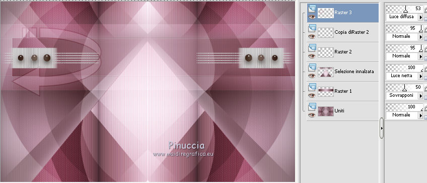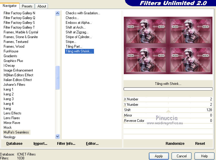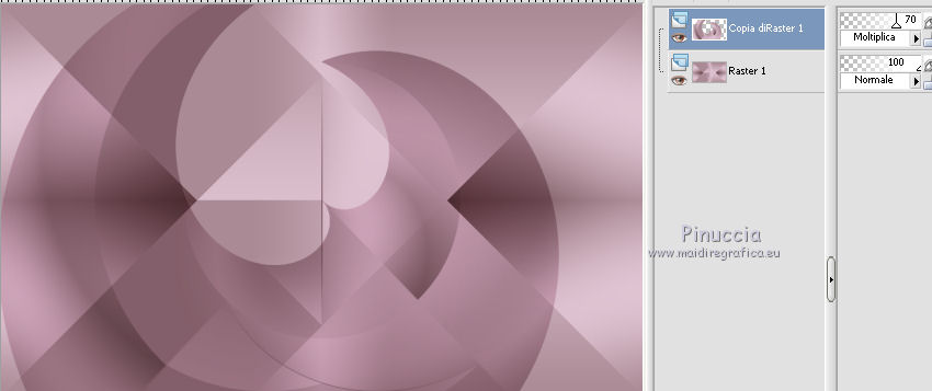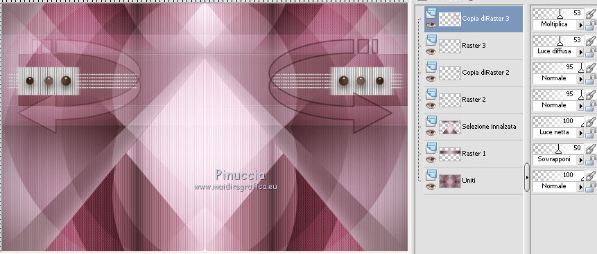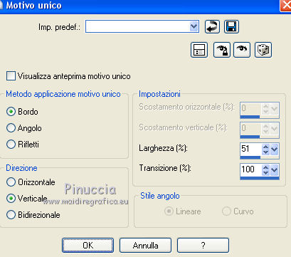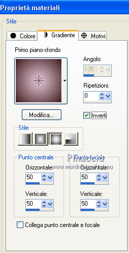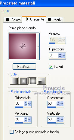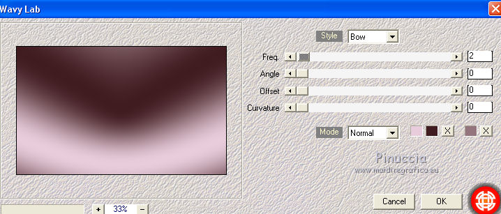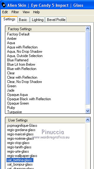 qui puoi trovare qualche risposta ai tuoi dubbi. Se l'argomento che ti interessa non è presente, ti prego di segnalarmelo. Questo tutorial è una creazione di Saturnella e non può essere copiato su altri siti nè essere offerto per il download. Lo stesso vale per la mia traduzione. E' anche proibito togliere il watermark dal materiale; rispettiamo il lavoro dei creatori di tubes, senza i quali non potremmo creare tutorials. Il tutorial è stato scritto con CorelX15, ma può essere eseguito anche con le altre versioni di PSP. Dalla versione X4, il comando Immagine>Rifletti è stato sostituito con Immagine>Capovolgi in orizzontale, e il comando Immagine>Capovolgi con Immagine>Capovolgi in verticale. Nelle versioni X5 e X6, le funzioni sono state migliorate rendendo disponibile il menu Oggetti. Vedi la scheda sull'argomento qui Per tradurre questo tutorial ho usato PSP X. Occorrente: Materiale qui Per il tube della donna grazie Kitty. (in questa pagina trovi i links ai loro siti). Filtri in caso di dubbi, ricorda di consultare la mia sezione filtri qui Filters Unlimited 2.0 qui Simple - Pizza Slice Mirror, Top Left Mirror qui Mehdi - Wavy Lab qui AAA Frames - Foto Frame qui Carolaine and Sensibility - CS-DLines qui Alien Skin Eye Candy 5 Impact - Glass, Perspective Shadow qui Mura's Seamless - Stripe of Cylinder, Tiling with shrink qui Toadies - What are you qui Nik Software - Color Efex Pro qui I filtri Toadies, Simple e Mura's Seamless, si possono usare da soli o importati in Filters Unlimited (come fare vedi qui) Se un filtro fornito appare con questa icona ![]() non esitare a cambiare modalità di miscelatura e opacità secondo i colori utilizzati. Metti i preset Cliccando sul file una o due volte (a seconda delle tue impostazioni), automaticamente il preset si installerà nella cartella corretta. perchè uno o due clic vedi qui 1. Imposta il colore di primo piano con il colore scuro #401c20, e il colore di sfondo con il colore chiaro #e8ccdb. ![]() 2. Apri alpha_bettina. Finestra>Duplica, o sulla tastiera maiuscola+D, per fare una copia. Chiudi l'originale. La copia, che sarà la base del tuo lavoro, non è vuota, ma contiene le selezioni salvate sul canale alfa. 3. Effetti>Plugins>Mehdi - Wavy Lab. Questo filtro lavora con i colori della paletta materiali. Il primo è il colore di sfondo, il secondo quello di primo piano. Mantieni il terzo colore creato dal filtro. ![]() 3. Regola>Sfocatura>Sfocatura gaussiana - raggio 50. ![]() 4. Effetti>Plugins>Simple - Pizza Slice Mirror. Modifica>Ripeti Pizza Slice Mirror. 5. Livelli>Duplica. Immagine>Ruota per gradi - 45 gradi a sinistra. ![]() 6. Effetti>Effetti di distorsione>Coordinate polari. ![]() Cambia la modalità di miscelatura di questo livello in Moltiplica (o secondo i tuoi colori), e abbassa l'opacità al 70%. ![]() 7. Effetti>Plugins>Carolaine and Sensibility - CS-DLines. ![]() 8. Attiva il livello di sfondo. Effetti>Effetti di trama>Veneziana - colore scuro di primo piano. ![]() Livelli>Unisci>Unisci visibile. 9. Effetti>Plugins>Simple - Top Left Mirror. ![]() 10. Effetti>Plugins>Filters Unlimited 2.0 - Mura's Seamless - Stripe of Cylinder. ![]() 11. Selezione>Carica/Salva selezione>Carica selezione da canale alfa. La selezione selection#1 è subito disponibile. Devi soltanto cliccare Carica. ![]() Selezione>Innalza selezione a livello. Effetti>Plugins>Nik Software - Color Efex Pro - Pro contrast. ![]() Selezione>Deseleziona. 12. Effetti>Effetti di immagine>Motivo unico. ![]() Cambia la modalità di miscelatura di questo livello in Luce netta. 13. Effetti>Effetti 3D>Sfalsa ombra, con il colore chiaro. ![]() 14. Livelli>Nuovo livello raster. Selezione>Carica/Salva selezione>Carica selezione da canale alfa. Apri il menu delle selezioni e carica Selection#2. ![]() Passa il colore di primo piano a Gradiente di primo piano/sfondo, stile Sprazzo di luce. ![]() Riempi la selezione con il gradiente.Selezione>Deseleziona. 15. Effetti>Plugins>Toadies - What are you. ![]() Effetti>Effetti di bordo>Aumenta di più. Cambia la modalità di miscelatura di questo livello in Sovrapponi e abbassa l'opacità al 50%. ![]() Livelli>Disponi>Sposta giù. 16. Effetti>Effetti 3D>Sfalsa ombra, con il colore chiaro. ![]() 17. Attiva il livello superiore. Apri il tube déco1 e vai a Modifica>Copia. Torna al tuo lavoro e vai a Modifica>Incolla come nuovo livello. Effetti>Effetti di immagine>Scostamento. ![]() 18. Selezione>Carica/Salva selezione>Carica selezione da canale alfa. Apri il menu delle selezioni e carica Selection#3. ![]() Livelli>Nuovo livello raster. Riempi con il gradiente.19. Effetti>Plugins>Alien Skin Eye Candy 5 Impact - Glass. Seleziona il preset sat_bettina_glass e ok. ![]() In caso di problemi con il preset, puoi copiare i settaggi che vedi nella schermata. ![]() Selezione>Deseleziona. Livelli>Unisci>Unisci giù. 20. Livelli>Duplica. Immagine>Rifletti. 21. Apri il tube déco2, e vai a Modifica>Copia. Torna al tuo lavoro e vai a Modifica>Incolla come nuovo livello. Effetti>Effetti di immagine>Scostamento. ![]() Il tube è in modalità Luce diffusa, opacità 53. ![]() Livelli>Duplica. Immagine>Rifletti. Cambia la modalità di miscelatura di questo livello in Moltiplica, e mantieni l'opacità a 53. ![]() 22. Apri il tube déco3 e vai a Modifica>Copia. Torna al tuo lavoro e vai a Modifica>Incolla come nuovo livello. Effetti>Effetti di immagine>Scostamento. ![]() 23. Effetti>Effetti 3D>Sfalsa ombra, colore nero. ![]() 24. Apri il tube della donna di Kitty, e vai a Modifica>Copia. Torna al tuo lavoro e vai a Modifica>Incolla come nuovo livello. Immagine>Ridimensiona, al 75%, tutti i livelli non selezionato. Regola>Messa a fuoco>Metti a fuoco. 25. Effetti>Plugins>Alien Skin Eye Candy 5 Impact - Perspective Shadow. Seleziona il preset sat_bettina-shadow e ok. ![]() 26. Attiva il livello di sfondo. Effetti>Plugins>Nik Software - Color Efex pro - Bi-Color filters. Per l'esempio Color Set Violet/Pink2 (adatta i settaggi ai tuoi colori) ![]() 27. Im