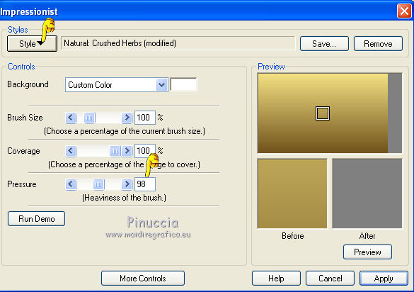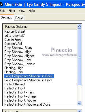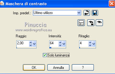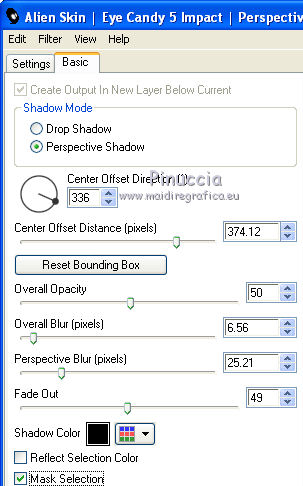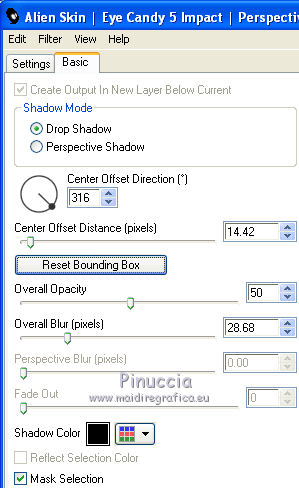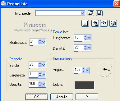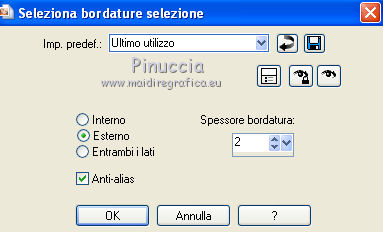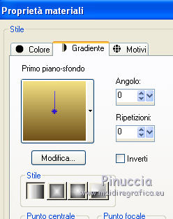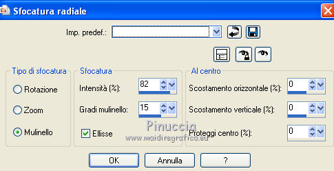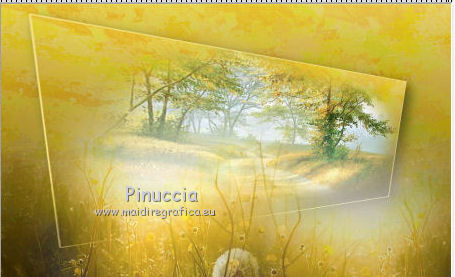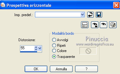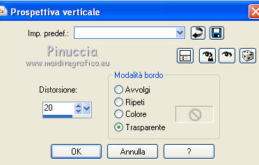 qui puoi trovare qualche risposta ai tuoi dubbi. Se l'argomento che ti interessa non è presente, ti prego di segnalarmelo. Questo tutorial è una creazione di Saturnella e non può essere copiato su altri siti nè essere offerto per il download. Lo stesso vale per la mia traduzione. E' anche proibito togliere il watermark dal materiale; rispettiamo il lavoro dei creatori di tubes, senza i quali non potremmo creare tutorials. Il tutorial è stato creato con PSP12, ma può essere eseguito anche con le altre versioni. Per tradurlo, ho usato PSP X. Occorrente: Materiale qui Il tube della donna è di ClaudiaViza. Il tube del paesaggio è di Chantoune. Il tube dei fiori è di Guismo. (in questa pagina trovi i links ai loro siti). Filtri in caso di dubbi, ricorda di consultare la mia sezione filtri qui Impressionist qui Alien Skin Eye Candy 5 Impact qui FM Tile Tools - Blend Emboss qui Adjust - Variations qui ![]() 1. Imposta il colore di primo piano con #70511a, e il colore di sfondo con #f2e082. Passa il colore di primo piano a Gradiente, stile Lineare. ![]() 2. Apri una nuova immagine trasparente 900 x 550 pixels, e riempila con il gradiente.3. Livelli>Duplica. Effetti>Plugins>Impressionnist - Impressionnist. ![]() Cambia la modalità di miscelatura di questo livello in Moltiplica. 4. Effetti>Plugins>FM Tile Tools - Blend Emboss, con i settaggi standard. ![]() 5. Livelli>Unisci>Unisci visibile. non preoccuparti se, controllando l'esempio finale, trovi i colori differenti dai tuoi. Dipende dal filtro che sarà applicato alla fine del lavoro 6. Livelli>Duplica. Immagine>Ridimensiona, al 90%, tutti i livelli non selezionato. 7. Selezione>Seleziona tutto. Selezione>Mobile. Selezione>Immobilizza. 8. Apri il tube del paesaggio di Chantoune e vai a Modifica>Copia. Torna al tuo lavoro e vai a Modifica>Incolla nella selezione. 9. Selezione>Modifica>Seleziona bordature selezione. ![]() Riempi la selezione con il colore chiaro.Selezione>Deseleziona. 10. Effetti>Effetti geometrici>Prospettiva orizzontale. ![]() 11. Effetti>Effetti geometrici>Prospettiva verticale. ![]() 12. Effetti>Effetti di immagine>Scostamento. ![]() 13. Effetti>Plugins>Alien Skin Eye Candy 5 Impact - Perspective Shadow. ![]() 14. Apri il tube di Guismo "calguismisted27410" e vai a Modifica>Copia. Torna al tuo lavoro e vai a Modifica>Incolla come nuovo livello. Spostalo in basso a sinistra.15. Livelli>Duplica. Immagine>Rifletti. Posiziona correttamente sul lato destro il duplicato.Abbassa l'opacità di questo livello all'82%. ![]() 16. Apri il tube della donna "tubeclaudiaviza-mujer2054" e vai a Modifica>Copia. Torna al tuo lavoro e vai a Modifica>Incolla come nuovo livello. Immagine>Ridimensiona, al 70%, tutti i livelli non selezionato. 17. Effetti>Plugins>Alien Skin Eye Candy 5 Impact - Perspective Shadow. ![]() 18. Attiva il livello di sfondo. Livelli>Nuovo livello raster. Selezione>Seleziona tutto. Attiva nuovamente il tube del paesaggio di Chantoune e vai a Modifica>Copia. Torna al tuo lavoro e vai a Modifica>Incolla nella selezione. Selezione>Deseleziona. 19. Livelli>Duplica. Immagine>Rifletti. Posiziona correttamente questo livello, armonizzandolo con l'originale.20. Livelli>Unisci>Unisci giù. Cambia la modalità di miscelatura di questo livello in Luce netta, e abbassa l'opacità al 75% (settaggi che puoi regolare in base al tuo tube). 21. Livelli>Unisci>Unisci visibile. 22. Immagine>Aggiungi bordatura, 2 pixels, simmetriche, con il colore scuro. Immagine>Aggiungi bordatura, 5 pixels, simmetriche, con il colore chiaro. 23. Livelli>Duplica. Immagine>Ridimensiona, al 90%, tutti i livelli non selezionato. Attiva il livello inferiore. 24. Regola>Sfocatura>Sfocatura radiale. ![]() Effetti>Effetti di bordo>Aumenta di più. 25. Effetti>Effetti tecniche di disegno>Pennellate. Colore #404040 ![]() 26. Attiva nuovamente il livello superiore. 27. Effetti>Effetti 3D>Sfalsa ombra. ![]() 28. Immagine>Aggiungi bordatura, 1 pixel, simmetriche, con il colore scuro. 29. Apri il tube "texte" e vai a Modifica>Copia. Torna al tuo lavoro e vai a Modifica>Incolla come nuovo livello. Posiziona il testo nel quadro centrale.30. Firma il tuo lavoro. Livelli>Unisci>Unisci tutto. 31. Immagine>Ridimensiona, a 900 pixels di larghezza, tutti i livelli selezionato. Regola>Messa a fuoco>Maschera di contrasto. ![]() 32. Effetti>Plugins>Adjust - Variations. Un clic su Original, per annullare eventuali precedenti settaggi memorizzati dal filtro. Un clic su More Red e ok (puoi cambiare settaggio in base ai tuoi colori). Salva in formato jpg. ![]() Se hai problemi o dubbi, o trovi un link non funzionante, o anche soltanto per dirmi che ti è piaciuto, scrivimi. 5 Maggio 2012 |
