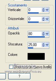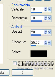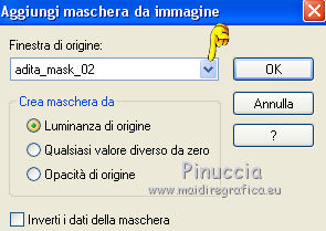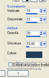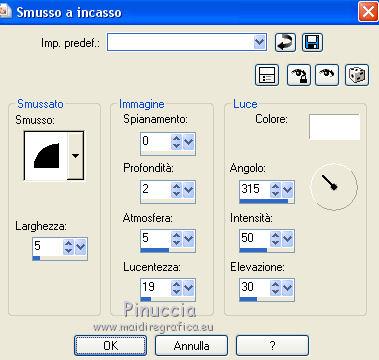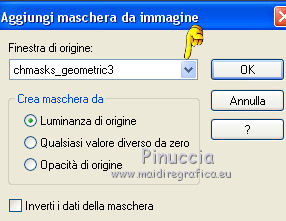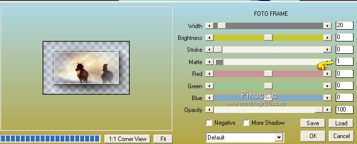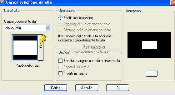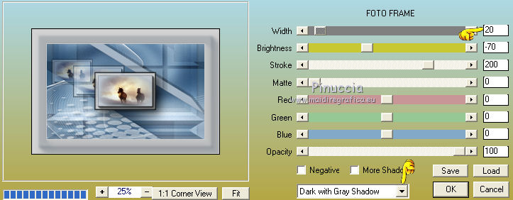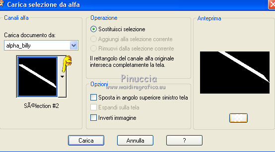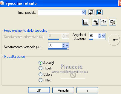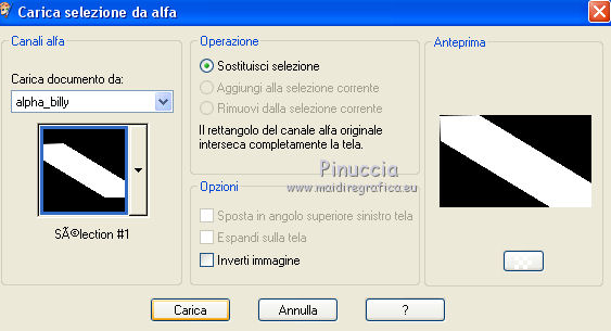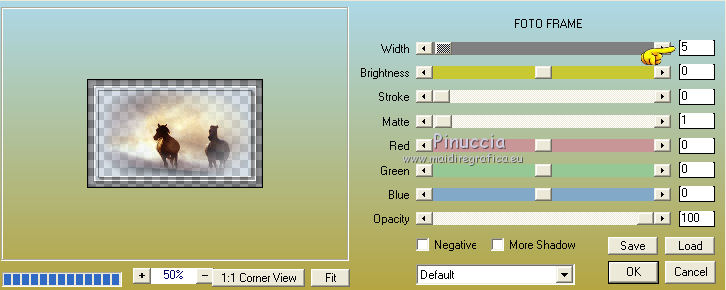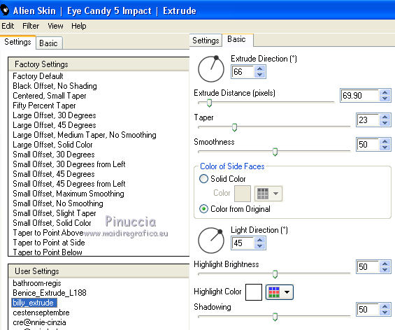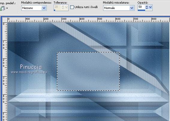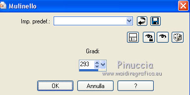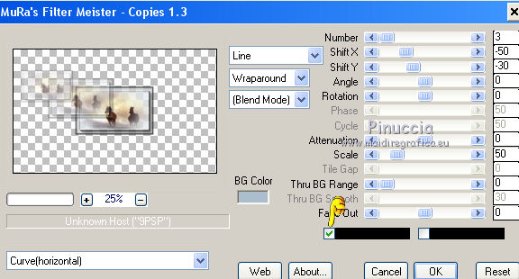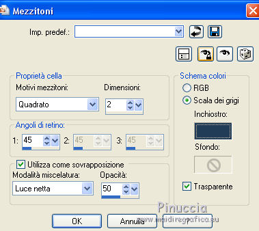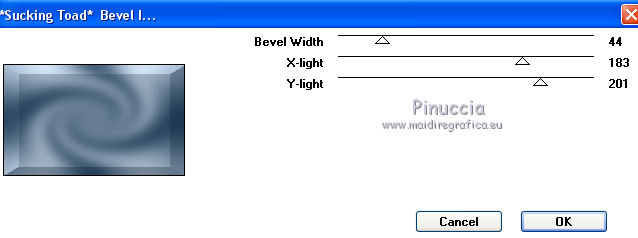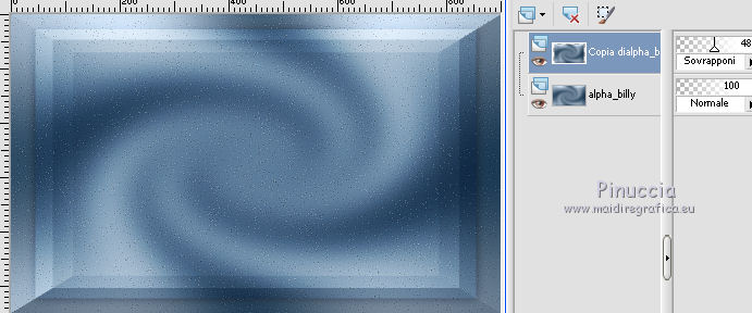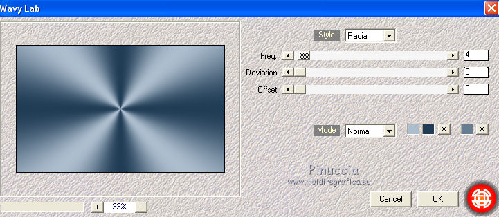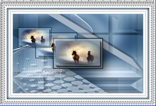qui puoi trovare qualche risposta ai tuoi dubbi. Se l'argomento che ti interessa non è presente, ti prego di segnalarmelo. Questo tutorial è una creazione di Saturnella e non può essere copiato su altri siti nè essere offerto per il download. Lo stesso vale per la mia traduzione. E' anche proibito togliere il watermark dal materiale; rispettiamo il lavoro dei creatori di tubes, senza i quali non potremmo creare tutorials. Per tradurre questo tutorial, creato con X6, ho usato CorelX, ma può essere eseguito anche con le altre versioni di PSP. Dalla versione X4, il comando Immagine>Rifletti è stato sostituito con Immagine>Capovolgi in orizzontale, e il comando Immagine>Capovolgi con Immagine>Capovolgi in verticale. Nelle versioni X5 e X6, le funzioni sono state migliorate rendendo disponibile il menu Oggetti. Nel nuovo X7 sono tornati i comandi Immagine>Rifletti e Immagine>Capovolgi, ma con nuove funzioni. Vedi la scheda sull'argomento qui Occorrente: Materiale qui Grazie per i tube LisaT e Azalée. Per le maschere grazie Adita e Cameron. (in questa pagina trovi i links ai loro siti). Filtri in caso di dubbi, ricorda di consultare la mia sezione filtri qui Filters Unlimited 2.0 qui Mehdi - Wavy lab qui Toadies - Sucking Toad Bevel I qui Alien Skin Eye Candy 5 Impact - Extrude, Perspective Shadow qui Mura's Meister - Copies qui AAA Frames - Foto Frame qui I filtri Toadies si possono usare da soli o importati in Filters Unlimited (come fare vedi qui) Se un filtro fornito appare con questa icona ![]() non esitare a cambiare modalità di miscelatura e opacità secondo i colori utilizzati. Metti il preset Cliccando sul file una o due volte (a seconda delle tue impostazioni), automaticamente il preset si installerà nella cartella corretta. perchè uno o due clic vedi qui Apri le maschere in PSP e minimizzale con il resto del materiale. 1. Imposta il colore di primo piano con #213d56, e il colore di sfondo con #acbdce. ![]() 2. Apri alpha_billy. Finestra>Duplica, o sulla tastiera maiuscola+D, per fare una copia. Chiudi l'originale. La copia, che sarà la base del tuo lavoro, non è vuota, ma contiene le selezioni salvate sul canale alfa. Rinomina il livello "Raster 1". una piccola curiosità: se rinomini il livello con la lettera minuscola - raster 1 - il programma assegnerà nuovamente il numero 1 al successivo livello. Se invece rinomini il livello con la lettera maiuscola - Raster 1 - il programma assegnerà al livello successivo il numero 2 3. Effetti>Plugins>Mehdi - Wavy Lab il filtro lavora con i colori della paletta; il primo è il colore di sfondo, il secondo quello di primo piano, mantieni il terzo colore creato dal filtro ![]() 4. Regola>Sfocatura>Sfocatura gaussiana - raggio 50. ![]() 5. Effetti>Effetti di distorsione>Mulinello. ![]() 6. Regola>Sfocatura>Sfocatura gaussiana - raggio 25. ![]() 7. Regola>Aggiungi/Rimuovi disturbo>Aggiungi disturbo. ![]() Regola>Messa a fuoco>Accentua messa a fuoco. 8. Effetti>Plugins>Toadies - Sucking Toad Bevel I, con i settaggi standard. ![]() 9. Livelli>Duplica. Immagine>Ridimensiona, al 90%, tutti i livelli non selezionato. 10. Effetti>Effetti 3D>Sfalsa ombra. ![]() Cambia la modalità di miscelatura di questo livello in Sovrapponi (o secondo i tuoi colori), e abbassa l'opacità al 48%. ![]() Livelli>Unisci>Unisci visibile. 11. Effetti>Effetti di riflesso>Specchio rotante. ![]() 12. Livelli>Duplica. Immagine>Rifletti. Abbassa l'opacità di questo livello all'80%. Livelli>Unisci>Unisci giù. 13. Livelli>Nuovo livello raster. Riempi con il colore chiaro.Livelli>Nuovo livello maschera>Da immagine. Apri il menu sotto la finestra di origine e vedrai la lista dei files aperti. Carica la maschera chmasks_geometric3, con i seguenti settaggi. ![]() Livelli>Unisci>Unisci gruppo. Effetti>Effetti di bordo>Aumenta. Livelli>Unisci>Unisci gruppo. 14. Cambia la modalità di miscelatura di questo livello in Luce diffusa. Effetti>Effetti 3D>Sfalsa ombra. ![]() 15. Attiva il livello di sfondo. Selezione>Carica/Salva selezione>Carica selezione da canale alfa. La selezione sélection#1 è subito disponibile. Devi soltanto cliccare Carica. ![]() Selezione>Innalza selezione a livello. 16.. Effetti>Plugins>Alien Skin Eye Candy 5 Impact - Extrude. Seleziona il preset billy_extrude e ok. In caso di problemi con il preset puoi copiare i settaggi che vedi nella schermata. ![]() Selezione>Deseleziona. 17. Selezione>Carica/Salva selezione>Carica selezione da canale alfa. Apri il menu delle selezioni e carica Sélection#2. ![]() Riempi la selezione con il colore chiaro.18. Effetti>Effetti di trama>Veneziana. ![]() Selezione>Deseleziona. 19. Effetti>Effetti 3D>Sfalsa ombra. ![]() 20. Attiva il livello superiore. Selezione>Carica/Salva selezione>Carica selezione da canale alfa. Apri il menu delle selezioni e carica Sélection#3. ![]() 21. Livelli>nuovo livello raster. Abbassa l'opacità dello strumento Riempimento a 50 e riempi con il colore chiaro.![]() 22. Livelli>Nuovo livello raster. Apri il tube dei cavalli di Azalée, e vai a Modifica>Copia. Torna al tuo lavoro e vai a Modifica>Incolla nella selezione. Cancella il watermark. Mantieni selezionato. Livelli>Unisci>Unisci giù. 23. Effetti>Plugins>AAA Frames - Foto Frame. ![]() 24. Ripeti Effett>Plugins>AAA Frames - Foto Frame, width à 5. ![]() Selezione>Deseleziona. 25. Livelli>Duplica. Effetti>Plugins>Mura's Meister - Copies attenzione è selezionato 1/n Fade out ![]() 26. Livelli>Disponi>Sposta giù. 27. Selezione>Carica/Salva selezione>Carica selezione da canale alfa. Apri il menu delle selezioni e carica Sélection#4. ![]() Premi sulla tastiera il tasto CANC ![]() Selezione>Deseleziona. Cambia la modalità di miscelatura di questo livello in Luce netta, o secondo i tuoi colori. 28. Attiva il livello superiore. Effetti>Plugins>Alien Skin Eye Candy 5 Impact - Perspective Shadow. Seleziona il preset Drop Shadow Blurry e ok. ![]() 29. Attiva il livello di sfondo. Cambia il colore di primo piano con il colore bianco #ffffff