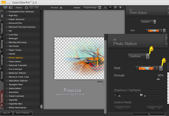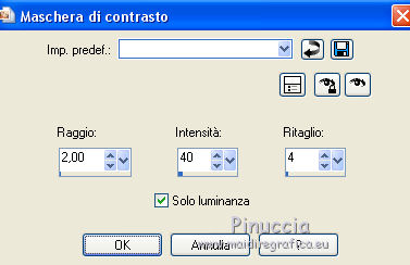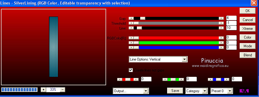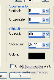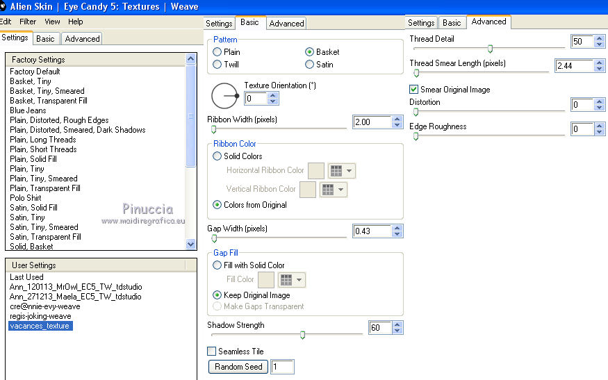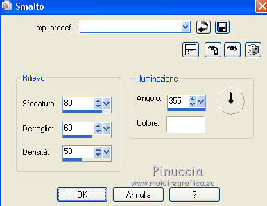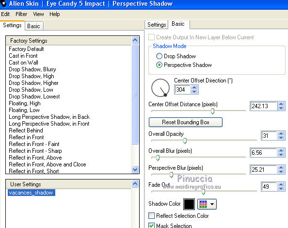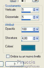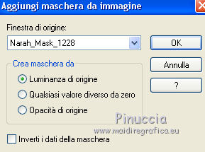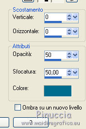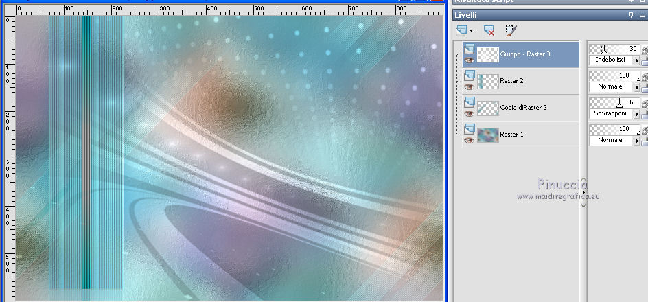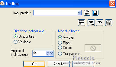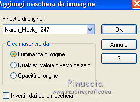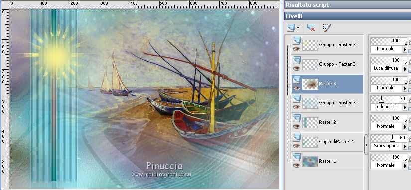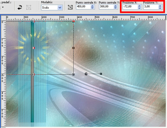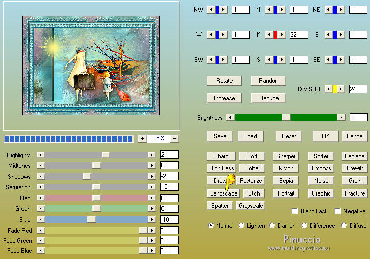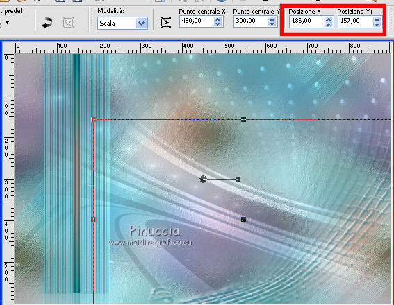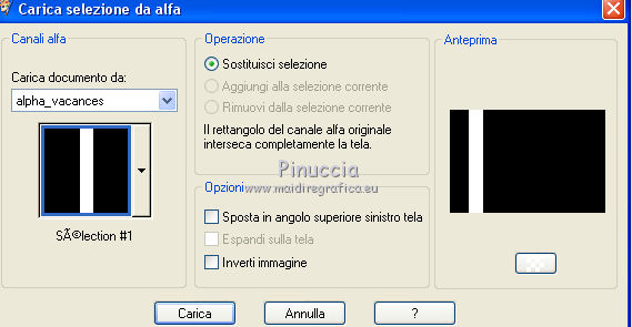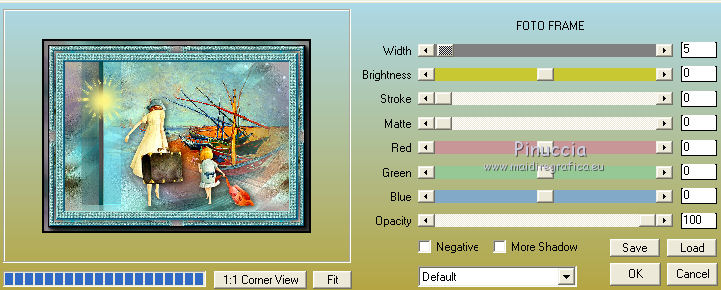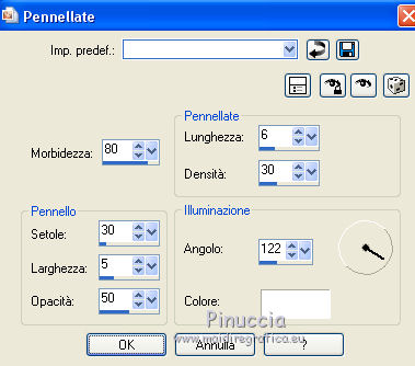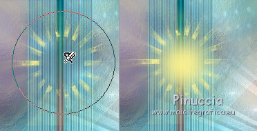 qui puoi trovare qualche risposta ai tuoi dubbi. Se l'argomento che ti interessa non è presente, ti prego di segnalarmelo. Questo tutorial è una creazione di Saturnella e non può essere copiato su altri siti nè essere offerto per il download. Lo stesso vale per la mia traduzione. E' anche proibito togliere il watermark dal materiale; rispettiamo il lavoro dei creatori di tubes, senza i quali non potremmo creare tutorials. Per tradurre questo tutorial, creato con Corel2018, ho usato CorelX7, ma può essere eseguito anche con le altre versioni di PSP. Dalla versione X4, il comando Immagine>Rifletti è stato sostituito con Immagine>Capovolgi in orizzontale, e il comando Immagine>Capovolgi con Immagine>Capovolgi in verticale. Nelle versioni X5 e X6, le funzioni sono state migliorate rendendo disponibile il menu Oggetti. Nel nuovo X7 sono tornati i comandi Immagine>Rifletti e Immagine>Capovolgi, ma con nuove funzioni. Vedi la scheda sull'argomento qui Occorrente: Materiale qui Per il tube del personaggio e per l'immagine di sfondo grazie Mtfp e JHanna. Per le maschere grazie Narah. Il tube del paesaggio è di Saturnella. (in questa pagina trovi i links ai loro siti). Filtri in caso di dubbi, ricorda di consultare la mia sezione filtri qui Filters Unlimited 2.0 qui AP 01 Innovations - Lines SilverLining qui Toadies - What are you qui Graphics Plus - Horizontal Mirror, Vertical Mirror, Quick Tile I qui Nik Software - Color Efex Pro qui Alien Skin Eye Candy 5 Impact - Perspective Shadow qui Alien Skin Eye Candy 5 Textures - Weave qui AAA Frames - Foto Frame /AAA Filters - Custom qui I filtri Graphics Plus e Toadies si possono usare da soli o importati in Filters Unlimited (come fare vedi qui) Se un filtro fornito appare con questa icona ![]() non esitare a cambiare modalità di miscelatura e opacità secondo i colori utilizzati. Nelle ultime versioni di PSP non c'è il gradiente di primo piano/sfondo (Corel_06_029) Puoi usare i gradienti delle versioni precedenti. Trovi qui i gradienti Corel X. Metti i presets Cliccando sul file una o due volte (a seconda delle tue impostazioni), automaticamente il preset si installerà nella cartella corretta. perchè uno o due clic vedi qui Se preferisci, puoi importare direttamente il preset nel corso del tutorial Come fare vedi la scheda del filtro Eye Candy qui 1. Imposta il colore di primo piano con il colore scuro #006d8f, e il colore di sfondo con il colore chiaro #98d4dc. ![]() Passa il colore di prmio piano a Gradiente di primo piano/sfondo, stile Sprazzo di luce. ![]() Apri alpha_vacances. Finestra>Duplica (o sulla tastiera maiuscola+D) per fare una copia. ![]() Chiudi l'originale. La copia, che sarà la base del tuo lavoro, non è vuota, ma contiene una selezione salvata sul canale alfa. 2. Selezione>Seleziona tutto. Apri l'immagine di sfondo di JHanna e vai a Modifica>Copia. Torna al tuo lavoro e vai a Modifica>Incolla nella selezione. Selezione>Deseleziona. 3. Effetti>Effetti di immagine>Motivo unico, con i settaggi standard. ![]() 4. Regola>Sfocatura>Sfocatura gaussiana - raggio 20 ![]() 5. Effetti>Effetti tecniche di disegno>Pennellate. ![]() 6. La selezione sélection#1 è subito disponibile. Devi soltanto cliccare Carica. ![]() Livelli>Nuovo livello raster. Riempi la selezione con il gradiente.7. Effetti>Plugins>AP 01 Innovations - Lines SilverLining. ![]() Selezione>Deseleziona. 8. Effetti>Plugins>Toadies - What are you. ![]() Effetti>Effetti di bordo>Aumenta. 9. Livelli>Duplica. Livelli>Disponi>Sposta giù. Effetti>Effetti geometrici>Inclina. ![]() 10. Effetti>Effetti di immagine>Motivo unico. ![]() Cambia la modalità di miscelatura di questo livello in Sovrapponi, o altro, e abbassa l'opacità al 60%. 11. Attiva il livello superiore. Effetti>Effetti 3D>Sfalsa ombra, con il tuo colore scuro. ![]() 12. Livelli>Nuovo livello raster. Imposta il colore di primo piano con il colore bianco. ![]() Riempi il livello con il colore bianco.Livelli>Nuovo livello maschera>Da immagine. Apri il menu sotto la finestra di origine e vedrai la lista dei files aperti. Seleziona la maschera Narah_Mask_0977. ![]() Immagine>Rifletti. Regola>Messa a fuoco>Metti a fuoco. Livelli>Unisci>Unisci gruppo. Cambia la modalità di miscelatura di questo livello in Indebolisci, o altro, e abbassa l'opacità al 30%. ![]() 13. Effetti>Effetti 3D>Sfalsa ombra, colore scuro. ![]() 14. Livelli>Nuovo livello raster. Riempi con il colore bianco.Livelli>Nuovo livello maschera>Da immagine. Apri il menu sotto la finestra di origine e seleziona la maschera Narah_Mask_1247. ![]() Livelli>Unisci>Unisci gruppo. 15. Effetti>Effetti 3D>Sfalsa ombra, con i settaggi precedenti. 16. Immagine>Ridimensiona, all'80%, tutti i livelli non selezionato. Sulla tastiera tasto K per attivare lo strumento Puntatore ![]() e imposta Posizione X: 186,00 e Posizione Y: 156,00. ![]() Cambia la modalità di miscelatura di questo livello in Luce diffusa, o altro. 17. Imposta il colore di primo piano con il colore #fcf392. ![]() Livelli>Nuovo livello raster. Riempi con il colore di primo piano.Livelli>Nuovo livello maschera>Da immagine. Apri il menu sotto la finestra di origine e seleziona la maschera Narah_Mask_1228. ![]() Livelli>Unisci>Unisci gruppo. Immagine>Ridimensiona, al 50%, tutti i livelli non selezionato. Strumento Puntatore ![]() e imposta Posizione X: -72,00 e Posizione Y: 3,00. ![]() 18. Livelli>Nuovo livello raster. Attiva lo strumento Aerografo con i seguenti settaggi:![]() Con il colore di primo piano dai un colpo molto dolce al centro della maschera, come nell'esempio ![]() 19. Apri il tube del paesaggio, cancella la firma. Immagine>Rifletti. Modifica>Copia. Torna al tuo lavoro e vai a Modifica>Incolla come nuovo livello. Sposta il tube un po' più in alto e a destra.Livelli>Disponi>Sposta giù - 2 volte. ![]() Effetti>Plugins>Nik Software - Color Efex - Photo Stylizer. ![]() 20. Apri il tube del personaggio e vai a Modifica>Copia. Torna al tuo lavoro e vai a Modifica>Incolla come nuovo live