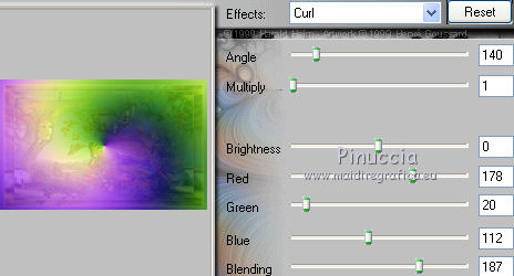 qui puoi trovare qualche risposta ai tuoi dubbi. Se l'argomento che ti interessa non è presente, ti prego di segnalarmelo. Questo tutorial è una creazione di Saturnella e non può essere copiato su altri siti nè essere offerto per il download. Lo stesso vale per la mia traduzione. E' anche proibito togliere il watermark dal materiale; rispettiamo il lavoro dei creatori di tubes, senza i quali non potremmo creare tutorials. Il tutorial è stato creato con PSP12, ma può essere eseguito anche con le altre versioni. Per tradurlo, ho usato PSP X. Occorrente: Materiale qui Il tube del paesaggio è di kTs. Le immagini sono di Josephine Walls (in questa pagina trovi i links ai loro siti). Filtri in caso di dubbi, ricorda di consultare la mia sezione filtri qui Plugins Galaxy qui Nik Software Color Efex qui Mura's Seamless - Tiling with shrink qui Bordermania - Frame#2 qui Graphics Plus - Cross Shadow qui Filters Unlimited 2.0 qui ![]() non esitare a cambiare modalità di miscelatura e opacità secondo i colori utilizzati. Metti la maschera nella cartella Maschere. 1. Imposta il colore di primo piano con #eacfd4, e il colore di sfondo con #a38baf. ![]() 2. Apri una nuova immagine trasparente 900 x 550 pixels, e riempila con il colore scuro di sfondo.3. Livelli>Nuovo livello raster. Selezione>Seleziona tutto. 4. Apri il tube del paesaggio di kTs e vai a Modifica>Copia. Torna al tuo lavoro e vai a Modifica>Incolla nella selezione. Selezione>Deseleziona. 5. Effetti>Effetti di immagine>Motivo unico, con i settaggi standard. ![]() 6. Apri l'immagine butterfly_tree di Josephine Wall. Livelli>Carica/Salva maschera>Carica maschera da disco. Cerca e carica la maschera 20-20. ![]() Livelli>Unisci>Unisci gruppo. 7. Modifica>Copia. Torna al tuo lavoro e vai a Modifica>Incolla come nuovo livello. Immagine>Ridimensiona, al 120%, tutti i livelli non selezionato. Regola>Messa a fuoco>Accentua messa a fuoco. Sposta l'immagine a sinistra, non troppo vicino al bordo.8. Livelli>Unisci>Unisci tutto. 9. Immagine>Aggiungi bordatura, 2 pixels, simmetriche, con il colore chiaro. 10. Livelli>Duplica. Immagine>Ridimensiona, al 90%, tutti i livelli non selezionato. 11. Effetti>Effetti 3D>Sfalsa ombra. ![]() Ripeti l'Effetto Sfalsa ombra, cambiando verticale e orizzontale con 3. ![]() 12. Attiva il livello di sfondo. Effetti>Plugins>Plugin Galaxy - Bluuur. ![]() 13. Effetti>Plugins>Plugin Galaxy - Noiseee. ![]() 14. Effetti>Plugins>Nik Software - Color Efex Pro. ![]() Ripeti l'Effetto una seconda volta. 15. Apri l'immagine up_and_away di Josephine Wall. Livelli>Carica/Salva maschera>Carica maschera da disco. Carica la maschera 20-20. ![]() Livelli>Unisci>Unisci gruppo. Modifica>Copia. Torna al tuo lavoro e vai a Modifica>Incolla come nuovo livello. Sposta l'immagine a destra, come nel mio esempio,o come preferisci. Per il mio esempio, ho duplicato il livello e unito i due livelli. 16. Effetti>Effetti di illuminazione>Punti luce. in alcune versioni di PSP, quando si digita il settaggio della Direzione in tre cifre, sono visibili soltanto le ultime due. ![]() 17. Livelli>Unisci>Unisci tutto. 18. Immagine>Aggiungi bordatura, 2 pixels, simmetriche, con il colore chiaro. Immagine>Aggiungi bordatura, 20 pixels, simmetriche, con il colore scuro. Seleziona questo bordo con la bacchetta magica ![]() 19. Effetti>Plugins>Plugin Galaxy - Rainbow se stai usando altri colori, gioca con i valori red, green e blue per adattarli ai tuoi colori ![]() 20. Regola>Aggiungi/Rimuovi disturbo>Aggiungi disturbo. ![]() 20. Effetti>Effetti 3D>Smusso a incasso. ![]() 21. Effetti>Effetti 3D>Ritaglio. ![]() Selezione>Deseleziona. 22. Immagine>Aggiungi bordatura, 40 pixels, simmetriche, con il colore scuro. Seleziona questo bordo con la bacchetta magica ![]() Passa il colore di primo piano a Gradiente, stile Lineare. ![]() Riempi la selezione con il gradiente.23. Effetti>Plugins>Mura's Seamless - Tiling with shrink. ![]() Selezione>Inverti. 24. Effetti>Effetti 3D>Sfalsa ombra. ![]() Modifica>Ripeti Sfalsa ombra. Selezione>Deseleziona. 25. Effetti>Plugins>Bordermania - Frame#2. ![]() 26. Immagine>Aggiungi bordatura, 1 pixel, simmetriche, con il colore nero. 26. Effetti>Plugins>Filters Unlimited 2.0 - Graphics Plus - Cross Shadow. Raramente vedo usare questo filtro importato in Filters Unlimited. Solitamente viene applicato da solo. La differenza nei due usi è che Unlimited non tiene in memoria i settaggi. ![]() Aggiungi il tuo nome e/o il tuo watermark su un nuovo livello. Livelli>Unisci>Unisci tutto. 27. Immagine>Ridimensiona, a 900 pixels di larghezza, tutti i livelli selezionato. Regola>Messa a fuoco>Metti a fuoco. Salva in formato jpg. ![]() Se hai problemi o dubbi, o trovi un link non funzionante, o anche soltanto per dirmi che ti è piaciuto, scrivimi. 12 Maggio 2012 |