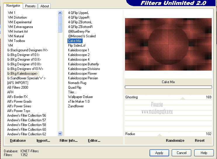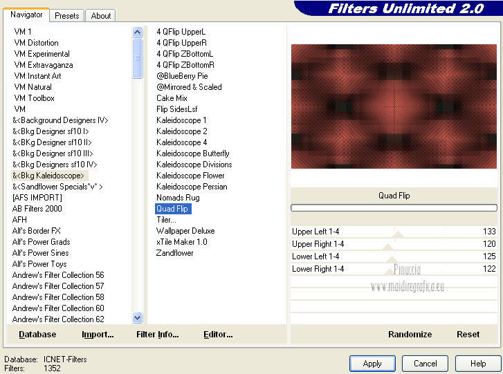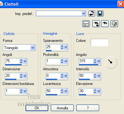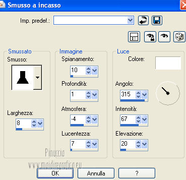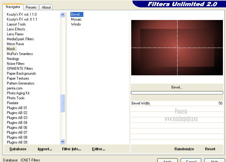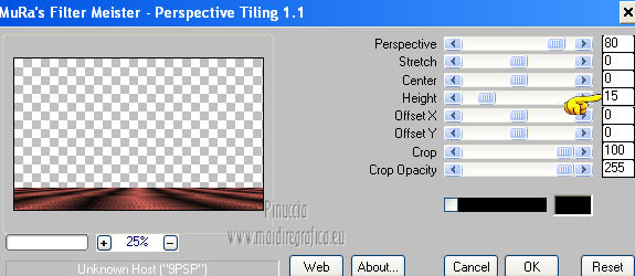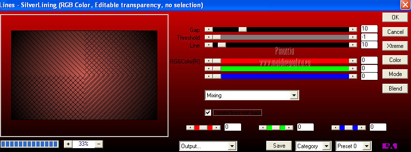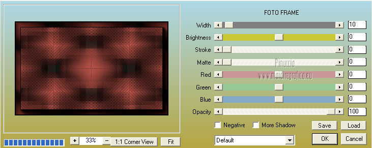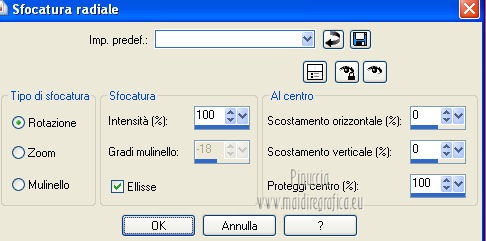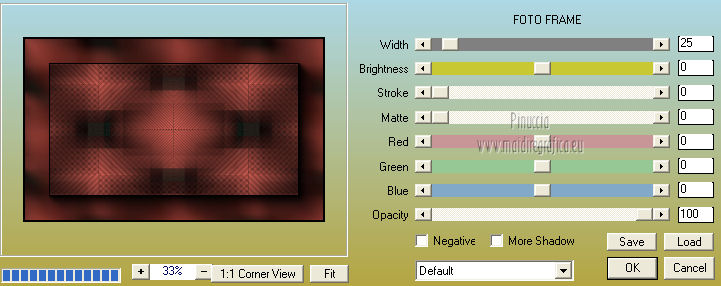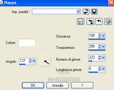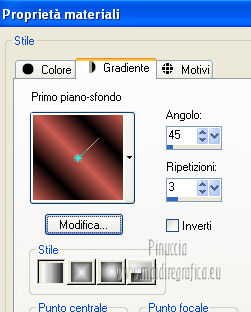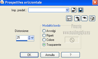 qui puoi trovare qualche risposta ai tuoi dubbi. Se l'argomento che ti interessa non è presente, ti prego di segnalarmelo. Questo tutorial è una creazione di Saturnella e non può essere copiato su altri siti nè essere offerto per il download. Lo stesso vale per la mia traduzione. E' anche proibito togliere il watermark dal materiale; rispettiamo il lavoro dei creatori di tubes, senza i quali non potremmo creare tutorials. Questo tutorial è stato creato con PSP 12, ma può essere eseguito anche con le altre versioni di PSP. Per tradurlo ho usato PSP X. Occorrente: Materiale qui Il tube del paesaggio è di Anny. Grazie a tutti per il vostro magnifico lavoro. (in questa pagina trovi i links ai loro siti). Filtri in caso di dubbi, ricorda di consultare la mia sezione filtri qui Mock - Bevel qui AP 01 [Innovations] - Lines SilverLining qui Filters Unlimited 2.0 qui &<Bkg Kaleidoscope> - Cake mix, Quad flip (da importare in Unlimited) qui Mura's Meister - Perspective Tiling qui AAA Frames - Foto Frame qui Alien Skin Eye Candy 5 Impact - Glass qui ![]() non esitare a cambiare modalità di miscelatura e opacità secondo i colori utilizzati. Metti la selezione nella cartella Selezioni. 1. Imposta il colore di primo piano con #cc5c51, e il colore di sfondo con il colore nero. ![]() Passa il colore di primo piano a Gradiente, stile Lineare. ![]() Apri una nuova immagine trasparente 900 x 550 pixels, e riempila con il gradiente.2. Effetti>Plugins>AP 01 [Innovations] - Lines SilverLining. ![]() 3. Livelli>Duplica. Effetti>Plugins>Filters Unlimited 2.0 - Mock - Bevel. ![]() 4. Immagine>Ridimensiona, all'85%, tutti i livelli non selezionato. 5. Effetti>Effetti 3D>Sfalsa ombra. ![]() 6. Effetti>Effetti di immagine>Motivo unico. ![]() 7. Effetti>Effetti 3D>Sfalsa ombra, con i settaggi precedenti. 8. Effetti>Plugins>&<Bkg Kaleidoscope> - Cake mix. ![]() 9. Effetti>Plugins>&<Bkg Kaleidoscope> - Quad flip. ![]() 10. Livelli>Unisci>Unisci visibile. Livelli>Duplica. Immagine>Ridimensiona, all'80%, tutti i livelli non selezionato. 11. Effetti>Effetti geometrici>Prospettiva orizzontale. ![]() 12. Selezione>Seleziona tutto. Selezione>Mobile. Selezione>Immobilizza. Selezione>Modifica>Seleziona bordature selezione. ![]() 13. Livelli>Nuovo livello raster. Cambia i settaggi del gradiente in stile Lineare. ![]() Riempi la selezione con il gradiente.14. Effetti>Effetti 3D>Smusso a incasso. ![]() Selezione>Deseleziona. Livelli>Unisci>Unisci giù. 15. Effetti>Plugins>Alien Skin Eye Candy 5 Impact - Perspective Shadow, seleziona il preset Drop Shadow,Blurry e ok. ![]() 16. Attiva il livello di sfondo. Effetti>Plugins>AAA Frames - Foto Frame. ![]() Di nuovo Effetti>Plugins>AAA Frames - Foto Frame. ![]() 17. Livelli>Unisci>Unisci visibile. 18. Livelli>Nuovo livello raster. Selezione>Carica/Salva selezione>Carica selezione da disco. Cerca e carica la selezione sat_callme1. ![]() Riempi la selezione con il gradiente lineare.19. Effetti>Effetti di trama>Ciottoli. ![]() Selezione>Deseleziona. 20. Effetti>Plugins>Mura's Meister - Perspective Tiling. ![]() 21. Apri il tube del paesaggio di Anny e vai a Modifica>Copia. Torna al tuo lavoro e vai a Modifica>Incolla come nuovo livello. 22. Apri il tube di Betty Boop e vai a Modifica>Copia. Torna al tuo lavoro e vai a Modifica>Incolla come nuovo livello. Immagine>Rifletti. Sposta il tube in basso a sinistra.![]() 23. Effetti>Effetti 3D>Sfalsa ombra, con i settaggi precedenti. ![]() 24. Apri il file di testo e vai a Modifica>Copia. Torna al tuo lavoro e vai a Modifica>Incolla come nuovo livello. 25. Livelli>Unisci>Unisci tutto. Modifica>Copia. 26. Immagine>Aggiungi bordatura, 2 pixels, simmetriche, con il colore nero. Immagine>Aggiungi bordatura, 30 pixels, simmetriche, con il colore chiaro. Immagine>Aggiungi bordatura, 1 pixel, simmetriche, con il colore nero. Immagine>Aggiungi bordatura, 20 pixels, simmetriche, con il colore chiaro. 27. Seleziona i due bordi chiari con la bacchetta magica ![]() Livelli>Nuovo livello raster. Modifica>Incolla nella selezione. 28. Regola>Sfocatura>Sfocatura radiale. ![]() 29. Effetti>Effetti di trama>Nappa. ![]() 30. Selezione>Inverti. Effetti>Effetti 3D>Sfalsa ombra. ![]() Modifica>Ripeti Sfalsa ombra. Selezione>Deseleziona. 31. Immagine>Aggiungi bordatura, 1 pixel, simmetriche, con il colore nero. Immagine>Aggiungi bordatura, 15 pixels, simmetriche, con il colore bianco. 32. Seleziona il bordo bianco con la bacchetta magica ![]() Selezione>Inverti. Effetti>Effetti 3D>Sfalsa ombra, con i settaggi precedenti. Selezione>Deseleziona. 33. Immagine>Aggiungi bordatura, 1 pixel, simmetriche, con il colore nero. Aggiungi il tuo nome e/o il tuo watermark su un nuovo livello. Livelli>Unisci>Unisci tutto. Immagine>Ridimensiona, a 900 pixels di larghezza, tutti i livelli selezionato. Salva in formato jpg. Per questo esempio ho usato tubes di ClaudiaViza e Sharlimar. ![]() ![]() Se hai problemi o dubbi, o trovi un link non funzionante, o anche soltanto per dirmi che ti è piaciuto, scrivimi. 31 Gennaio 2013 |