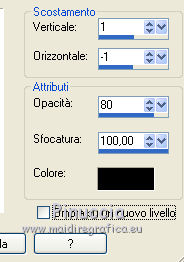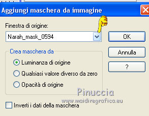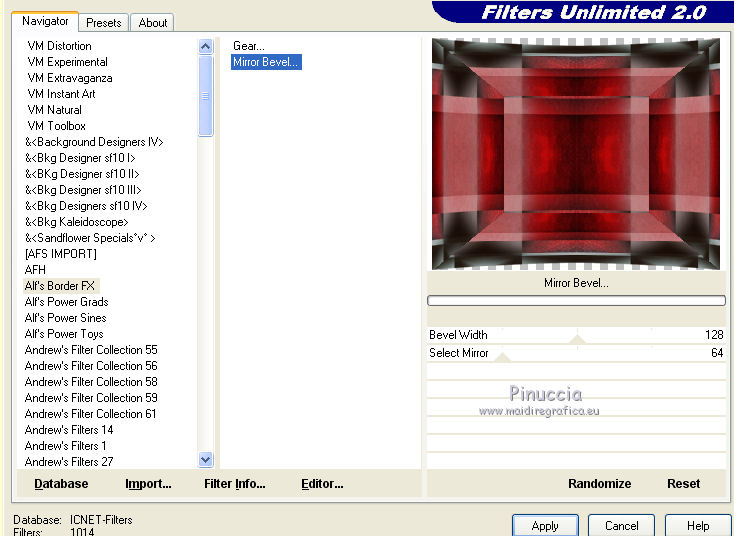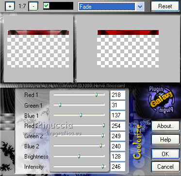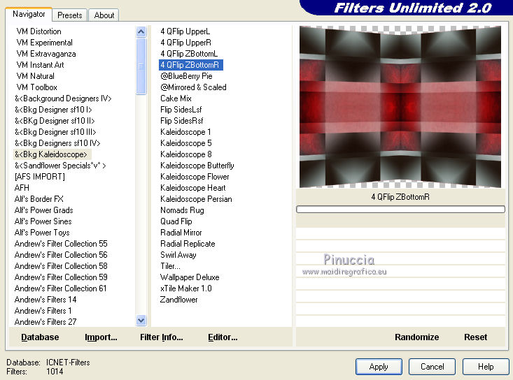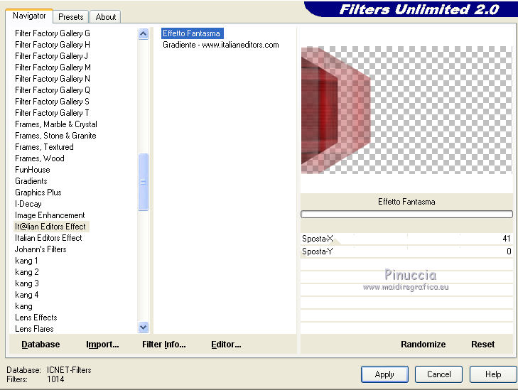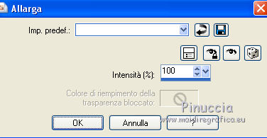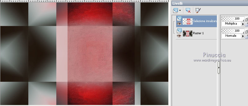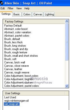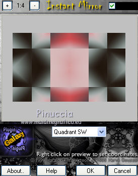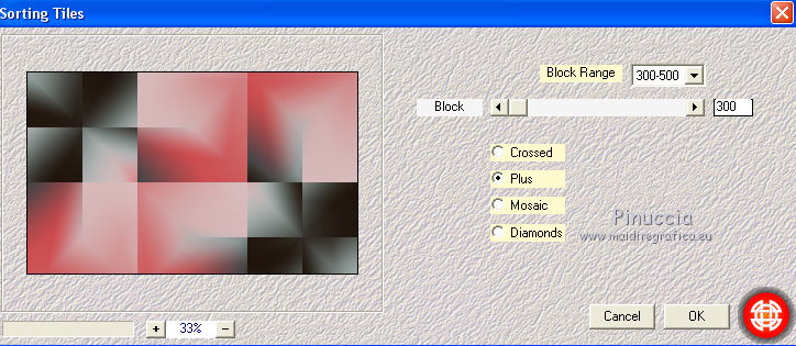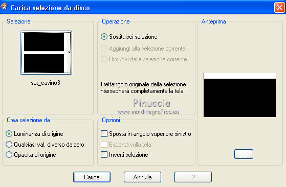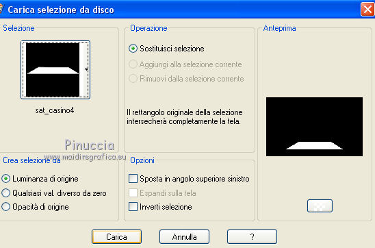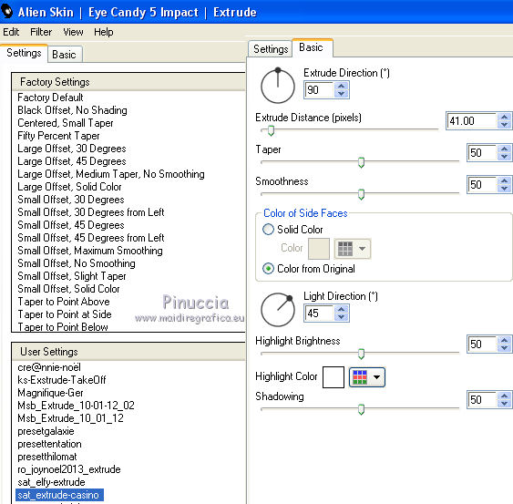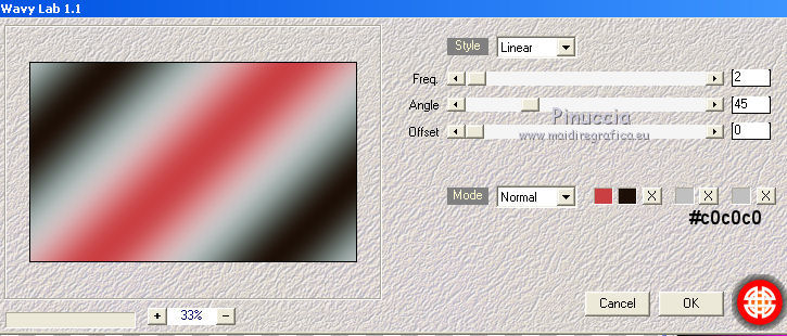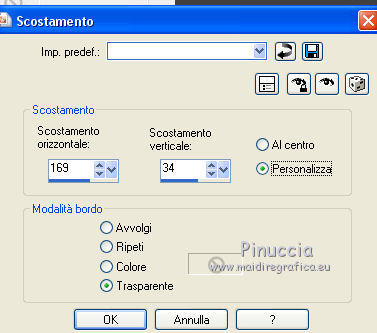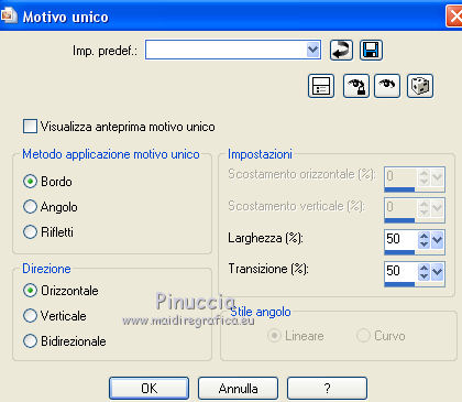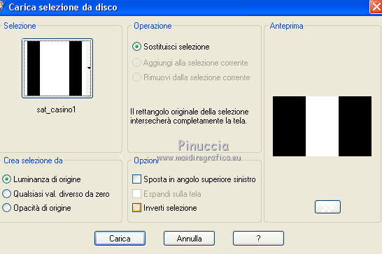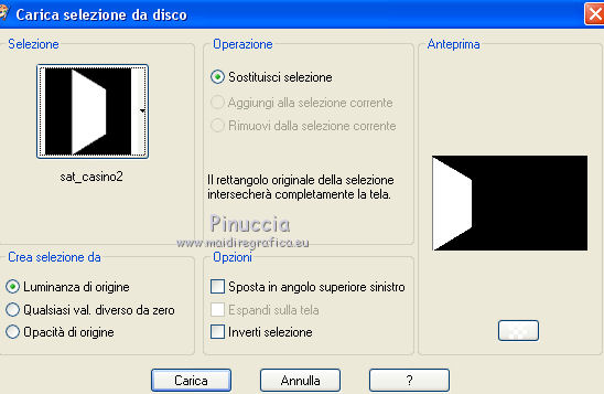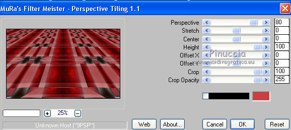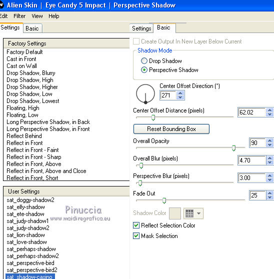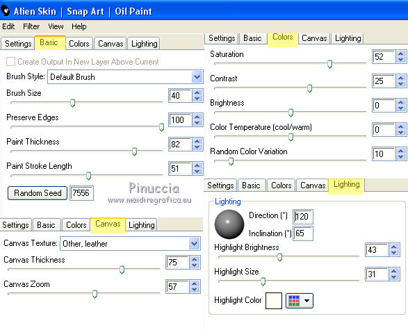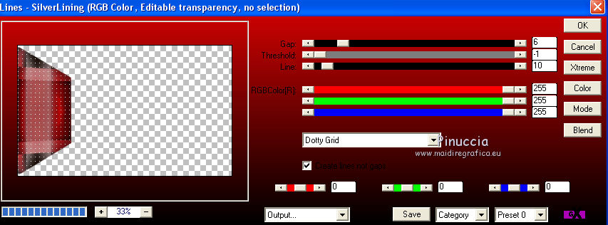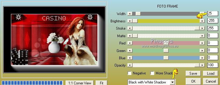 qui puoi trovare qualche risposta ai tuoi dubbi. Se l'argomento che ti interessa non è presente, ti prego di segnalarmelo. Questo tutorial è una creazione di Saturnella e non può essere copiato su altri siti nè essere offerto per il download. Lo stesso vale per la mia traduzione. E' anche proibito togliere il watermark dal materiale; rispettiamo il lavoro dei creatori di tubes, senza i quali non potremmo creare tutorials. Il tutorial è stato scritto con CorelX15, ma può essere eseguito anche con le altre versioni di PSP. Secondo la versione utilizzata (anteriore a PSP X) potresti ottenere dei risultati differenti. Vedi la mia scheda riguardante le funzioni Rifletti>Capovolgi nelle nuove versioni di PSP qui Per tradurre questo tutorial ho usato PSP X. Occorrente: Materiale qui Grazie per i tubes AnaRidzi, Guismo, Athe. Per la maschera grazie Narah. (in questa pagina trovi i links ai loro siti). Filtri in caso di dubbi, ricorda di consultare la mia sezione filtri qui Filters Unlimited 2.0 qui Plugin Galaxy - Instant Mirror, Colorize qui Alien Skin Snap Art - Oil Paint qui Mehdi - Sorting Tiles qui Mehdi - Wavy Lab 1.1 qui &<Bkg Kaleidoscope> - 4QFlip ZBottomR qui AP 01 [Innovations] - Lines SilverLining qui Alien Skin Eye Candy 5 Impact - Perspective Shadow qui Mura's Meister - Perspective Tiling qui Alf's Border FX - Mirror Bevel qui It@lian Editors Effect - Effetto Fantasma qui AAA Frames - Foto Frame qui ![]() non esitare a cambiare modalità di miscelatura e opacità secondo i colori utilizzati. Metti i preset Alien Skin Snap art>Settings>Oil Paint. Cliccando sul file una o due volte (a seconda delle tue impostazioni), automaticamente il preset si installerà nella cartella corretta. perchè uno o due clic vedi qui Metti le selezioni nella cartella Selezioni. 1. Imposta il colore di primo piano con il colore chiaro #1c0f07, e il colore di sfondo con il colore scuro #ca3f42. ![]() Apri una nuova immagine trasparente 900 x 550 pixels. 2. Effetti>Plugins>Mehdi - Wavy Lab 1.1 Questo filtro lavora con i colori della paletta materiali. Il primo è il colore di sfondo, il secondo quello di primo piano. Cambia gli ultimi due colori con #c0c0c0. ![]() 3. Regola>Sfocatura>Sfocatura gaussiana - raggio 30. ![]() 4. Effetti>Plugins>Mehdi - Sorting Tiles. ![]() 5. Effetti>Plugins>The Plugins Site - Instant Mirror ![]() 6. Selezione>Carica/Salva selezione>Carica selezione da disco. Cerca e carica la selezione sat_casino1. ![]() Selezione>Innalza selezione a livello. 7. Effetti>Plugins>Alien Skin Snap Art - Oil paint seleziona il preset sat-snap art e ok. ![]() In caso di problemi con il preset, puoi copiare i settaggi che vedi nella schermata. ![]() Selezione>Deseleziona. 8. Effetti>Effetti di immagine>Motivo unico. ![]() Cambia la modalità di miscelatura di questo livello in Moltiplica, o secondo i tuoi colori. ![]() Livelli>Duplica. Immagine>Rifletti. Livelli>Unisci>Unisci visibile. 9. Livelli>Duplica. Imagine>Ruota per gradi - 90 gradi a sinistra. ![]() 10. Immagine>Ridimensiona, all'85%, tutti i livelli non selezionato. 11. Effetti>Effetti geometrici>Prospettiva orizzontale. ![]() 12. Effetti>Effetti di immagine>Scostamento. ![]() 13. Premi il tasto K per attivare lo strumento Puntatore ![]() se stai usando PSP 9 il tasto D per attivare lo strumento Deformazione ![]() in modalità Scala, spingi il nodo centrale a destra verso l'interno fino a 450 pixels. ![]() 14. Livelli>Duplica. Immagine>Rifletti. Livelli>Unisci>Unisci giù. Regola>Messa a fuoco>Metti a fuoco. 15. Effetti>Plugins>Filters Unlimited 2.0 - &<Bkg Kaléïdoscope> - 4Q Flip ZBottomR ![]() 16. Effetti>Effetti di distorsione>Allarga (nelle versioni più recenti "Espansione"). ![]() 17. Effetti>Plugins>Filters Unlimited 2.0 - Alf’s Border Fx - Mirror bevel, con i settaggi standard. ![]() Livelli>Unisci>Unisci visibile. 18. Selezione>Carica/Salva selezione>Carica selezione da disco. Cerca e carica la selezione sat_casino2. ![]() Selezione>Innalza selezione a livello. Selezione>Deseleziona. 19. Effetti>Plugins>AP 01 [Innovations] - Lines SilverLining. ![]() 20. Effetti>Plugins>Filters Unlimited 2.0 - It@lian Editors Effect - Effetto Fantasma. ![]() Cambia la modalità di miscelatura di questo livello in Luce netta, o secondo i tuoi colori, e abbassa l'opacità al 60%. ![]() 21. Livelli>Duplica. Immagine>Rifletti. Livelli>Unisci>Unisci giù. Lascia la modalità di miscelatura di questo livello in Luce netta, opacità 100. 22. Effetti>Effetti 3D>Sfalsa ombra, colore nero. ![]() 23. Apri il tube deco1 e vai a Modifica>Copia. Torna al tuo lavoro e vai a Modifica>Incolla come nuovo livello. Non spostarlo. E' al suo posto e in modalità di miscelatura Indebolisci. 24. Attiva il livello di sfondo. Selezione>Carica/Salva selezione>Carica selezione da disco. Cerca e carica la selezione sat_casino3. ![]() Selezione>Innalza selezione a livello. 25. Effetti>Plugins>The Plugin Site - Coolorize. ![]() Selezione>Deseleziona. Livelli>Disponi>Porta in alto. 26. Effetti>Plugins>Alien Skin Eye Candy 5 Impact - Perspective Shadow. Seleziona il preset sat_shadow-casino e ok. ![]() Cambia la modalità di miscelatura di questo livello in Luce netta, o secondo i tuoi colori. 27. Attiva nuovamente il livello di sfondo. Selezione>Carica/Salva selezione>Carica selezione da disco. Cerca e carica la selezione sat_casino4. ![]() Selezione>Innalza selezione a livello. Selezione>Deseleziona. 28. Effetti>Plugins>Alien Skin Eye Candy 5 Impact - Extrude. Seleziona il preset sat_extrude-casino e ok. ![]() 29. Effetti>Effetti 3D>Sfalsa ombra. ![]() Livelli>Duplica. Livelli>Disponi>Porta in alto. Effetti>Plugins>Mura's Meister - Perspective Tiling. ![]() 31. Premi il tasto K/D per attivare lo strumento Puntatore /Deformazione ![]() in modalità Scala, spingi il nodo superiore centrale verso l'interno fino a 450 pixels. ![]() 32. Effetti>Effetti 3D>Sfalsa ombra. ![]() 33. Livelli>Nuovo livello raster. Imposta il colore di primo piano con il colore bianco #ffffff, e ri