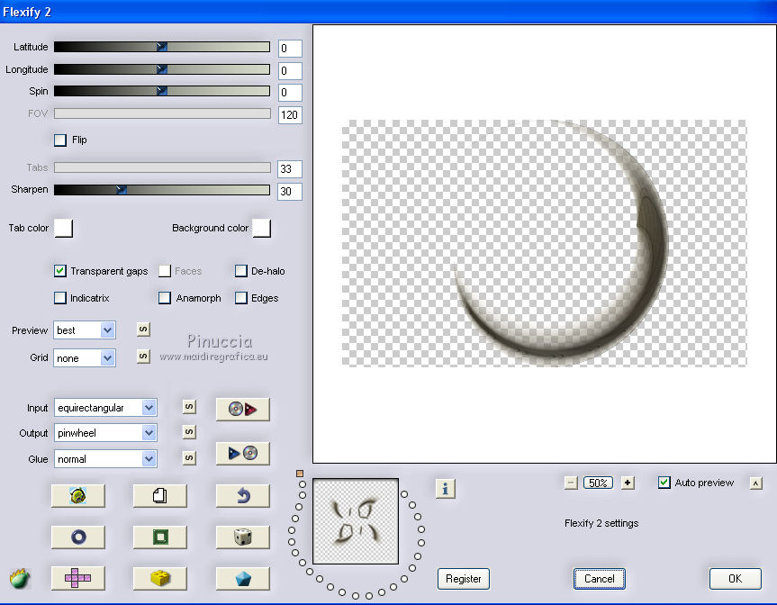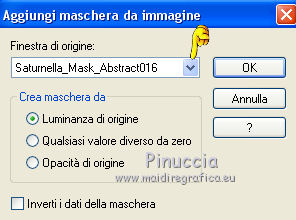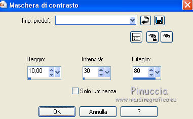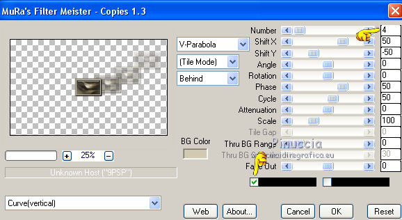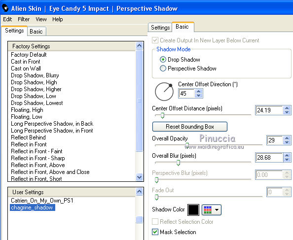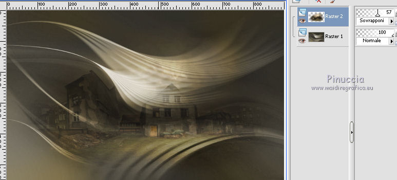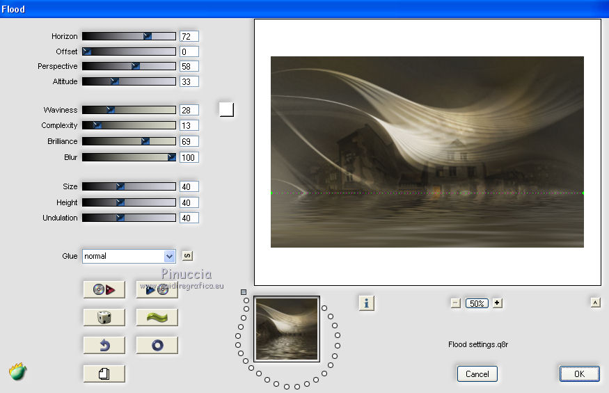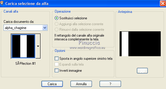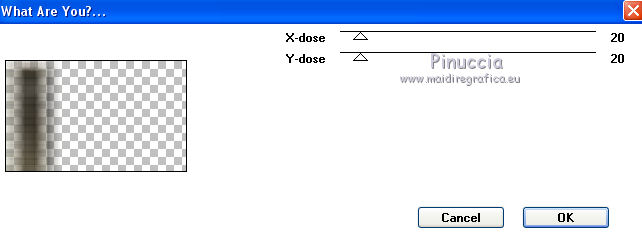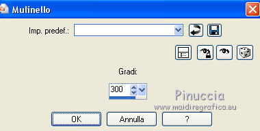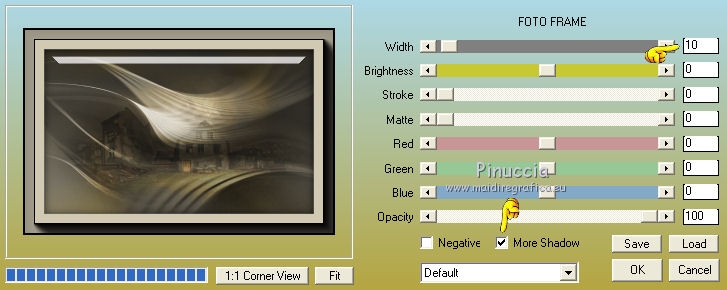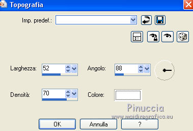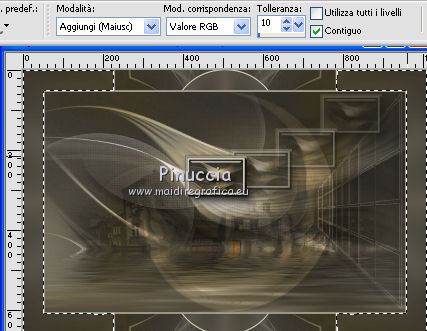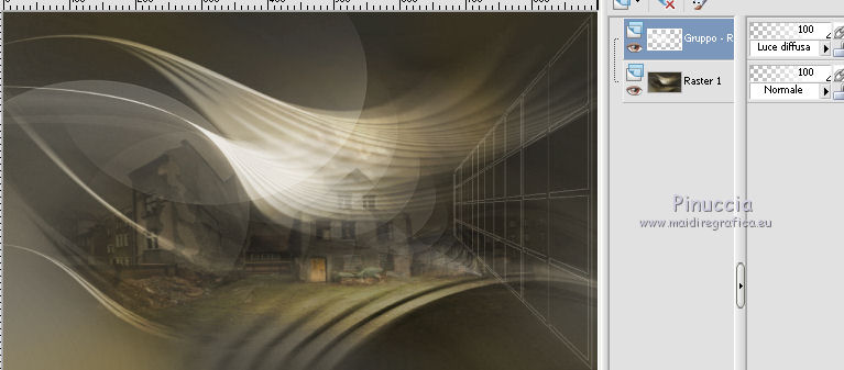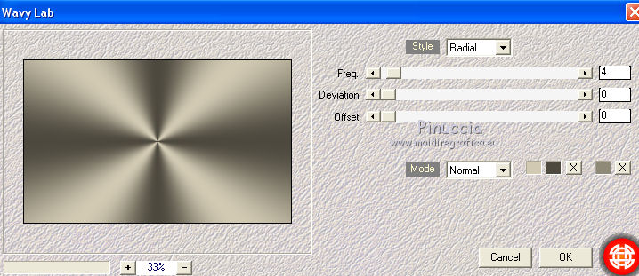 qui puoi trovare qualche risposta ai tuoi dubbi. Se l'argomento che ti interessa non è presente, ti prego di segnalarmelo. Questo tutorial è una creazione di Saturnella e non può essere copiato su altri siti nè essere offerto per il download. Lo stesso vale per la mia traduzione. E' anche proibito togliere il watermark dal materiale; rispettiamo il lavoro dei creatori di tubes, senza i quali non potremmo creare tutorials. Per tradurre questo tutorial, creato con PSP18, ho usato CorelX, ma può essere eseguito anche con le altre versioni di PSP. Dalla versione X4, il comando Immagine>Rifletti è stato sostituito con Immagine>Capovolgi in orizzontale, e il comando Immagine>Capovolgi con Immagine>Capovolgi in verticale. Nelle versioni X5 e X6, le funzioni sono state migliorate rendendo disponibile il menu Oggetti. Nel nuovo X7 sono tornati i comandi Immagine>Rifletti e Immagine>Capovolgi, ma con nuove funzioni. Vedi la scheda sull'argomento qui Occorrente: Materiale qui Grazie per i tubes Yoka e Guismo. (in questa pagina trovi i links ai loro siti). Filtri in caso di dubbi, ricorda di consultare la mia sezione filtri qui Filters Unlimited 2.0 qui Flaming Pear - Flexify 2 qui Flaming Pear - Flood qui Mehdi - Wavy Lab qui Ap [Lines] - Lines SilverLining qui Toadies - Ommadawn, What are you qui Alien Skin Eye Candy 5 Impact - Perspective Shadow, Glass qui Mura's Meister - Copies qui AAA Frames - Foto Frame qui I filtri Toadies si possono usare da soli o importati in Filters Unlimited (come fare vedi qui) Se un filtro fornito appare con questa icona ![]() non esitare a cambiare modalità di miscelatura e opacità secondo i colori utilizzati. Nelle ultime versioni di PSP non c'è il gradiente di primo piano/sfondo (Corel_06_029) Trovi i gradienti delle versioni precedenti qui Metti i preset Cliccando sul file una o due volte (a seconda delle tue impostazioni), automaticamente il preset si installerà nella cartella corretta. perchè uno o due clic vedi qui 1. Imposta il colore di primo piano con il colore scuro #4d493e, e il colore di sfondo con il colore chiaro #d1c9b2. ![]() Apri alpha_chagrine. Finestra>Duplica o sulla tastiera maiuscola+D per fare una copia. ![]() Chiudi l'originale. La copia, che sarà la base del tuo lavoro, non è vuota, ma contiene una selezione salvata sul canale alfa. 2. Effetti>Plugins>Mehdi - Wavy Lab. questo filtro lavora con i colori della paletta: il primo è il colore di sfondo, il secondo quello di primo piano, mantieni l'ultimo colore creato dal filtro. ![]() 3. Effetti>Effetti di distorsione>Mulinello. ![]() 4. Regola>Sfocatura>Sfocatura gaussiana - raggio 30. ![]() 5. Livelli>Nuovo livello raster. Selezione>Seleziona tutto. Apri l'immagine "2", e vai a Modifica>Copia. Torna al tuo lavoro e vai a Modifica>Incolla nella selezione. Selezione>Deseleziona. Cambia la modalità di miscelatura di questo livello in Luminanza. Livelli>Unisci>Unisci giù. 6. Livelli>Nuovo livello raster. Selezione>Seleziona tutto. Apri il tube del paesaggio di Guismo e vai a Modifica>Incolla nella selezione. Selezione>Deseleziona. Cambia la modalità di miscelatura di questo livello in Sovrapponi, e abbassa l'opacità al 57%. ![]() Livelli>Unisci>Unisci giù. 7. Finestra>Duplica, e rimani su questa copia. Immagine>Ridimensiona, al 30%, tutti i livelli selezionato. Minimizza l'immagine, che userai più tardi. 8. Torna al tuo lavoro. Livelli>Nuovo livello raster. Imposta il colore di primo piano con il colore bianco. Riempi il livello con il colore bianco.Livelli>Nuovo livello maschera>Da immagine. Apri il menu sotto la finestra di origine e vedrai la lista dei files aperti. Seleziona la maschera Saturnella_Mask_Abstract16, con i seguenti settaggi. ![]() Effetti>Effetti di bordo>Aumenta. Livelli>Unisci>Unisci gruppo. Cambia la modalità di miscelatura di questo livello in Luce diffusa, o secondo i tuoi colori. ![]() 9. Effetti>Plugins>AP [Lines] Lines SilverLining. ![]() 10. Effetti>Effetti 3D>Sfalsa ombra. ![]() 11. Attiva il livello di sfondo. Effetti>Plugins>Flaming Pear - Flood. ![]() Livelli>Unisci>Unisci visibile. 12. Attiva l'immagine ridimensionata che hai messo da parte al punto 7. Effetti>Plugins>Alien Skin Eye Candy 5 Impact - Glass. Seleziona il preset chagrine_glass e ok. ![]() Questi i settaggi in caso di problemi con il preset. ![]() 13. Immagine>Aggiungi bordatura, 20 pixels, simmetriche, colore scuro #4d493e. 14. Effetti>Plugins>AAA Frame - Foto Frame. ![]() 15. Modifica>Copia. Torna al tuo lavoro e vai a Modifica>Incolla come nuovo lvello. 16. Immagine>Ridimensiona, al 50%, tutti i livelli non selezionato. 17. Effetti>Plugins>Mura's Meister - Copies. ![]() 18. Effetti>Effetti di immagine>Scostamento. ![]() 19. Effetti>Plugins>Alien Skin Eye Candy 5 Impact - Perspective Shadow. Seleziona il preset Drop shadow blurry e ok. ![]() 20. Attiva il livello di sfondo. Selezione>Carica/Salva selezione>Carica selezione da canale alfa. La selezione sélection#1 è subito disponibile. Devi soltanto cliccare Carica. ![]() Selezione>Innalza selezione a livello. Selezione>Deseleziona. 21. Effetti>Plugins>Toadies - Ommadawn, con i settaggi standard. ![]() 22. Effetti>Plugins>Toadies - What are you, con i settaggi standard. ![]() 23. Effetti>Plugins>Flaming Pear - Flexify 2. ![]() Cambia la modalità di miscelatura di questo livello in Indebolisci, o secondo i tuoi colori. 24. Attiva il livello di sfondo. Modifica>Copia. Livelli>Unisci>Unisci visibile. 25. Immagine>Aggiungi bordatura, 1 pixel, simmetriche, colore scuro #4d493e. Immagine>Aggiungi bordatura, 3 pixels, simmetriche, colore chiaro #d1c9b2. Immagine>Aggiungi bordatura, 1 pixel, simmetriche, colore scuro #4d493e. Immagine>Aggiungi bordatura, 50 pixels, simmetriche, colore bianco. 26. Attiva lo strumento Bacchetta magica ![]() e clicca nel bordo bianco per selezionarlo. Modifica>Incolla nella selezione. 27. Regola>Sfocatura>Sfocatura gaussiana, con i settaggi precedenti. ![]() 28. Effetti>Effetti di riflesso>Caleidoscopio. ![