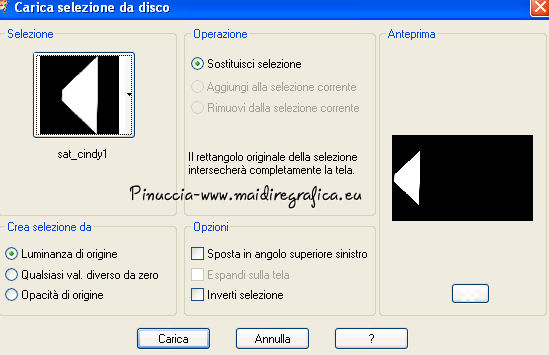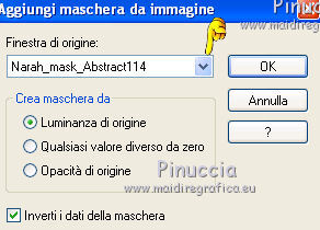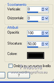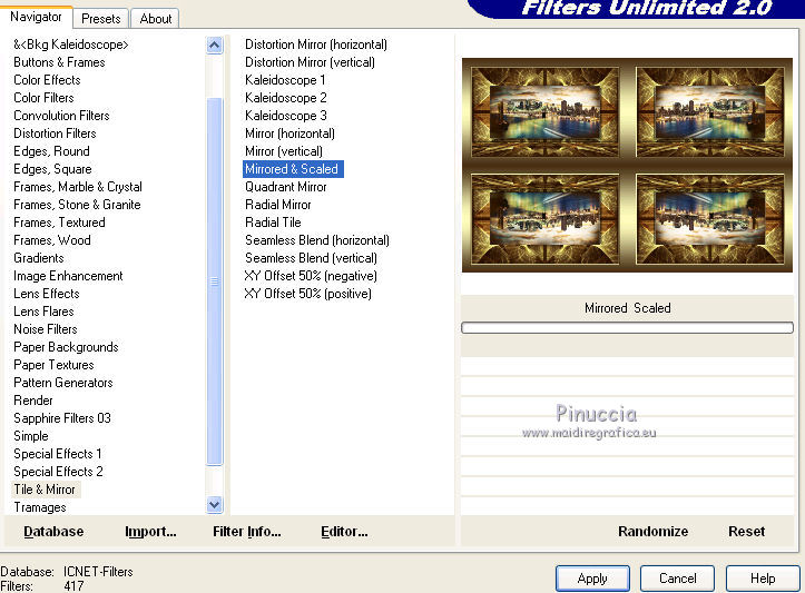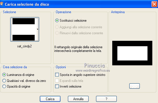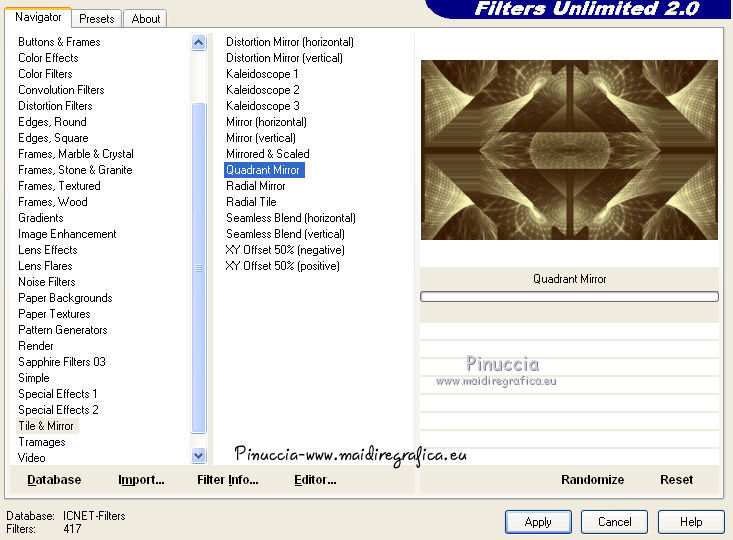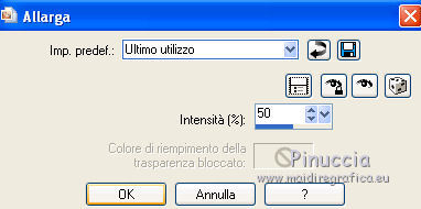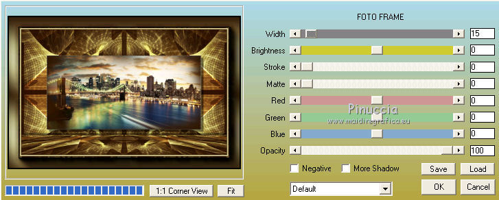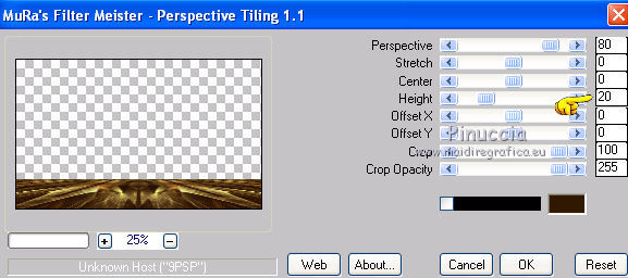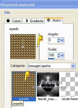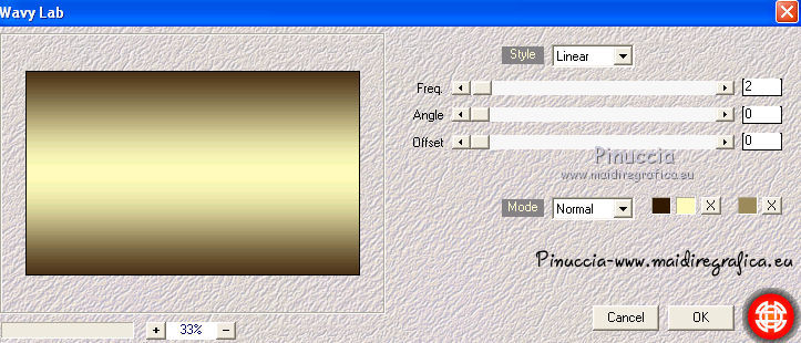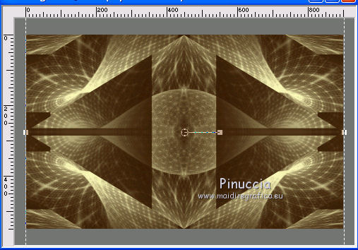 qui puoi trovare qualche risposta ai tuoi dubbi. Se l'argomento che ti interessa non è presente, ti prego di segnalarmelo. Questo tutorial è una creazione di Saturnella e non può essere copiato su altri siti nè essere offerto per il download. Lo stesso vale per la mia traduzione. E' anche proibito togliere il watermark dal materiale; rispettiamo il lavoro dei creatori di tubes, senza i quali non potremmo creare tutorials. Questo tutorial è stato creato con PSP x5, ma può essere eseguito anche con le altre versioni di PSP. Per tradurlo ho usato PSP X. La principale differenza tra le due versioni riguarda le funzioni Immagine>Rifletti/Capovolgi. Vedi la mia scheda qui Occorrente: Materiale qui Per i tubes grazie Nicole, MKM e kTs. Per la maschera grazie Narah. (in questa pagina trovi i links ai loro siti). Filtri in caso di dubbi, ricorda di consultare la mia sezione filtri qui Filters Unlimited 2.0 qui Mehdi - Wavy Lab, Sorting Tiles qui Simple - Blintz qui Mura's Meister - Perspective Tiling qui AAA Frames - Foto Frame qui I filtri Simple si possono usare da soli o importati in Filters Unlimited (come fare vedi qui) Se un filtro fornito appare con questa icona ![]() non esitare a cambiare modalità di miscelatura e opacità secondo i colori utilizzati. La trama Corel_02_017 è standard nelle nuove versioni di PSP. Se non la trovi nel tuo PSP, metti quella fornita nella cartella Trame. Metti il motivo oro nella cartella Motivi. Se non vuoi appesantire la cartella dei Motivi, puoi aprire il file in PSP e minimizzarlo. In questo modo, sarà disponibile tra i motivi - nella categoria Immagini aperte - quando ti servirà. Metti le selezioni nella cartella Selezioni. Apri la maschera in PSP e minimizzala con il resto del materiale. 1. Imposta il colore di primo piano con #fafab9, e il colore di sfondo con #371a05. ![]() 2. Apri una nuova immagine trasparente 900 x 550 pixels. Effetti>Plugins>Mehdi - Wavy Lab. Questo filtro lavora con i colori della paletta: il primo è il colore di sfondo, il secondo quello di primo piano; lascia il terzo colore creato dal filtro. ![]() 3. Livelli>Nuovo livello raster. Riempi con il colore scuro.Livelli>Nuovo livello maschera>Da immagine. Apri il menu sotto la finestra di origine e vedrai la lista dei files aperti. Seleziona la maschera Narah_mask_Abstract114, con i seguenti settaggi: ![]() Liuvelli>Unisci>Unisci gruppo. Livelli>Unisci>Unisci giù. 4. Effetti>Plugins>Simple - Blintz. Modifica>Ripeti Blintz. 5. Effetti>Plugins>Filters Unlimited 2.0 - Tile and Mirror - Quadrant Mirror. ![]() 6. Selezione>Carica/Salva selezione>Carica selezione da disco. Cerca e carica la selezione sat_cindy1. ![]() Selezione>Innalza selezione a livello. Selezione>Deseleziona. 7. Effetti>Effetti di trama>Trama - seleziona la trama Corel_02_017, con i seguenti settaggi. ![]() 8. Livelli>Duplica. Immagine>Rifletti. Livelli>Unisci>Unisci giù. Cambia la modalità di miscelatura di questo livello in Indebolisci, e abbassa l'opacità all'80% (o secondo i tuoi colori). 9. Effetti>Effetti 3D>Sfalsa ombra. ![]() Ripeti l'Effetto Sfalsa ombra, cambiando verticale e orizzontale con -4. 10. Livelli>Unisci>Unisci giù. 11. Livelli>Duplica. Immagine>Ruota per gradi - 90 gradi a destra. ![]() 12. Premi il tasto K per attivare lo strumento Puntatore ![]() se stai usando PSP 9 il tasto D (valido per tutte le versioni) per attivare lo strumento Deformazione ![]() spingi i nodi centrali a destra e a sinistra ![]() fino ai bordi ![]() Premi il tasto M per deselezionare lo strumento. Cambia la modalità di miscelatura di questo livello in Moltiplica, e abbassa l'opacità al 70% (o secondo i tuoi colori). 13. Livelli>Unisci>Unisci visibile. 14. Selezione>Carica/Salva selezione>Carica selezione da disco. Cerca e carica la selezione sat_cindy2. ![]() 15. Livelli>Nuovo livello raster. Riempi con il colore scuro.16. Selezione>Modifica>Seleziona bordature selezione. ![]() 17. Passa il colore di primo piano a Motivi, cerca e seleziona il motivo oro con i seguenti settaggi. ![]() Riempi la selezione con questo motivo.Effetti>Effetti di bordo>Aumenta. Selezione>Deseleziona. 18. Attiva lo strumento Bacchetta magica ![]() e clicca al centro del rettangolo per selezionarlo. Apri il tube del paesaggio e vai a Modifica>Copia. Torna al tuo lavoro e vai a Modifica>Incolla come nuovo livello. Selezione>Inverti. Premi sulla tastiera il tasto CANC ![]() Selezione>Deseleziona. 19. Livelli>Unisci>Unisci giù. 20. Effetti>Effetti 3D>Sfalsa ombra, con i settaggi standard. ![]() 21. Attiva il livello di sfondo. Livelli>Duplica. Effetti>Plugins>Mura's Meister - Perspective Tiling ![]() 22. Effetti>Effetti di distorsione>Allarga nelle versioni più recenti ha preso la denominazione Espansione. ![]() 23. Effetti>Effetti 3D>Sfalsa ombra. ![]() 24. Immagine>Aggiungi bordatura, 2 pixels, simmetriche, con il colore scuro. Immagine>Aggiungi bordatura, 4 pixels, simmetriche, con il colore chiaro. Immagine>Aggiungi bordatura, 2 pixels, simmetriche, con il colore scuro. Immagine>Aggiungi bordatura, 50 pixels, simmetriche, con il colore bianco. 25. Selezione il bordo bianco con la bacchetta magica ![]() Effetti>Plugins>Mehdi - Wavy Lab con i settaggi precedenti. ![]() 26. Effetti>Plugins>Filters Unlimited 2.0 - Tile and Mirror - Mirrored @scaled. ![]() Selezione>Inverti. Effetti>Effetti 3D>Sfalsa ombra. ![]() Selezione>Deseleziona. 27. Effetti>Plugins>AAA Frames - Foto Frame. ![]() 28. Apri il tube della donna e vai a Modifica>Copia. Torna al tuo lavoro e vai a Modifica>Incolla come nuovo livello. Immagine>Ridimensiona, al 70%, tutti i livelli non selezionato. Regola>Messa a fuoco>Metti a fuoco. Sposta il tube a destra.29. Effetti>Effetti 3D>Sfalsa ombra. ![]() 30. Apri il tube del fiore e vai a Modifica>Copia. Torna al tuo lavoro e vai a Modifica>Incolla come nuovo livello. Immagine>Rifletti. Immagine>Ridimensiona, al 70%, tutti i livelli non selezionato. Regola>Messa a fuoco>Metti a fuoco. Sposta il tube a sinistra.31. Effetti