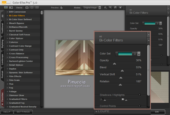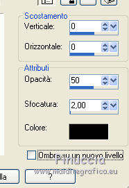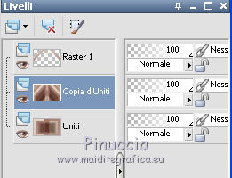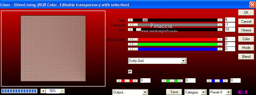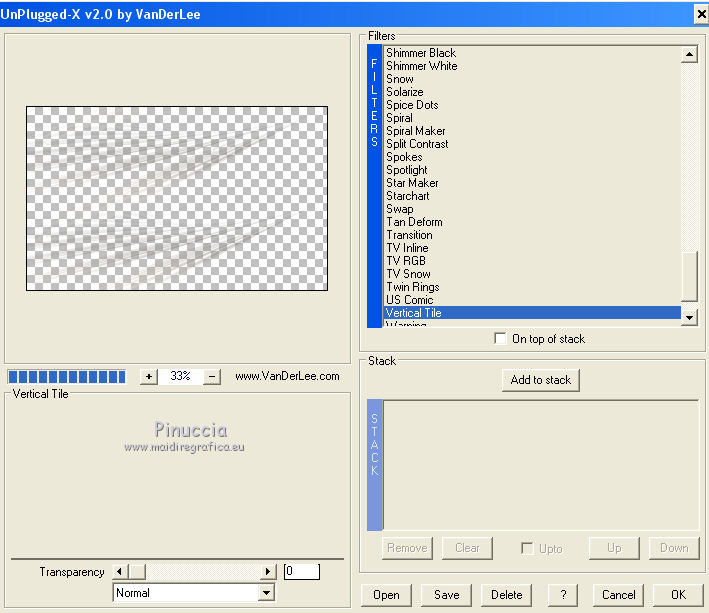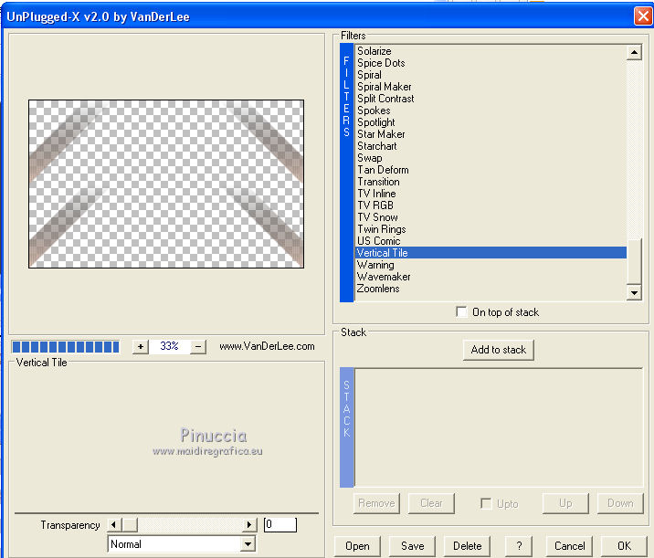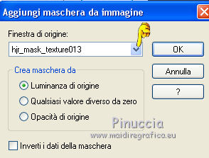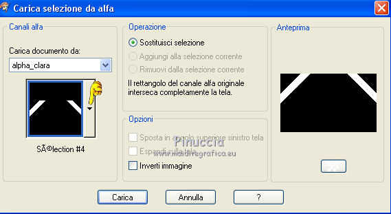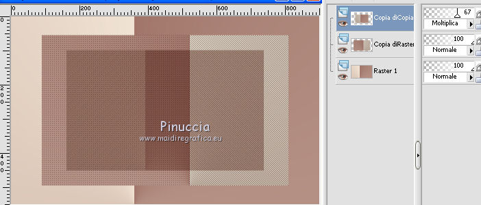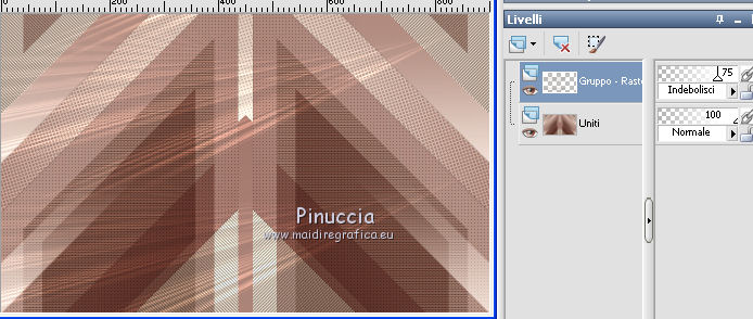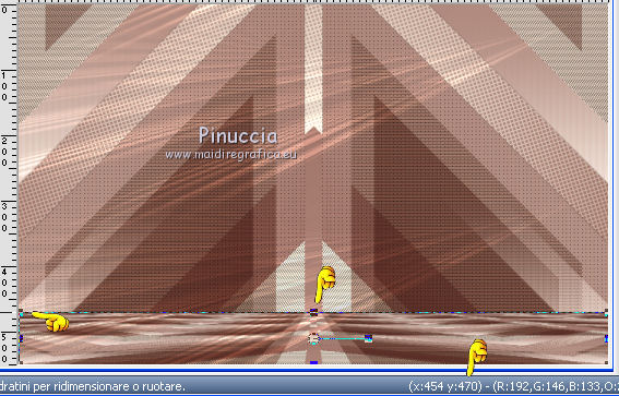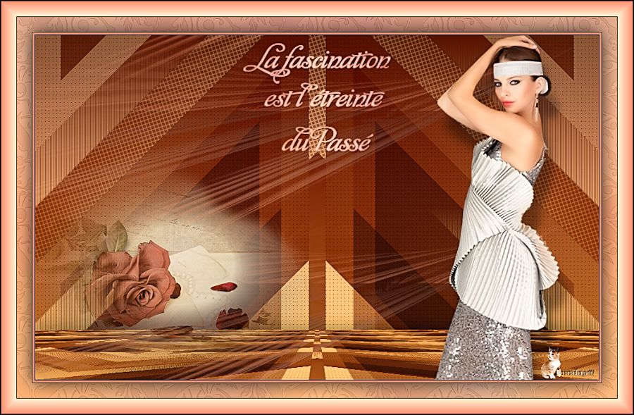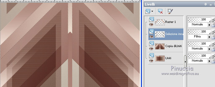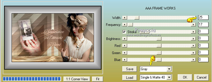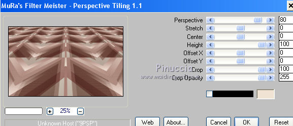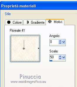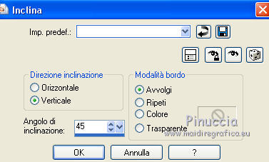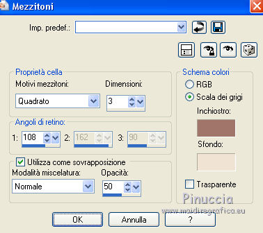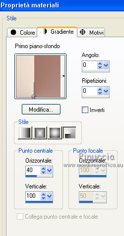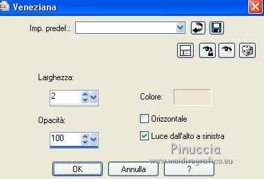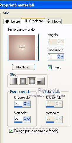qui puoi trovare qualche risposta ai tuoi dubbi. Se l'argomento che ti interessa non è presente, ti prego di segnalarmelo. Questo tutorial è una creazione di Saturnella e non può essere copiato su altri siti nè essere offerto per il download. Lo stesso vale per la mia traduzione. E' anche proibito togliere il watermark dal materiale; rispettiamo il lavoro dei creatori di tubes, senza i quali non potremmo creare tutorials. Per tradurre questo tutorial, creato con X6, ho usato CorelX, ma può essere eseguito anche con le altre versioni di PSP. Dalla versione X4, il comando Immagine>Rifletti è stato sostituito con Immagine>Capovolgi in orizzontale, e il comando Immagine>Capovolgi con Immagine>Capovolgi in verticale. Nelle versioni X5 e X6, le funzioni sono state migliorate rendendo disponibile il menu Oggetti. Nel nuovo X7 sono tornati i comandi Immagine>Rifletti e Immagine>Capovolgi, ma con nuove funzioni. Vedi la scheda sull'argomento qui Occorrente: Materiale qui Grazie per i tubes Jenny et Lizztish. (in questa pagina trovi i links ai loro siti). Filtri in caso di dubbi, ricorda di consultare la mia sezione filtri qui AP 01 [Innovations] - Lines SilverLining qui Nik Software - Color Efex pro qui Mura's Meister - Perspective Tiling qui AAA Frames - Frame Works qui VanDerLee Unplugged-X qui ![]() non esitare a cambiare modalità di miscelatura e opacità secondo i colori utilizzati. Il motivo Corel_08_018 è standard in PSP e corrisponde al motivo standard delle versioni meno recenti Floreale 41. Se non lo trovi nel tuo PSP, metti quello fornito nella cartella Motivi. Apri la maschera in PSP e minimizzala con il resto del materiale. 1. Imposta il colore di primo piano con il colore scuro #a1756a, e il colore di sfondo con il colore chiaro #f0e3d3. ![]() Passa il colore di primo piano a Gradiente di primo piano/sfondo, stile Radiale. ![]() 2. Attiva alpha_clara. Finestra>Duplica, o sulla tastiera maiuscola+D, per fare una copia. Chiudi l'originale. La copia, che sarà la base del tuo lavoro, non è vuota, ma contiene le selezioni salvate sul canale alfa. Rinomina il livello "Raster 1". una piccola curiosità: se rinomini il livello con la lettera minuscola - raster 1 - il programma assegnerà nuovamente il numero 1 al successivo livello. Se invece rinomini il livello con la lettera maiuscola - Raster 1 - il programma assegnerà al livello successivo il numero 2 Riempi l'immagine trasparente con il gradiente.3. Livelli>Duplica. Immagine>Rifletti. Immagine>Ridimensiona, all'80%, tutti i livelli non selezionato. 4. Selezione>Carica/Salva selezione>Carica selezione da canale alfa. La selezione sélection#1 è subito disponibile. Devi soltanto cliccare Carica. ![]() 5. Effetti>Plugins>AP 01 [Innovations] - Lines Silverlining. ![]() Selezione>Deseleziona. 6. Selezione>Carica/Salva selezione>Carica selezione da canale alfa. Apri il menu delle selezioni e carica Sélection#2. ![]() 7. Effetti>Plugins>AP 01 [Innovations] - Lines Silverlining. ![]() Selezione>Deseleziona. 8. Livelli>Duplica. Immagine>Rifletti. Immagine>Ridimensiona, all'80%, tutti i livelli non selezionato. Cambia la modalità di miscelatura di questo livello in Moltiplica, o secondo i tuoi colori, e abbassa l'opacità al 67%, ![]() 9. Livelli>Duplica. Immagine>Rifletti. Immagine>Ridimensiona, all'80%, tutti i livelli non selezionato. 10. Livelli>Unisci>Unisci visibile. 11. Livelli>Duplica. Immagine>Ruota per gradi - 90 gradi a destra. ![]() 12. Effetti>Effetti di immagine>Scostamento. ![]() 13. Effetti>Effetti geometrici>Inclina. ![]() 14. Effetti>Effetti di riflesso>Specchio rotante. ![]() 15. Selezione>Carica/Salva selezione>Carica selezione da canale alfa. Apri il menu delle selezioni e carica Sélection#3. ![]() Livelli>Nuovo livello raster. Cambia i settaggi del Gradiente, in stile Sprazzo di luce. ![]() Riempi la selezione con il gradiente.Selezione>Deseleziona. 16. Effetti>Effetti artistici>Mezzitoni. ![]() 17. Effetti>Effetti 3D>Sfalsa ombra. ![]() 18. Attiva il livello sottostante. ![]() Selezione>Carica/Salva selezione>Carica selezione da canale alfa. Apri il menu delle selezioni e carica Sélection#4. ![]() Selezione>Innalza selezione a livello. Selezione>Deseleziona. 19. Effetti>Effetti di trama>Veneziana, con il colore chiaro. ![]() 20. Effetti>Plugins>VanDerLee - Unplugged-x - Vertical Tile. ![]() Cambia la modalità di miscelatura di questo livello in Filtra, o come preferisci. ![]() 21. Livelli>Unisci>Unisci visibile. 22. Livelli>Nuovo livello raster. Riempi con il colore chiaro di sfondo (tasto destro del mouse).Livelli>Nuovo livello maschera>Da immagine. Apri il menu sotto la finestra di origine e vedrai la lista dei files aperti. Carica la maschera hjr_mask_texture013, con i seguenti settaggi. ![]() Livelli>Unisci>Unisci gruppo. 23. Effetti>Effetti di immagine>Scostamento. ![]() 24. Effetti>Plugins>VanDerLee - Unplugged-x - Vertical Tile. ![]() Cambia la modalità di miscelatura di questo livello in Indebolisci, o secondo i tuoi colori, e abbassa l'opacità al 75%, ![]() 25. Attiva il livello di sfondo. Livelli>Duplica. Effetti>Plugins>Mura's Meister - Perspective Tiling. ![]() 26. Premi il tasto K per attivare lo strumento Puntatore ![]() se stai usando PSP 9 il tasto D per attivare lo strumento Deformazione ![]() in modalità Scala , spingi il nodo superiore centrale verso il basso fino a 100 pixels,e il nodo inferiore centrale verso l'alto fino a 470 pixels: nella barra inferiore puoi controllare la posizione (se non visualizzi i Righelli, vai a Visualizza>Righelli) ![]() Premi il tasto M per deselezionare lo strumento. 27. Effetti>Effetti 3D>Sfalsa ombra. ![]() Livelli>Unisci>Unisci igiù. 28. Effetti>Plugins>Nik Software - Color Efex Pro Bi-color filters - a destra scegli un Color set in funzione dei tuoi colori - per il mio esempio Moss 3, con i seguenti settaggi. ![]() 29. Apri il tube déco di Lizztish e vai a Modifica>Copia. Torna al tuo lavoro e vai a Modifica>Incolla come nuovo livello. Effetti>Eff