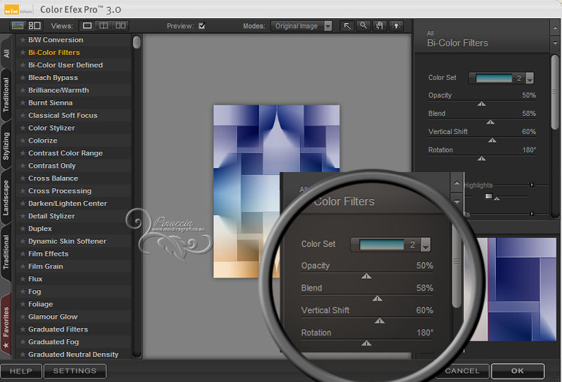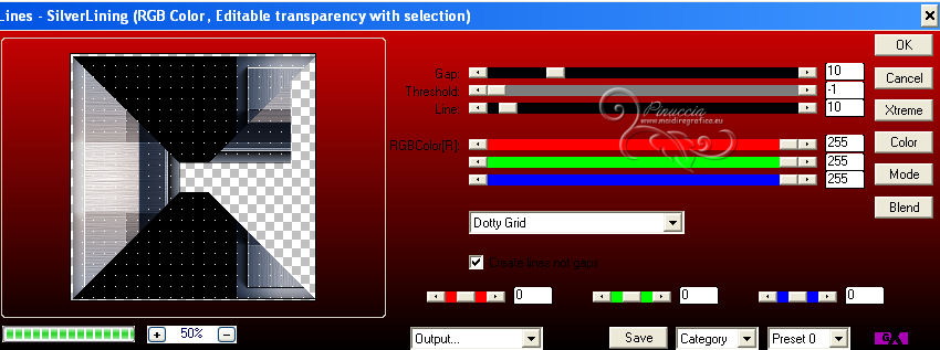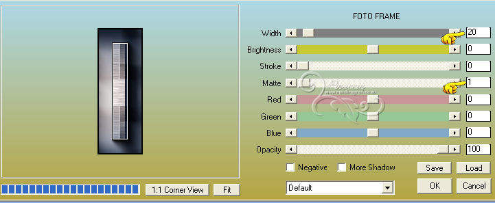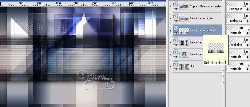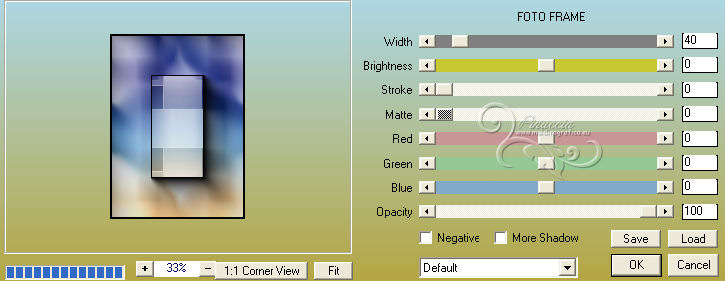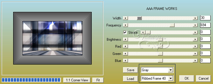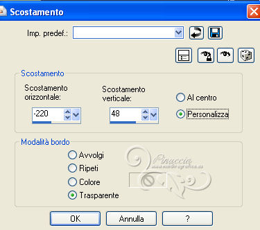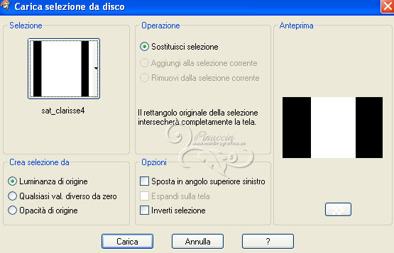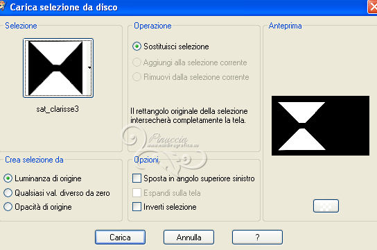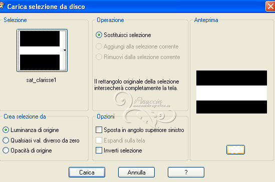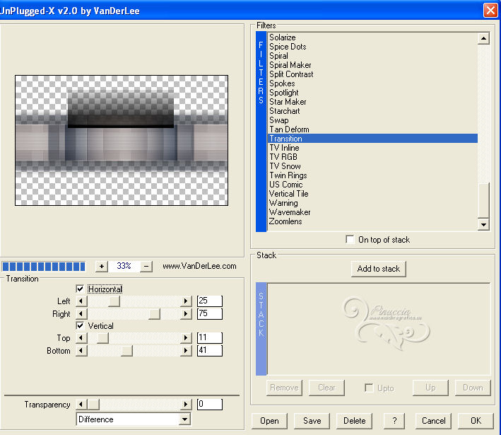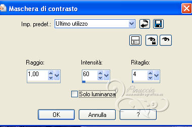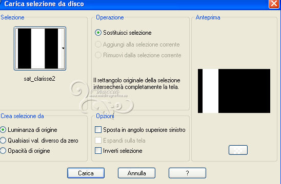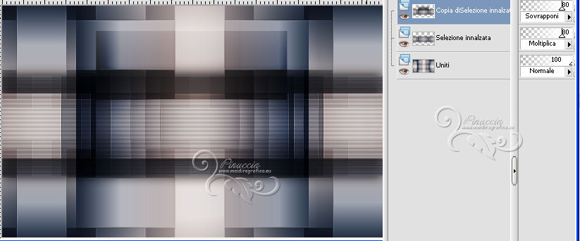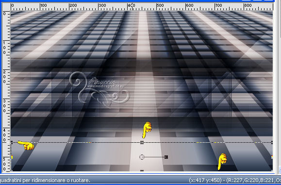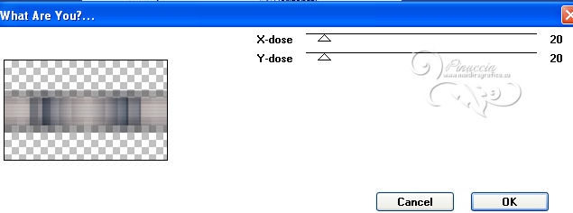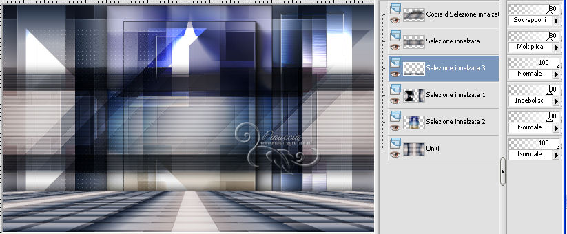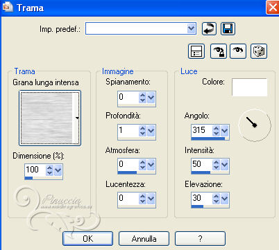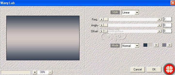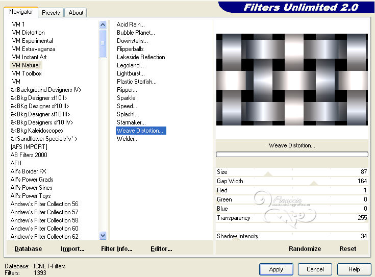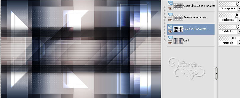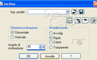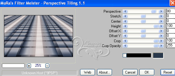 qui puoi trovare qualche risposta ai tuoi dubbi. Se l'argomento che ti interessa non è presente, ti prego di segnalarmelo. Questo tutorial è una creazione di Saturnella e non può essere copiato su altri siti nè essere offerto per il download. Lo stesso vale per la mia traduzione. E' anche proibito togliere il watermark dal materiale; rispettiamo il lavoro dei creatori di tubes, senza i quali non potremmo creare tutorials. Questo tutorial è stato creato con PSP x5, ma può essere eseguito anche con le altre versioni di PSP. Per tradurlo ho usato PSP X. Occorrente: Materiale qui Per i tubes grazie Alies e kTs. (in questa pagina trovi i links ai loro siti). Filtri in caso di dubbi, ricorda di consultare la mia sezione filtri qui Filters Unlimited 2.0 qui VN Natural - Weave distortion qui Simple - Pizza slice mirror, Quick tile qui Mehdi - Wavy Lab qui Mura's Meister - Perspective Tiling qui AAA Frames - Foto Frame, Frame Work qui Nik Software - Color Efex Pro qui VanDerLee - Unplugged-X qui I filtri VM Natural e Simple si possono usare da soli o importati in Filters Unlimited (come fare vedi qui) Se un filtro fornito appare con questa icona ![]() non esitare a cambiare modalità di miscelatura e opacità secondo i colori utilizzati. Metti le selezioni nella cartella Selezioni. 1. Imposta il colore di primo piano con il colore chiaro #d1c7c5, e il colore di sfondo con il colore scuro #2a384b. ![]() Apri una nuova immagine trasparente 900 x 550 pixels. Effetti>Plugins>Mehdi - Wavy Lab. Questo filtro lavora con i colori della paletta: il primo è il colore di sfondo, il secondo quello di primo piano; lascia il terzo colore creato dal filtro. ![]() 2. Livelli>Duplica. Immagine>Ruota per gradi - 90 gradi a destra. ![]() Livelli>Unisci>Unisci visibile. 3. Livelli>Duplica. Effetti>Plugins>Filters Unlimited 2.0 - VM Natural - Weave Distortion con i settaggi standard. ![]() Effetti>Effetti di bordo>Aumenta. Cambia la modalità di miscelatura di questo livello in Luce diffusa, o secondo i tuoi colori. Livelli>Unisci>Unisci visibile. 4. Selezione>Carica/Salva selezione>Carica selezione da disco. Cerca e carica la selezione sat_clarisse1. ![]() Selezione>Innalza selezione a livello. 5. Effetti>Effetti di trama>Veneziana. ![]() Selezione>Deseleziona. 6. Effetti>Plugins>Toadies - What are you, con i settaggi standard. ![]() Effetti>Effetti di bordo>Aumenta. Cambia la modalità di miscelatura di questo livello in Moltiplica, e abbassa l'opacità all'80% (o secondo i tuoi colori). 7. Effetti>Effetti 3D>Sfalsa ombra. ![]() 8. Livelli>Duplica. Effetti>Plugins>VanDerLee - Unplugged-X - Transition. ![]() Cambia la modalità di miscelatura di questo livello in Sovrapponi, e mantieni l'opacità all'80% (o secondo i tuoi colori). ![]() 9. Effetti>Effetti geometrici>Inclina. ![]() 10. Attiva il livello di sfondo. Selezione>Carica/Salva selezione>Carica selezione da disco. Cerca e carica la selezione sat_clarisse2. ![]() Selezione>Innalza selezione a livello. Effetti>Effetti di trama>Trama - seleziona la trama Grana lunga intensa (nelle versioni più recenti di PSP corrisponde a Corel_15_017), con i seguenti settaggi. ![]() 11. Effetti>Plugins>AAA Frame - Foto Frame. ![]() Selezione>Deseleziona. 12. Livelli>Duplica. Immagine>Rifletti. Livelli>Unisci>Unisci giù. 13. Effetti>Plugins>Simple - Pizza slice mirror. 14. Selezione>Carica/Salva selezione>Carica selezione da disco. Cerca e carica la selezione sat_clarisse3. ![]() Effetti>Plugins>AP 01 Innovations - Lines SilverLining. ![]() Selezione>Deseleziona. Cambia la modalità di miscelatura di questo livello in Indebolisci, e abbassa l'opacità all'80% (o secondo i tuoi colori). ![]() 15. Attiva nuovamente il livello di sfondo. Selezione>Carica/Salva selezione>Carica selezione da disco. Cerca e carica la selezione sat_clarisse4. ![]() Selezione>Innalza selezione a livello. 16. Effetti>Plugins>Simple - Quick Tile. 17. Effetti>Plugins>Nik Software - Color Efex Pro - Bi-color filters. Seleziona il Color set in base ai tuoi colori. ![]() 18. Effetti>Plugins>AAA Frames - Foto Frame. ![]() 19. Effetti>Effetti 3D>Sfalsa ombra, con il colore nero. ![]() Abbassa l'opacità di questo livello all'80%. 20. Attiva ancora il livello di sfondo. Selezione>Carica/Salva selezione>Carica selezione da disco. Cerca e carica la selezione sat_clarisse5. ![]() Selezione>Innalza selezione a livello. Selezione>Deseleziona. 21. Livelli>Disponi>Sposta su - due volte. ![]() 22. Effetti>Plugins>Mura's Meister - Perspective Tiling. ![]() 23. Premi il tasto K per attivare lo strumento Puntatore ![]() se stai usando PSP 9 il tasto D (valido per tutte le versioni) per attivare lo strumento Deformazione ![]() se non visualizzi i Righelli vai a Visualizza>Righelli In modalità Scala spingi il nodo centrale superiore verso il basso fino a 450 pixels, (puoi controllare la posizione nella barra inferiore). ![]() Premi il tasto M per deselezionare lo strumento. Effetti>Effetti 3D>Sfalsa ombra, con il colore nero. ![]() Dovresti avere questo. ![]() 24. Attiva il livello di sfondo. Modifica>Copia. 25. Immagine>Aggiungi bordatura, 2 pixels, simmetriche, con il colore scuro. Immagine>Aggiungi bordatura, 30 pixels, simmetriche, con il colore bianco. Immagine>Aggiungi bordatura, 1 pixel, simmetriche, con il colore scuro. Immagine>Aggiung bordatura, 50 pixels, simmetriche, con il colore bianco. 26. Attiva lo strumento Bacchetta magica ![]() e clicca nel bordo da 30 pixels con la bacchetta magica per selezionarlo. Modifica>Incolla nella selezione. Regola>Sfocatura>Sfocatura gaussiana - raggio 50. ![]() 27. Effetti>Effetti di trama>Trama, con i settaggi precedenti. ![]() Selezione>Deseleziona. 28. Seleziona il bordo da 50 pixels con la bacchetta magica ![]() Effetti>Plugins>AAA Frames - Frame Work. in base ai tuoi colori, puoi giocare sui valori Red,Green e Blue. ![]() 29. Selezione>Inverti. Effetti>Effetti 3D>Sfalsa ombra, con il colore nero. ![]() Selezione>Deseleziona. 30. Apri il tube déco e vai a Modific