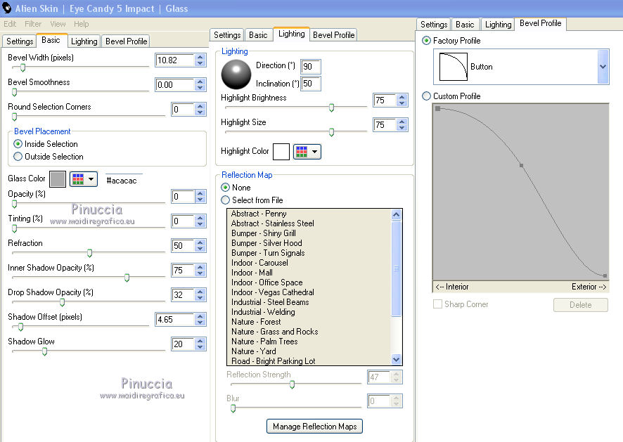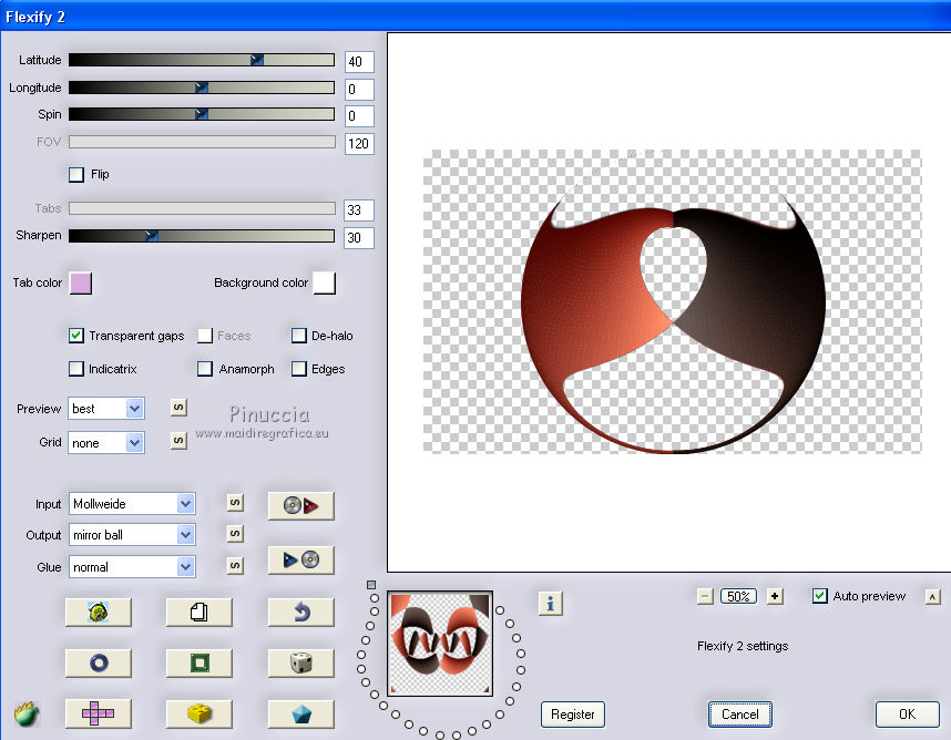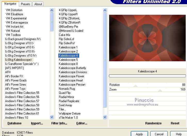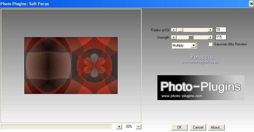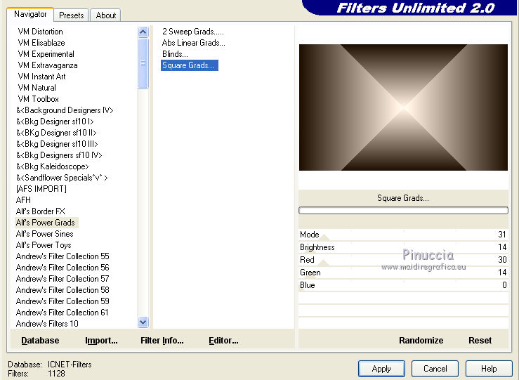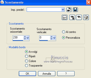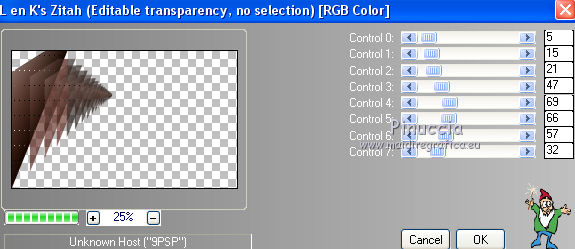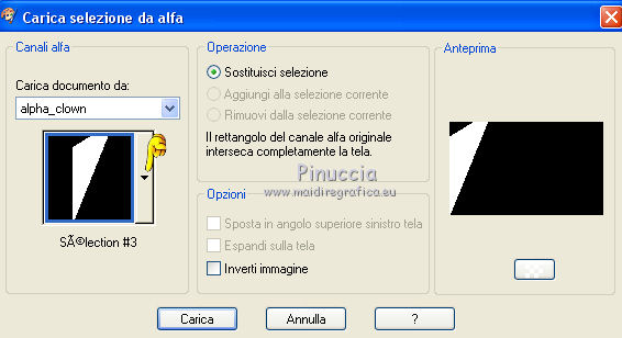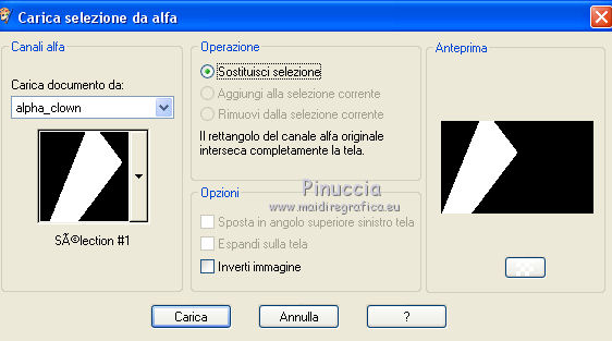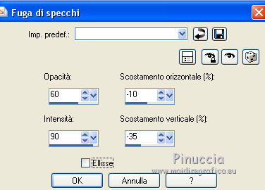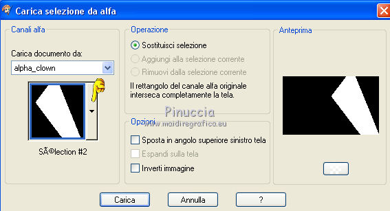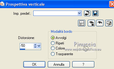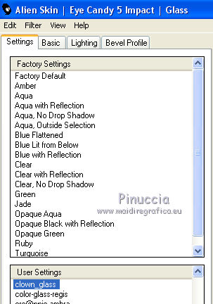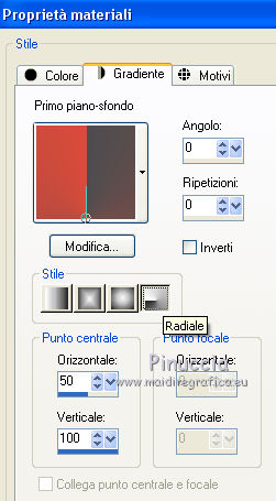 qui puoi trovare qualche risposta ai tuoi dubbi. Se l'argomento che ti interessa non è presente, ti prego di segnalarmelo. Questo tutorial è una creazione di Saturnella e non può essere copiato su altri siti nè essere offerto per il download. Lo stesso vale per la mia traduzione. E' anche proibito togliere il watermark dal materiale; rispettiamo il lavoro dei creatori di tubes, senza i quali non potremmo creare tutorials. Per tradurre questo tutorial, creato con X15, ho usato CorelX, ma può essere eseguito anche con le altre versioni di PSP. Dalla versione X4, il comando Immagine>Rifletti è stato sostituito con Immagine>Capovolgi in orizzontale, e il comando Immagine>Capovolgi con Immagine>Capovolgi in verticale. Nelle versioni X5 e X6, le funzioni sono state migliorate rendendo disponibile il menu Oggetti. Nel nuovo X7 sono tornati i comandi Immagine>Rifletti e Immagine>Capovolgi, ma con nuove funzioni. Vedi la scheda sull'argomento qui Occorrente: Materiale qui Per il tube grazie LuzCristina. Per i pennelli grazie Alenza (in questa pagina trovi i links ai loro siti). Filtri in caso di dubbi, ricorda di consultare la mia sezione filtri qui Filters Unlimited 2.0 qui Alf's power grads - Square Grad qui &<Bkg Kaleidoscope> - Kaleidoscope 4 (da importare in Unlimited) qui Flaming Pear - Flexify 2 qui AP 01 [Innovations] - Lines SilverLining qui Photo Plugin - Soft Focus qui Alien Skin Eye Candy 5 Impact - Glass, Perspective Shadow qui L&K - L&K Zitah qui I filtri Alf's Power si possono usare da soli o importati in Filters Unlimited (come fare vedi qui) Se un filtro fornito appare con questa icona ![]() non esitare a cambiare modalità di miscelatura e opacità secondo i colori utilizzati. Metti il preset Cliccando sul file una o due volte (a seconda delle tue impostazioni), automaticamente il preset si installerà nella cartella corretta. perchè uno o due clic vedi qui Metti i pennelli nella cartella Pennelli. Attenzione, ogni pennello è composto da 2 files che non devono essere separati. Vedi gli appunti sui pennelli qui 1. Imposta il colore di primo piano con #4d4d4f, e il colore di sfondo con #da4b3a . ![]() Passa il colore di primo piano a Gradiente di primo piano/sfondo, stile Radiale. ![]() 2. Apri alpha_clown. Finestra>Duplica, o sulla tastiera maiuscola+D, per fare una copia. Chiudi l'originale. La copia, che sarà la base del tuo lavoro, non è vuota, ma contiene le selezioni salvate sul canale alfa. Rinomina il livello "Raster 1". una piccola curiosità: se rinomini il livello con la lettera minuscola - raster 1 - il programma assegnerà nuovamente il numero 1 al successivo livello. Se invece rinomini il livello con la lettera maiuscola - Raster 1 - il programma assegnerà al livello successivo il numero 2 3. Riempi l'immagine trasparente con il gradiente.4. Livelli>Duplica. Effetti>Plugins>Filters Unlimited 2.0 - Alf's Power Grads - Square Grads, con i settaggi standard. ![]() Cambia la modalità di miscelatura di questo livello in Sovrapponi, o secondo i tuoi colori. Livelli>Unisci>Unisci visibile. 5. Effetti>Effetti geometrici>Prospettiva verticale. ![]() 6. Selezione>Carica/Salva selezione>Carica selezione da canale alfa. La selezione sélection1 è subito disponibile. Devi soltanto cliccare Carica. ![]() Selezione>Innalza selezione a livello. 7. Effetti>Plugins>AP 01 [Innovations] - Lines SilverLining ![]() Selezione>Deseleziona. 8. Attiva il livello di sfondo. Selezione>Carica/Salva selezione>Carica selezione da canale alfa. Apri il menu delle selezioni e carica sélection2. ![]() Selezione>Innalza selezione a livello. 9. Effetti>Plugins>AP 01 [Innovations] - Lines SilverLining, con i settaggi precedenti. Selezione>Deseleziona. 10. Attiva il livello superiore. Livelli>Unisci>Unisci giù. 11. Livelli>Duplica. Effetti>Plugins>Flaming Pear - Flexify 2. ![]() 12. Chiudi questo livello Attiva il livello di sfondo. Selezione>Carica/Salva selezione>Carica selezione da canale alfa. Apri il menu delle selezioni e carica sélection3. ![]() Selezione>Innalza selezione a livello. Selezione>Deseleziona. 13. Effetti>Effetti di riflesso>Fuga di specchi. ![]() 14. Effetti>Plugins>L&K's - L&K's Zitah. ![]() 15. Livelli>Duplica. Immagine>Rifletti. Livelli>Unisci>Unisci giù. Cambia la modalità di miscelatura di questo livello in Luce netta o secondo i tuoi colori. 16. Attiva il livello di sfondo. Effetti>Effetti di trama>Veneziana. ![]() Ripeti l'Effetto Veneziana, questa volta Orizzontale non selezionato. ![]() 17. Livelli>Unisci>Unisci visibile. 18. Effetti>Plugins>&<Bkg Kaleidoscope> - Kaleidoscope 4 ![]() Regola>Messa a fuoco>Accentua messa a fuoco. 19. Effetti>Effetti di immagine>Scostamento. ![]() 20. Riapri e attiva il livello superiore. Immagine>Ridimensiona, al 30%, tutti i livelli non selezionato. Livelli>Duplica. Immagine>Capovolgi. Livelli>Unisci>Unisci giù. 21. Effetti>Plugins>Alien Skin Eye Candy 5 Impact - Glass, seleziona il preset clown_glass e ok. ![]() In caso di problemi con il preset, puoi copiare i settaggi che vedi nella schermata. ![]() 22. Immagine>Ridimensiona, al 65%, tutti i livelli non selezionato. Effetti>Effetti di immagine>Scostamento, con i settaggi precedenti. 23. Effetti>Effetti 3D>Sfalsa ombra. ![]() 24. Apri il tube del clown di LuzCristina e vai a Modifica>Copia. Torna al tuo lavoro e vai a Modifica>Incolla come nuovo livello. Immagine>Rifletti. Sposta il tube a sinistra.Per il mio tube, per rafforzare i colori (se usi un altro tube potrebbe non essere necessario). Livelli>Duplica. Livelli>Unisci>Unisci giù. 25. Effetti>Effetti 3D>Sfalsa ombra. ![]() 26. Imposta il colore di sfondo con il colore bianco. Attiva lo strumento Pennello ![]() cerca e seleziona il pennello alenza_divers29. ![]() Livelli>Nuovo livello raster. Applica il pennello in alto a destra, cliccando due volte con il tasto destro del mouse, per usare il colore bianco di sfondo. ![]() 27. Livelli>Duplica. Immagine>Capovolgi. Livelli>Unisci>Unisci giù. 28. Effetti>Effetti 3D>Sfal