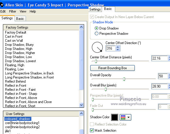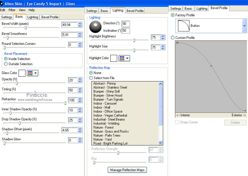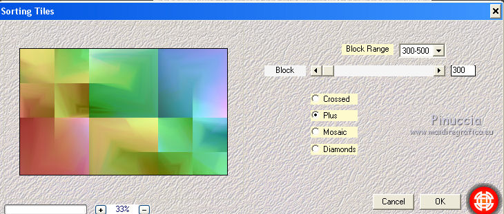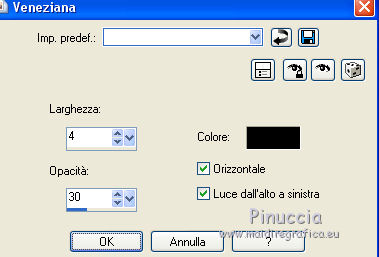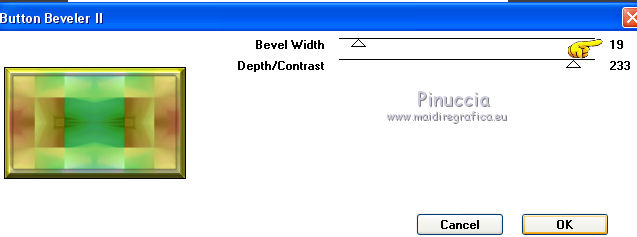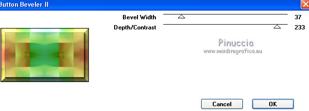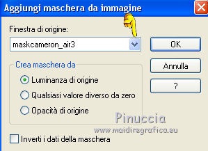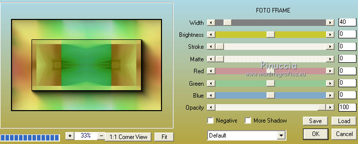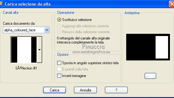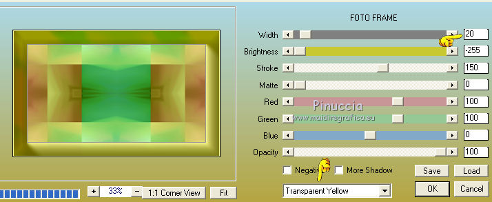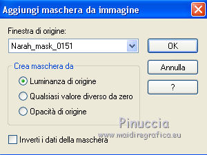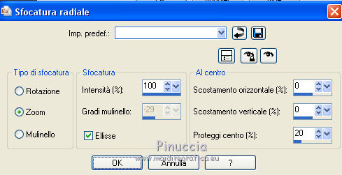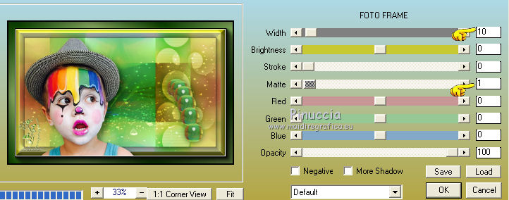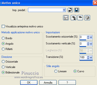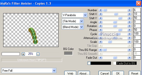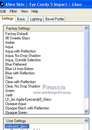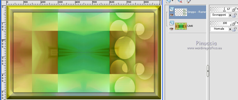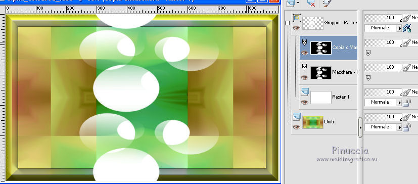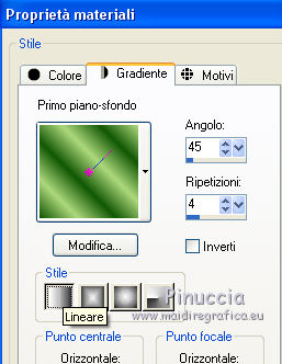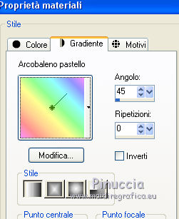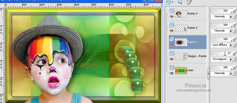 qui puoi trovare qualche risposta ai tuoi dubbi. Se l'argomento che ti interessa non è presente, ti prego di segnalarmelo. Questo tutorial è una creazione di Saturnella e non può essere copiato su altri siti nè essere offerto per il download. Lo stesso vale per la mia traduzione. E' anche proibito togliere il watermark dal materiale; rispettiamo il lavoro dei creatori di tubes, senza i quali non potremmo creare tutorials. Per tradurre questo tutorial, creato con PSP16, ho usato CorelX, ma può essere eseguito anche con le altre versioni di PSP. Dalla versione X4, il comando Immagine>Rifletti è stato sostituito con Immagine>Capovolgi in orizzontale, e il comando Immagine>Capovolgi con Immagine>Capovolgi in verticale. Nelle versioni X5 e X6, le funzioni sono state migliorate rendendo disponibile il menu Oggetti. Nel nuovo X7 sono tornati i comandi Immagine>Rifletti e Immagine>Capovolgi, ma con nuove funzioni. Vedi la scheda sull'argomento qui Occorrente: Materiale qui Grazie: per i tubes Yoka e Saturnella, per le maschere Cameron e Narah. (in questa pagina trovi i links ai loro siti). Filtri in caso di dubbi, ricorda di consultare la mia sezione filtri qui Filters Unlimited 2.0 qui Mehdi - Sorting Tiles qui Mura's Meister - Copies qui Graphics Plus - Vertical mirror, Button Beveler II qui Alien Skin Eye Candy 5 Impact - Perspective Shadow, Glass qui FM Tile Tools - Blend Emboss qui AAA Frames - Foto Frame qui I filtri Graphics Plus si possono usare da soli o importati in Filters Unlimited (come fare vedi qui) Se un filtro fornito appare con questa icona ![]() non esitare a cambiare modalità di miscelatura e opacità secondo i colori utilizzati. Nelle ultime versioni di PSP non c'è il gradiente di primo piano/sfondo (Corel_06_029) Puoi usare i gradienti delle versioni precedenti. Trovi qui i gradienti Corel X. Metti i presets Cliccando sul file una o due volte (a seconda delle tue impostazioni), automaticamente il preset si installerà nella cartella corretta. perchè uno o due clic vedi qui Se preferisci, puoi importare direttamente il preset nel corso del tutorial Come fare vedi la scheda del filtro Eye Candy qui Il gradiente Corel_06_039 è standard in PSP e corrisponde al gradiente Arcobaleno pastello delle versioni meno recenti. Se non lo trovi nel tuo PSP, metti quello fornito nella cartella Gradienti. Apri le maschere in PSP e minimizzale con il resto del materiale. Colori utilizzati ![]() 1. Imposta il colore di primo piano con il colore scuro #145509, e il colore di sfondo con il colore chiaro #add87c. ![]() Passa il colore di primo piano a Gradiente e seleziona il gradiente Arcobaleno pastello o Corel_06_039, stile Lineare. ![]() 2. Apri alpha_coloured_face. Finestra>Duplica, o sulla tastiera maiuscola+D, per fare una copia. ![]() Chiudi l'originale. La copia, che sarà la base del tuo lavoro, non è vuota, ma contiene una selezione salvata sul canale alfa. Riempi l'immagine trasparente con il gradiente.2. Livelli>Nuovo livello raster. Selezione>Seleziona tutto. Apri il tube del clown di Yoka e vai a Modifica>Copia (e minimizza il tube) Torna al tuo lavoro e vai a Modifica>Incolla nella selezione. Selezione>Deseleziona. 3. Effetti>Effetti di immagine>Motivo unico. ![]() 4. Regola>Sfocatura>Sfocatura radiale. ![]() Cambia la modalità di miscelatura di questo livello in Luminanza (esistente). Livelli>Unisci>Unisci visibile. 5. Effetti>Plugins>Mehdi - Sorting Tiles. ![]() 6. Effetti>Effetti di riflesso>Specchio rotante. ![]() 7. Effetti>Plugins>Graphics Plus - Vertical mirror, con i settaggi standard. ![]() 8. Effetti>Plugins>AAA Frames - Foto Frame, con i settaggi standard. ![]() 9. Effetti>Plugins>Graphics Plus - Button Beveler II, con i settaggi standard. ![]() 10. Effetti>Plugins>AAA Frames - Foto Frame (adatta ai tuoi colori) ![]() 11. Livelli>Duplica. Immagine>Rifletti. Immagine>Capovolgi. Abbassa l'opacità di questo livello al 50%. Livelli>Unisci>Unisci giù. 12. Effetti>Plugins>Graphics Plus - Button Beveler II. ![]() 13. Livelli>Nuovo livello raster. Imposta il colore di primo piano con il colore bianco. Riempi il livello con il colore bianco.Livelli>Nuovo livello maschera>Da immagine. Apri il menu sotto la finestra di origine e vedrai la lista dei files aperti. Seleziona la maschera maskcameron_air3. ![]() Livelli>Duplica. ![]() Effetti>Effetti di bordo>Aumenta. Livelli>Unisci>Unisci gruppo. 14. Modifica>Taglia (questo comando oltre a tagliare tiene anche in memoria). Selezione>Carica/Salva selezione>Carica selezione da canale alfa. La selezione sélection 1 è subito disponibile. Devi soltanto cliccare Carica. ![]() Modifica>Incolla nella selezione. ![]() 15. Effetti>Effetti di trama>Veneziana. ![]() Selezione>Deseleziona. 16. Effetti>Effetti 3D>Sfalsa ombra, con il tuo colore scuro (#145509). ![]() Modifica>Ripeti Sfalsa ombra. Cambia la modalità di miscelatura di questo livello in Sovrapponi, o altro e abbassa l'opacità al 67%. ![]() 17. Apri il tube cirque, e vai a Modifica>Copia. Torna al tuo lavoro e vai a Modifica>Incolla come nuovo livello. Spostalo a sinistra.Cambia la modalità di miscelatura di questo livello in Luce diffusa, o altro. 18. Effetti>Plugins>FM Tile Tools - Blend Emboss, con i settaggi standard. ![]() 19. Modifica>Copia Unione. Modifica>Incolla come nuovo livello. 20. Effetti>Effetti geometrici>Cerchio. ![]() Immagine>Ridimensiona, al 15%, tutti i livelli non selezionato. Effetti>Plugins>Alien Skin Eye Candy 5 Impact - Glass seleziona il preset coloured_glass e ok ![]() Questi i settaggi, in caso di problemi con il preset. ![]() 21. Effetti>Plugins>Mura's Meister - Copies. ![]() 22. Effetti>Effetti 3D>Sfalsa ombra, con i settaggi precedenti. ![]() Sposta l'immagine a destra.![]() 23. Attiva nuovamente il tube del clown di Yoka e vai a Modifica>Copia. Torna al tuo lavoro e vai a Modifica>Incolla come nuovo livello. Immagine>Ridimensiona, all'85%, tutti i livelli non selezionato. Regola>Messa a fuoco>Metti a fuoco. 24. Effetti>Plugins>Alien 