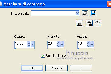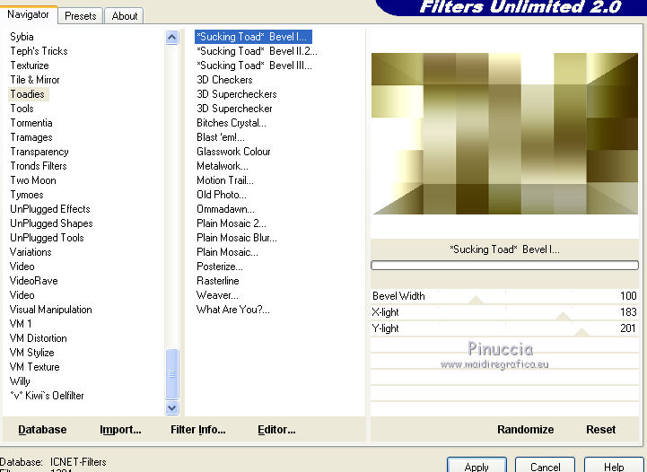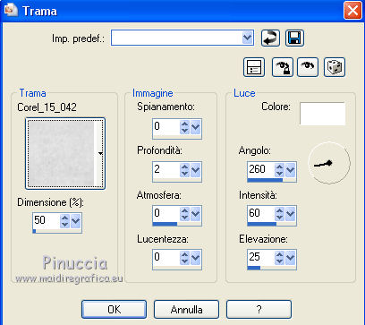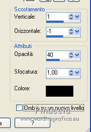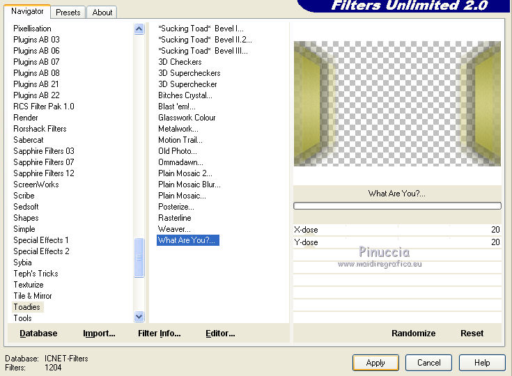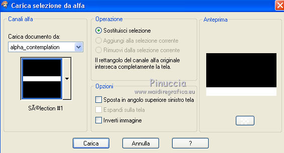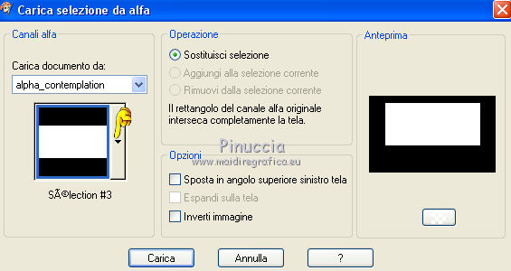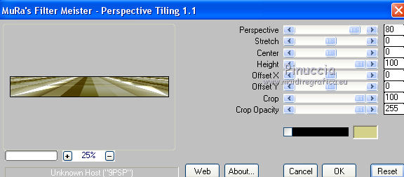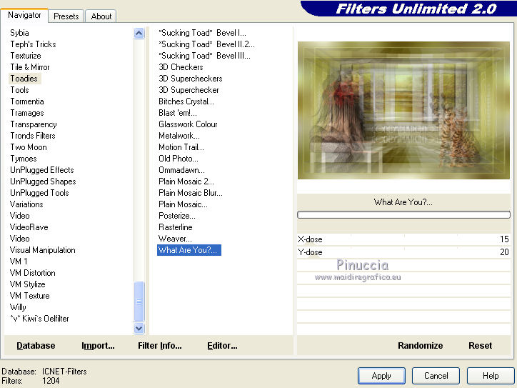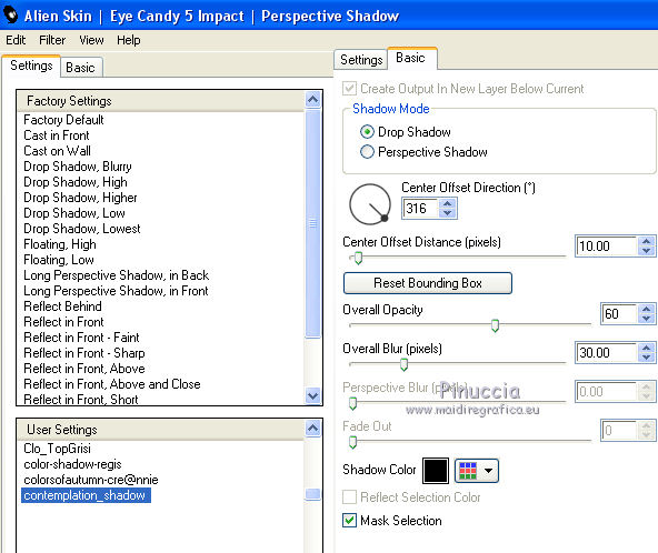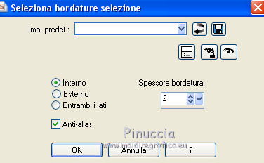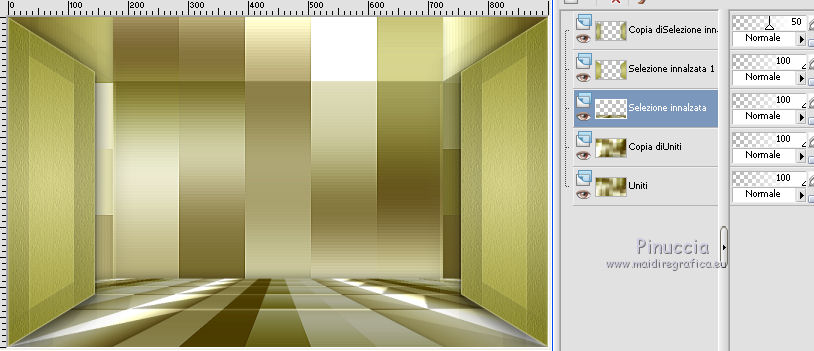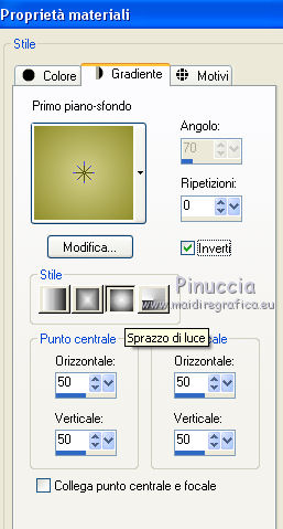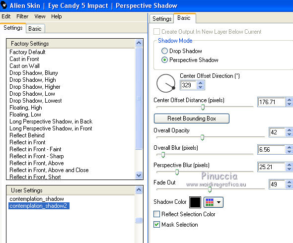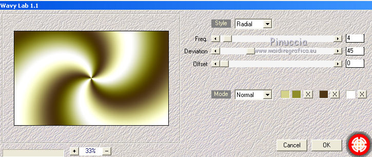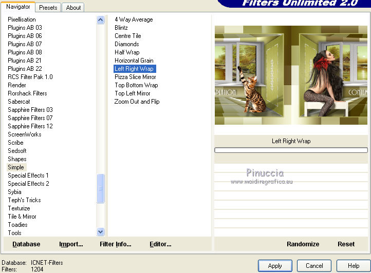 qui puoi trovare qualche risposta ai tuoi dubbi. Se l'argomento che ti interessa non è presente, ti prego di segnalarmelo. Questo tutorial è una creazione di Saturnella e non può essere copiato su altri siti nè essere offerto per il download. Lo stesso vale per la mia traduzione. E' anche proibito togliere il watermark dal materiale; rispettiamo il lavoro dei creatori di tubes, senza i quali non potremmo creare tutorials. Per tradurre questo tutorial, creato con PSP18, ho usato CorelX, ma può essere eseguito anche con le altre versioni di PSP. Dalla versione X4, il comando Immagine>Rifletti è stato sostituito con Immagine>Capovolgi in orizzontale, e il comando Immagine>Capovolgi con Immagine>Capovolgi in verticale. Nelle versioni X5 e X6, le funzioni sono state migliorate rendendo disponibile il menu Oggetti. Nel nuovo X7 sono tornati i comandi Immagine>Rifletti e Immagine>Capovolgi, ma con nuove funzioni. Vedi la scheda sull'argomento qui Occorrente: Materiale qui Grazie: per il tube della finestra Tyna Raegen, per il tube della donna Leny e per il tube del gatto Thafs. (in questa pagina trovi i links ai loro siti). Filtri in caso di dubbi, ricorda di consultare la mia sezione filtri qui Filters Unlimited 2.0 qui Simple - Left right wrap (bonus) qui Mehdi - Wavy Lab 1.1 qui Alien Skin Eye Candy 5 Impact - Perspective Shadow qui Mura's Meister - Perspective Tiling qui Toadies - What are you, Sucking Toad Bevel I qui I filtri Simple e Toadies si possono usare da soli o importati in Filters Unlimited (come fare vedi qui) Se un filtro fornito appare con questa icona ![]() non esitare a cambiare modalità di miscelatura e opacità secondo i colori utilizzati. Nelle ultime versioni di PSP non c'è il gradiente di primo piano/sfondo (Corel_06_029) Trovi i gradienti delle versioni precedenti qui Metti i preset Cliccando sul file una o due volte (a seconda delle tue impostazioni), automaticamente il preset si installerà nella cartella corretta. perchè uno o due clic vedi qui La trama Corel_15_042 è standard in PSP e corrisponde alla trama standard delle versioni meno recenti Carta antica. Se non la trovi nel tuo PSP metti quella fornita nella cartella Trame. ![]() 1. Imposta il colore di primo piano con il colore 1 #8f8d29, e il colore di sfondo con il colore 2 #d4d18b. ![]() Passa il colore di primo piano a Gradiente di primo piano/sfondo, stile Sprazzo di luce. ![]() Apri alpha_contemplation. Finestra>Duplica o sulla tastiera maiuscola+D per fare una copia. ![]() Chiudi l'originale. La copia, che sarà la base del tuo lavoro, non è vuota, ma contiene le selezioni salvate sul canale alfa. 2. Effetti>Plugins>Mehdi - Wavy Lab 1.1 questo filtro lavora con i colori della paletta: il primo è il colore di sfondo, il secondo quello di primo piano; cambia il terzo colore con il colore 3 #4f3715, e il quarto colore con il colore bianco. ![]() 3. Regola>Sfocatura>Sfocatura gaussiana - raggio 50. ![]() 4. Effetti>Effetti di distorsione>Tasselli. ![]() Regola>Messa a fuoco>Accentua messa a fuoco. 5. Livelli>Duplica. Immagine>Ruota per gradi - 90 gradi a destra. ![]() 6. Attiva il livello di sfondo. Selezione>Seleziona tutto. Immagine>Ritaglia la selezione. 7. Attiva nuovamente il livello superiore. Effetti>Effetti 3D>Sfalsa ombra. ![]() Livelli>Unisci>Unisci visibile. 8. Livelli>Duplica. Effetti>Plugins>Filters Unlimited 2.0 - Toadies - Sucking Toad Bevel I. ![]() 9. Selezione>Carica/Salva selezione>Carica selezione da canale alfa. La selezione sélection#1 è subito disponibile. Devi soltanto cliccare Carica. ![]() Selezione>Innalza selezione a livello. Effetti>Plugins>Mura's Meister - Perspective Tiling. ![]() Selezione>Deseleziona. Effetti>Effetti 3D>Sfalsa ombra. ![]() 10. Attiva il livello di sfondo. Selezione>Carica/Salva selezione>Carica selezione da canale alfa. Apri il menu delle selezioni e carica sélection#2. ![]() Selezione>Innalza selezione a livello. Livelli>Disponi>Porta in alto. Riempi la selezione con il gradiente.11. Effetti>Effetti di trama>Trama - seleziona la trama Corel 15_042, con i seguenti settaggi. ![]() Effetti>Effetti di bordo>Aumenta. 12. Selezione>Modifica>Seleziona bordature selezione. ![]() Modalità di corrispondenza dello strumento Riempimento su Nessuno ![]() e riempi la selezione con il colore chiaro di sfondo (tasto destro del mouse).Selezione>Deseleziona. 13. Effetti>Plugins>Alien Skin Eye Candy 5 Impact - Perspective Shadow. Seleziona il preset contemplation_shadow e ok. Questi i settaggi in caso di problemi con il preset. ![]() 14. Livelli>Duplica. Immagine>Rifletti (con corel17/18: Immagine>Rifletti>Rifletti orizzontalmente). Livelli>Unisci>Unisci giù. 15. Livelli>Duplica. Effetti>Plugins>Filters Unlimited 2.0 - Toadies - What are you, con i settaggi standard. ![]() Effetti>Effetti di bordo>Aumenta. Per il mio esempio ho abbassato l'opacità al 50%. 16. Attiva il livello "selezione innalzata". ![]() Livelli>Duplica. Effetti>Effetti di distorsione>Distorsione lente. ![]() 17. Attiva il livello superiore. Livelli>Nuovo livello raster. Selezione>Carica/Salva selezione>Carica selezione da canale alfa. Apri il menu delle selezioni e carica sélection#3. ![]() Apri il tube della finestra di Tyna Raegen, cancella la firma, e vai a Modifica>Copia. Torna al tuo lavoro e vai a Modifica>Incolla nella selezione. 18. Livelli>Nuovo livello raster. Apri l'immagine del paesaggio e vai a Modifica>Copia. Torna al tuo lavoro e vai a Modifica>Incolla nella selezione. Livelli>Disponi>Sposta giù. Selezione>Deseleziona. Immagine>Ridimensiona, al 90%, tutti i livelli non selezionato. 19. Attiva il livello superiore. Livelli>Unisci>Unisci giù. 20. Effetti>Effetti 3D>Sfalsa ombra. ![]() 21. Apri il tube deco 1 e vai a Modifica>Copia. Torna al tuo lavoro e vai a Modifica>Incolla come nuovo livello. Non spostarlo. Effetti>Effetti 3D>Sfalsa ombra. ![]() 22. Apri il tube deco 2 e vai a Modifica>Copia. Torna al tuo lavoro e vai a Modifica>Incolla come nuovo livello. Non spostarlo. 