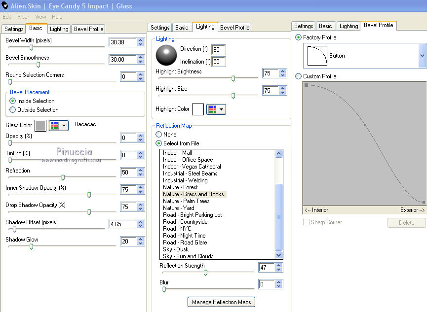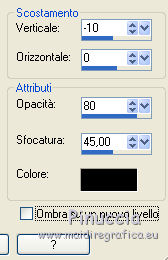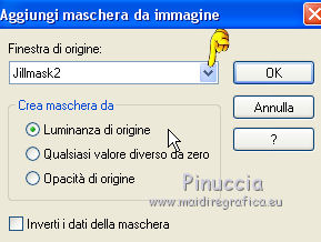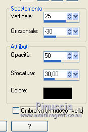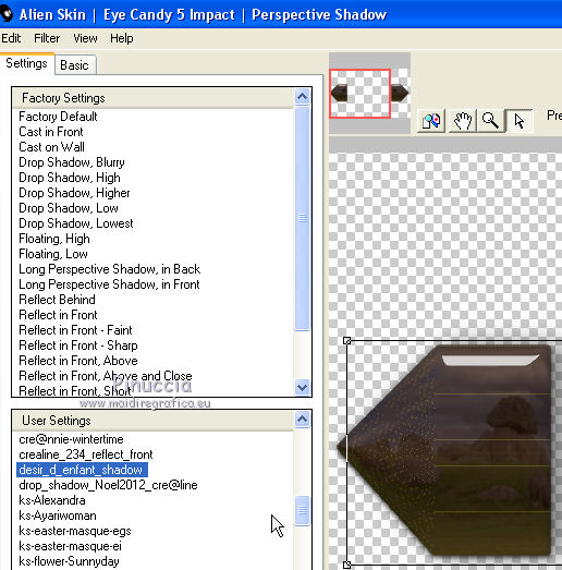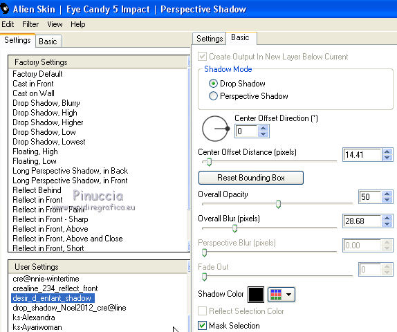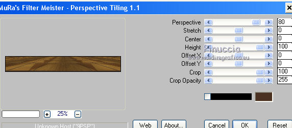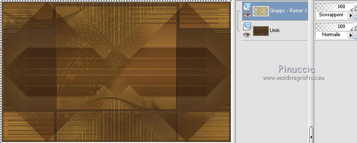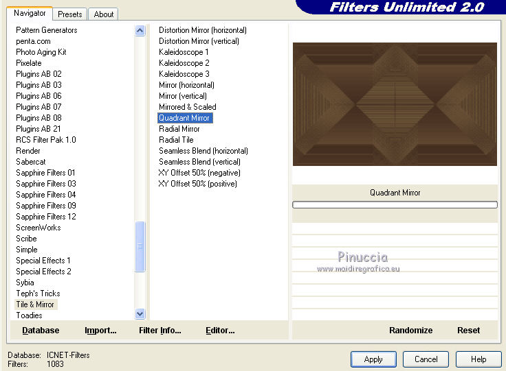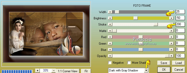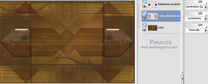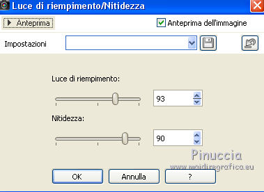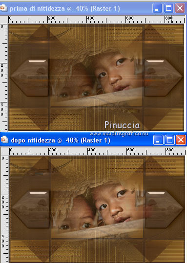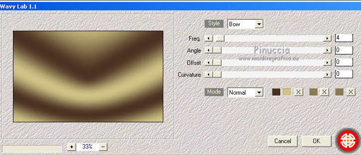 qui puoi trovare qualche risposta ai tuoi dubbi. Se l'argomento che ti interessa non è presente, ti prego di segnalarmelo. Questo tutorial è una creazione di Saturnella e non può essere copiato su altri siti nè essere offerto per il download. Lo stesso vale per la mia traduzione. E' anche proibito togliere il watermark dal materiale; rispettiamo il lavoro dei creatori di tubes, senza i quali non potremmo creare tutorials. Per tradurre questo tutorial, creato con X15, ho usato CorelX, ma può essere eseguito anche con le altre versioni di PSP. Dalla versione X4, il comando Immagine>Rifletti è stato sostituito con Immagine>Capovolgi in orizzontale, e il comando Immagine>Capovolgi con Immagine>Capovolgi in verticale. Nelle versioni X5 e X6, le funzioni sono state migliorate rendendo disponibile il menu Oggetti. Vedi la scheda sull'argomento qui Occorrente: Materiale qui Grazie: Per il tube dei bambini Angeledesign, per il tube della donna Nara Pamplona, per il tube dei vasi Guismo, e per la maschera Jill. (in questa pagina trovi i links ai loro siti). Filtri in caso di dubbi, ricorda di consultare la mia sezione filtri qui Filters Unlimited 2.0 qui Toadies - What are you qui Mura's Meister - Perspective Tiling qui Alien Skin Eye Candy 5 Impact - Perspective Shadow, Glass qui Mehdi - Weaver qui Mehdi - Wavy Lab 1.1 qui Tramages - At The Atomic Leve qui AAA Frames - Foto Frame qui Simple - Blintz, Pizza slice mirror, 4way average qui Plugin Galaxy - Instant Mirror qui I filtri Toadies, Tramages e Simple si possono usare da soli o importati in Filters Unlimited (come fare vedi qui) Se un filtro fornito appare con questa icona ![]() non esitare a cambiare modalità di miscelatura e opacità secondo i colori utilizzati. Metti i preset Cliccando sul file una o due volte (a seconda delle tue impostazioni), automaticamente il preset si installerà nella cartella corretta. perchè uno o due clic vedi qui Apri la maschera in PSP e minimizzala con il resto del materiale. 1. Imposta il colore di primo piano con #cec385, e il colore di sfondo con #4a3121. ![]() Apri alpha_desir. Finestra>Duplica, o sulla tastiera maiuscola+D, per fare una copia. Chiudi l'originale. La copia, che sarà la base del tuo lavoro, non è vuota, ma contiene una selezione salvata sul canale alfa. Rinomina il livello Raster 1. 2. Effetti>Plugins>Mehdi - Wavy Lab 1.1. per il mio esempio questo filtro lavora con i colori della paletta; il primo è il colore di sfondo, il secondo quello di primo piano, gli ultimi due sono creati dal filtro in armonia con quelli esistenti. ![]() 3. Regola>Sfocatura>Sfocatura gaussiana - raggio 100. ![]() 4. Livelli>Duplica. Effetti>Plugins>Filters Unlimited 2.0 - Tramages - At the Atomic Level, con i settaggi standard. ![]() Cambia la modalità di miscelatura di questo livello in Luce diffusa. Effetti>Effetti di bordo>Aumenta. Livelli>Unisci>Unisci visibile. 5. Effetti>Plugins>Simple - Blintz. 6. Livelli>Duplica. Immagine>Rifletti. Abbassa l'opacità di questo livello al 50%. Livelli>Unisci>Unisci visibile. 7. Effetti>Plugins>Simple - Pizza Slice Mirror. 8. Effetti>Plugins>Filters Unlimited 2.0 - Tile & Mirror - Quadrant Mirror. ![]() 9. Effetti>Plugins>The Plugins Site - Instant Mirror Il filtro Galaxi si posiziona nella lista dei filtri come The Plugins Site ![]() 10. Livelli>Nuovo livello raster. Riempi con il colore chiaro.Livelli>Nuovo livello maschera>Da immagine. Apri il menu sotto la finestra di origine e vedrai la lista dei files aperti. Carica la maschera Jillmask2, con i seguenti settaggi. ![]() Effetti>Effetti di bordo>Aumenta di più. Livelli>Unisci>Unisci gruppo. 11. Effetti>Effetti 3D>Sfalsa ombra. ![]() Cambia la modalità di miscelatura di questo livello in Sovrapponi, o secondo i tuoi colori. ![]() Livelli>Unisci>Unisci visibile. 12. Selezione>Carica/Salva selezione>Carica selezione da canale alfa. La selezione sélection#1 è subito disponibile. Devi soltanto cliccare Carica. ![]() Selezione>Innalza selezione a livello. Selezione>Deseleziona. 13. Effetti>Plugins>Alien Skin Eye Candy 5 Impact - Glass. Seleziona il preset desir_d_enfant_glass, e ok. ![]() in caso di problemi con il preset, puoi copiare i settaggi che vedi nella schermata. ![]() Cambia la modalità di miscelatura di questo livello in Luminanza (esistente), o secondo i tuoi colori. Livelli>Duplica. Immagine>Rifletti. Livelli>Unisci>Unisci giù. 14. Livelli>Duplica. Effetti>Plugins>Toadies - What are you. ![]() 15. Effetti>Plugins>Mehdi - Weaver. ![]() Livelli>Disponi>Sposta giù. Cambia la modalità di miscelatura di questo livello in Luminanza, o secondo i tuoi colori. ![]() 16. Attiva il livello superiore. Effetti>Plugins>Alien Skin Eye Candy 5 Impact - Perspective Shadow. Seleziona il preset desir_d_enfant_shadow e ok. ![]() 17. Attiva il livello di sfondo. Apri il tube dei bambini di Angeledesign e vai a Modifica>Copia. Torna al tuo lavoro e vai a Modifica>Incolla come nuovo livello. Immagine>Ridimensiona, all'80%, tutti i livelli non selezionato. Regola>Messa a fuoco>Metti a fuoco. 17. Regola>Luminosità e contrasto>Luce di riempimento/nitidezza. ![]() Questi i settaggi del tube utilizzato. Regola i settaggi in base al tuo tube. Questo effetto si trova soltanto nelle versioni più recenti di PSP. Se non hai questo effetto nella tua versione, puoi usare: Regola>Luminosità e contrasto>Nitidezza e regolare il settaggio a tuo piacimento. Questa la differenza prima e dopo l'applicazione dell'Effetto. ![]() 18. Attiva il livello di sfondo. Selezione>Carica/Salva selezione>Carica selezione da canale alfa. Apri il menu delle selezioni e carica sélection#2. ![]() Selezione>Innalza selezione a livello. Mantieni selezionato. 19. Effetti>Plugins>Mura's Meister - Perspective Tiling. ![]() Selezione>Deseleziona. 20. Effetti>Effetti 3D>Sfalsa ombra. ![]() 21. Attiva il livello superiore. Apri il tube della donna di Nara Pamplona e vai a Modifica>Copia. Torna al tuo lavoro e vai a Modifica>incolla come nuovo livello. Spos