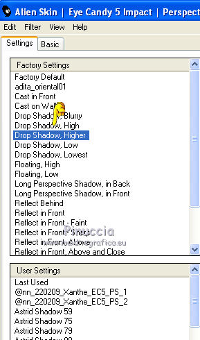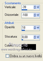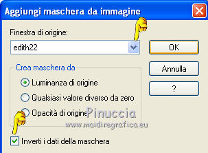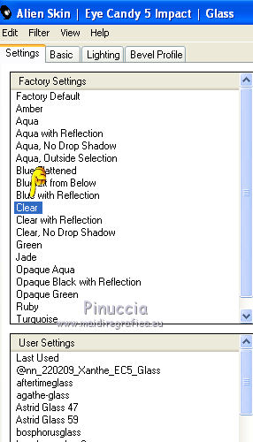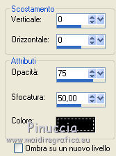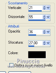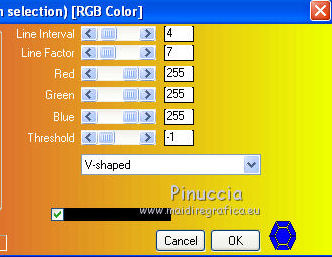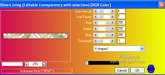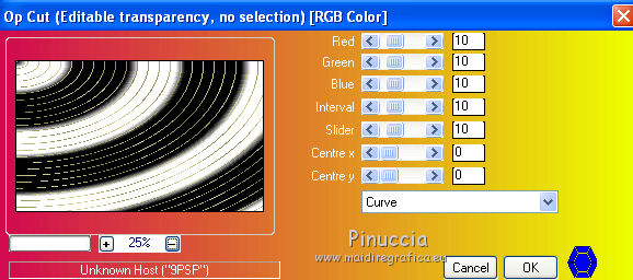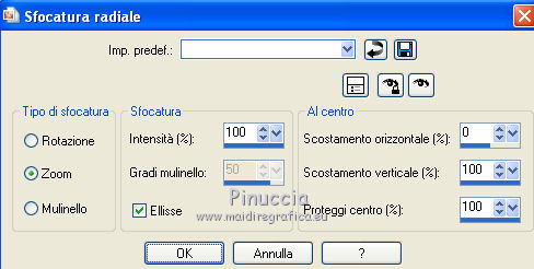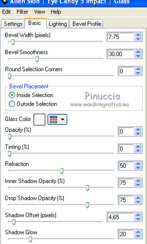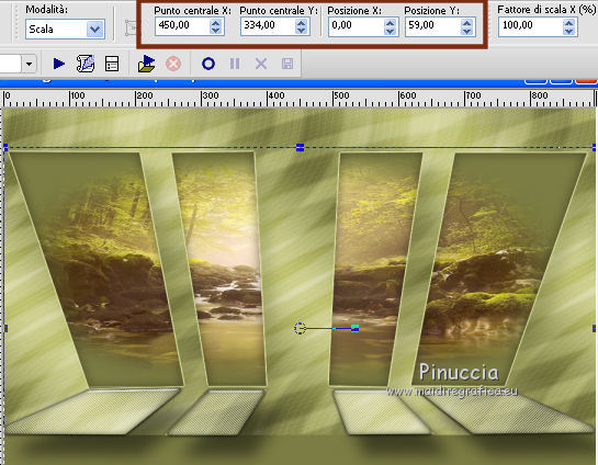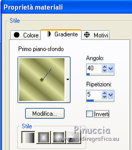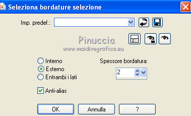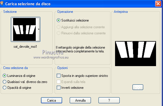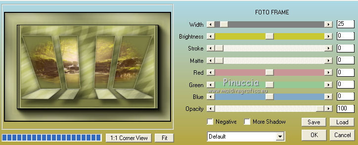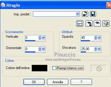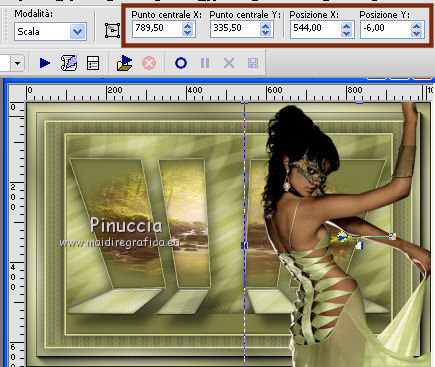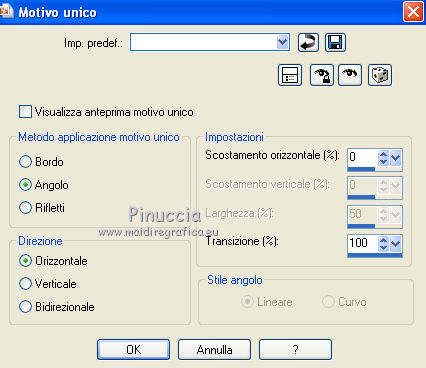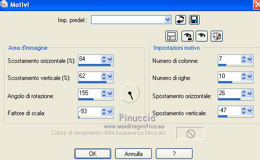 qui puoi trovare qualche risposta ai tuoi dubbi. Se l'argomento che ti interessa non è presente, ti prego di segnalarmelo. Questo tutorial è una creazione di Saturnella e non può essere copiato su altri siti nè essere offerto per il download. Lo stesso vale per la mia traduzione. E' anche proibito togliere il watermark dal materiale; rispettiamo il lavoro dei creatori di tubes, senza i quali non potremmo creare tutorials. Occorrente: Materiale qui Il tube della donna è di ChrisPastel. Il tube del paesaggio è di Monica. Il tube deco è di LB. La maschera è di Edith. (in questa pagina trovi i links ai loro siti). Filtri in caso di dubbi, ricorda di consultare la mia sezione filtri qui Sapphire Innovations 1.5 qui Alien Skin Eye Candy 5 Impact qui AAA Frames - Foto Frame qui ![]() Metti le selezioni nella cartella Selezioni. Apri la maschera in PSP e minimizzala con il resto del materiale. Imposta il colore di primo piano con #7b7d44, e il colore di sfondo con #dee09f. Passa il colore di primo piano a Gradiente, stile Lineare. ![]() 1. Apri una nuova immagine trasparente 900 x 550 pixels, e riempila con il gradiente.2. Regola>Sfocatura>Sfocatura gaussiana - raggio 40. 3. Livelli>Duplica. Effetti>Plugins>Innovations 1.5 - Op Cut. attenzione, inserendo il filtro Sapphire Innovations nei Percorsi Files, lo troverai in lista sotto "Innovations 1.5". ![]() 4. Cambia la modalità di miscelatura di questo livello in Sovrapponi, e abbassa l'opacità al 30%. 5. Livelli>Unisci>Unisci visibile. 6. Livelli>Duplica. Immagine>Rifletti. Immagine>Capovolgi. Abbassa l'opacità di questo livello al 50%. 7. Livelli>Unisci>Unisci giù. 8. Effetti>Effetti di immagine>Motivo unico. ![]() 9. Livelli>Nuovo livello raster. Riempi con il colore scuro.10. Livelli>Nuovo livello maschera>Da immagine. Apri il menu sotto la finestra di origine e vedrai la lista dei files aperti. Seleziona la maschera edith22, con i seguenti settaggi. ![]() Regola>Messa a fuoco>Accentua messa a fuoco. Livelli>Unisci>Unisci gruppo. 11. Selezione>Carica/Salva selezione>Carica selezione da disco. Cerca e carica la selezione sat_devoile_moi1. ![]() 12. Livelli>Nuovo livello raster. Apri il tube del paesaggio "DesignsbyMonica-30-03-2011-paisaje", e vai a Modifica>Copia. Torna al tuo lavoro e vai a Modifica>Incolla nella selezione. Livelli>Unisci>Unisci giù. 13. Livelli>Nuovo livello raster. Effetti>Effetti 3D>Ritaglio. ![]() Livelli>Unisci>Unisci giù. 14. Selezione>Modifica>Seleziona bordature selezione. ![]() 15. Livelli>Nuovo livello raster. Riempi con il colore chiaro.Selezione>Deseleziona. 16. Livelli>Unisci>Unisci giù. Attiva il livello inferiore. 17. Selezione>Carica/Salva selezione>Carica selezione da disco. Cerca e carica la selezione sat_devoile_moi2. ![]() Selezione>Innalza Selezione a livello. 18. Effetti>Plugins>Innovations 1.5 - Silverlining. ![]() 19. Effetti>Plugins>Alien Skin Eye Candy 5 Impact - Glass. ![]() Selezione>Deseleziona. 20. Effetti>Plugins>Alien Skin Eye Candy 5 Impact - Perspective Shadow. ![]() 21. Livelli>Disponi>Sposta su. 22. Chiudi il livello inferiore e attiva uno dei livelli visibili. Livelli>Unisci>Unisci visibile. Riapriil livello inferiore, e rimani posizionato sul livello Uniti. 23. Premi sulla tastiera il tasto K per attivare lo strumento Puntatore ![]() se stai usando PSP 9, il tasto D (valido per tutte le versioni), per attivare lo strumento deformazione ![]() In modalità Scala, nella barra superiore dello strumento imposta manualmente i settaggi come mostrato nella schermata. ![]() 24. Effetti>Effetti 3D>Sfalsa ombra. ![]() 25. Livelli>Unisci>Unisci tutto. 26. Immagine>Aggiungi bordatura, 2 pixels, simmetriche, con il colore scuro. Immagine>Aggiungi bordatura, 4 pixels, simmetriche, con il colore scuro. 27. Livelli>Duplica. Immagine>Ridimensiona, al 90%, tutti i livelli non selezionato. Attiva il livello inferiore. 28. Regola>Sfocatura>Sfocatura radiale. ![]() 29. Effetti>Effetti di riflesso>Motivi. ![]() (a seconda della versione del tuo PSP, l'effetto potrebbe essere differente; in questo caso applica l'effetto che preferisci). 30. Attiva il livello superiore. Effetti>Effetti 3D>Sfalsa ombra. ![]() Livelli>Unisci>Unisci giù. 31. Immagine>Aggiungi bordatura, 4 pixels, simmetriche, con il colore chiaro. Immagine>Aggiungi bordatura, 45 pixels, simmetriche, con il colore scuro. Seleziona questo bordo con la bacchetta magica ![]() Selezione>Innalza selezione a livello. Riempi la selezione con il gradiente.32. Effetti>Plugins>Innovations 1.5, Silverlining, con i settaggi precedenti. ![]() 33. Selezione>Inverti. Effetti>Effetti 3D>Sfalsa ombra, con i settaggi precedenti. Selezione>Deseleziona. 34. Livelli>Unisci>Unisci tutto. 35. Effetti>Plugins>AAA Frames - Foto Frame. ![]() 36. Immagine>Aggiungi bordatura, 1 pixel, simmetriche, con il colore nero. 37. Apri il tube di ChrisPastel "Chris-beautemasquee", e vai a Modifica>Copia. Torna al tuo lavoro e vai a Modifica>Incolla come nuovo livello. Attiva lo strumento Gomma ![]() e cancella le due linee verticali ai lati del tube. 38. Tasto K o D e imposta la posizione con i seguenti settaggi. ![]() 39. Effetti>Effetti 3D>Sfalsa ombra, con il colore nero. ![]() Regola>Messa a fuoco>Metti a fuoco. 40. Apri il tube di LB "813-stilllife-LB TUBES" e vai a Modifica>Copia. Torna al tuo lavoro e vai a Modifica>Incolla come nuovo livello. Immagine>Ridimensiona, al 50%, tutti i livelli non selezionato. Spostalo a sinistra, come nel mio esempio.Effetti>Effetti 3D>Sfalsa ombra. ![]() Regola>Messa a fuoco>Metti a fuoco. 41. Apri il tube texte (o, se preferisci, scrivi un tuo testo) e vai a Modifica>Copia. Torna al tuo lavoro e vai a Modifica>Incolla come nuovo livello. Posiziona correttamente il testo.Firma il tuo lavoro. Livelli>Unisci>Unisci tutto. 42. Immagine>Ridimensiona, a 900 pixels di larghezza, tutti i livelli selezionato. 43. Regola>Messa a fuoco>Maschera di contrasto. Salva in formato jpg. ![]() Se hai problemi o dubbi, o trovi un link non funzionante,