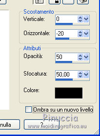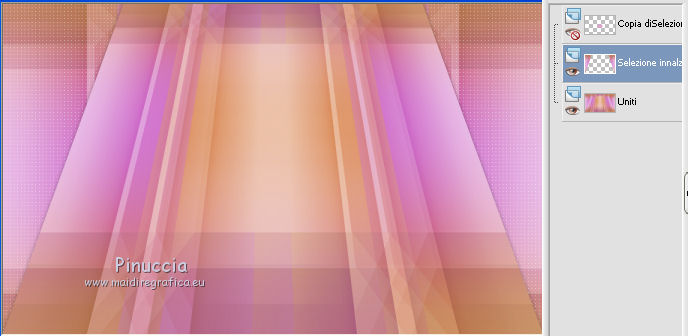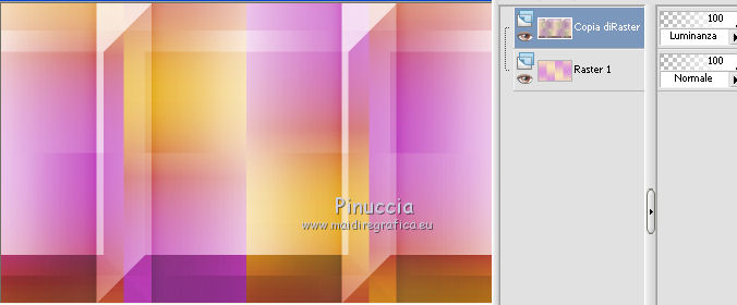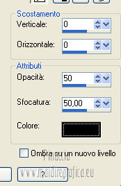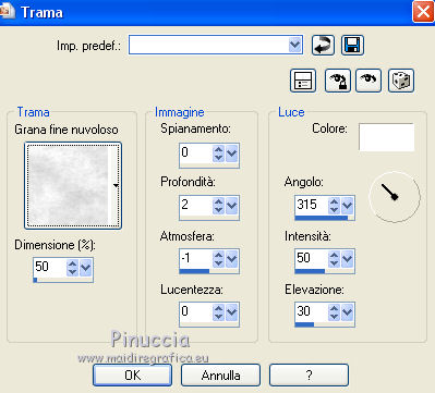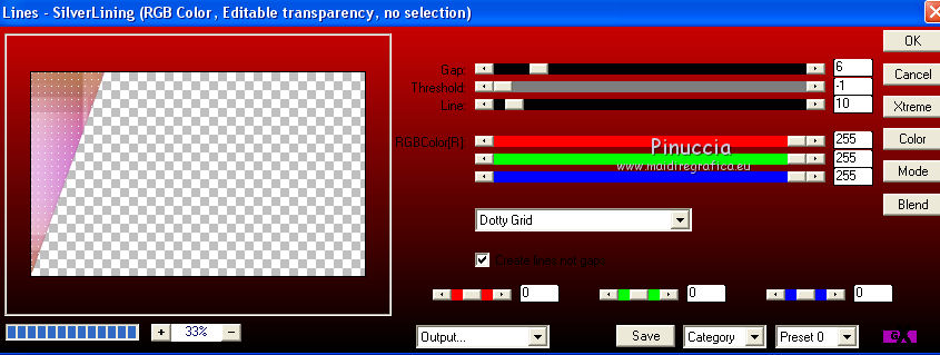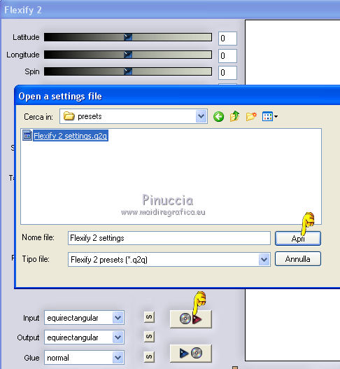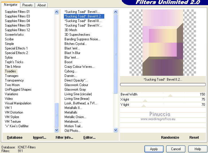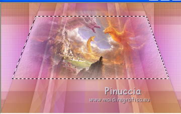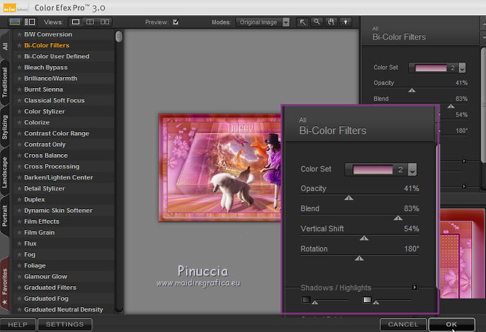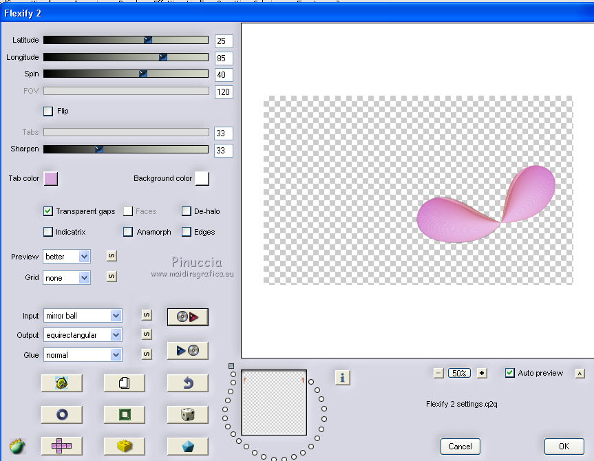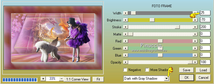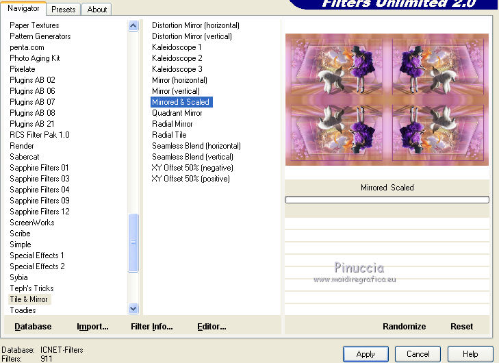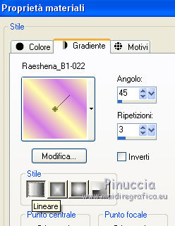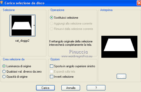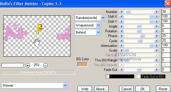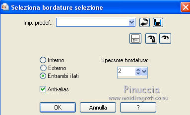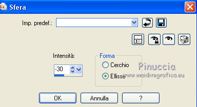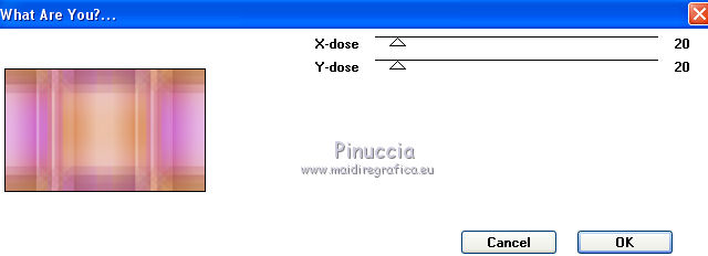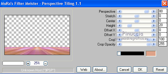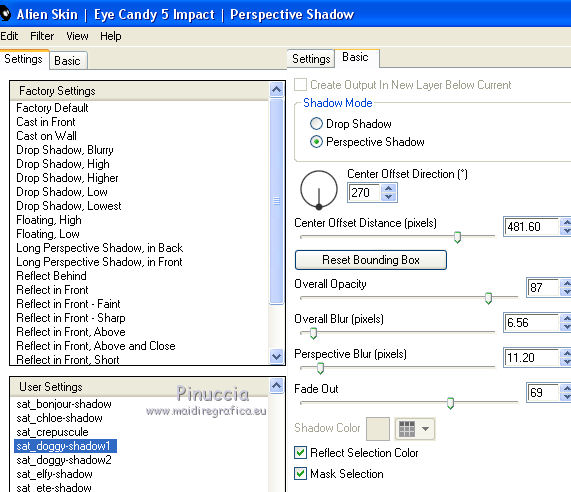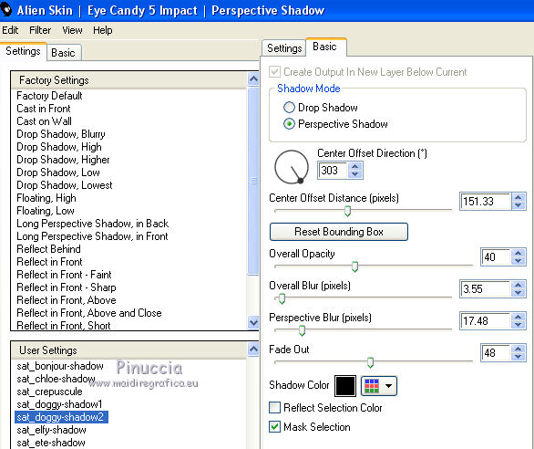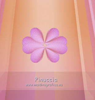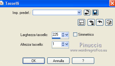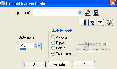 qui puoi trovare qualche risposta ai tuoi dubbi. Se l'argomento che ti interessa non è presente, ti prego di segnalarmelo. Questo tutorial è una creazione di Saturnella e non può essere copiato su altri siti nè essere offerto per il download. Lo stesso vale per la mia traduzione. E' anche proibito togliere il watermark dal materiale; rispettiamo il lavoro dei creatori di tubes, senza i quali non potremmo creare tutorials. Il tutorial è stato scritto con CorelX16, ma può essere eseguito anche con le altre versioni di PSP. Secondo la versione utilizzata (anteriore a PSP X) potresti ottenere dei risultati differenti. Vedi la mia scheda riguardante le funzioni Rifletti>Capovolgi nelle nuove versioni di PSP qui Per tradurre questo tutorial ho usato PSP X. Occorrente: Materiale qui Grazie ClaudiaViza per il tube del personaggio e Krys per il tube del paesaggio. (in questa pagina trovi i links ai loro siti). Filtri in caso di dubbi, ricorda di consultare la mia sezione filtri qui Filters Unlimited 2.0 qui Toadies - what are you, Sucking toad Bevel II2 qui Simple - Pizza Slice Mirror qui AP 01 [Innovations] - Lines SilverLining qui Alien Skin Eye Candy 5 Impact - Perspective Shadow qui Mura's Meister - Perspective Tiling qui AAA Frames - Foto Frame qui Nik Software - Color Efex Pro qui Flaming Pear - Flexify 2 qui Mura's Meister - Copies qui ![]() non esitare a cambiare modalità di miscelatura e opacità secondo i colori utilizzati. Metti i preset Cliccando sul file una o due volte (a seconda delle tue impostazioni), automaticamente il preset si installerà nella cartella corretta. perchè uno o due clic vedi qui Metti il preset Flexify_2 settings.q2q nella cartella del Filtro Flexify. Se preferisci, puoi importarlo, quando ti servirà, direttamente dalla cartella in cui hai salvato il materiale. Metti il gradiente nella cartella Gradienti. Metti le selezioni nella cartella Selezioni. 1. Imposta il colore di primo piano con #883387, e il colore di sfondo con il colore #dda288. ![]() Passa il colore di primo piano a Gradiente e seleziona il gradiente Raeshena BI-022, con i seguenti settaggi. ![]() 2. Apri una nuova immagine trasparente 900 x 550 pixels, e riempila con il gradiente.3. Regola>Sfocatura>Sfocatura gaussiana - raggio 50 ![]() 4. Effetti>Effetti di distorsione>Tasselli. ![]() 5. Livelli>Duplica. Immagine>Ruota per gradi - 90 gradi a sinistra. ![]() 6. Effetti>Plugins>Toadies - Sucking Toad Bevel II 2. ![]() 7. Effetti>Effetti di immagine>Motivo unico. ![]() 8. Effetti>Effetti 3D>Sfalsa ombra. ![]() Cambia la modalità di miscelatura di questo livello in Luminanza, o secondo i tuoi colori. ![]() Livelli>Unisci>Unisci visibile. 9. Livelli>Duplica. Immagine>Capovolgi. Abbassa l'opacità di questo livello al 50%. Livelli>Unisci>Unisci visibile. 10. Effetti>Plugins>Toadies - What are you. ![]() 11. Livelli>Duplica. Effetti>Effetti geometrici>Prospettiva verticale. ![]() 12. Effetti>Effetti 3D>Sfalsa ombra. ![]() Livelli>Unisci>Unisci visibile. 13. Selezione>Carica/Salva selezione>Carica selezione da disco. Cerca e carica la selezione sat_doggy1. ![]() Selezione>Innalza selezione a livello. Selezione>Deseleziona. 14. Effetti>Plugins>AP 01 [Innovations] - Lines SilverLining. ![]() 15. Livelli>Duplica. Immagine>Rifletti. Livelli>Unisci>Unisci giù. 16. Livelli>Duplica. Effetti>Plugins>Flaming Pear - Flexify 2. clicca sull'icona della freccia rossa e cerca, nella cartella in cui lo hai salvato, il preset Flexify2 settings.q2q ![]() Questi i settaggi che, in caso di problemi con il preset, puoi impostare manualmente. ![]() 17. Immagine>Ridimensiona, al 30%, tutti i livelli non selezionato. 18. Livelli>Duplica. Immagine>Rifletti. Posiziona le due forme come nell'esempio.![]() Assicurati di essere posizionato sul livello superiore. Livelli>Unisci>Unisci giù. 19. Livelli>Duplica. Immagine>Capovolgi. Posiziona i "petali" come nell'esempio.![]() Assicurati di essere posizionato sul livello superiore. Livelli>Unisci>Unisci giù. Chiudi momentaneamente questo livello. 20. Attiva il livello sottostante (Selezione innalzata). ![]() Livelli>Unisci>Unisci giù. 21. Rimani posizionato sul livello di sfondo. Livelli>Duplica. Selezione>Carica/Salva selezione>Carica selezione da disco. Cerca e carica la selezione sat_doggy2. ![]() Selezione>Innalza selezione a livello. 22. Effetti>Effetti di trama>Trama - seleziona la trama Grana fine nuvoloso, con i seguenti settaggi. ![]() 23. Apri il tube del paesaggio di Krys e vai a Modifica>Copia. Torna al tuo lavoro e vai a Modifica>Incolla come nuovo livello. Cancella la firma.Posiziona correttamente il tube nell'area selezionata.![]() Selezione>Inverti. Premi sulla tastiera il tasto CANC ![]() Mantieni selezionato. Livelli>Unisci>Unisci giù. 24. Di nuovo Selezione>Inverti. Selezione>Modifica>Seleziona bordature selezione. ![]() Livelli>Nuovo livello raster. Riempi con il gradiente.Selezione>Deseleziona. Livelli>Unisci>Unisci giù. 25. Attiva il livello copia di Uniti. ![]() Effetti>Plugins>Mura's Meister - Perspective Tiling. ![]() 26. Effetti>Effetti geometrici>Sfera. ![]() 27. Effetti>Effetti 3D>Sfalsa ombra. ![]() 28. Attiva il livello soprastante (il quadro con l'immagine). ![]() Effetti>Plugins>Alien Skin Eye Candy 5 Impact - Perspective Shadow. Seleziona il preset sat_doggy-shadow1 e ok. Se hai problemi con il preset, puoi impostare manualmente i settaggi che vedi nella schermata. ![]() 29. Effetti>Effetti 3D>Sfalsa ombra. ![]() 30. Riapri e attiva il livello superiore. ![]() Immagine>Ridimensiona, al 75%, tutti i livelli non selezionato. Sposta l'immagine in alto a sinistra.31. Effetti>Plugins>Mura's Meister - Copies. il risultato del filtro è casuale (random); perciò non potrà essere uguale al mio esempio. Se vuoi cambiare l'aspetto del risultato finale, clicca con il tasto sinistro del mouse sulla finestra di anteprima, finchè non vedi il risultato che più ti soddisfa ![]() Sposta il livello un po' più in alto.Livelli>Disponi>Sposta giù. 32. E