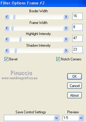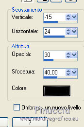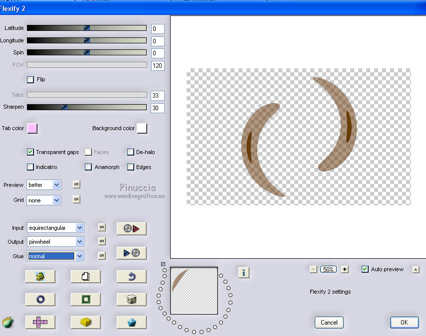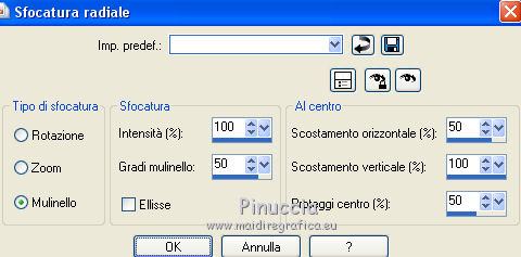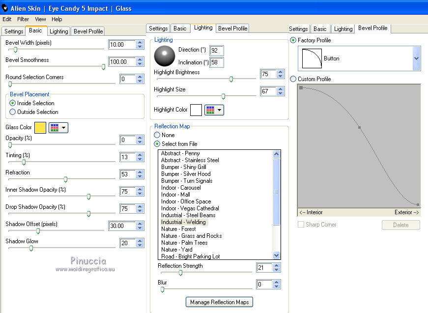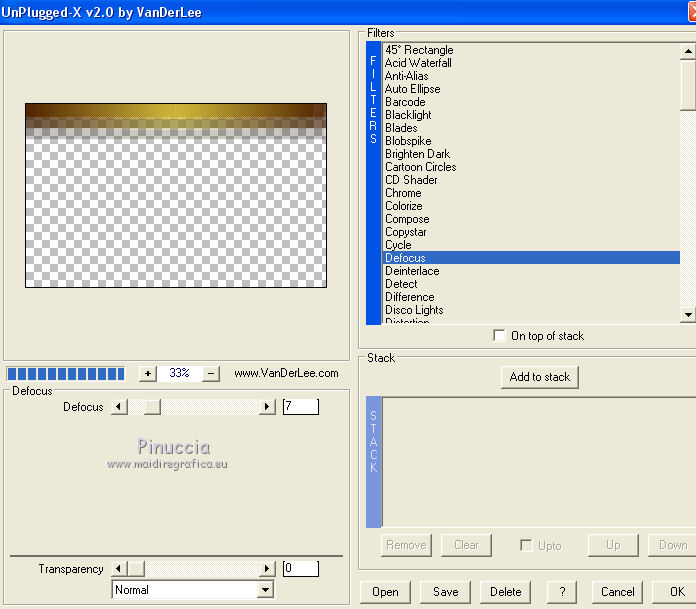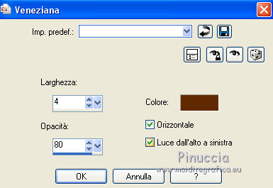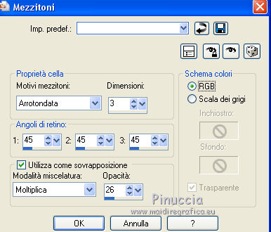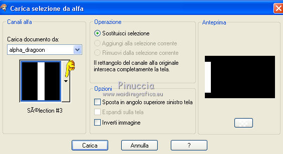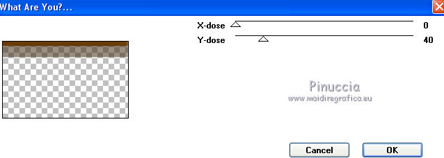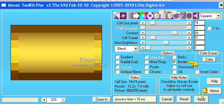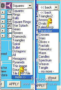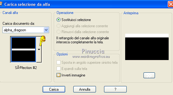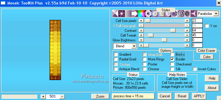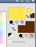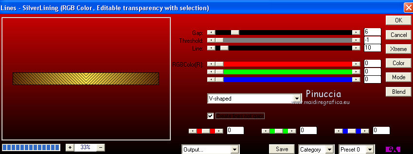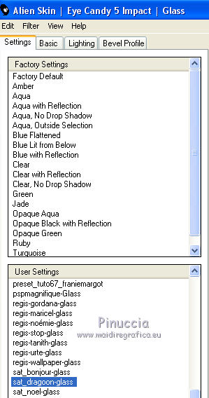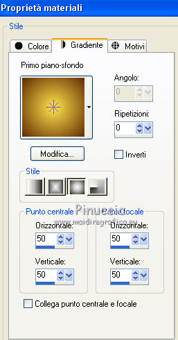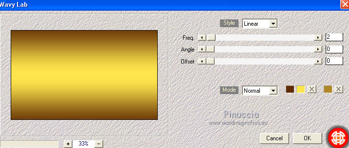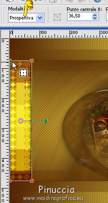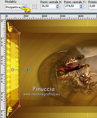 qui puoi trovare qualche risposta ai tuoi dubbi. Se l'argomento che ti interessa non è presente, ti prego di segnalarmelo. Questo tutorial è una creazione di Saturnella e non può essere copiato su altri siti nè essere offerto per il download. Lo stesso vale per la mia traduzione. E' anche proibito togliere il watermark dal materiale; rispettiamo il lavoro dei creatori di tubes, senza i quali non potremmo creare tutorials. Il tutorial è stato scritto con CorelX15, ma può essere eseguito anche con le altre versioni di PSP. Dalla versione X4, il comando Immagine>Rifletti è stato sostituito con Immagine>Capovolgi in orizzontale, e il comando Immagine>Capovolgi con Immagine>Capovolgi in verticale. Nelle versioni X5 e X6, le funzioni sono state migliorate rendendo disponibile il menu Oggetti. Vedi la scheda sull'argomento qui Per tradurre questo tutorial ho usato PSP X. Occorrente: Materiale qui Per i tubes grazie Didier, Choupette e Krys. (in questa pagina trovi i links ai loro siti). Filtri in caso di dubbi, ricorda di consultare la mia sezione filtri qui Filters Unlimited 2.0 qui VanDerLee - Unplugged-x qui Mehdi - Wavy Lab qui Flaming Pear - Flexify 2 qui Bordermania - Frame#2 qui Alien Skin Eye Candy 5 Impact - Glass qui AP 01 [Innovations] - Lines SilverLining qui Toadies - What are you qui Lotis Filter - Mosaic Toolkit 2.55 qui I filtri Toadies, si possono usare da soli o importati in Filters Unlimited (come fare vedi qui) Se un filtro fornito appare con questa icona ![]() non esitare a cambiare modalità di miscelatura e opacità secondo i colori utilizzati. 1. Imposta il colore di primo piano con il colore chiaro #ffe54c, e il colore di sfondo con il colore scuro #602a02. ![]() Passa il colore di primo piano a Gradiente di primo piano/sfondo, stile Sprazzo di luce. ![]() 2. Apri alpha_dragoon. Finestra>Duplica, o sulla tastiera maiuscola+D, per fare una copia. Chiudi l'originale. La copia, che sarà la base del tuo lavoro, non è vuota, ma contiene le selezioni salvate sul canale alfa. Rinomina il livello Raster 1 3. Effetti>Plugins>Mehdi - Wavy Lab. Questo filtro lavora con i colori della paletta materiali. Il primo è il colore di sfondo, il secondo quello di primo piano. Mantieni il terzo colore creato dal filtro. ![]() 3. Regola>Sfocatura>Sfocatura gaussiana - raggio 20. ![]() 4. Effetti>Plugins>LOtis Filter - Mosaic Toolkit 2.55. ![]() 5. Selezione>Carica/Salva selezione>Carica selezione da canale alfa. La selezione sélection1 è subito disponibile. Devi soltanto cliccare Carica. ![]() Selezione>Innalza selezione a livello. 6. Livelli>Nuovo livello raster. Apri il tube del dragone di Didier e vai a Modifica>Copia. non chiuderlo perchè ti servirà ancora Torna al tuo lavoro e vai a Modifica>Incolla nella selezione. Selezione>Deseleziona. 7. Effetti>Effetti di immagine>Motivo unico. ![]() 8. Selezione>Carica/Salva selezione>Carica selezione da canale alfa. Carica nuovamente la selezione sélection1. ![]() Selezione>Inverti. Premi sulla tastiera il tasto CANC ![]() Di nuovo Selezione>Inverti. Regola>Sfocatura>Sfocatura radiale. ![]() Livelli>Unisci>Unisci giù. 9. Effetti>Effetti artistici>Mezzitoni. ![]() 10. Effetti>Effetti 3D>Sfalsa ombra. ![]() Selezione>Deseleziona. Livelli>Unisci>Unisci giù. 11. Selezione>Carica/Salva selezione>Carica selezione da canale alfa. Apri il menu delle selezioni e carica Selection 2. ![]() Selezione>Innalza selezione a livello. 12. Effetti>Effetti di trama>Veneziana, colore di sfondo. ![]() Selezione>Deseleziona. 13. Effetti>Plugins>Toadies - What are you. ![]() Regola>Messa a fuoco>Metti a fuoco. 14. Livelli>Duplica. Immagine>Capovolgi. Livelli>Unisci>Unisci giù. 15. Effetti>Plugins>Flaming Pear - Flexify 2. ![]() 16. Effetti>Effetti 3D>Sfalsa ombra. ![]() Effetti>Effetti di bordo>Aumenta. 17. Effetti>Plugins>Alien Skin Eye Candy 5 Impact - Glass. Seleziona il preset sat_dragoon-glass e ok. ![]() In caso di problemi con il preset, puoi copiare i settaggi che vedi nella schermata. ![]() 18. Apri il tube del paesaggio di Krys e vai a Modifica>Copia. Torna al tuo lavoro e vai a Modifica>Incolla come nuovo livello. Immagine>Ridimensiona, al 70%, tutti i livelli non selezionato. Livelli>Disponi>Sposta giù. 10. Attiva il livello superiore (la forma). Immagine>Ridimensiona, 120 x 80 pixels, mantieni proporzioni e tutti i livelli non selezionati. ![]() Abbassa l'opacità di questo livello al 77%. 11. Selezione>Carica/Salva selezione>Carica selezione da canale alfa. Apri il menu delle selezioni e carica nuovamente Selection 2. ![]() Riempi la selezione con il gradiente.21. Effetti>Plugins>AP 01 [Innovations] - Lines SilverLining. ![]() Selezione>Deseleziona. 22. Effetti>Plugins>VanDerLee Unplugged-x - Defocus. ![]() 23. Livelli>Duplica. Immagine>Capovolgi. Cambia la modalità di miscelatura di questo livello in Schiarisci. Livelli>Unisci>Unisci giù. 24. Livelli>Duplica. Immagine>Rifletti. Abbassa l'opacità di questo livello al 50%. 25. Attiva il livello di sfondo raster 1. Selezione>Carica/Salva selezione>Carica selezione da canale alfa. Apri il menu delle selezioni e carica Selection 3. ![]() Selezione>Innalza selezione a livello. 26. Effetti>Plugins>LOtis Filter - Mosaic Toolkit 2.55. Apri il menu Styles e clicca su More, poi sul menu successivo clicca su Parabolas. ![]() con i seguenti settaggi. ![]() Selezione>Deseleziona. 27. Premi il tasto K per attivare lo strumento Puntatore ![]() se stai usando PSP 9 il tasto D per attivare lo strumento Deformazione ![]() in modalità Prospettiva, spingi il nodo superiore o inferiore a sinistra (il nodo opposto si sposterà simmetricamente), fino ai bordi. (se non visualizzi i Righelli, vai a Visualizza>Righelli) ![]() ![]() Premi il tasto M per deselezionare lo strumento. Regola>Messa a fuoco>Accentua messa a fuoco. 28. Effetti>Effetti 3D>Sfalsa ombra, con i settaggi precedenti. Livelli>Duplica. Immagine>Rifletti. Livelli>Unisci>Unisci visibile. 29. Livelli>Duplica. Immagine>Ridimensiona, all'85%, tut