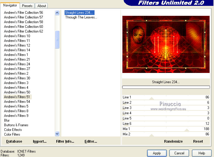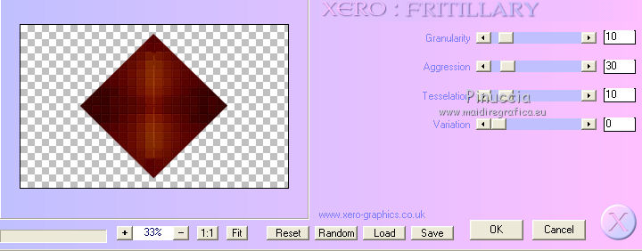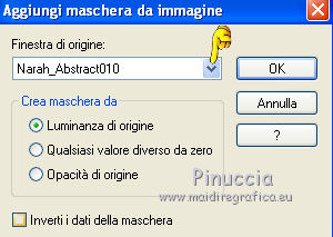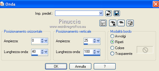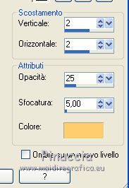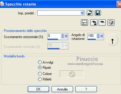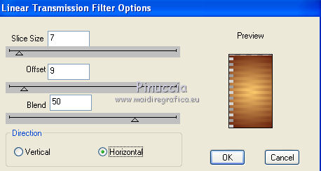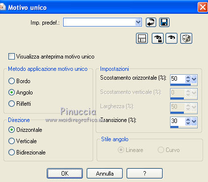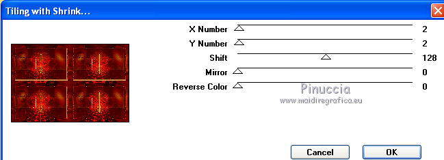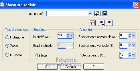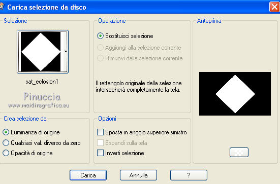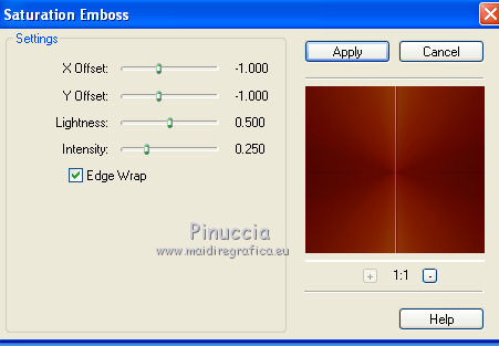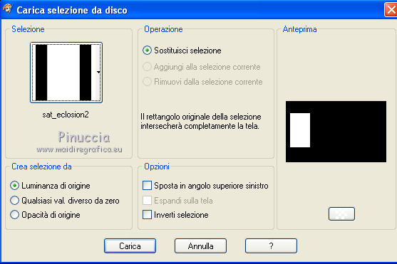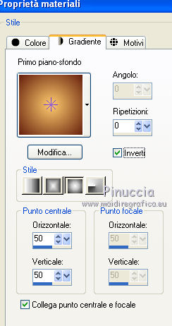 qui puoi trovare qualche risposta ai tuoi dubbi. Se l'argomento che ti interessa non è presente, ti prego di segnalarmelo. Questo tutorial è una creazione di Saturnella e non può essere copiato su altri siti nè essere offerto per il download. Lo stesso vale per la mia traduzione. E' anche proibito togliere il watermark dal materiale; rispettiamo il lavoro dei creatori di tubes, senza i quali non potremmo creare tutorials. Questo tutorial è stato creato con PSP 12, ma può essere eseguito anche con le altre versioni di PSP. Per tradurlo ho usato PSP X. Occorrente: Materiale qui Il tube della donna è di LuzCristina. Il tube del viso è di Mary. Grazie a tutti per il vostro magnifico lavoro. (in questa pagina trovi i links ai loro siti). Filtri in caso di dubbi, ricorda di consultare la mia sezione filtri qui Xero - Fritillary qui Simple - Pizza Slice Mirror, Blintz, 4way average qui FM Tile Tools - Saturation Emboss qui DSB Flux - Linear Transmission qui Toadies - What are you qui Mura's Seamless qui Filters Unlimited 2.0 qui Andrew's Filter 51 qui I filtri Andrew's per essere usati devono prima essere convertiti. Come fare vedi qui Si usano importandoli in Filters Unlimited (come fare vedi qui) ma possono funzionare anche da soli. I filtri forniti sono stati già convertiti. ![]() non esitare a cambiare modalità di miscelatura e opacità secondo i colori utilizzati. Metti le selezioni nella cartella Selezioni. Apri la maschera in PSP e minimizzala con il resto del materiale. 1. Imposta il colore di primo piano con #651e0c, e il colore di sfondo con #ffcc6e. ![]() 2. Apri una nuova immagine trasparente 900 x 550 pixels. Selezione>Seleziona tutto. Apri l'immagine "Eclipse" e vai a Modifica>Copia. Torna al tuo lavoro e vai a Modifica>Incolla nella selezione. Selezione>Deseleziona. 3. Effetti>Effetti di immagine>Motivo unico, con i settaggi standard. ![]() 4. Regola>Sfocatura>Sfocatura radiale. ![]() 5. Effetti>Plugins>Simple - Pizza slice mirror. 6. Effetti>Plugins>Simple - Blitz - 2 volte. 7. Effetti>Plugins>Simple - 4way average. 8. Effetti>Plugins>FM Tile Tools - Saturation Emboss. ![]() 9. Selezione>Carica/Salva selezione>Carica selezione da disco. Cerca e carica la selezione sat_eclosion1. ![]() Selezione>Innalza selezione a livello. Selezione>Deseleziona. 10. Effetti>Plugins>Xero - Fritillary. ![]() 11. Effetti>Plugins>Toadies - What are you. ![]() 12. Immagine>Ridimensiona, al 60%, tutti i livelli non selezionato. Effetti>Effetti di bordo>Aumenta di più. 13. Effetti>Effetti di immagine>Motivo unico. ![]() 14. Effetti>Effetti di immagine>Scostamento. ![]() Cambia la modalità di miscelatura di questo livello in Indebolisci (o secondo i tuoi colori). 15. Livelli>Unisci>Unisci visibile. 16. Apri il tube sat_element1 e vai a Modifica>Copia. Torna al tuo lavoro e vai a Modifica>Incolla come nuovo livello. Spostalo come nel mio esempio.17. Effetti>Effetti 3D>Sfalsa ombra. ![]() 18. Livelli>Nuovo livello raster. Riempi con il colore scuro.19. Livelli>Nuovo livello maschera>da immagine. Apri il menu sotto la finestra di origine e vedrai la lista dei files aperti. Seleziona la maschera Narah_Abstract010, con i seguenti settaggi. ![]() Effetti>Effetti di bordo>Aumenta. Livelli>Unisci>Unisci gruppo. Cambia la modalità di miscelatura di questo livello in Indebolisci. 20. Effetti>Effetti 3D>Sfalsa ombra. ![]() Livelli>Unisci>Unisci visibile. 21. Selezione>Carica/Salva selezione>Carica selezione da disco. Cerca e carica la selezione sat_eclosion2. ![]() Selezione>Innalza selezione a livello. 22. Passa il colore di primo piano a Gradiente, stile Sprazzo di luce. ![]() Livelli>Nuovo livello raster. Riempi il livello con il gradiente.23. Effetti>Plugins>DSB Flux - Linear Transmission. ![]() Selezione>Deseleziona. 24. Effetti>Effetti di distorsione>Onda. ![]() 25. Effetti>Effetti di riflesso>Specchio rotante. ![]() 26. Effetti>Effetti 3D>Sfalsa ombra, con il colore chiaro. ![]() Cambia la modalità di miscelatura di questo livello in Luce netta, e abbassa l'opacità al 60% (o secondo i tuoi colori). 27. Apri il tube del viso di Mary e vai a Modifica>Copia. Torna al tuo lavoro e vai a Modifica>Incolla come nuovo livello. Immagine>Ridimensiona, al 40%, tutti i livelli non selezionato. 28. Effetti>Effetti 3D>Sfalsa ombra. ![]() Cambia la modalità di miscelatura di questo livello in Sovrapponi. Livelli>Unisci>Unisci visibile. Modifica>Copia. 29. Immagine>Aggiungi bordatura, 2 pixels, simmetriche, con il colore chiaro. Immagine>Aggiungi bordatura, 2 pixels, simmetriche, con il colore scuro. Immagine>Aggiungi bordatura, 10 pixels, simmetriche, con il colore chiaro. Seleziona il bordo da 10 pixels con la bacchetta magica ![]() 30. Effetti>Plugins>Simple - Zoom out and flip. 31. Selezione>Inverti. Effetti>Effetti 3D>Sfalsa ombra, con i settaggi precedenti. Selezione>Deseleziona. 32. Immagine>Aggiungi bordatura, 1 pixel, simmetriche, con il colore chiaro. Immagine>Aggiungi bordatura, 50 pixels, simmetriche, con un colore contrastante. Seleziona questo bordo con la bacchetta magica ![]() Modifica>Incolla nella selezione. 33. Effetti>Plugins>Filters Unlimited 2.0 - Andrew's Filter 51 - Straight Lines 234. ![]() 34. Effetti>Plugins>Mura's Seamless - Tiling with Shrink. ![]() 35. Selezione>Inverti. Effetti>Effetti 3D>Sfalsa ombra, con i settaggi precedenti. Selezione>Deseleziona. 36. Apri il tube della donna di LuzCristina e vai a Modifica>Copia. Torna al tuo lavoro e vai a Modifica>Incolla come nuovo livello. Immagine>Rifletti. Sposta il tube a destra.37. Effetti>Effetti 3D>Sfalsa ombra. ![]() 38. Apri il tube "texte" e vai a Modifica>Copia. Torna al tuo lavoro e vai a Modifica>Incolla come nuovo livello. Sposta correttamente il testo.Aggiungi il tuo nome e/o il tuo watermark su un nuovo livello. 39. Immagine>Aggiungi bordatura, 2 pixels, simmetriche, con il colore chiaro. 40. Immagine>Ridimensiona, a 900 pixels di larghezza, tutti i livelli selezionato. Regola>Messa a fuoco>Metti a fuoco. Salva in forma