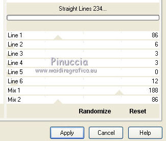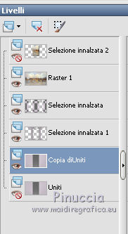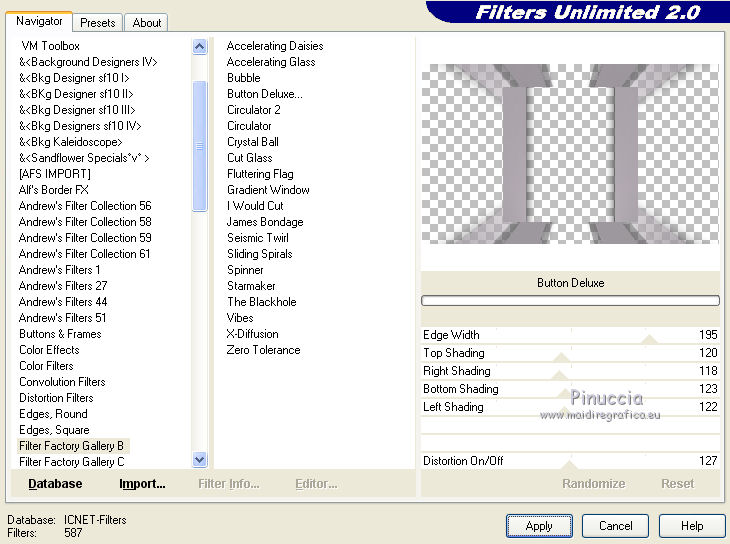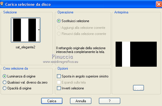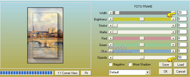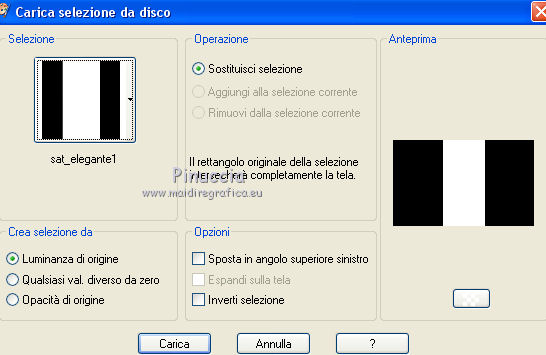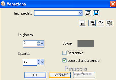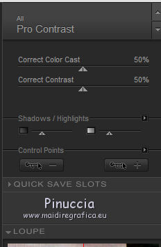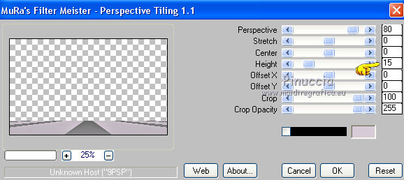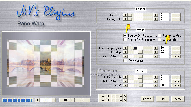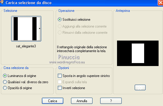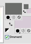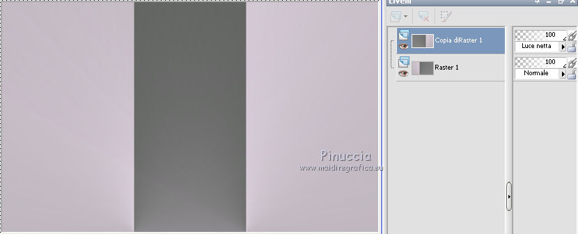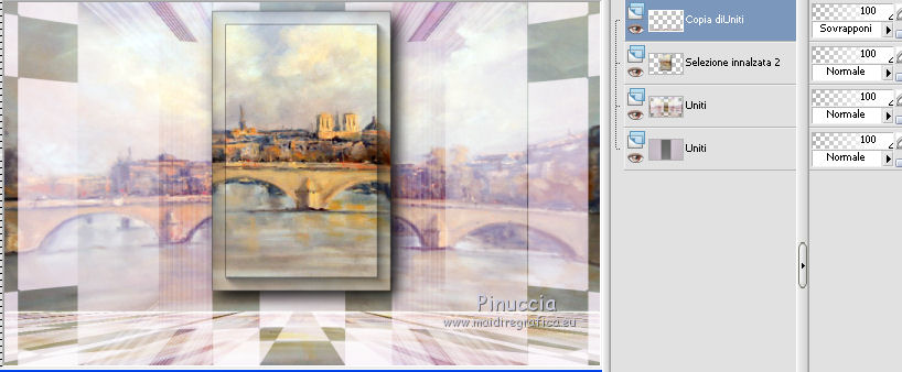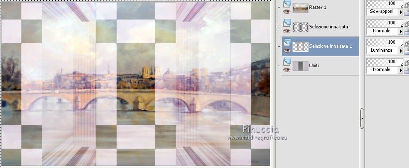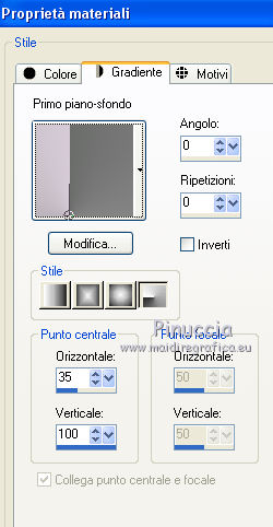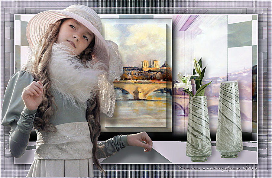 qui puoi trovare qualche risposta ai tuoi dubbi. Se l'argomento che ti interessa non è presente, ti prego di segnalarmelo. Questo tutorial è una creazione di Saturnella e non può essere copiato su altri siti nè essere offerto per il download. Lo stesso vale per la mia traduzione. E' anche proibito togliere il watermark dal materiale; rispettiamo il lavoro dei creatori di tubes, senza i quali non potremmo creare tutorials. Questo tutorial è stato creato con PSP x5, ma può essere eseguito anche con le altre versioni di PSP. Per tradurlo ho usato PSP X. La principale differenza tra le due versioni riguarda le funzioni Immagine>Rifletti/Capovolgi. Vedi la mia scheda qui Occorrente: Materiale qui Per il tube della bambina grazie Castorke. PEr il tube del vaso grazie Créaline. (in questa pagina trovi i links ai loro siti). Filtri in caso di dubbi, ricorda di consultare la mia sezione filtri qui Filters Unlimited 2.0 qui AP 07 Gradient Pattern - Pattern jump qui Mura's Meister - Perspective Tiling qui Filter Factory Gallery B - Button de Luxe qui Andrew's Filter 51 - Straight Lines 234 qui Toadies - What are you qui MV's Plugins - Pano Warp qui AAA Frames - Foto Frame qui Alien Skin Eye Candy 5 Impact - Perspective Shadow qui Nik Software - Color Efex Pro qui I filtri Factory Gallery, Andrews e Toadies si possono usare da soli o importati in Unlimited. (come fare vedi qui) ma possono funzionare anche da soli Se un filtro fornito appare con questa icona In questo tutorial il filtro RCS deve essere usato da solo vanno usati da soli. ![]() non esitare a cambiare modalità di miscelatura e opacità secondo i colori utilizzati. Metti le selezioni nella cartella Selezioni. 1. Imposta il colore di primo piano con #6b6d6b, e il colore di sfondo con il colore #d6cbd6. ![]() Passa il colore di primo piano a Gradiente, stile Radiale. ![]() Apri una nuova immagine trasparente 900 x 550 pixels, e riempila con il gradiente.2. Livelli>Duplica. Immagine>Rifletti. Cambia la modalità di miscelatura di questo livello in Luce netta. ![]() 3. Livelli>Unisci>Unisci visibile. 4. Selezione>Carica/Salva selezione>Carica selezione da disco. Cerca e carica la selezione sat_elegante1. ![]() Selezione>Innalza selezione a livello. 5. Effetti>Plugins>AP 07 Gradients Patterns - Pattern Jump. ![]() Selezione>Deseleziona. 6. Effetti>Effetti di immagine>Motivo unico. ![]() 7. Livelli>Nuovo livello raster. Selezione>Seleziona tutto. Apri l'immagine Paris-Pont-Royal e vai a Modifica>Copia. Torna al tuo lavoro e vai a Modifica>Incolla nella selezione. Selezione>Deseleziona. Cambia la modalità di miscelatura di questo livello in Sovrapponi, o secondo i tuoi colori. ![]() 8. Attiva il livello di sfondo. Selezione>Carica/Salva selezione>Carica selezione da disco. Cerca e carica la selezione sat_elegante2. ![]() Selezione>Innalza selezione a livello. 9. Effetti>Effetti di trama>Veneziana - con il colore scuro di primo piano. ![]() Selezione>Deseleziona. 10. Livelli>Duplica. Immagine>Rifletti. Livelli>Unisci>Unisci giù. 11. Effetti>Effetti 3D>Sfalsa ombra. ![]() 12. Effetti>Plugins>Filters Unlimited 2.0 - Filter Factory Gallery B - Button Deluxe. ![]() Cambia la modalità di miscelatura di questo livello in Luminanza. ![]() 13. Attiva il livello superiore. Selezione>Carica/Salva selezione>Carica selezione da disco. Cerca e carica la selezione sat_elegante3. ![]() Selezione>Innalza selezione a livello. 14. Effetti>Plugins>AAA Frames - Foto Frame. ![]() Selezione>Deseleziona. 15. Effetti>Effetti di immagine>Scostamento. ![]() 16. Effetti>Plugins>Alien Skin Eye Candy5 Impact - Perspective shadow. Seleziona il preset Drop Shadow Blurry e ok. ![]() 17. Attiva nuovamente il livello di sfondo. Livelli>Duplica. Chiudi il livello di sfondo e il livello del quadro, e rimani posizionato sul livello visibile. ![]() Livelli>Unisci>Unisci visibile. 18. Effetti>Plugins>MV's Plugins - Pano Warp. ![]() 19. Riapri i livelli chiusi e attiva il livello di sfondo. Livelli>Duplica. Livelli>Disponi>Porta in alto. Effetti>Plugins>Mura's Meister - Perspective tiling. ![]() *** Per il mio esempio, ho seguito il punto 19 sul secondo livello Uniti. L'esempio di questa variante sotto il titolo. In fondo al tutorial l'esempio usando il livello di sfondo. ![]() e ho cambiato la modalità di miscelatura del livello in Sovrapponi. ![]() *** 20. Effetti>Effetti 3D>Sfalsa ombra. ![]() 21. Attiva il livello di sfondo. Modifica>Copia. 22. Immagine>Aggiungi bordatura, 1 pixel, simmetriche, con il colore scuro. Immagine>Aggiungi bordatura, 3 pixels, simmetriche, con il colore chiaro. Immagine>Aggiungi bordatura, 1 pixel, simmetriche, con il colore scuro. Immagine>Aggiungi bordatura, 50 pixels, simmetriche, con il colore chiaro. 23. Attiva lo strumento Bacchetta magica ![]() e clicca nel bordo da 50 pixels per selezionarlo. Modifica>Incolla nella selezione. 24. Regola>Sfocatura>Sfocatura gaussiana - raggio 25. ![]() 25. Effetti>Plugins>Filters Unlimited 2.0 - Andrews Filter 51 - Straight lines 234. ![]() 26. Effetti>Plugins>Toadies - What are you - 2 volte con i settaggi standard. ![]() Effetti>Effetti di bordo>Aumenta. 27. Selezione>Inverti. Effetti>Effetti 3D>Sfalsa ombra. ![]() 28. Apri il tube della bambina di Castorke e vai a Modifica>Copia. Torna al tuo lavoro e vai a Modifica>Incolla come nuovo livello. 32. Effetti>Effetti 3D>Sfalsa ombra. ![]() 33. Apri il tube del vaso di Créaline e vai a Modifica>Copia. Torna al tuo lavoro e vai a Modifica>Incolla come nuovo livello. 34. Effetti>Effetti 3D>Sfalsa ombra. ![]() 35. Aggiungi il tuo nome e/o il tuo watermark su un nuovo livello. 36. Attiva il livello di sfondo. Effetti>Plugins>Nik Software - Color Efex Pro - Pro contrast. ![]() 37. Immagine>Aggiungi bordatura, 1 pixel, simmetriche, con il colore nero. Immagine>Ridimensiona, a 900 pixels di larghezza, tuttii livelli selezionato. Regola>Messa a fuoco>Maschera di contrasto. ![]() Esempio senza la variante del punto 19. ![]() Per questo esempio ho usato tubes di 