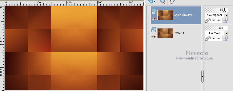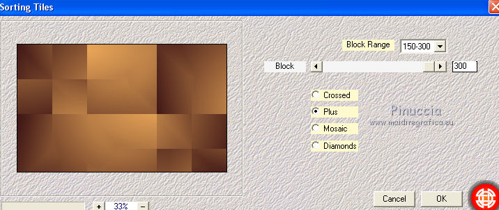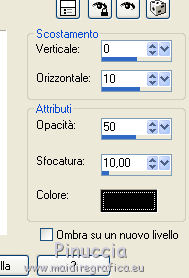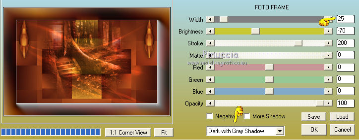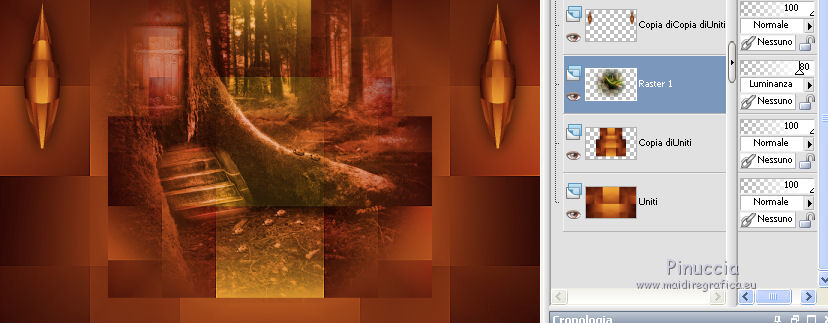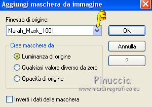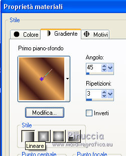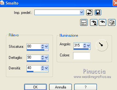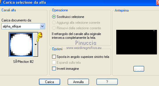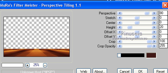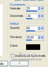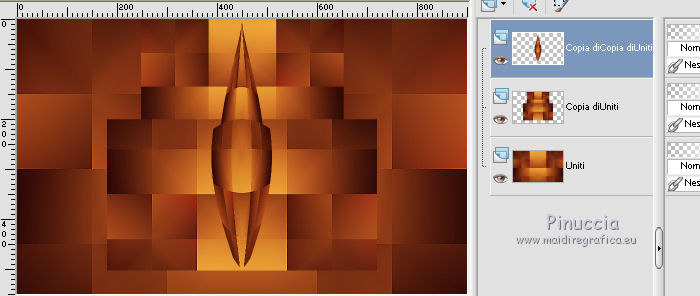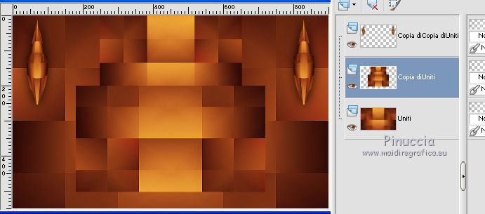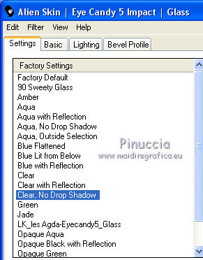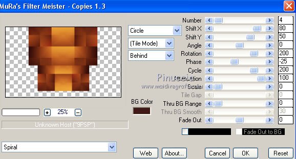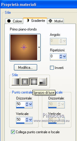 qui puoi trovare qualche risposta ai tuoi dubbi. Se l'argomento che ti interessa non è presente, ti prego di segnalarmelo. Questo tutorial è una creazione di Saturnella e non può essere copiato su altri siti nè essere offerto per il download. Lo stesso vale per la mia traduzione. E' anche proibito togliere il watermark dal materiale; rispettiamo il lavoro dei creatori di tubes, senza i quali non potremmo creare tutorials. Per tradurre questo tutorial, creato con PSP16, ho usato CorelX, ma può essere eseguito anche con le altre versioni di PSP. Dalla versione X4, il comando Immagine>Rifletti è stato sostituito con Immagine>Capovolgi in orizzontale, e il comando Immagine>Capovolgi con Immagine>Capovolgi in verticale. Nelle versioni X5 e X6, le funzioni sono state migliorate rendendo disponibile il menu Oggetti. Nel nuovo X7 sono tornati i comandi Immagine>Rifletti e Immagine>Capovolgi, ma con nuove funzioni. Vedi la scheda sull'argomento qui Occorrente: Materiale qui Grazie: per i tubes Krys e Yoka e per la maschera Narah (in questa pagina trovi i links ai loro siti). Filtri in caso di dubbi, ricorda di consultare la mia sezione filtri qui Mehdi - Sorting Tiles qui Mura's Meister - Copies qui Mura's Meister - Perspective Tiling qui Alien Skin Eye Candy 5 Impact - Glass qui AAA Frames - Foto Frame qui ![]() non esitare a cambiare modalità di miscelatura e opacità secondo i colori utilizzati. Nelle ultime versioni di PSP non c'è il gradiente di primo piano/sfondo (Corel_06_029) Puoi usare i gradienti delle versioni precedenti. Trovi qui i gradienti Corel X. Apri la maschera in PSP e minimizzala con il resto del materiale. Imposta il colore di primo piano con il colore chiaro #eba759 e il colore di sfondo con il colore scuro #401916. ![]() Passa il colore di primo piano a Gradiente di primo piano/sfondo, stile Sprazzo di luce ![]() 1. Apri alpha_elfique. Finestra>Duplica, o sulla tastiera maiuscola+D, per fare una copia. ![]() Chiudi l'originale. La copia, che sarà la base del tuo lavoro, non è vuota, ma contiene le selezioni salvate sul canale alfa. Riempi l'immagine trasparente con il gradiente.2. Effetti>Plugins>Mehdi - Sorting Tiles. ![]() Regola>Messa a fuoco>Accentua messa a fuoco. 3. Livelli>Duplica. Immagine>Rifletti. Cambia la modalità di miscelatura di questo livello in Sovrapponi, o altro, e abbassa l'opacità all'85%. ![]() Livelli>Unisci>Unisci visibile. 4. Livelli>Duplica. Immagine>Ridimensiona, al 60%, tutti i livelli non selezionato. 5. Effetti>Plugins>Mura's Meister - Copies. ![]() Immagine>Capovolgi. 6. Effetti>Effetti di immagine>Scostamento. ![]() 7. Livelli>Duplica. Effetti>Effetti geometrici>Cerchio ![]() Modifica>Ripeti Cerchio. Di nuovo Modifica>Ripeti Cerchio. Risultato ![]() 8. Immagine>Ridimensiona, al 50%, tutti i livelli non selezionato. Effetti>Effetti di immagine>Scostamento. ![]() Livelli>Duplica. Immagine>Rifletti. Livelli>Unisci>Unisci giù. 9. Effetti>Effetti 3D>Sfalsa ombra. ![]() 10. Attiva il livello sottostante. ![]() Apri il tube del paesaggio di Krys e vai a Modifica>Copia. Torna al tuo lavoro e vai a Modifica>Incolla come nuovo livello. Cancella la firma. Posiziona correttamente il tubeCambia la modalità di miscelatura di questo livello in Luminanza, o altro, e abbassa l'opacità all'80%. ![]() 11. Attiva il livello di sfondo, Uniti Livelli>Duplica. Effetti>Plugins>Mura's Meister - Perspective Tiling. ![]() Livelli>Disponi>Porta in alto. 12. Selezione>Carica/Salva selezione>Carica selezione da canale alfa. La selezione Sélection#1 è subito disponibile. Devi soltanto cliccare Carica. ![]() Premi sulla tastiera il tasto CANC ![]() Selezione>Deseleziona. 13. Apri il tube della donna elfo di Krys e vai a Modifica>Copia. Torna al tuo lavoro e vai a Modifica>Incolla come nuovo livello. Cancella la firma. Immagine>Rifletti. Sposta il tube a sinistra.14. Effetti>Effetti 3D>Sfalsa ombra. ![]() 15. Apri il tube dell'elfo bambino di Yoka e vai a Modifica>Copia. Torna al tuo lavoro e vai a Modifica>Incolla come nuovo livello. Immagine>Rifletti. Immagine>Ridimensiona, all'80%, tutti i livelli non selezionato. Regola>Messa a fuoco>Metti a fuoco. Spostalo a destra.16. Effetti>Effetti 3D>Sfalsa ombra. ![]() 17. Selezione>Carica/Salva selezione>Carica selezione da canala alfa. apri il menu delle selezioni e carica sélection#2. ![]() Livelli>Nuovo livello raster. Riporta il colore di primo piano a Colore, e riempi la selezione con il colore chiaro di primo piano.18. Effetti>Plugins>Alien Skin Eye Candy 5 Impact - Glass. Seleziona il preset Clear no drop shadow e ok. ![]() Selezione>Deseleziona. 19. Livelli>Duplica. Immagine>Capovolgi. 20. Effetti>Effetti di immagine>Scostamento. ![]() Livelli>Unisci>Unisci giù. 21. Livelli>Duplica. Immagine>Rifletti. Porta questo livello sotto il livello del tube della donna. Attiva il livello superiore. 22. Apri il wordart di Yoka e vai a Modifica>Copia. Torna al tuo lavoro e vai a Modifica>Incolla come nuovo livello. Immagine>Ridimensiona, al 70%, tutti i livelli non selezionato. Abbassa l'opacità di questo livello all'85%. 23. Effetti>Effetti 3D>Sfalsa ombra. ![]() Sposta il testo in alto.24. Attiva il livello del paesaggio. Livelli>Nuovo livello raster. Riempi con il colore chiaro.Livelli>Nuovo livello maschera>Da immagine. Apri il menu sotto la finestra di origine e vedrai la lista dei files aperti. seleziona la maschera Narah_Mask_1001 ![]() Effetti>Effetti di bordo>Aumenta. Livelli>Unisci>Unisci gruppo. Cambia la modalità di miscelatura di questo livello in Indebolisci, e abbassa l'opacità al 46%. 25. Immagine>Aggiungi bordatura, 1 pixel, simmetriche, colore scuro. Immagine>Aggiungi bordatura, 3 pixels, simmetriche, colore di chiaro. Immagine>Aggiungi bordatura, 1 pixel, simmetriche, colore scuro. Immagine>Aggiungi bordatura, 50 pixels, simmetriche, colore chiaro. 26. Attiva lo strumento Bacchetta magica ![]() e clicca nel bordo di 50 pixels per selezionarlo. 27. Passa il colore di primo piano a Gradiente di 