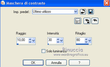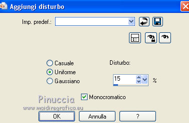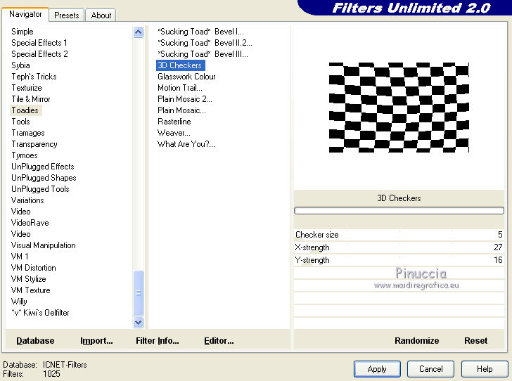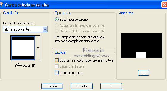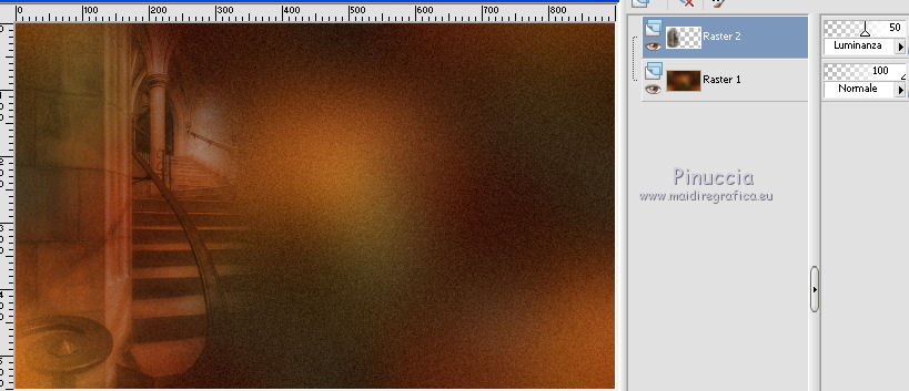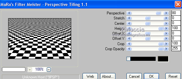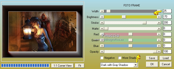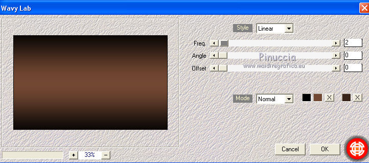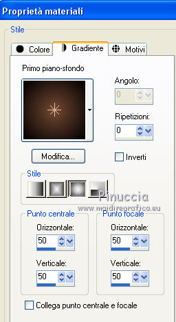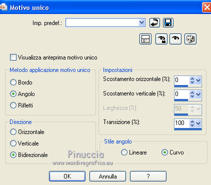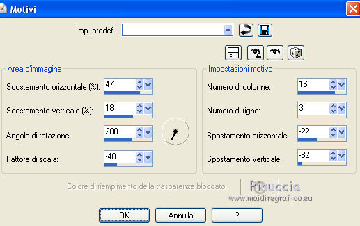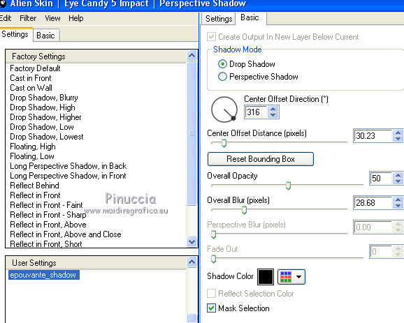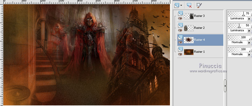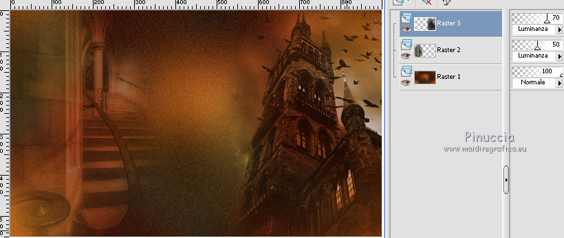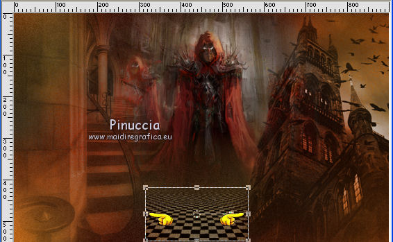 qui puoi trovare qualche risposta ai tuoi dubbi. Se l'argomento che ti interessa non è presente, ti prego di segnalarmelo. Questo tutorial è una creazione di Saturnella e non può essere copiato su altri siti nè essere offerto per il download. Lo stesso vale per la mia traduzione. E' anche proibito togliere il watermark dal materiale; rispettiamo il lavoro dei creatori di tubes, senza i quali non potremmo creare tutorials. Per tradurre questo tutorial, creato con PSP18, ho usato CorelX, ma può essere eseguito anche con le altre versioni di PSP. Dalla versione X4, il comando Immagine>Rifletti è stato sostituito con Immagine>Capovolgi in orizzontale, e il comando Immagine>Capovolgi con Immagine>Capovolgi in verticale. Nelle versioni X5 e X6, le funzioni sono state migliorate rendendo disponibile il menu Oggetti. Nel nuovo X7 sono tornati i comandi Immagine>Rifletti e Immagine>Capovolgi, ma con nuove funzioni. Vedi la scheda sull'argomento qui Occorrente: Materiale qui Grazie per i tubes Guismo, Krys, Linda e Angel Keeper. (in questa pagina trovi i links ai loro siti). Filtri in caso di dubbi, ricorda di consultare la mia sezione filtri qui Filters Unlimited 2.0 qui Mehdi - Wavy Lab qui Toadies - 3D Checkers qui il singolo effetto lo trovi nel materiale Alien Skin Eye Candy 5 Impact - Perspective Shadow qui Mura's Meister - Perspective Tiling qui AAA Frames - Foto Frame qui I filtri Toadies si possono usare da soli o importati in Filters Unlimited (come fare vedi qui) Se un filtro fornito appare con questa icona ![]() non esitare a cambiare modalità di miscelatura e opacità secondo i colori utilizzati. Nelle ultime versioni di PSP non c'è il gradiente di primo piano/sfondo (Corel_06_029) Trovi i gradienti delle versioni precedenti qui Metti il preset Cliccando sul file una o due volte (a seconda delle tue impostazioni), automaticamente il preset si installerà nella cartella corretta. perchè uno o due clic vedi qui 1. Imposta il colore di primo piano con il colore chiaro #734833, e il colore di sfondo con il colore nero #000000. ![]() Passa il colore di primo piano a Gradiente di primo piano/sfondo, stile Sprazzo di luce. ![]() Apri alpha_epouvante. Finestra>Duplica o sulla tastiera maiuscola+D per fare una copia. ![]() Chiudi l'originale. La copia, che sarà la base del tuo lavoro, non è vuota, ma contiene una selezione salvata sul canale alfa. 2. Effetti>Plugins>Mehdi - Wavy Lab. questo filtro lavora con i colori della paletta: il primo è il colore di sfondo, il secondo quello di primo piano, mantieni l'ultimo colore creato dal filtro. ![]() 3. Livelli>Nuovo livello raster. Selezione>Seleziona tutto. Apri l'immagine bubble_ice_2b_I2.jpg, e vai a Modifica>Copia. Torna al tuo lavoro e vai a Modifica>Incolla nella selezione. Selezione>Deseleziona. 4. Effetti>Effetti di immagine>Motivo unico. ![]() 5. Regola>Sfocatura>Sfocatura gaussiana - raggio 50. ![]() Livelli>Unisci>Unisci giù. 6. Regola>Aggiungi/Rimuovi disturbo>Aggiungi disturbo. ![]() 7. Apri il tube della scala di Angel Keeper e vai a Modifica>Copia. Torna al tuo lavoro e vai a Modifica>Incolla come nuovo livello. Immagine>Rifletti (con X17/18: Immagine>Rifletti>Rifletti orizzontalmente). Spostalo contro il bordo a sinistra.Cambia la modalità di miscelatura di questo livello in Luminanza, o secondo i tuoi colori, e abbassa l'opacità al 50%. ![]() 8. Effetti>Effetti 3D>Sfalsa ombra. ![]() 9. Apri il tube LF-HalloweenCastle-24102014, cancella la firma e vai a Modifica>Copia. Torna al tuo lavoro e vai a Modifica>Incolla come nuovo livello. 10. Sposta il tube a destra.Cambia la modalità di miscelatura di questo livello in Luminanza, o altro, e abbassa l'opacità al 70%. ![]() 11. Effetti>Effetti 3D>Sfalsa ombra, con i settaggi precedenti. 12. Apri il tube Krysmisthalloween-31-08-014-012, cancella la firma e vai a Modifica>Copia. Torna al tuo lavoro, attiva il livello inferiore e vai a Modifica>Incolla come nuovo livello. Sposta il tube un po' più in alto.![]() 13. Attiva nuovamente il livello inferiore. Selezione>Carica/Salva selezione>Carica selezione da canale alfa. La selezione sélection#1 è subito disponibile. Devi soltanto cliccare Carica. ![]() Selezione>Innalza selezione a livello. Riempi la selezione con il gradiente.Mantieni selezionato. 14. Effetti>Plugins>Filters Unlimited 2.0 - Toadies - 3D Checkers. ![]() Cambia la modalità di miscelatura di questo livello in Luce diffusa, o altro. Mantieni ancora selezionato. 15. Effetti>Plugins>Mura's Meister - Perspective Tiling. ![]() Selezione>Deseleziona. 16. Tasto K per attivare lo strumento Puntatore ![]() se stai usando PSP 9 il tasto D per attivare lo strumento Deformazione ![]() e spingi i nodi centrali un po' verso destra e un po' verso sinistra ![]() Tasto M per deselezionare lo strumento. 17. Attiva il livello superiore. Apri il tube della donna calguisafraid1999, e vai a Modifica>Copia. Torna al tuo lavoro e vai a Modifica>Incolla come nuovo livello. Immagine>Ridimensiona, all'80%, tutti i livelli non selezionato. Regola>Messa a fuoco>Metti a fuoco. 18. Effetti>Plugins>Alien Skin Eye Candy 5 Impact - Perspective Shadow. Seleziona il preset epouvante_shadow e ok. Questi i settaggi in caso di problemi con il preset. ![]() 19. Attiva il livello di sfondo. Modifica>Copia. 20. Immagine>Aggiungi bordatura, 1 pixel, simmetriche, colore nero. Immagine>Aggiungi bordatura, 1 pixel, simmetriche, colore chiaro. Immagine>Aggiungi bordatura, 50 pixels, simmetriche, colore bianco. 21. Attiva lo strumento Bacchetta magica ![]() e clicca nel bordo bianco per selezionarlo. Modifica>Incolla nella selezione. 22. Effetti>Effetti di riflesso>Motivi. ![]() 23. Effetti>Plugins>AAA Frames - Foto Frame, prima selezione Dark with grey shadow, e poi cambia Width con 25. ![]() 24. Selezione>Inverti. Effetti>Effetti 3D>Sfalsa ombra. ![]() Modifica>Ripeti Sfalsa ombra. Selezione>Deseleziona. 25. Apri il tube titre, e vai a Modifica>Copia. Torna al tuo lavoro e vai a Modifica>Incolla come 