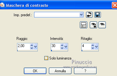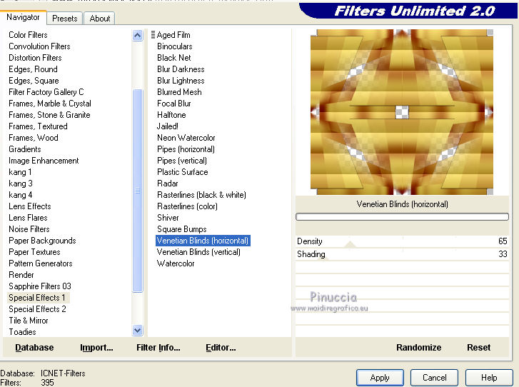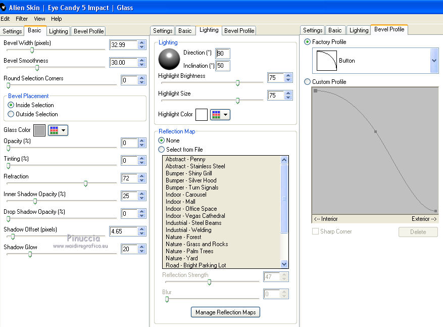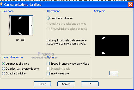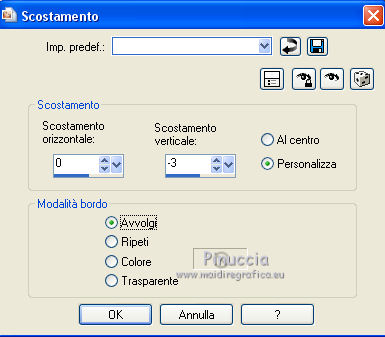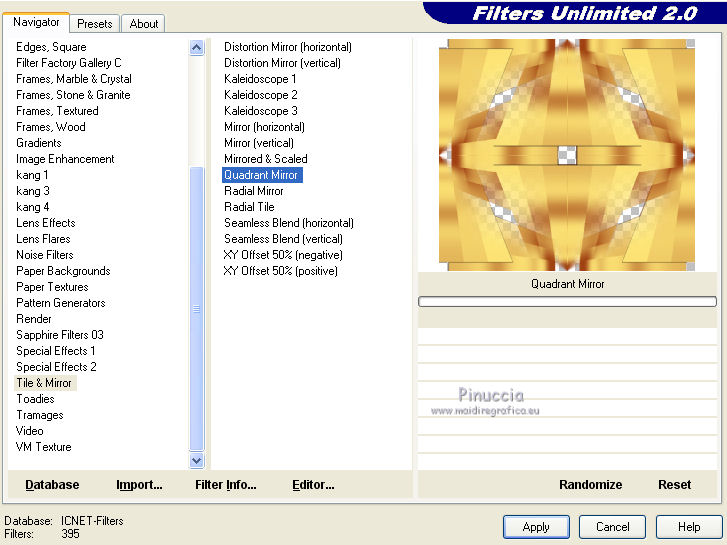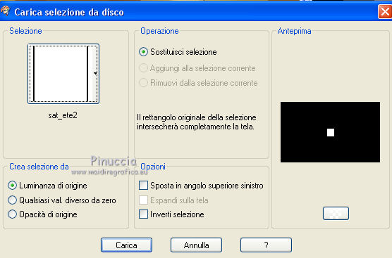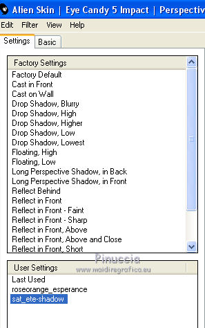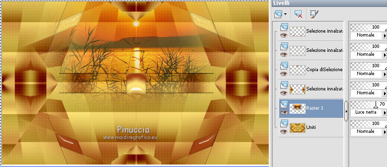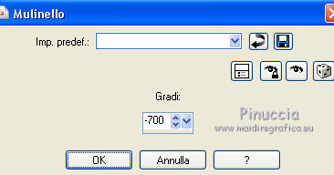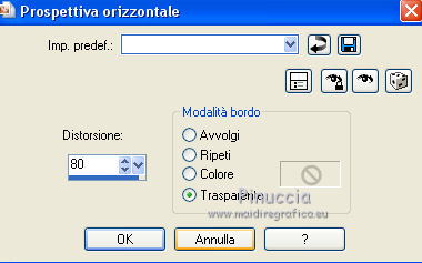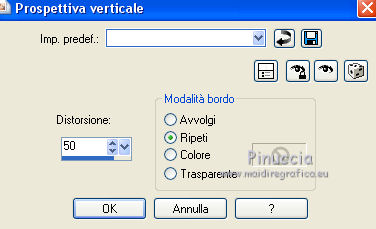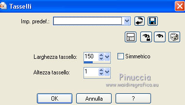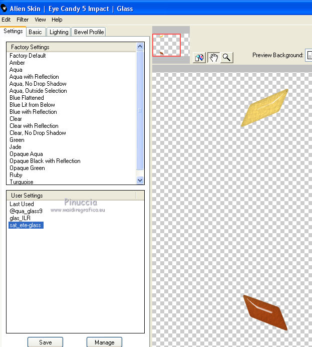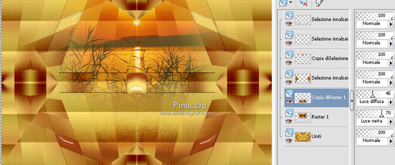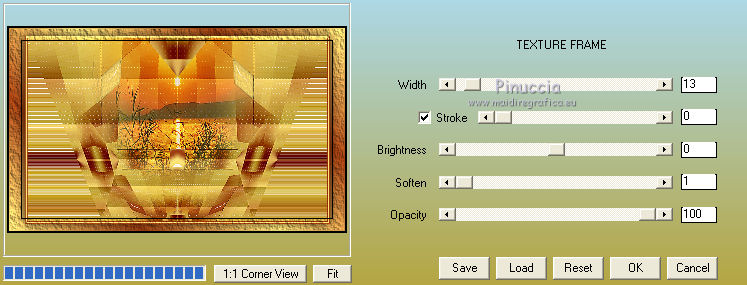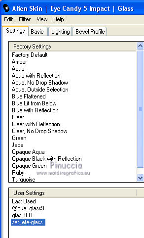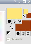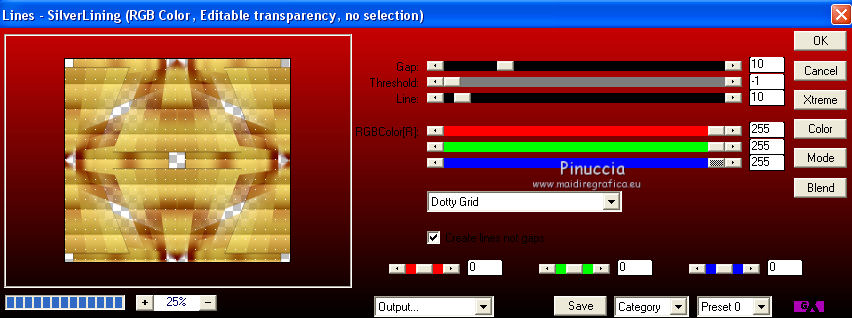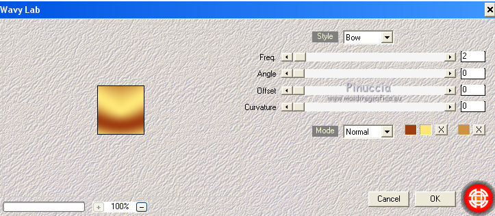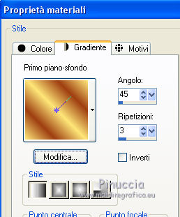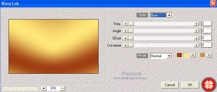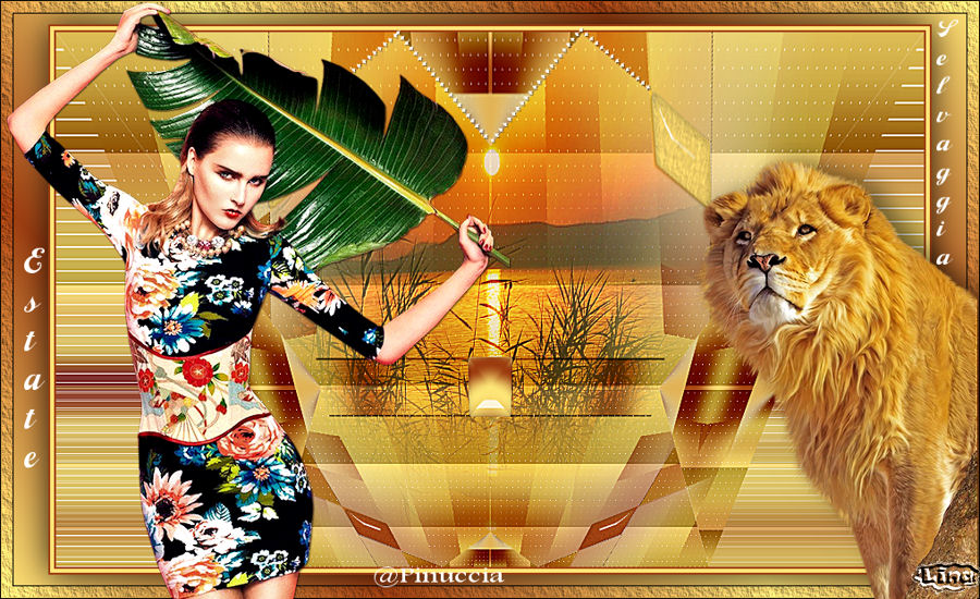 qui puoi trovare qualche risposta ai tuoi dubbi. Se l'argomento che ti interessa non è presente, ti prego di segnalarmelo. Questo tutorial è una creazione di Saturnella e non può essere copiato su altri siti nè essere offerto per il download. Lo stesso vale per la mia traduzione. E' anche proibito togliere il watermark dal materiale; rispettiamo il lavoro dei creatori di tubes, senza i quali non potremmo creare tutorials. Questo tutorial è stato creato con PSP x5, ma può essere eseguito anche con le altre versioni di PSP. Per tradurlo ho usato PSP X. La principale differenza tra le due versioni riguarda le funzioni Immagine>Rifletti/Capovolgi. Vedi la mia scheda qui Occorrente: Materiale qui Per i tubes grazie Syl, Luz Cristina e Gerry. (in questa pagina trovi i links ai loro siti). Filtri in caso di dubbi, ricorda di consultare la mia sezione filtri qui Filters Unlimited 2.0 qui Mehdi - Wavy Lab qui AP 01 Innovations - Lines SilverLining qui AAA Frames - Foto Frame qui Alien Skin Eye Candy 5 Impact - Perspective Shadow, Glass qui ![]() non esitare a cambiare modalità di miscelatura e opacità secondo i colori utilizzati. Metti i preset Cliccando sul file una o due volte (a seconda delle tue impostazioni), automaticamente il preset si installerà nella cartella corretta. perchè uno o due clic vedi qui Metti la trama nella cartella Trame. Metti le selezioni nella cartella Selezioni. 1. Imposta il colore di primo piano con #fee678, e il colore di sfondo con #9e3e11. ![]() 2. Apri una nuova immagine trasparente 900 x 550 pixels. Effetti>Plugins>Mehdi - Wavy Lab. Il filtro lavora con i colori impostati nella paletta dei materiali. Il primo è il colore di sfondo, il secondo il colore di primo piano. Mantieni il terzo colore creato dal filtro. ![]() 2. Effetti>Effetti di distorsione>Mulinello. ![]() 3. Regola>Sfocatura>Sfocatura gaussiana - raggio 20. ![]() 4. Effetti>Effetti di distorsione>Tasselli. ![]() 5. Livelli>Duplica. Immagine>Ruota per gradi - 90 gradi a sinistra. ![]() 6. Effetti>Effetti geometrici>Prospettiva orizzontale. ![]() 7. Effetti>Effetti 3D>Sfalsa ombra. ![]() 8. Livelli>Duplica. Immagine>Rifletti. Livelli>Unisci>Unisci giù. 9. Livelli>Duplica. Immagine>Ruota per gradi - 90 gradi a sinistra. ![]() Livelli>Unisci>Unisci giù. 10. Effetti>Effetti di immagine>Motivo unico, con i settaggi standard. ![]() 11. Effetti>Plugins>Filters Unlimited 2.0 - Tile and Mirror - Quadrant Mirror. ![]() 12. Effetti>Plugins>Filters Unlimited 2.0 - Special Effect 1 - Venetian Blinds (horizontal). ![]() 13. Effetti>Plugins>AP 01 [Innovations] - Lines SilverLining. ![]() Livelli>Unisci>Unisci visibile. 14. Selezione>Carica/Salva selezione>Carica selezione da disco. Cerca e carica la selezione sat_ete1. ![]() Selezione>Innalza selezione a livello. 15. Effetti>Effetti di trama>Trama - seleziona la trama Lace con i seguenti settaggi. ![]() Selezione>Deseleziona. 16. Effetti>Plugins>Alien Skin Eye Candy 5 Impact - Glass. Seleziona il preset sat_ete-glass e ok. ![]() Questi i settaggi che, in caso di problemi con il preset, puoi impostare manualmente. ![]() 17. Livelli>Duplica. Immagine>Rifletti. Livelli>Unisci>Unisci giù. 18. Effetti>Effetti 3D>Sfalsa ombra. ![]() 19. Attiva il livello di sfondo. Selezione>Carica/Salva selezione>Carica selezione da disco. Cerca e carica la selezione sat_ete2. ![]() Selezione>Innalza selezione a livello. 20. Effetti>Plugins>Mehdi - Wavy Lab. ![]() Selezione>Deseleziona. 21. Effetti>Plugins>Alien Skin Eye Candy 5 Impact - Glass, con i settaggi precedenti. ![]() 22. Immagine>Capovolgi. Effetti>Effetti di immagine>Scostamento. ![]() 23. Attiva il livello di sfondo. Selezione>Carica/Salva selezione>Carica selezione da disco. Cerca e carica la selezione sat_ete3. ![]() Selezione>Innalza selezione a livello. 24. Effetti>Plugins>Filters Unlimited 2.0 - Tile and Mirror - Quadrant Mirror. ![]() Selezione>Deseleziona. 25. Livelli>Duplica. Immagine>Rifletti. Livelli>Unisci>Unisci giù. 26. Livelli>Duplica. Immagine>Ridimensiona, all'80%, tutti i livelli non selezionato. 27. Immagine>Ruota per gradi - 90 gradi a sinistra. ![]() 28. Attiva il livello di sfondo. Apri il tube del paesaggio di Luz Cristina e vai a Modifica>Copia. Torna al tuo lavoro e vai a Modifica>Incolla come nuovo livello. Spostalo in alto come nel mio esempio.Cambia la modalità di miscelatura di questo livello in Luce netta, e abbassa l'opacità al 70% (o secondo i tuoi colori). ![]() 29. Livelli>Duplica. Immagine>Capovolgi. Cambia la modalità di miscelatura di questo livello in Luce diffusa, e abbassa l'opacità al 45% (o secondo i tuoi colori). ![]() 30. Livelli>Unisci>Unisci visibile. 31. Livelli>Duplica. Effetti>Effetti geometrici>Prospettiva verticale. ![]() Regola>Messa a fuoco>Accentua messa a fuoco. 32. Immagine>Aggiungi bordatura, 2 pixels, simmetriche, con il colore scuro. Immagine>Aggiungi bordatura, 4 pixels, simmetriche, con il colore chiaro. Immagine>Aggiungi bordatura, 2 pixels, simmetriche, con il colore scuro. 33. Immagine>Aggiungi bordatura, simmetriche non selezionato, colore bianco. ![]() 34. Attiva lo strumento Bacchetta magica ![]() e clicca nel bordo bianco per selezionarlo. Passa il colore di primo piano a Gradiente, stile Lineare. ![]() Riempi la selezione con il gradiente.35. Selezione>Inverti. Effetti>Effetti 3D>Sfalsa ombra. ![]() Selezione>Deseleziona. 36. Effetti>Plugins>AAA Frames - Texture Frame. ![]() 37. Apri il tube deco_sat-ete e vai a Modifica>Copia. Torna al tuo lavoro e vai a Modifica>Incolla come nuovo livello. 38. Effetti>Effetti di immagine>Scostamento. ![]() 39. Effetti>Effetti 3D>Sfalsa ombra. ![]() 40. Apri il tube di Syl "SvB (659)Beauty", e vai a Modifica>Copia. Torna al tuo lavoro e vai a Modifica>Incolla come nuovo livello. Sposta il tube a sinistra.41. Effetti>Effetti 3D>Sfalsa ombra. ![]() 42. Apri il tube del leone di Gerry e vai a Modifica>Copia. Torna al tuo lavoro e vai a Modifica>Incolla come nuovo livello. Immagine>Ridimensiona, al 70%, tutti i