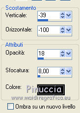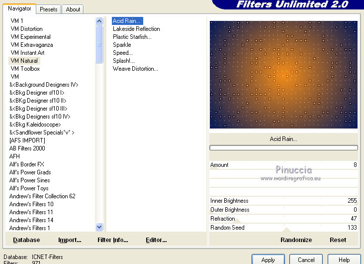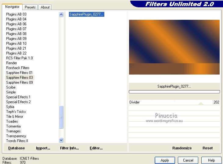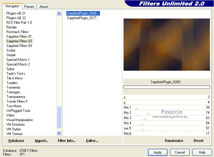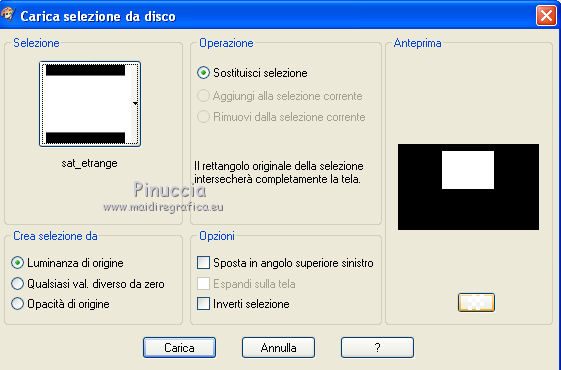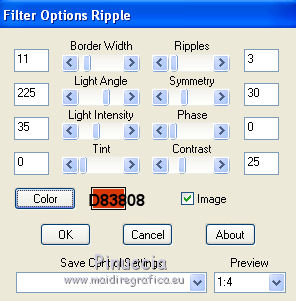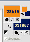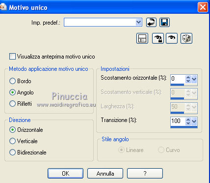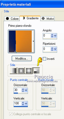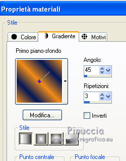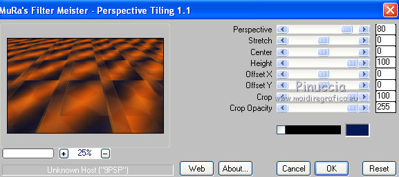 qui puoi trovare qualche risposta ai tuoi dubbi. Se l'argomento che ti interessa non è presente, ti prego di segnalarmelo. Questo tutorial è una creazione di Saturnella e non può essere copiato su altri siti nè essere offerto per il download. Lo stesso vale per la mia traduzione. E' anche proibito togliere il watermark dal materiale; rispettiamo il lavoro dei creatori di tubes, senza i quali non potremmo creare tutorials. Il tutorial è stato creato con PSP12, ma può essere eseguito anche con le altre versioni. Per tradurlo, ho usato PSP X. Occorrente: Materiale qui Il tube dei personaggi è di Tyna Raegen. Il tube dei fiori è di Vsc. Il tube del paesaggio è di Sonia. (in questa pagina trovi i links ai loro siti). Filtri in caso di dubbi, ricorda di consultare la mia sezione filtri qui Filters Unlimited 2.0 qui Sapphire filter 03 qui Mura's Meister - Perspective Tiling qui VM Natural - Acide Rain qui Alien Skin Eye Candy 5 Impact qui Bordermania qui ![]() non esitare a cambiare modalità di miscelatura e opacità secondo i colori utilizzati. Metti la selezione nella cartella Selezioni. 1. Imposta il colore di primo piano con #f28b19, e il colore di sfondo con #031857. ![]() Passa il colore di primo piano a Gradiente, stile Lineare, con i seguenti settaggi. ![]() 2. Apri una nuova immagine trasparente 900 x 550 pixels, e riempila con il gradiente.3. Regola>Sfocatura>Sfocatura gaussiana - raggio 30. ![]() 4. Effetti>Plugins>Filters Unlimited 2.0 - Sapphire 03 - SapphirePlugin_0277 ![]() 5. Livelli>Duplica. 6. Immagine>Ruota per gradi - 90 gradi a sinistra. ![]() 7. Effetti>Effetti di immagine>Motivo unico. ![]() Effetti>Effetti di bordo>Aumenta di più. 8. Livelli>Unisci>Unisci visibile. 9. Livelli>Duplica. 10. Effetti>Plugins>Filters Unlimited 2.0 - Sapphire plugin 03 - SapphirePlugin_0268. ![]() 11. Cambia la modalità di miscelatura di questo livello in Sovrapponi, e abbassa l'opacità al 70%. 12. Livelli>Unisci>Unisci visibile. Livelli>Duplica. 13. Effetti>Plugins>Mura's Meister - Perspective Tiling. ![]() 15. Premi il tasto K per attivare lo strumento Puntatore ![]() se stai usando PSP 9 il tasto D (valido per tutte le versioni) per attivare lo strumento Deformazione ![]() e spingi il nodo centrale in alto fino a 380 pixels. ![]() 16. Livelli>Nuovo livello raster. Selezione>Carica/Salva selezione>Carica selezione da disco. Cerca e carica la selezione sat_etrange. ![]() 17. Cambia i settaggi del gradiente, in stile Sprazzo di luce, con i seguenti settaggi. ![]() Riempi la selezione con il gradiente.18. Effetti>Plugins>Filters Unlimited 2.0 - VM Natural - Acid Rain. ![]() 19. Livelli>Nuovo livello raster. Apri il tube del paesaggio di Sonia e vai a Modifica>Copia. Torna al tuo lavoro e vai a Modifica>Incolla nella selezione. Livelli>Unisci>Unisci giù. 20. Selezione>Modifica>Seleziona bordature selezione. ![]() Riempi con il colore chiaro di primo piano.21. Effetti>Effetti 3D>Smusso a incasso. ![]() 22. Effetti>Effetti 3D>Sfalsa ombra. ![]() 23. Selezione>Deseleziona. 24. Effetti>Plugins>Alien Skin Eye Candy 5 Impact - Perspective Shadow. Seleziona il preset Reflect in Front- Faint e ok. ![]() 25. Effetti>Effetti 3D>Sfalsa ombra, con i settaggi precedenti. 26. Apri il tube dei personaggi di Tyna Raegen e vai a Modifica>Copia. Torna al tuo lavoro e vai a Modifica>Incolla come nuovo livello. Immagine>Ridimensiona, al 70%, tutti i livelli non selezionato. Regola>Messa a fuoco>Metti a fuoco. Sposta il tube a destra.27. Effetti>Effetti 3D>Sfalsa ombra. ![]() 28. Apri il tube dei fiori di Vsc e vai a Modifica>Copia. Torna al tuo lavoro e vai a Modifica>Incolla come nuovo livello. Immagine>Ridimensiona, al 70%, tutti i livelli non selezionato. Regola>Messa a fuoco>Metti a fuoco. Sposta il tube in basso a sinistra.29. Effetti>Effetti 3D>Sfalsa ombra. ![]() 30. Immagine>Aggiungi bordatura, 2 pixels, simmetriche, con il colore chiaro. Immagine>Aggiungi bordatura, 40 pixels, simmetriche, con il colore scuro. Seleziona il bordo da 40 pixels con la bacchetta magica ![]() 31. Cambia i settaggi del gradiente in stile Radiale. ![]() Riempi la selezione con il gradiente.32. Effetti>Plugins>Filters Unlimited 2.0 - Sapphire Plugin 03 - SapphirePlugin_0267. ![]() 33. Effetti>Plugins>Bordermania - Ripple. ![]() 34. Effetti>Effetti 3D>Sfalsa ombra. ![]() Selezione>Deseleziona. 35. Immagine>Aggiungi bordatura, 2 pixels, simmetriche, con il colore chiaro. 36. Firma il tuo lavoro. Livelli>Unisci>Unisci tutto. 37. Immagine>Ridimensiona, a 900 pixels di larghezza. 38. Salva in formato jpg. ![]() Se hai problemi o dubbi, o trovi un link non funzionante, o anche soltanto per dirmi che ti è piaciuto, scrivimi. 5 Maggio 2012 |