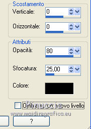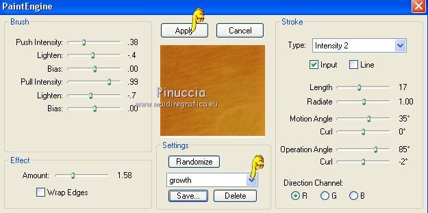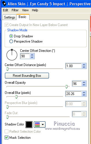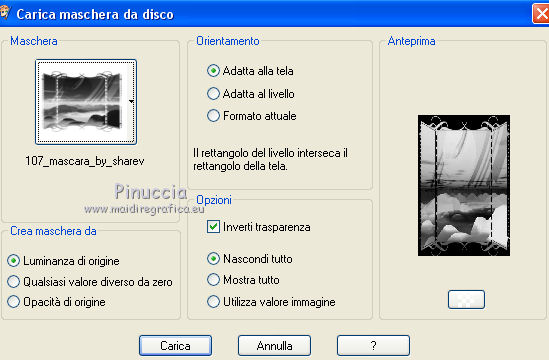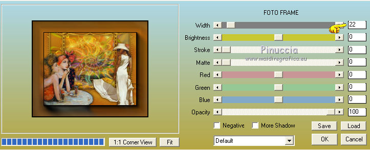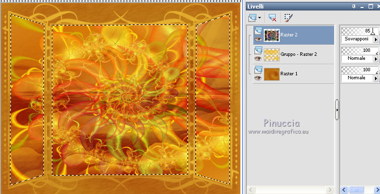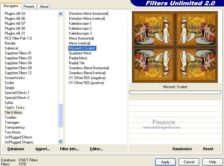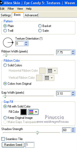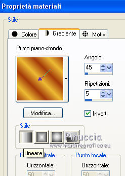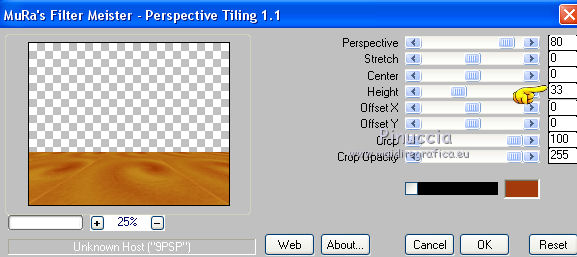 qui puoi trovare qualche risposta ai tuoi dubbi. Se l'argomento che ti interessa non è presente, ti prego di segnalarmelo. Questo tutorial è una creazione di Saturnella e non può essere copiato su altri siti nè essere offerto per il download. Lo stesso vale per la mia traduzione. E' anche proibito togliere il watermark dal materiale; rispettiamo il lavoro dei creatori di tubes, senza i quali non potremmo creare tutorials. Per tradurre questo tutorial ho usato CorelX, ma può essere eseguito anche con le altre versioni di PSP. Dalla versione X4, il comando Immagine>Rifletti è stato sostituito con Immagine>Capovolgi in orizzontale, e il comando Immagine>Capovolgi con Immagine>Capovolgi in verticale. Nelle versioni X5 e X6, le funzioni sono state migliorate rendendo disponibile il menu Oggetti. Vedi la scheda sull'argomento qui Occorrente: Materiale qui Per il tube della donna grazie Gina. La maschera è di Sharev. Il frattale viene dal sito Keith' Fractales Art. (in questa pagina trovi i links ai loro siti). Filtri in caso di dubbi, ricorda di consultare la mia sezione filtri qui Filters Unlimited 2.0 qui Fantastic Machine - Paint Engine qui Mura's Meister - Perspective Tiling qui AAA Frames - Foto Frame qui Alien Skin Eye Candy 5 Impact - Perspective Shadow qui Alien Skin Eye Candy 5 Texture - Weave qui ![]() non esitare a cambiare modalità di miscelatura e opacità secondo i colori utilizzati. Metti la selezione nella cartella Selezioni. Metti la maschera nella cartella Maschere. Imposta il colore di primo piano con il colore chiaro #edbb34, e il colore di sfondo con il colore scuro #a33a0b. Passa il colore di primo piano a Gradiente di primo piano/sfondo, stile Lineare. ![]() 1. Apri una nuova immagine trasparente 800 x 650 pixels, e riempila con il gradiente.2. Regola>Sfocatura>Sfocatura radiale. ![]() 3. Effetti>Plugins>Fantastic Machine - Paint Engine, seleziona il preset growth e ok. se hai problemi con il filtro, vedi la scheda relativa nella mia pagina dei filtri qui ![]() 4. Livelli>Nuovo livello raster. Riempi con il colore chiaro.5. Livelli>Carica/Salva maschera>Carica maschera da disco. Cerca e carica la maschera 107_mascara_by_sharev, con i seguenti settaggi. ![]() Regola>Messa a fuoco>Accentua messa a fuoco. Livelli>Unisci>Unisci gruppo. 6. Selezione>Carica/Salva selezione>Carica selezione da disco. Cerca e carica la selezione expo_saturnella. ![]() 7. Livelli>Nuovo livello raster. Apri il frattale e vai a Modifica>Copia. Torna al tuo lavoro e vai a Modifica>Incolla nella selezione. Mantieni selezionato. Cambia la modalità di miscelatura di questo livello in Sovrapponi, e abbassa l'opacità all'85%. ![]() 8. Livelli>Nuovo livello raster. Effetti>Effetti 3D>Ritaglio. ![]() Selezione>Deseleziona. 9. Chiudi il livello di sfondo. Livelli>Unisci>Unisci visibile. 10. Immagine>Ridimensiona, all'85%, tutti i livelli non selezionato. Sposta l'immagine più in alto (vedi l'esempio finale).11. Effetti>Effetti 3D>Sfalsa ombra, colore nero. ![]() 12. Chiudi questo livello e attiva il livello sottostante dello sfondo. 13. Livelli>Duplica. Effetti>Plugins>Mura Meister's - Perspective Tiling. ![]() Livelli>Disponi>Sposta giù. 14. Attiva il livello soprastante. Premi il tasto K per attivare lo strumento Puntatore ![]() se stai usando PSP 9 il tasto D per attivare lo strumento Deformazione ![]() in modalità Scala , spingi il nodo centrale inferiore verso l'alto,fino a 440 pixels. ![]() 15. Effetti>Plugins>Alien Skin Eye Candy 5 Impact - Perspective Shadow. ![]() 16. Riapri il livello superiore. Livelli>Unisci>Unisci visibile. 17. Apri il tube Ginatubes femme817, e vai a Modifica>Copia. Torna al tuo lavoro e vai a Modifica>Incolla come nuovo livello. Spostalo nell'angolo in basso a sinistra.Effetti>Effetti 3D>Sfalsa ombra, con i settaggi precedenti. 18. Apri il tube Ginatubes femmes 1887, e vai a Modifica>Copia. Torna al tuo lavoro e vai a Modifica>Incolla come nuovo livello. Immagine>Ridimensiona, al 70%, tutti i livelli non selezionato. Regola>Messa a fuoco>Metti a fuoco. Spostalo a destra.Effetti>Effetti 3D>Sfalsa ombra, con i settaggi precedenti. 19. Apri il file "texte" e vai a Modifica>Copia. Torna al tuo lavoro e vai a Modifica>Incolla come nuovo livello. Spostalo in alto.20. Livelli>Unisci>Unisci tutto. Modifica>Copia. 21. Immagine>Aggiungi bordatura, 2 pixels, simmetriche, con il colore scuro. Immagine>Aggiungi bordatura, 50 pixels, simmetriche, con il colore chiaro. Attiva lo strumento Bacchetta magica ![]() e clicca nel bordo da 50 pixels per selezionarlo. Modifica>Incolla nella selezione. Regola>Sfocatura>Sfocatura radiale, con i settaggi precedenti. ![]() 22. Effetti>Plugins>Alien Skin Eye Candy 5 Texture - Weave. ![]() Selezione>Inverti. Effetti>Effetti 3D>Sfalsa ombra, colore nero. ![]() 23. Di nuovo Selezione>Inverti. Effetti>Plugins>AAA Frames - Foto Frame. ![]() Mantieni selezionato. 24. Effetti>Plugins>Filters Unlimited 2 - Tile &Mirror - Mirrored and Scaled - 2 volte. ![]() 25. Ancora una volta Selezione>Inverti. Effetti>Effetti 3D>Sfalsa ombra, colore nero. ![]() Selezione>Deseleziona. 26. Immagine>Aggiungi bordatura, 1 pixel, simmetriche, con il colore chiaro. Immagine>Aggiungi bordatura, 1 pixel, simmetriche, con il colore nero. Firma il tuo lavoro. Immagine>Ridimensiona, a 700 pixels di larghezza, tutti i livelli selezionato. Regola>Messa a fuoco>Metti a fuoco. Salva in formatoj pg. ![]() Se hai problemi o dubbi, o trovi un link non funzionante, o anche soltanto per dirmi che ti è piaciuto, scrivimi. 28 Giugno 2014 |