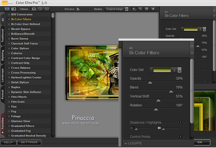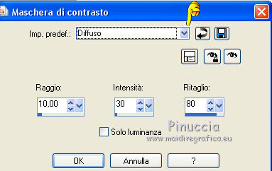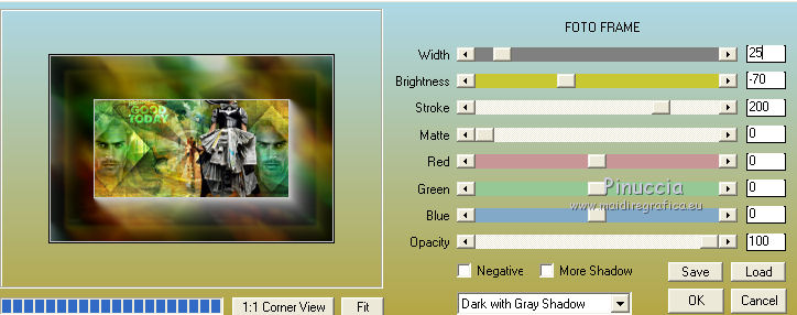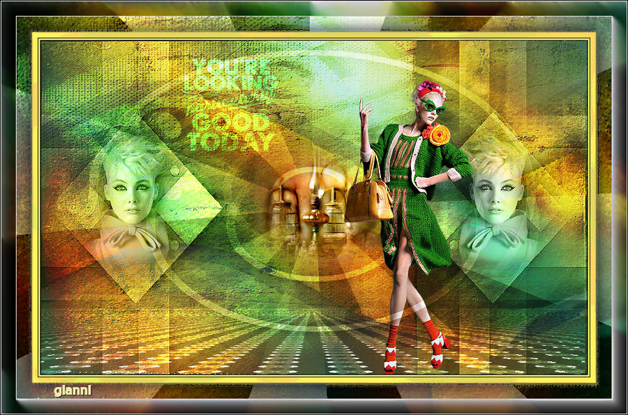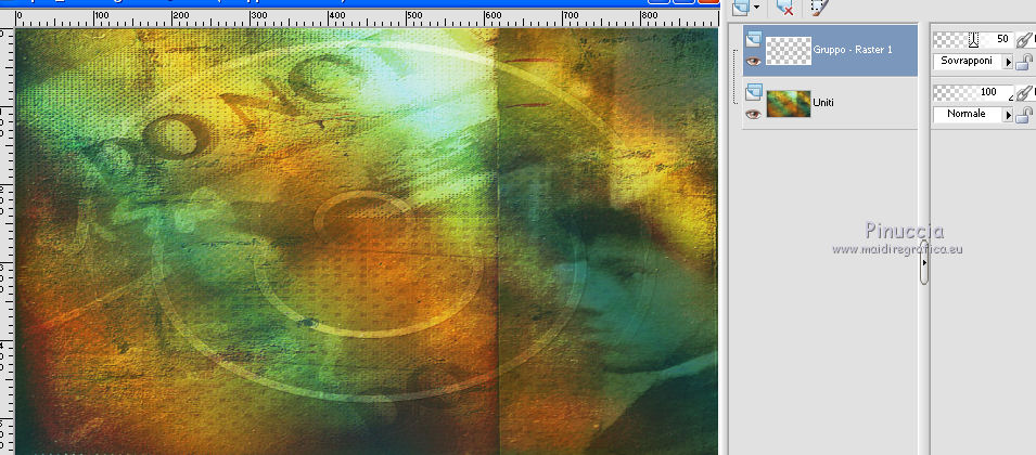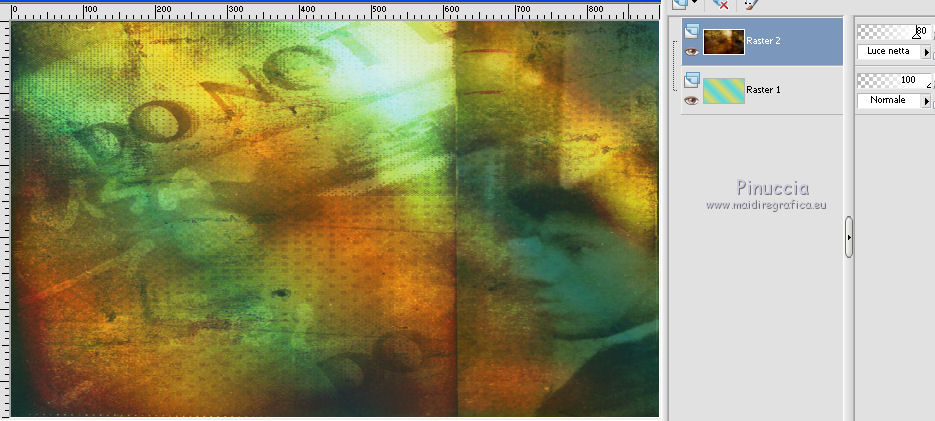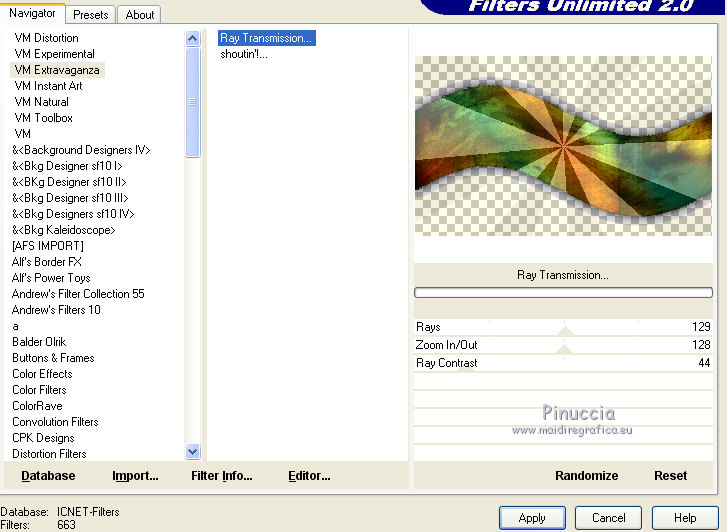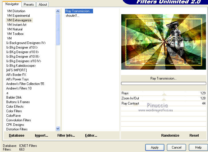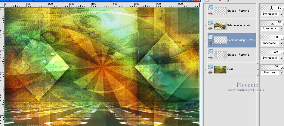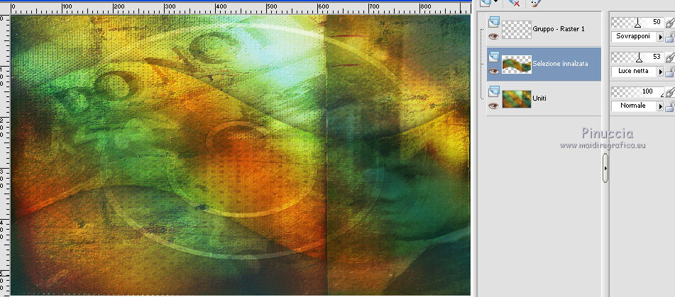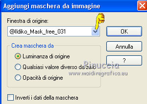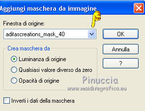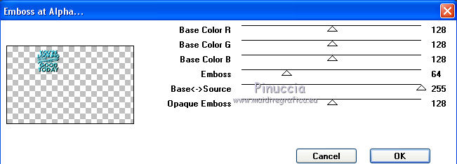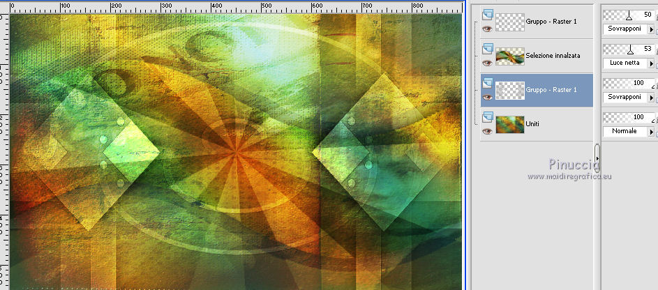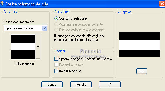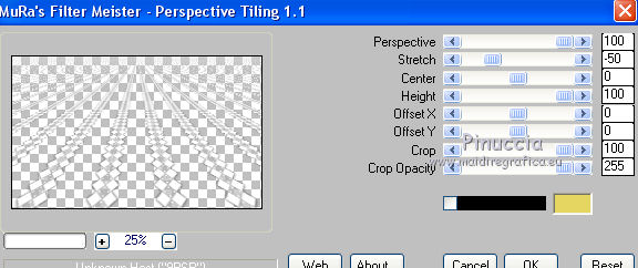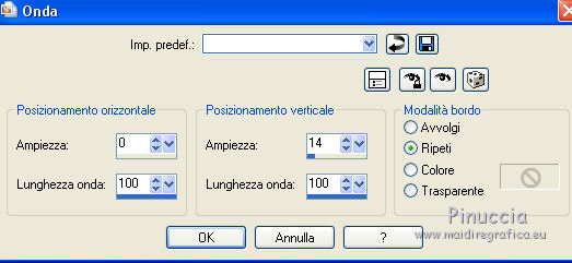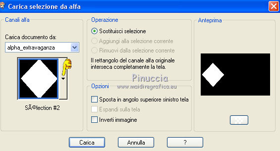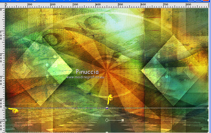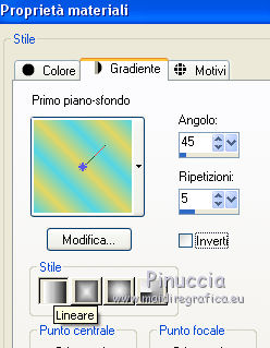 qui puoi trovare qualche risposta ai tuoi dubbi. Se l'argomento che ti interessa non è presente, ti prego di segnalarmelo. Questo tutorial è una creazione di Saturnella e non può essere copiato su altri siti nè essere offerto per il download. Lo stesso vale per la mia traduzione. E' anche proibito togliere il watermark dal materiale; rispettiamo il lavoro dei creatori di tubes, senza i quali non potremmo creare tutorials. Per tradurre questo tutorial, creato con PSP19, ho usato CorelX, ma può essere eseguito anche con le altre versioni di PSP. Dalla versione X4, il comando Immagine>Rifletti è stato sostituito con Immagine>Capovolgi in orizzontale, e il comando Immagine>Capovolgi con Immagine>Capovolgi in verticale. Nelle versioni X5 e X6, le funzioni sono state migliorate rendendo disponibile il menu Oggetti. Nel nuovo X7 sono tornati i comandi Immagine>Rifletti e Immagine>Capovolgi, ma con nuove funzioni. Vedi la scheda sull'argomento qui Occorrente: Materiale qui Grazie: per i tube Syl, Beatriz, Guismo e Yoka; per le maschere Adita e Ildiko. (in questa pagina trovi i links ai loro siti). Filtri in caso di dubbi, ricorda di consultare la mia sezione filtri qui Filters Unlimited 2.0 qui Mura's Seamless - Emboss at Alpha qui FM Tile Tools - Blend Emboss qui VM Extravaganza - Ray Transmission qui AAA Frames - Foto Frame qui Mura's Meister - Perspective Tiling qui I filtri VM Extravaganza e Mura's Seamless si possono usare da soli o importati in Filters Unlimited (come fare vedi qui) Se un filtro fornito appare con questa icona ![]() non esitare a cambiare modalità di miscelatura e opacità secondo i colori utilizzati. Nelle ultime versioni di PSP non c'è il gradiente di primo piano/sfondo (Corel_06_029) Puoi usare i gradienti delle versioni precedenti. Trovi qui i gradienti Corel X. Apri le maschere in PSP e minimizzale con il resto del materiale. Couleurs utilisées ![]() 1. Imposta il colore di primo piano con #53d6d6, e il colore di sfondo con #e4d661. ![]() Passa il colore di primo piano a Gradiente di primo piano/sfondo, stile Lineare. ![]() Apri alpha_extravaganza. Finestra>Duplica, o sulla tastiera maiuscola+D, per fare una copia. ![]() Chiudi l'originale. La copia, che sarà la base del tuo lavoro, non è vuota, ma contiene le selezioni salvate sul canale alfa. Riempi l'immagine trasparente con il gradiente.2. Livelli>Nuovo livello raster. Selezione>Seleziona tutto. Apri l'immagine di sfondo "fond" e vai a Modifica>Copia. Torna al tuo lavoro e vai a Modifica>Incolla nella selezione. Selezione>Deseleziona. Cambia la modalità di miscelatura di questo livello in Luce netta, o altro, e abbassa l'opacità all'80%. ![]() 3. Effetti>Plugins>FM Tile Tools - Blend Emboss, con i settaggi standard. ![]() Livelli>Unisci>Unisci visibile. 4. Livelli>Nuovo livello raster. Imposta il colore di primo piano con il colore bianco. Riempi il livello con il colore bianco.Livelli>Nuovo livello maschera>Da immagine. Apri il menu sotto la finestra di origine e vedrai la lista dei files aperti. Seleziona la maschera aditacreations_mask_40. ![]() Effetti>Effetti di bordo>Aumenta. Livelli>Unisci>Unisci gruppo. 5. Effetti>Effetti 3D>Sfalsa ombra. ![]() 6. Effetti>Effetti di distorsione>Coordinate polari. ![]() Cambia la modalità di miscelatura di questo livello in Sovrapponi, o altro, e abbassa l'opacità al 50%. ![]() 7. Attiva il livello di sfondo. Selezione>Carica/Salva selezione>Carica selezione da canale alfa. La selezione sélection 1 è subito disponibile. Devi soltanto cliccare Carica. ![]() Selezione>Innalza selezione a livello. Selezione>Deseleziona. 8. Effetti>Effetti di distorsione>Onda. ![]() 9. Effetti>Effetti 3D>Sfalsa ombra. ![]() Cambia la modalità di miscelatura di questo livello in Luce netta, o altro, e abbassa l'opacità al 53%. ![]() 10. Effetti>Plugins>Filters Unlimited 2.0 - VM Extravaganza - Ray Transmission, con i settaggi standard. ![]() 11. Attiva il livello di sfondo. Livelli>Nuovo livello raster. Riempi con il colore bianco.Livelli>Nuovo livello maschera>Da immagine. Apri il menu sotto la finestra di origine e seleziona la maschera Ildiko_Mask_free_031. ![]() Effetti>Effetti di bordo>Aumenta. Livelli>Unisci>Unisci gruppo. 12. Effetti>Effetti 3D>Sfalsa ombra, con i settaggi precedenti. ![]() Cambia la modalità di miscelatura di questo livello in Sovrapponi, o altro. ![]() 13. Livelli>Duplica. Effetti>Plugins>Mura's Meister - Perspective Tiling. ![]() 14. Premi il tasto K per attivare lo strumento Puntatore ![]() se stai usando PSP 9 il tasto D per attivare lo strumento Deformazione ![]() in modalità Scala ,spingi il nodo superiore centrale verso il basso fino a circa 440 pixels. ![]() Tasto M per disattivare lo strumento. 15. Effetti>Effetti 3D>Sfalsa ombra. ![]() Cambia la modalità di miscelatura di questo livello in Indebolisci, o altro. ![]() 16. Attiva il livello superiore. Selezione>Carica/Salva selezione>Carica selezione da canale alfa. Apri il menu delle selezioni e carica sélection 2. ![]() Apri il tube del viso dell'uomo e vai a Modifica>Copia. Torna al tuo lavoro e vai a Modifica>Incolla come nuovo livello. Immagine>Ridimensiona, al 40%, tutti i livelli non selezionato. Regola>Messa a fuoco>Metti a fuoco. Selezione>Inverti. Premi sulla tastiera il tasto CANC ![]() Selezione>Deseleziona. Cambia la modalità di miscelatura di questo livello in Luminanza (esistente). Livelli>Duplica. Immagine>Rifletti. 17. Attiva il livello inferiore. Apri il tube del paesaggio di Guismo e vai a Modifica>Copia. Torna al tuo lavoro e vai a Modifica>Incolla come nuovo livello. 18. Effetti>Effetti di immagine>Scostamento. ![]() 19. Attiva il livello superiore. Apri il tube della donna di Syl e vai a Modifica>Copia. Torna al tuo lavoro e vai a Modifica>Incolla come nuovo livello. Immagine>Ridimensiona, all'80%, tutti i livelli non selezionato. Regola>Messa a fuoco>Metti a fuoco. Spostalo a destra.20. Effetti>Effetti 3D>Sfalsa ombra. ![]() 21. Apri il wordart di Yoka e vai a Modifi