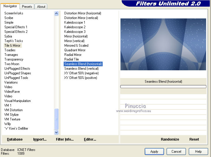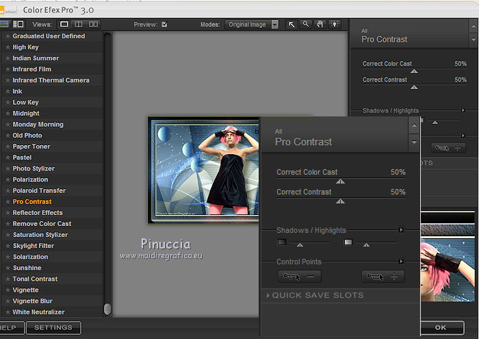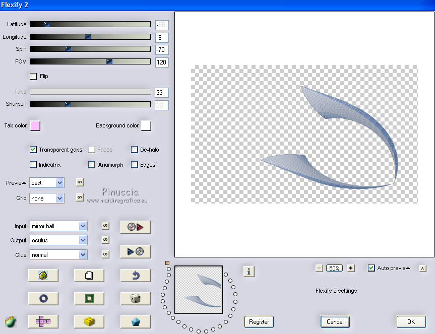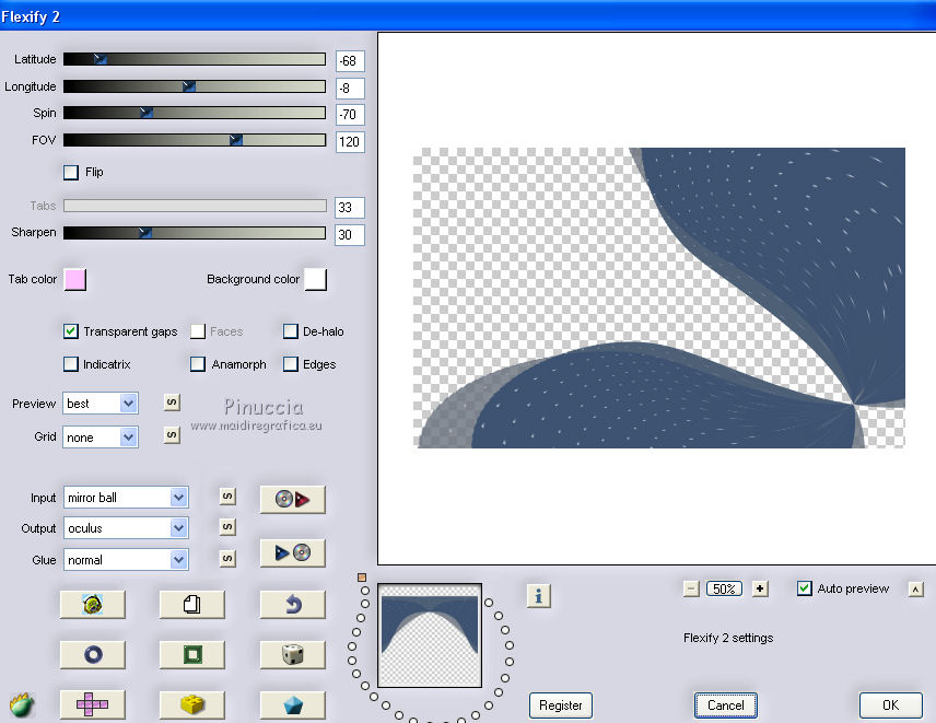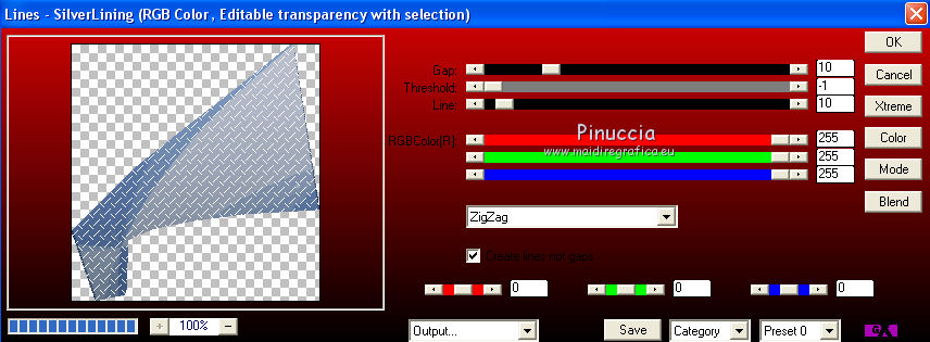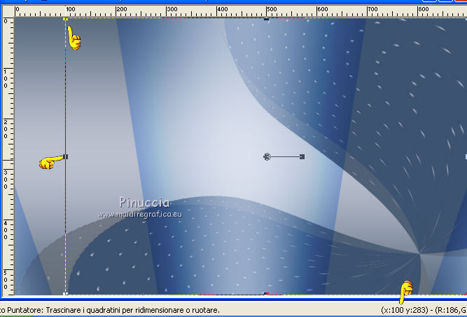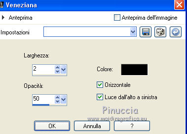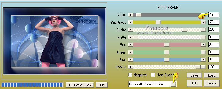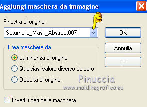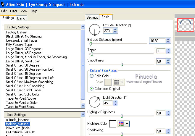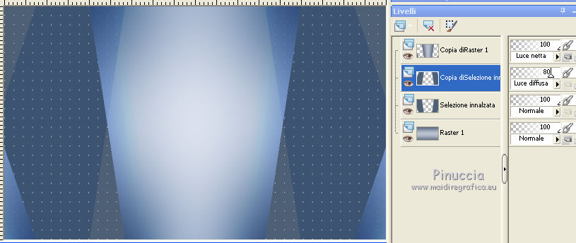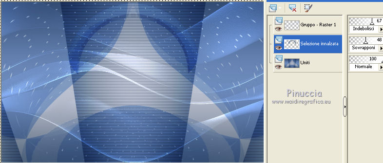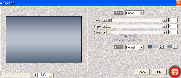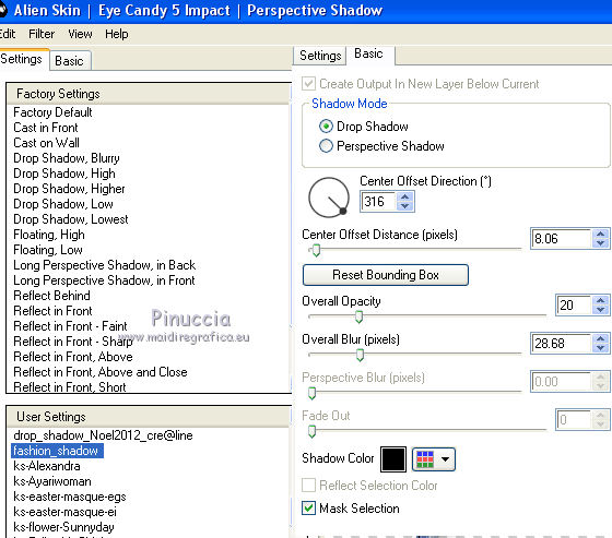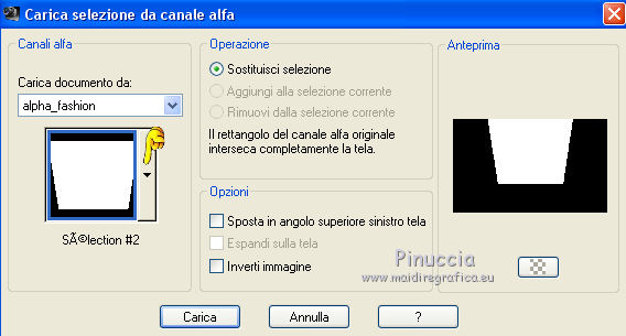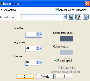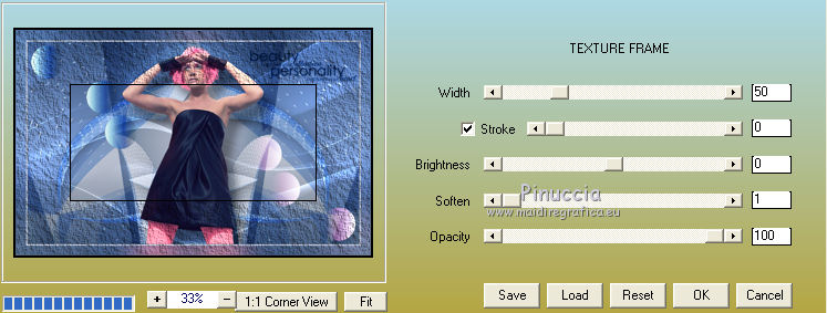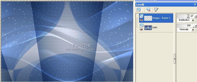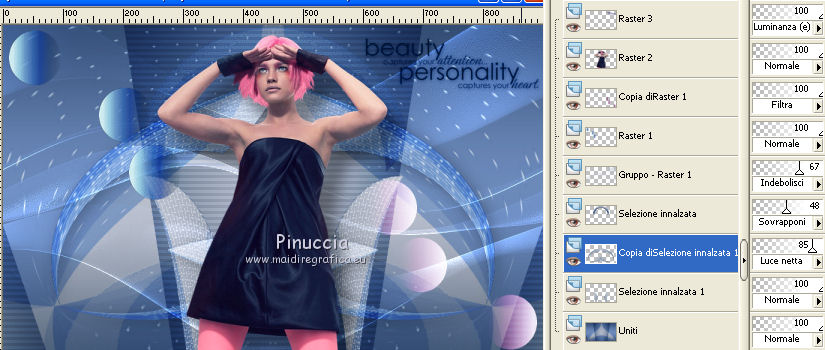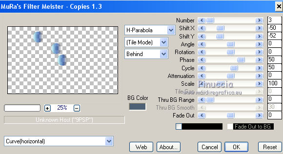 qui puoi trovare qualche risposta ai tuoi dubbi. Se l'argomento che ti interessa non è presente, ti prego di segnalarmelo. Questo tutorial è una creazione di Saturnella e non può essere copiato su altri siti nè essere offerto per il download. Lo stesso vale per la mia traduzione. E' anche proibito togliere il watermark dal materiale; rispettiamo il lavoro dei creatori di tubes, senza i quali non potremmo creare tutorials. Per tradurre questo tutorial, creato con X15, ho usato CorelX, ma può essere eseguito anche con le altre versioni di PSP. Dalla versione X4, il comando Immagine>Rifletti è stato sostituito con Immagine>Capovolgi in orizzontale, e il comando Immagine>Capovolgi con Immagine>Capovolgi in verticale. Nelle versioni X5 e X6, le funzioni sono state migliorate rendendo disponibile il menu Oggetti. Vedi la scheda sull'argomento qui Occorrente: Materiale qui Per il tube grazie Alies. (in questa pagina trovi i links ai loro siti). Filtri in caso di dubbi, ricorda di consultare la mia sezione filtri qui Filters Unlimited 2.0 qui Mehdi - Wavy Lab qui Flaming Pear - Flexify 2 qui Mura's Meister - Copies qui Mura's Meister - Pole Transform qui Alien Skin Eye Candy 5 Impact - Perspective Shadow, Extrude qui AP 01 [Innovations] - Lines SilverLining qui Nik Software - Color Efex qui AAA Frames - Texture Frame, Foto Frame qui ![]() non esitare a cambiare modalità di miscelatura e opacità secondo i colori utilizzati. Metti i preset Cliccando sul file una o due volte (a seconda delle tue impostazioni), automaticamente il preset si installerà nella cartella corretta. perchè uno o due clic vedi qui Apri la maschera in PSP e minimizzala con il resto del materiale. 1. Imposta il colore di primo piano con #bac0ce, e il colore di sfondo con #4e6076. ![]() Apri alpha_fashion. Finestra>Duplica, o sulla tastiera maiuscola+D, per fare una copia. Chiudi l'originale. La copia, che sarà la base del tuo lavoro, non è vuota, ma contiene una selezione salvata sul canale alfa. Rinomina il livello Raster 1. 2. Effetti>Plugins>Mehdi - Wavy Lab . per il mio esempio questo filtro lavora con i colori della paletta; il primo è il colore di sfondo, il secondo quello di primo piano, mantieni il terzo colore creato dal filtro. ![]() 3. Livelli>Duplica. Immagine>Ruota per gradi - 90 gradi a sinistra. ![]() 4. Effetti>Effetti geometrici>Prospettiva verticale. ![]() Cambia la modalità di miscelatura di questo livello in Luce netta, o secondo i tuoi colori. ![]() 5. Attiva il livello di sfondo. Selezione>Seleziona tutto. Immagine>Ritaglia la selezione. Selezione>Carica/Salva selezione>Carica selezione da canale alfa. La selezione sélection#1 è subito disponibile. Devi soltanto cliccare Carica. ![]() Selezione>Innalza selezione a livello. Livelli>Nuovo livello raster. Riempi con il colore scuro.Livelli>Unisci>Unisci giù. Selezione>Deseleziona. 6. Effetti>Effetti di trama>Intessitura. colore intessitura: colore scuro di sfondo colore spazio: colore chiaro di primo piano. ![]() 7. Livelli>Duplica. Immagine>Capovolgi. Cambia la modalità di miscelatura di questo livello in Luce diffusa o secondo i tuoi colori, e abbassa l'opacità all'80%. ![]() Livelli>Unisci>Unisci giù. 8. Effetti>Plugins>Flaming Pear - Flexify 2. ![]() 9. Premi il tasto K per attivare lo strumento Puntatore ![]() se stai usando PSP 9 il tasto D per attivare lo strumento Deformazione ![]() in modalità Scala ![]() spingi il nodo centrale a sinistra, verso la destra fino a 100 pixels. (nella barra inferiore, puoi controllare la posizione) ![]() Premi il tasto M per disattivare lo strumento. 10. Livelli>Duplica. Immagine>Rifletti. Livelli>Unisci>Unisci giù. Cambia la modalità di miscelatura di questo livello in Luce netta, o secondo i tuoi colori, e abbassa l'opacità all'80%. ![]() 11. Livelli>Disponi>Porta in alto. Attiva il livello sottostante. ![]() Effetti>Effetti di trama>Veneziana. ![]() 12. Livelli>Unisci>Unisci visibile. Effetti>Plugins>Filters Unlimited 2.0 - Tile & Mirror - Seamless blend (Horizontal). ![]() 13. Livelli>nuovo livello raster. Riempi con il colore chiaro.Livelli>Nuovo livello maschera>Da immagine. Apri il menu sotto la finestra di origine e vedrai la lista dei files aperti. Carica la maschera Saturnella_Mask_Abstract007, con i seguenti settaggi. ![]() Effetti>Effetti di bordo>Aumenta. Livelli>Unisci>Unisci gruppo. Cambia la modalità di miscelatura di questo livello in Indebolisci, e abbassa l'opacità al 67% ![]() 14. Attiva il livello di sfondo. Selezione>Carica/Salva selezione>Carica selezione da canale alfa. Apri il menu delle selezioni e carica sélection#2. ![]() Selezione>Innalza selezione a livello. Selezione>Deseleziona. 15. Effetti>Plugins>Mura's Meister - Pole Transform. ![]() 16. Immagine>Capovolgi. Effetti>Effetti di immagine>Scostamento. ![]() 17. Effetti>Plugins>Alien Skin Eye Candy 5 Impact - Extrude, seleziona il preset fashion_extrude e ok. In caso di problemi con il preset, puoi copiare i settaggi che vedi nella schermata. ![]() 18. Cambia la modalità di miscelatura di questo livello in Sovrapponi, e abbassa l'opacità al 48%. ![]() 19. Apri il tube déco boules. Attiva lo strumento Selezione , rettangolo,e seleziona una sfera (per l'esempio la sfera blu). Modifica>Copia. Torna al tuo lavoro e vai a Modifica>incolla come nuovo livello. Livelli>Disponi>Porta in alto. 20. Immagine>Ridimensiona, al 70%, tutti i livelli non selezionato. Regola>Messa a fuoco>Metti a fuoco. 21. Effetti>Plugins>Mura's Meister - Copies. ![]() 22. Effetti>Effetti di immagine>Scostamento. ![]() 23. Livelli>Duplica. Immagine>Rifletti. Immagine>Capovolgi. 24. Regola>Tonalità e saturazione>Tonalità/saturazione/luminosità. regola i settaggi in base ad un colore scelto dal tuo tube. Per il mio esempio il rosa ![]() Cambia la modalità di miscelatura di questo livello in Filtra. 25. Apri il tube della donna di Alies e vai a Modifica>Copia. Torna al tuo lavoro e vai a Modifica>incolla come nuovo livello. Immagine>Ridimensi